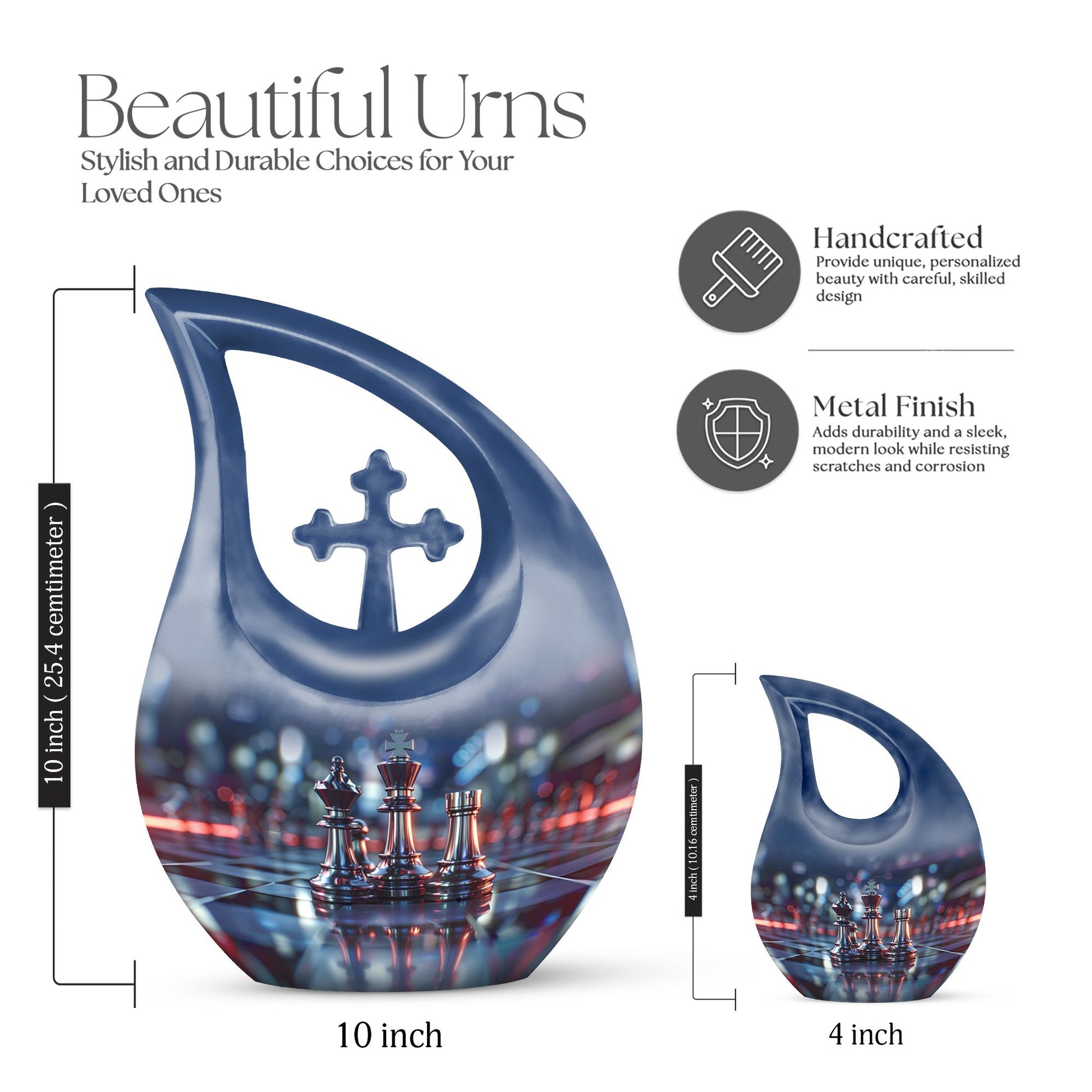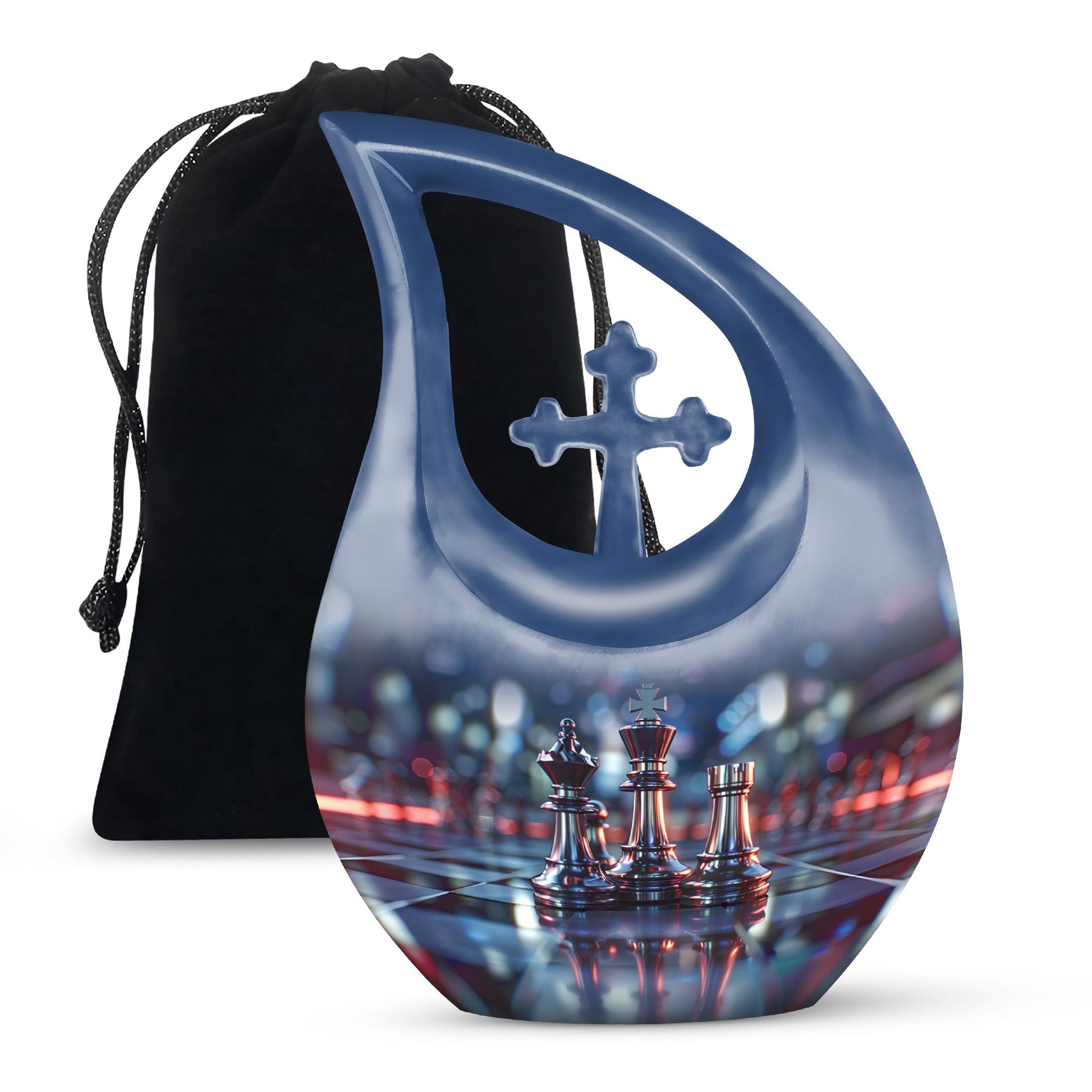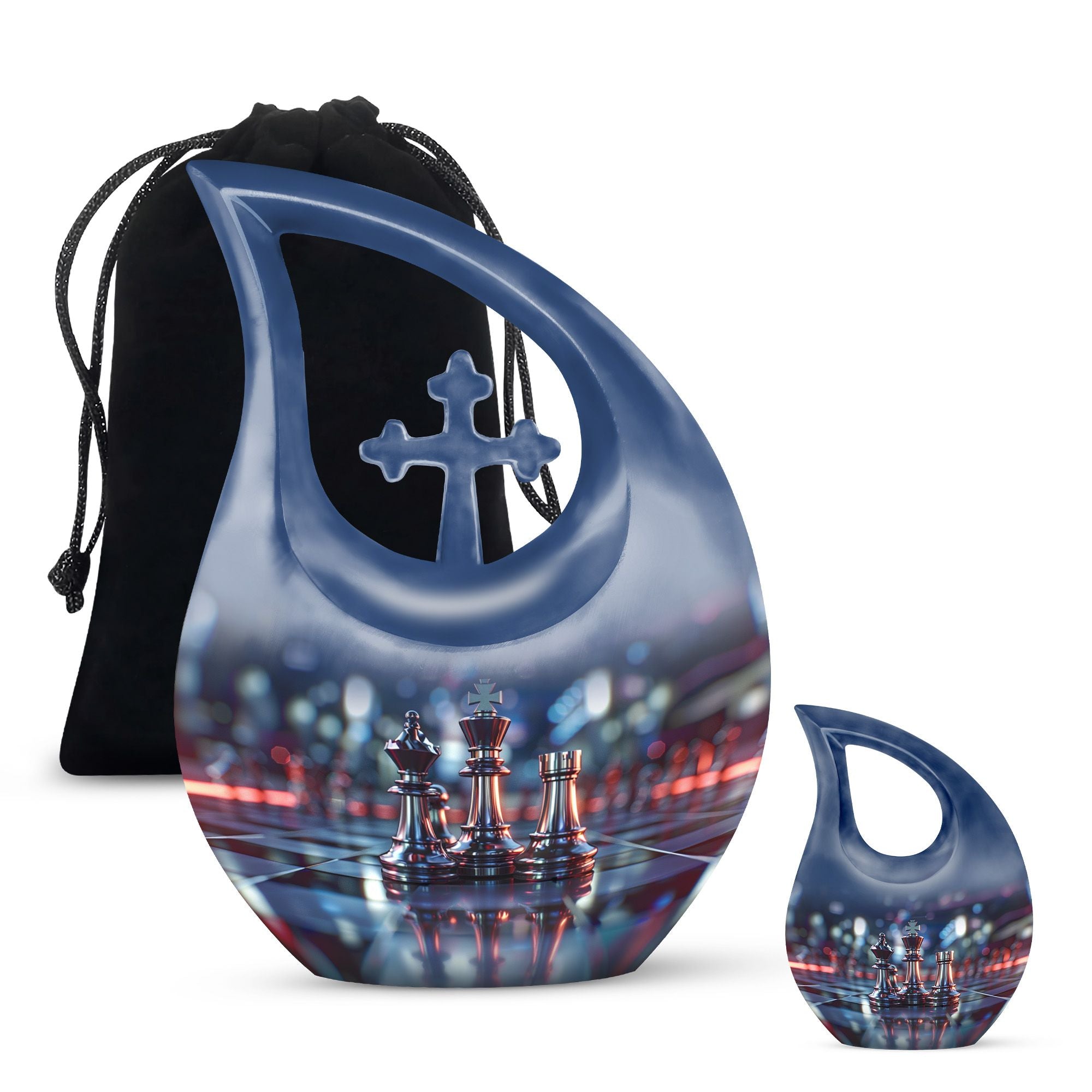 Experience a serene homage to the departed with this Chess-themed Cross Drop Chess Urn. This memorial urn, tastefully handcrafted from high-quality aluminum, ensures a dignified rest for your departed loved ones. Measuring 10 inches tall, its generous 200 cubic inch capacity allows it to function as a large urn, ideally suited for adult and senior ashes. With a modest weight of 3.3 pounds, it can be comfortably handled during memorial ceremonies. The hardy construction prevents any accidental spills, safeguarding the ashes within. This package comes inclusive of a plush, velvet pouch which offers an additional layer of protection for the encapsulated reminiscence. For a poignant personal touch, this Chess urn can accommodate engraved names, embodying perpetual memories. Catering to distinct tastes, additional keywords which may assist in your search for the perfect urn could be 'custom made urns for ashes', 'creative urns for dad', 'extra large urns', and 'cremation monuments'. Not merely a receptacle for ashes, but a heartfelt homage to the memory of dear ones.