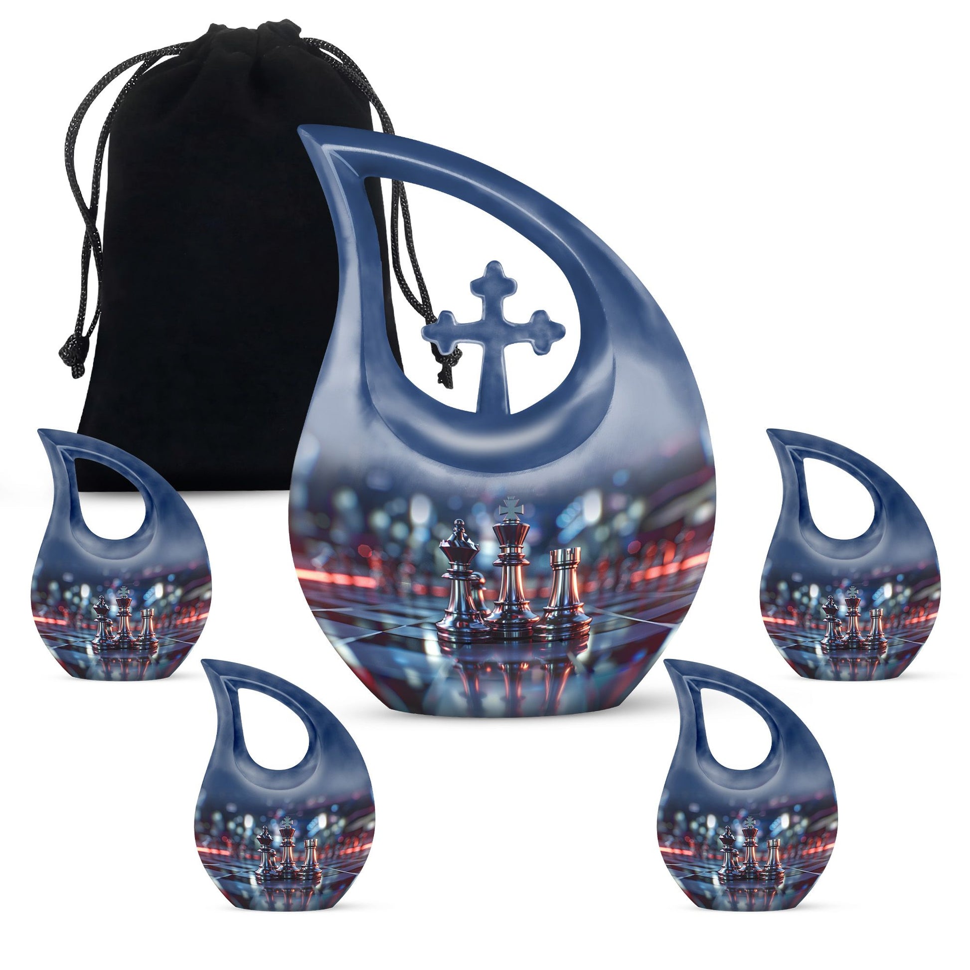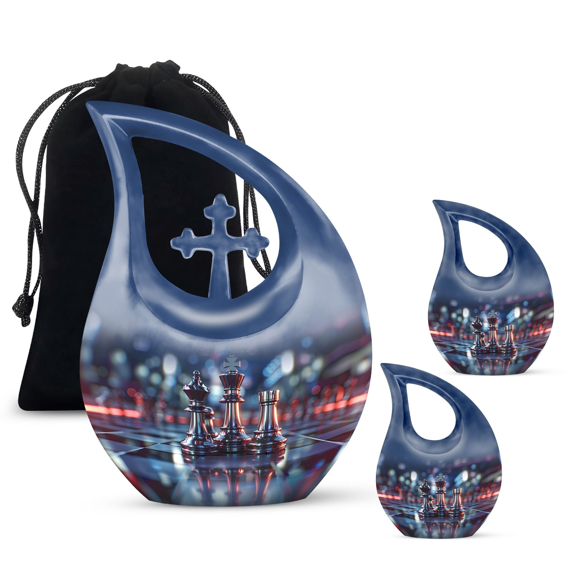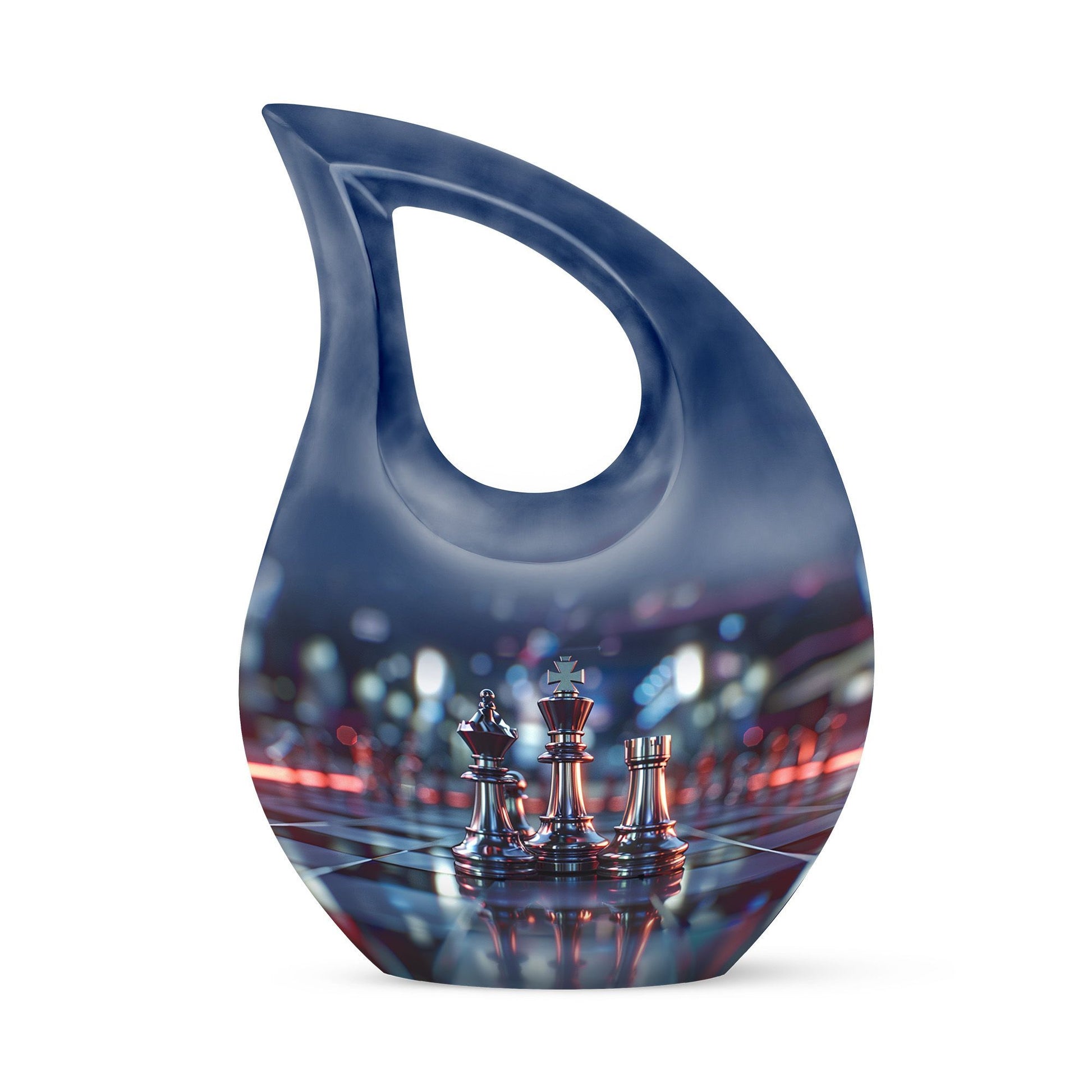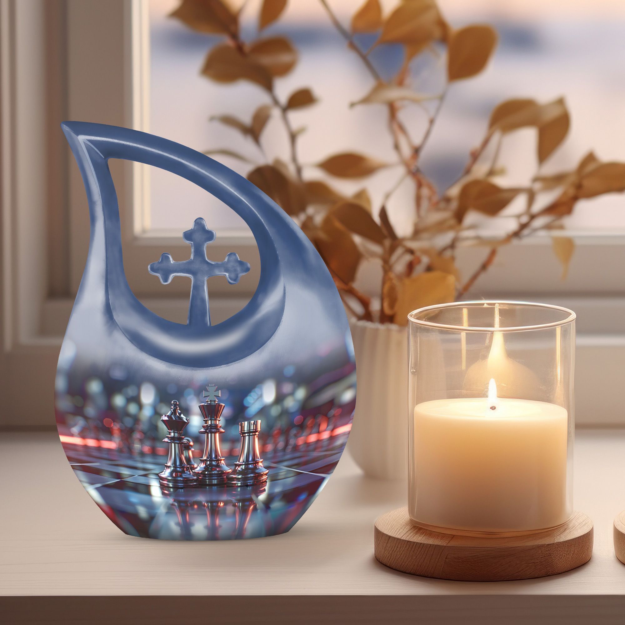 Experience a serene homage to the departed with this Chess-themed Cross Drop Chess Urn. This memorial urn, tastefully handcrafted from high-quality aluminum, ensures a dignified rest for your departed loved ones. Measuring 10 inches tall, its generous 200 cubic inch capacity allows it to function as a large urn, ideally suited for adult and senior ashes. With a modest weight of 3.3 pounds, it can be comfortably handled during memorial ceremonies. The hardy construction prevents any accidental spills, safeguarding the ashes within. This package comes inclusive of a plush, velvet pouch which offers an additional layer of protection for the encapsulated reminiscence. For a poignant personal touch, this Chess urn can accommodate engraved names, embodying perpetual memories. Catering to distinct tastes, additional keywords which may assist in your search for the perfect urn could be 'custom made urns for ashes', 'creative urns for dad', 'extra large urns', and 'cremation monuments'. Not merely a receptacle for ashes, but a heartfelt homage to the memory of dear ones.