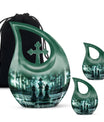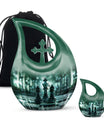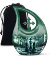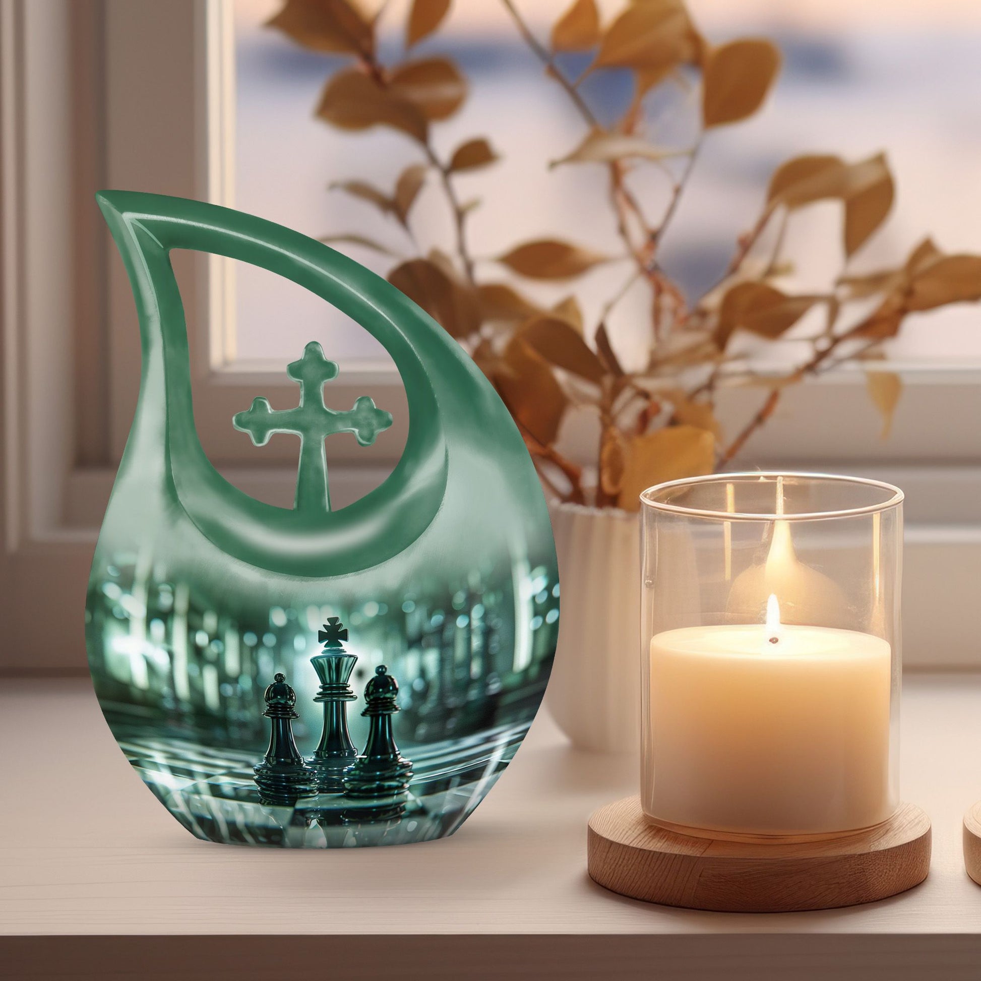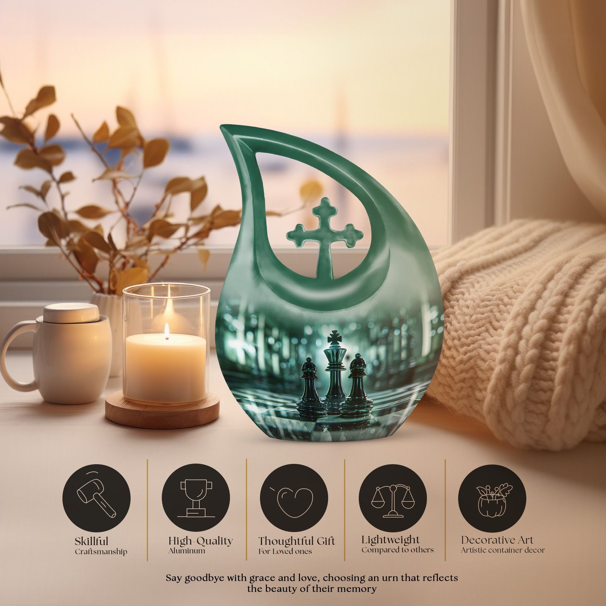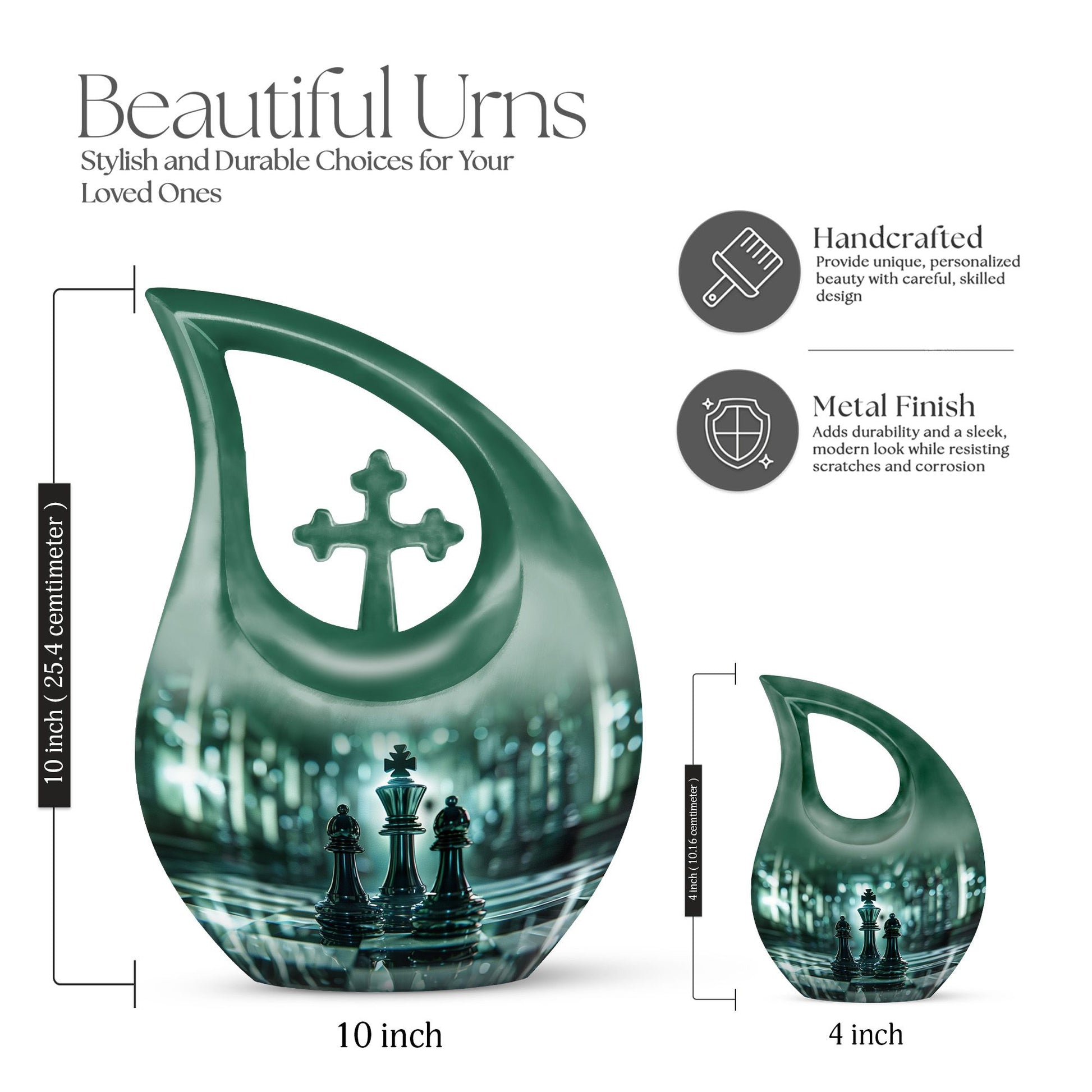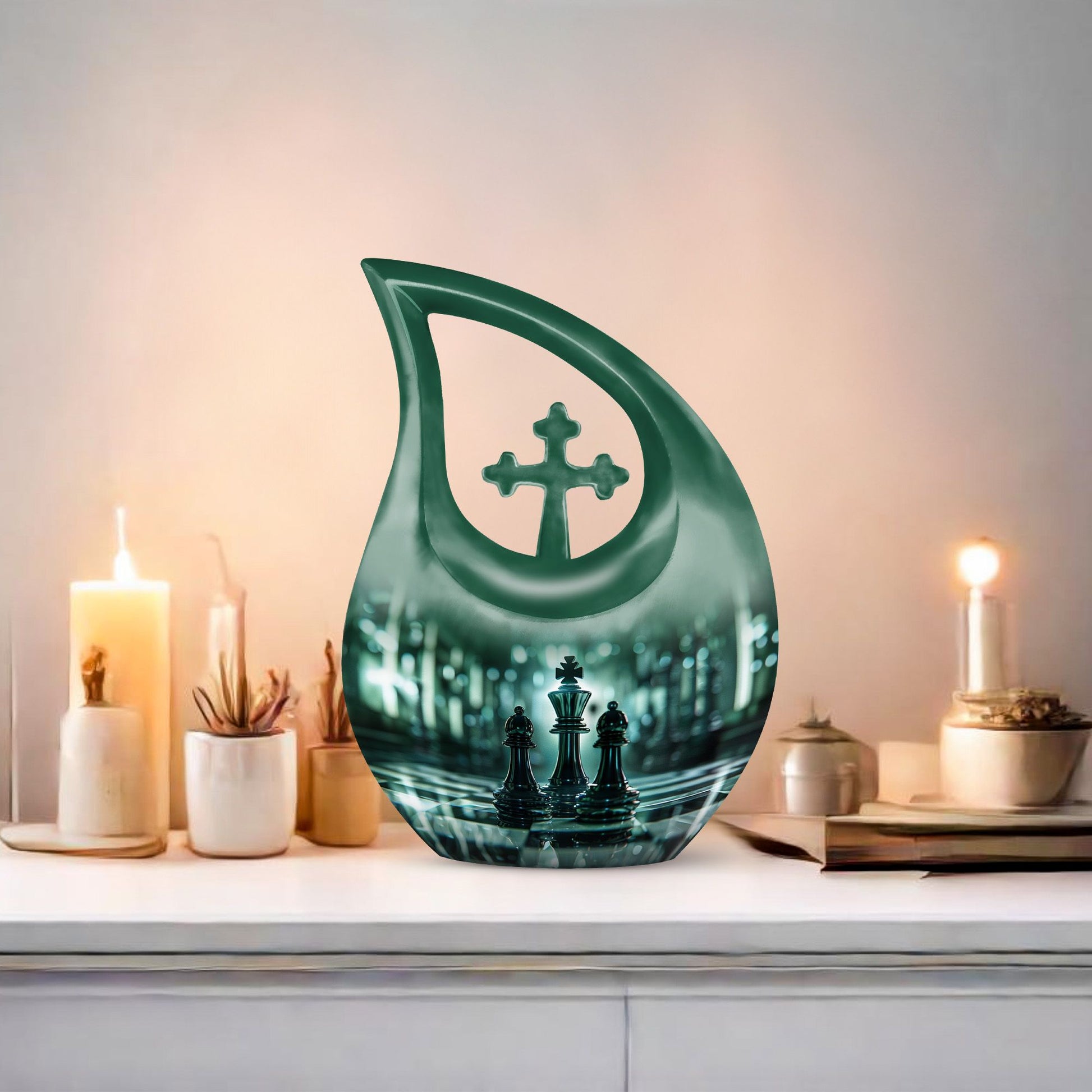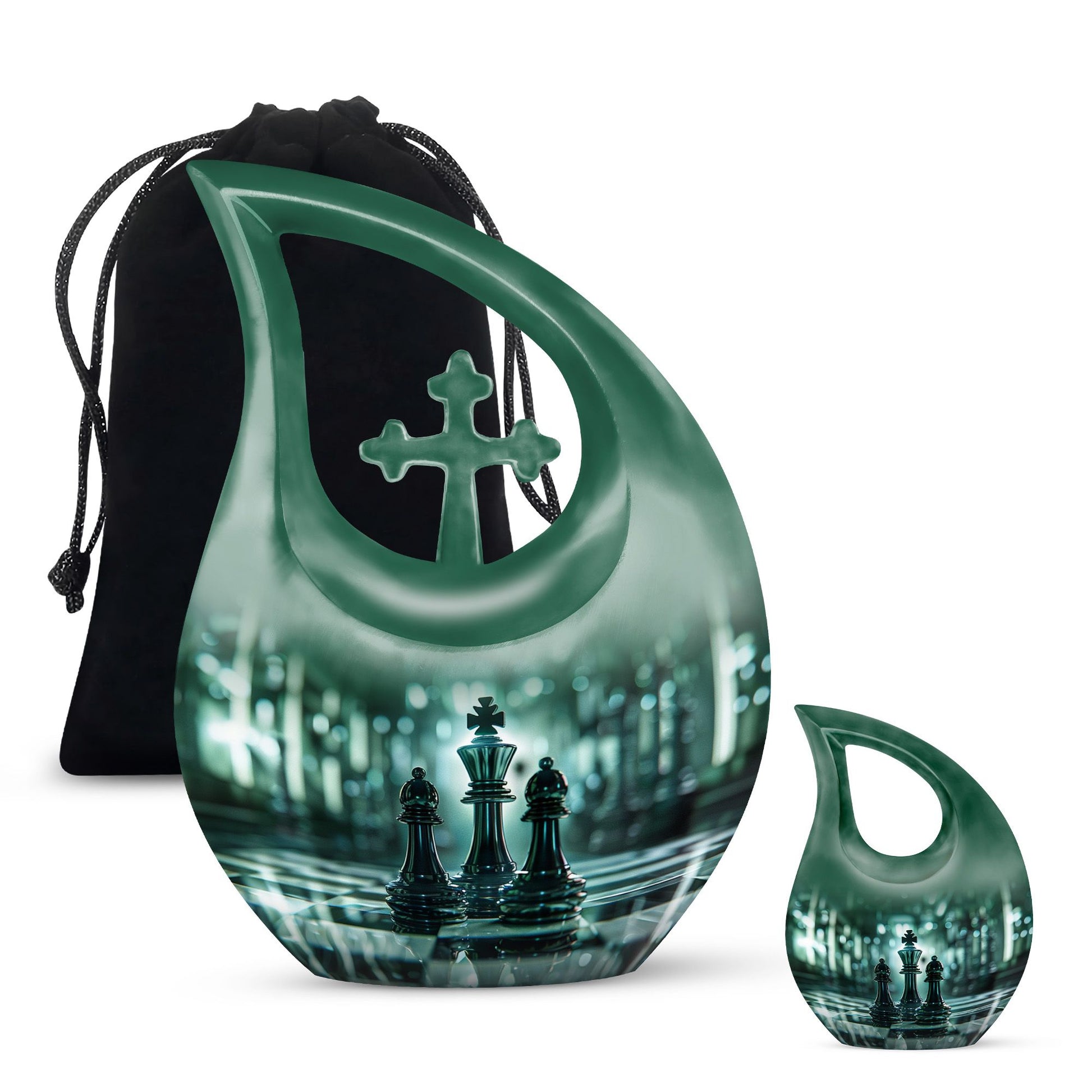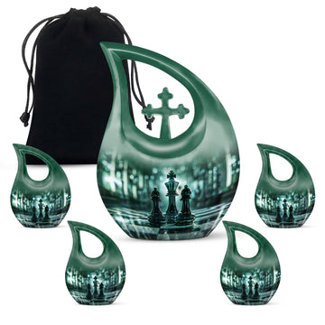 Presenting our distinct Cross Drop design Chess Urn - a combination of sophistication and significance for the refinement of your cherished memories. This 10-inch medium size urn is intricately crafted entirely from robust Aluminium, ensuring its elegance as well as lifetime endurance. Despite its intriguing chess theme artistry, it weighs a mere 3.3 pounds and encapsulates up to '200 cubic inches' of precious ashes or keepsakes. The Chess Urn bears the capacity suitable for most adults, making it an infallible choice amongst customized urns for ashes. To heighten its profound appeal, we offer the provision to personalize the urn with engraved names, encapsulating the essence of your love permanently. Accompanied by a soothing velvet pouch, your memorial tribute finds a respectful containment. Often sought after as a sophisticated keepsake for a man, its charm lies in its originality and symbolic design. Trust our Cross Drop Chess urn to be a memento of mindful memorial urns, curating eternal memories with grace and dignity.