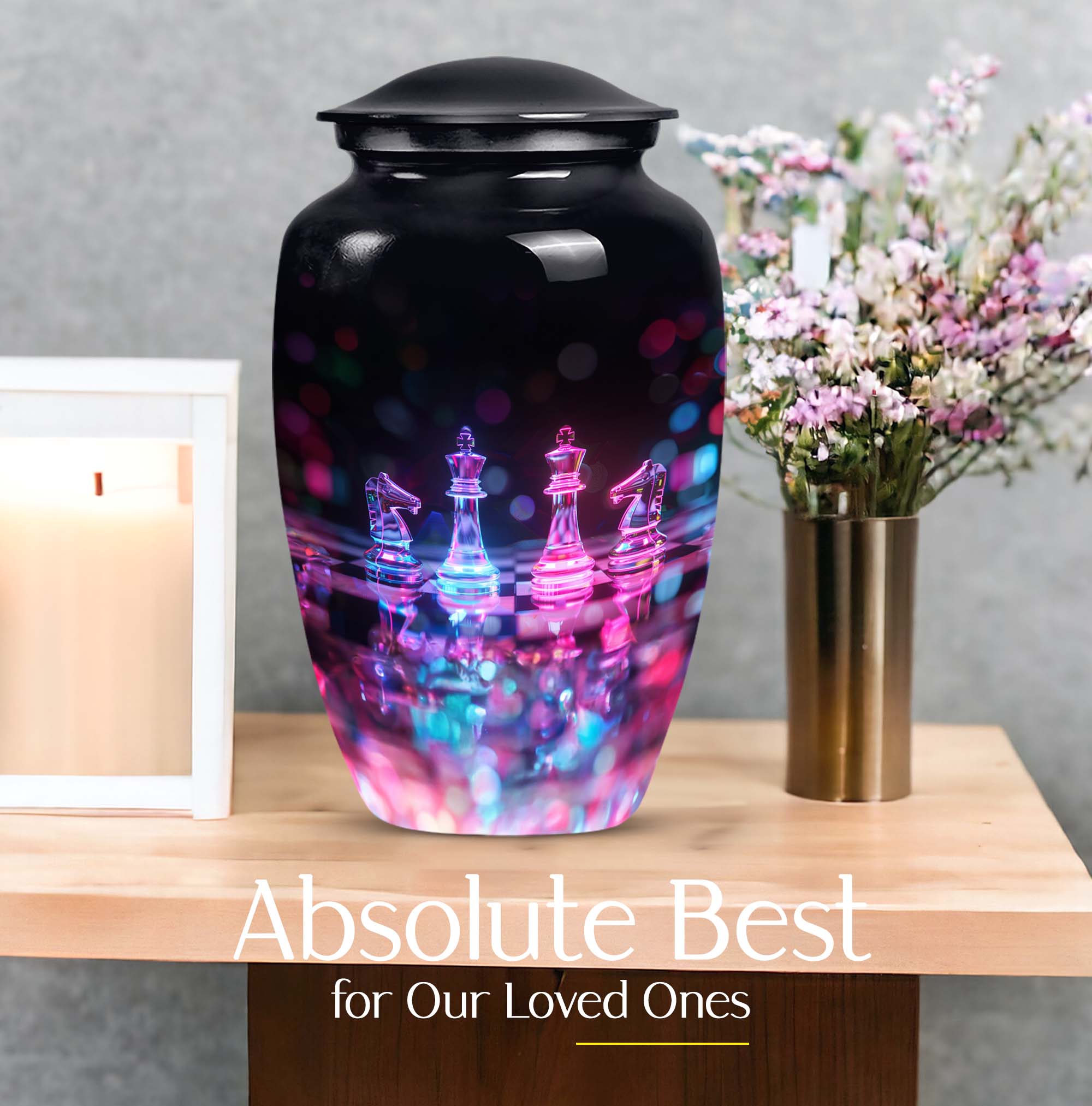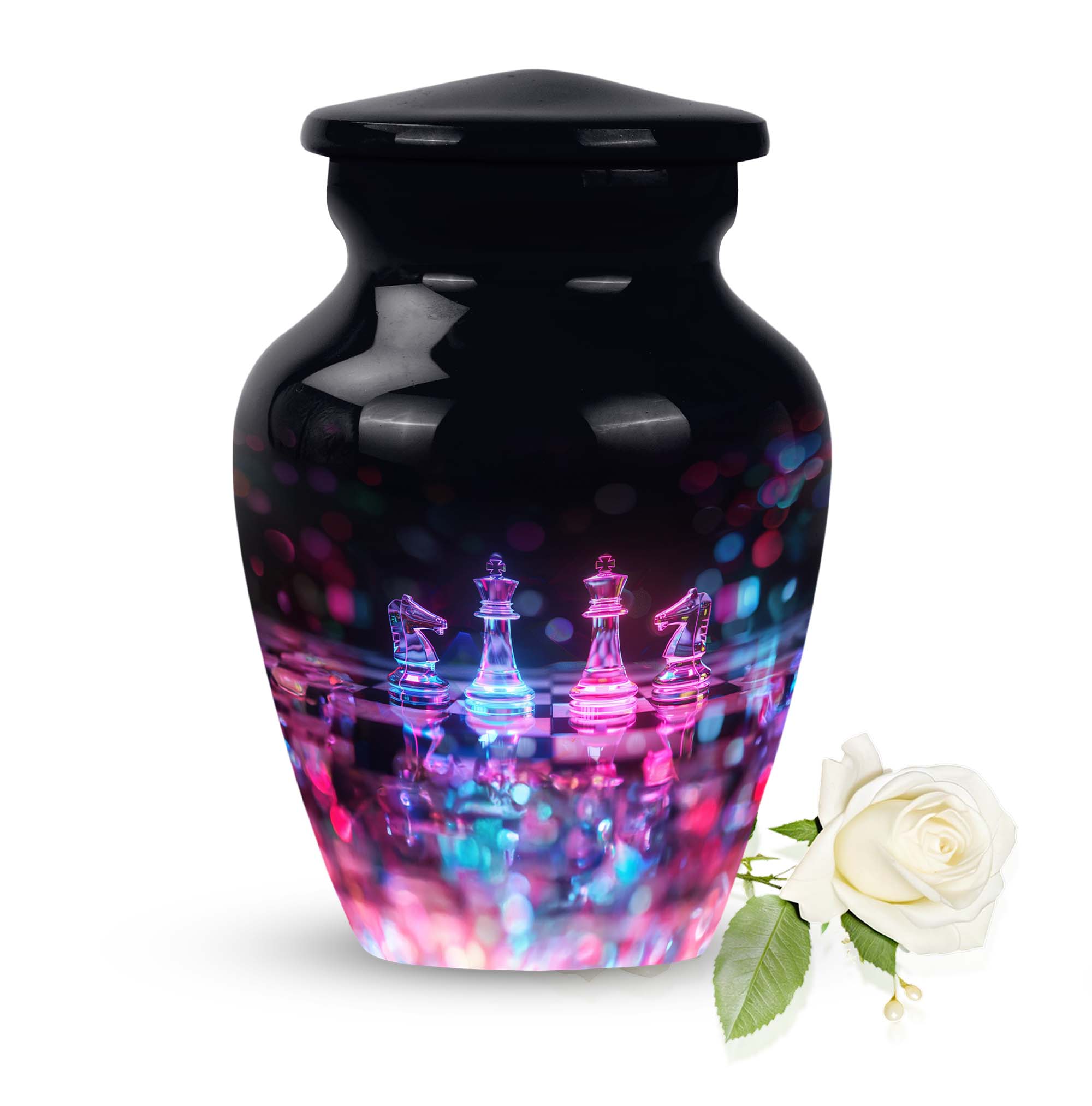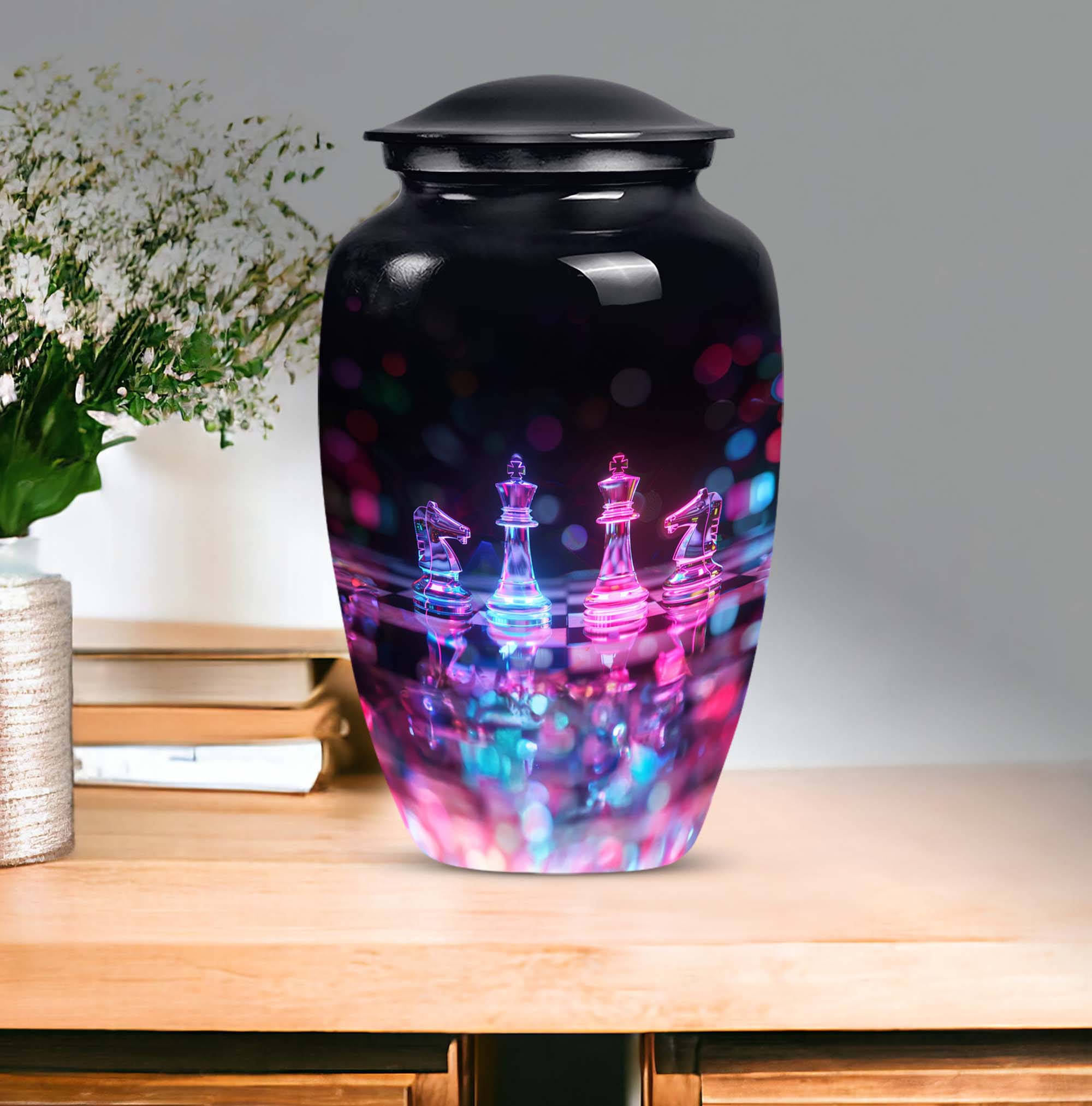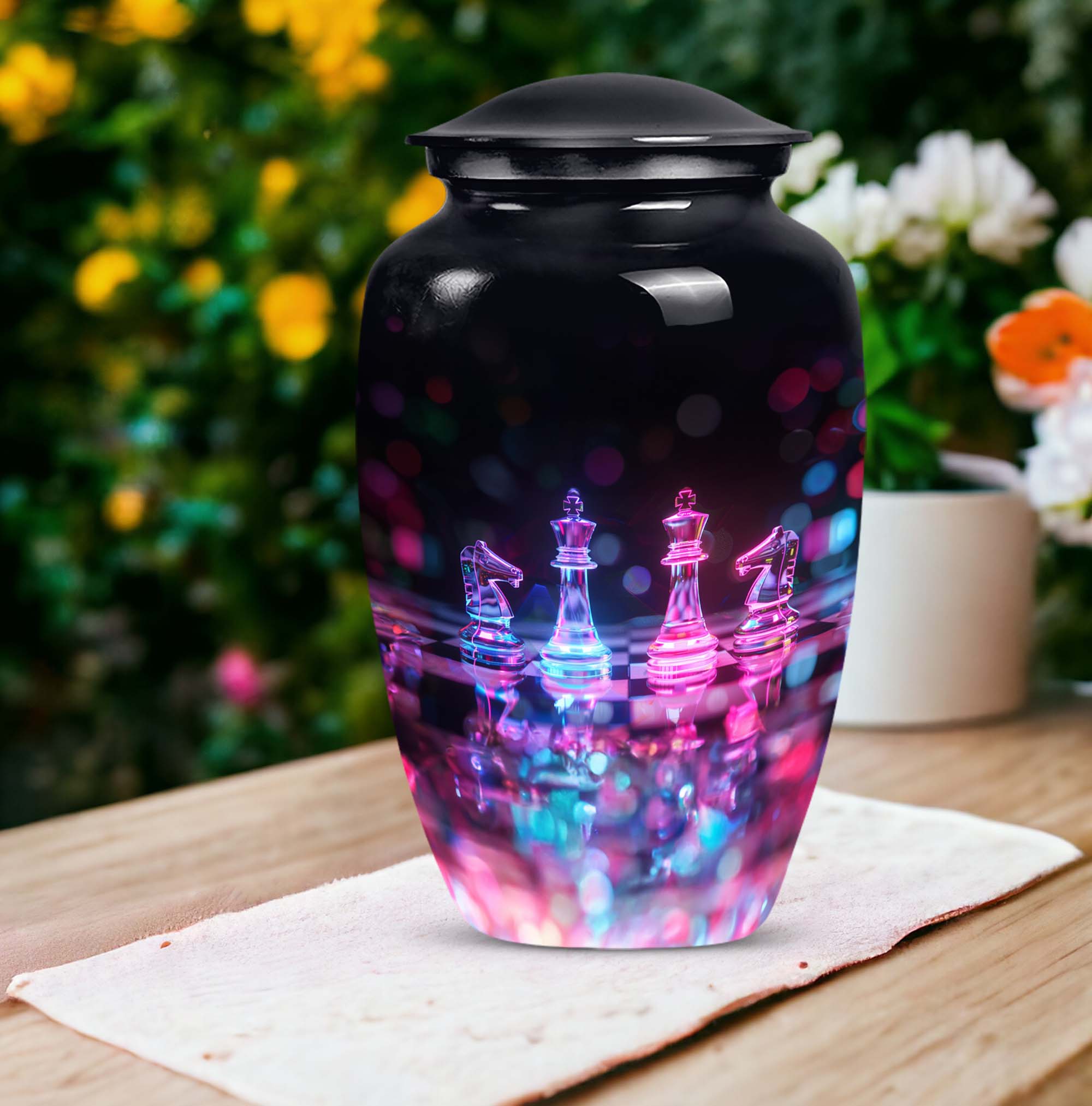 Safeguard your cherished memories of your beloved mother with our beautifully crafted Chess Urn. This 10-inch funeral urn exudes an abstract theme, perfect for those seeking a unique piece to accompany their loved one. Crafted from long-lasting aluminium, it's both high-quality and lightweight at just 3.3 pounds. Delivered with a velvet pouch for containment of ashes, our Large Urn features a capacity of 200 cubic inches, making it ideal for burial in ground. For an even more heartfelt expression, you can personalize the urn with engraved names, putting a delicate finishing touch on your memorial tribute. Boasting a classic theme, our product stands out in the category of Memorial Ceremony Supplies. Regardless of whether you're seeking urns for female, or personalized memorial urns - you are bound to appreciate the craftsmanship of this metal urn. Note: This product does not feature specific designs. Unique urn for ashes is a beloved choice among our customers.