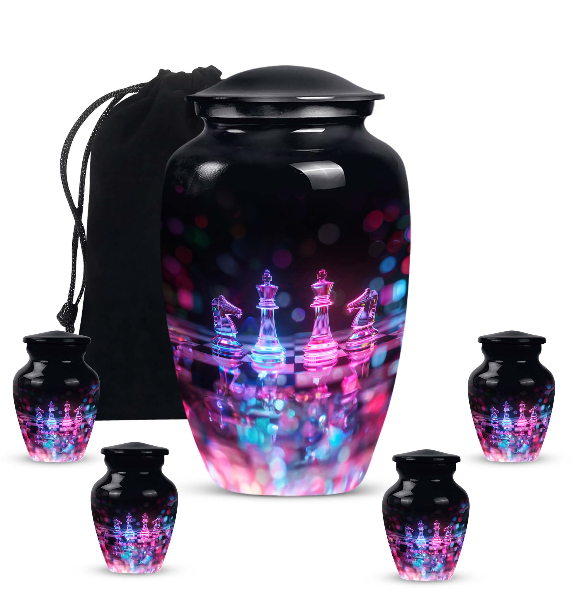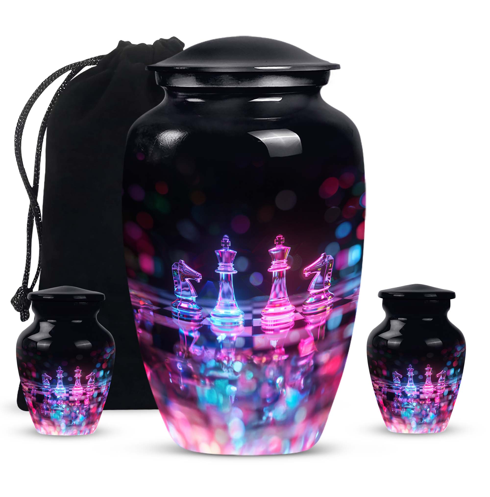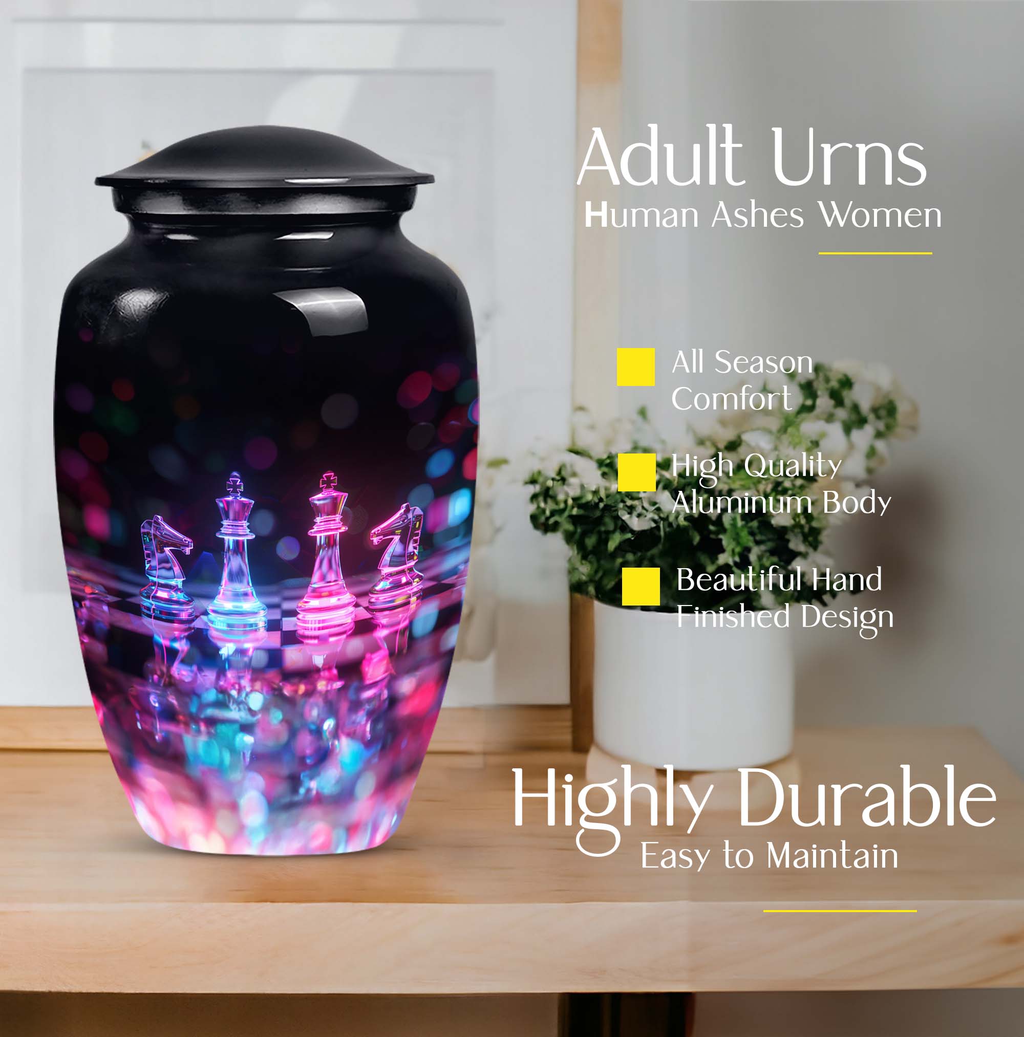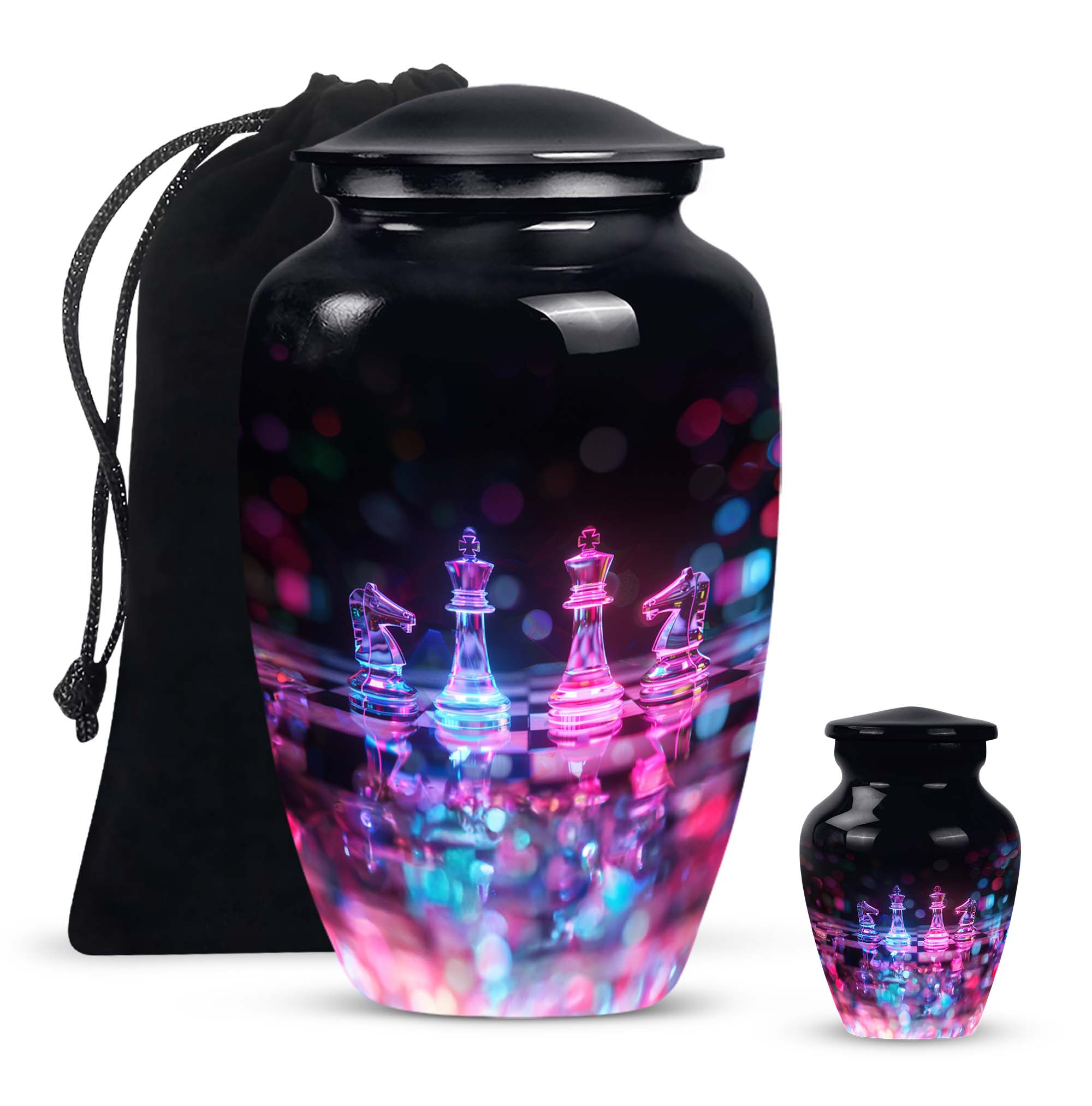 Safeguard your cherished memories of your beloved mother with our beautifully crafted Chess Urn. This 10-inch funeral urn exudes an abstract theme, perfect for those seeking a unique piece to accompany their loved one. Crafted from long-lasting aluminium, it's both high-quality and lightweight at just 3.3 pounds. Delivered with a velvet pouch for containment of ashes, our Large Urn features a capacity of 200 cubic inches, making it ideal for burial in ground. For an even more heartfelt expression, you can personalize the urn with engraved names, putting a delicate finishing touch on your memorial tribute. Boasting a classic theme, our product stands out in the category of Memorial Ceremony Supplies. Regardless of whether you're seeking urns for female, or personalized memorial urns - you are bound to appreciate the craftsmanship of this metal urn. Note: This product does not feature specific designs. Unique urn for ashes is a beloved choice among our customers.