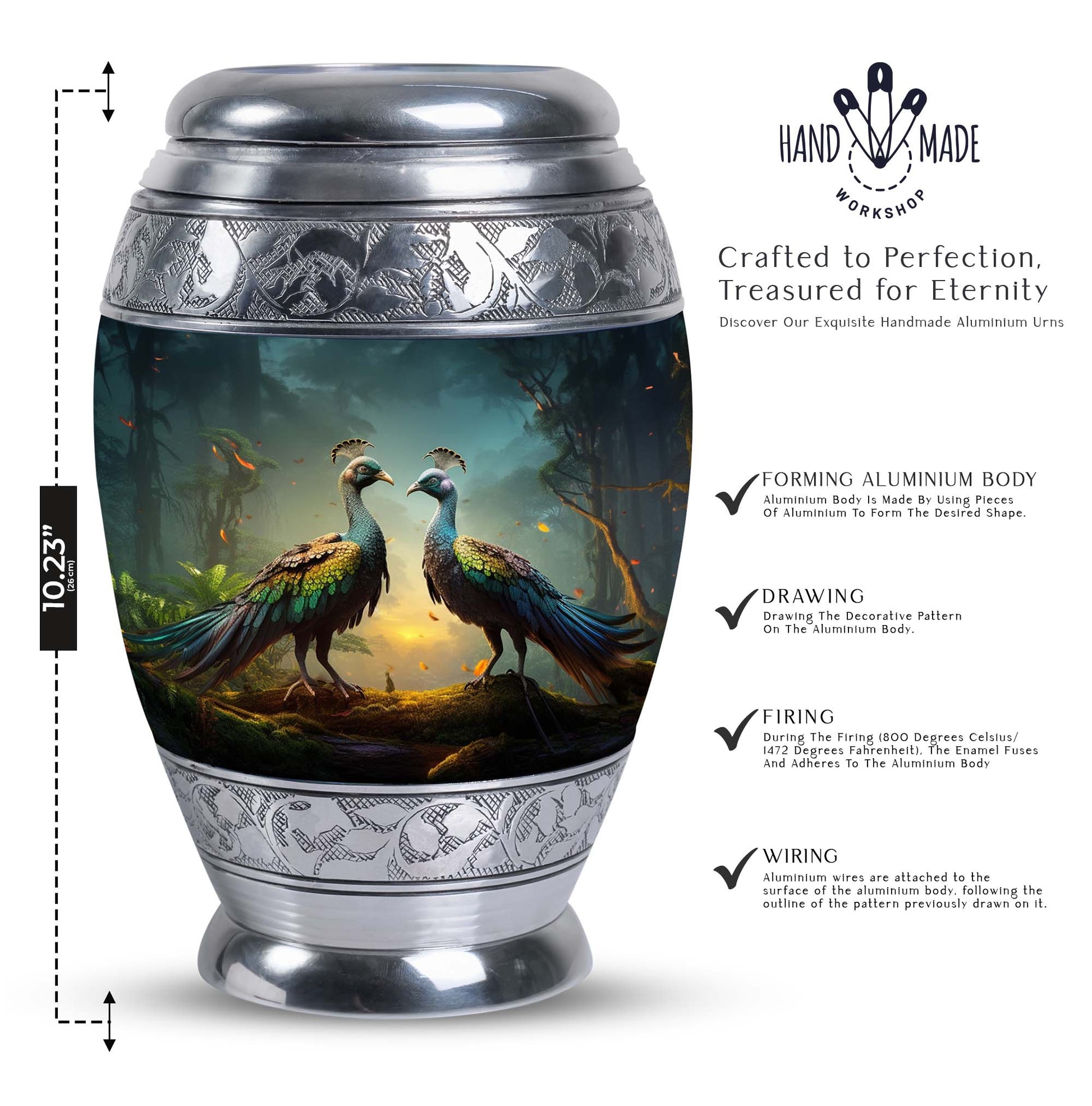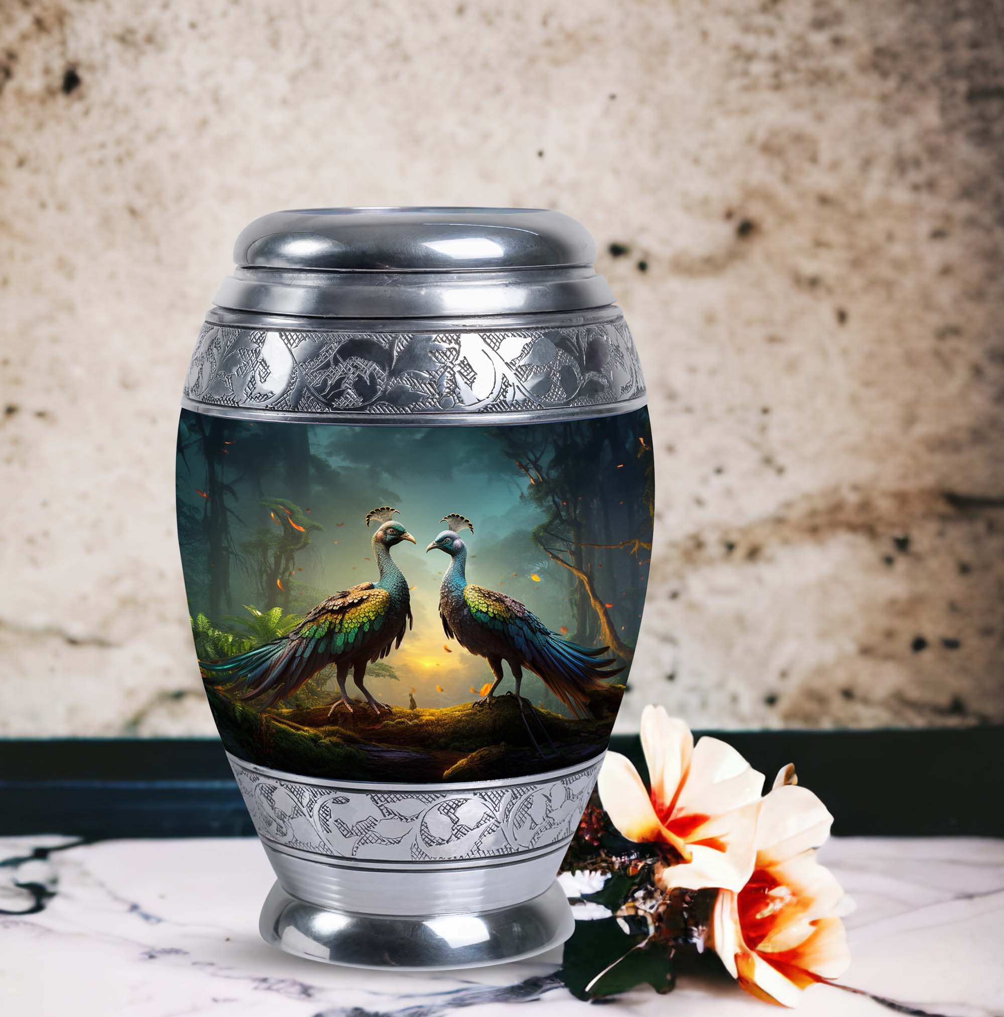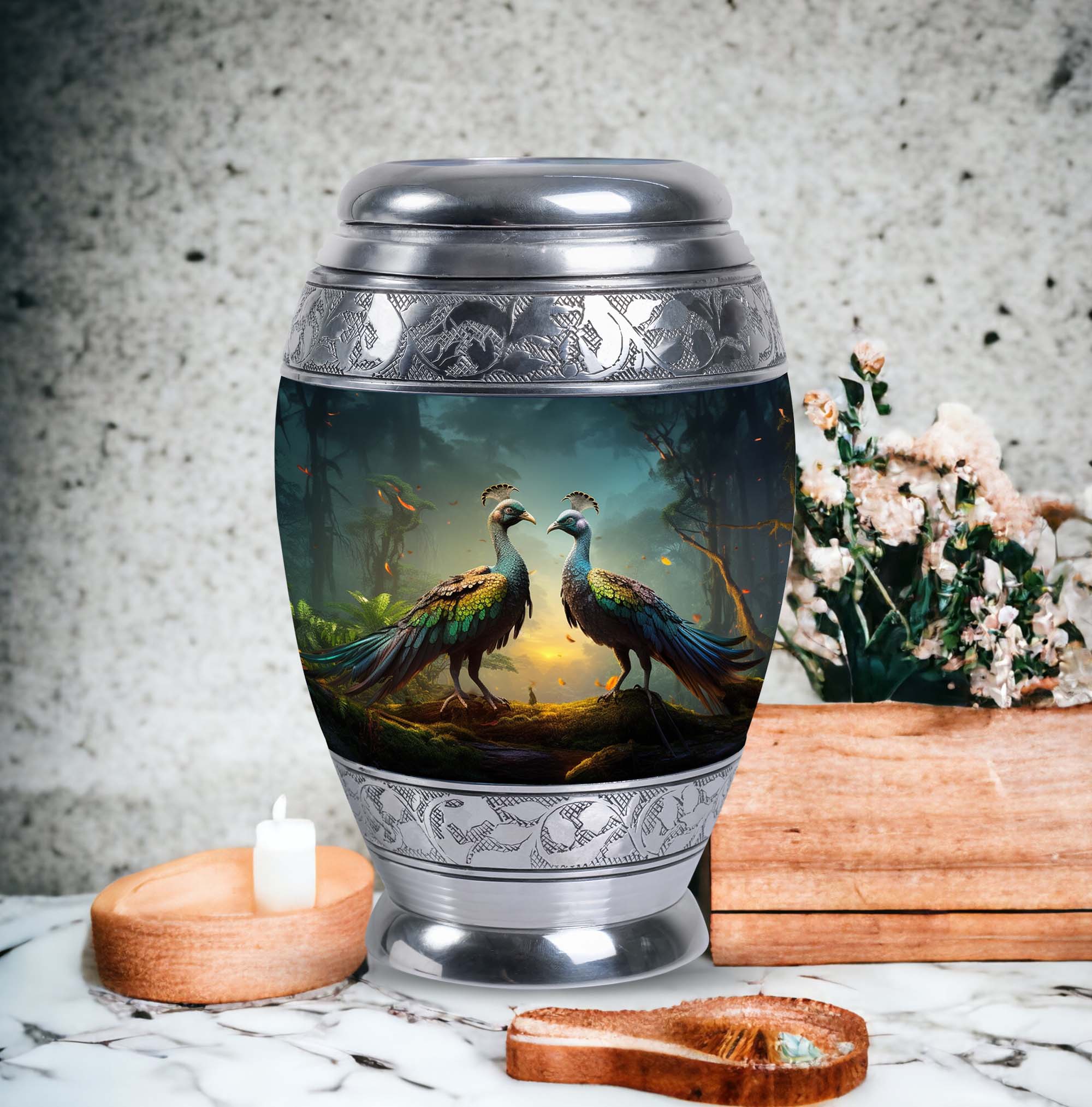 Introducing our resplendent Peacock Urns for Human Ashes, their exquisite design is an ideal homage to your loved ones. Crafted with utmost precision and high-quality aluminium, these 3-inch keepsake urns are not only elegant but extremely durable. Hefting a manageable 3.3 pounds, they stand at an impressive height of 10 inches and can securely hold up to 200 cubic inches of ash, making them apt for most adults. This classic urn series also offers a personal touch. Customize it by engraving names, bestowed with sentiments and eternal love on these unique Large Urns. Each urn comes complete with a special velvet pouch for containment of ashes, expressing a delicate and respectful approach to the task at hand. Embrace the essence of your beloved with our exceptional range of 'memorial urns' or gift a personal token of remembrance in the form of Urns for Men's Ashes. With the Peacock urn, let each ornate feather represent cherished memories, making your farewell as unique as the life lived. Note: Kindly avoid the usage of abrasive cleaning products to ensure longevity.