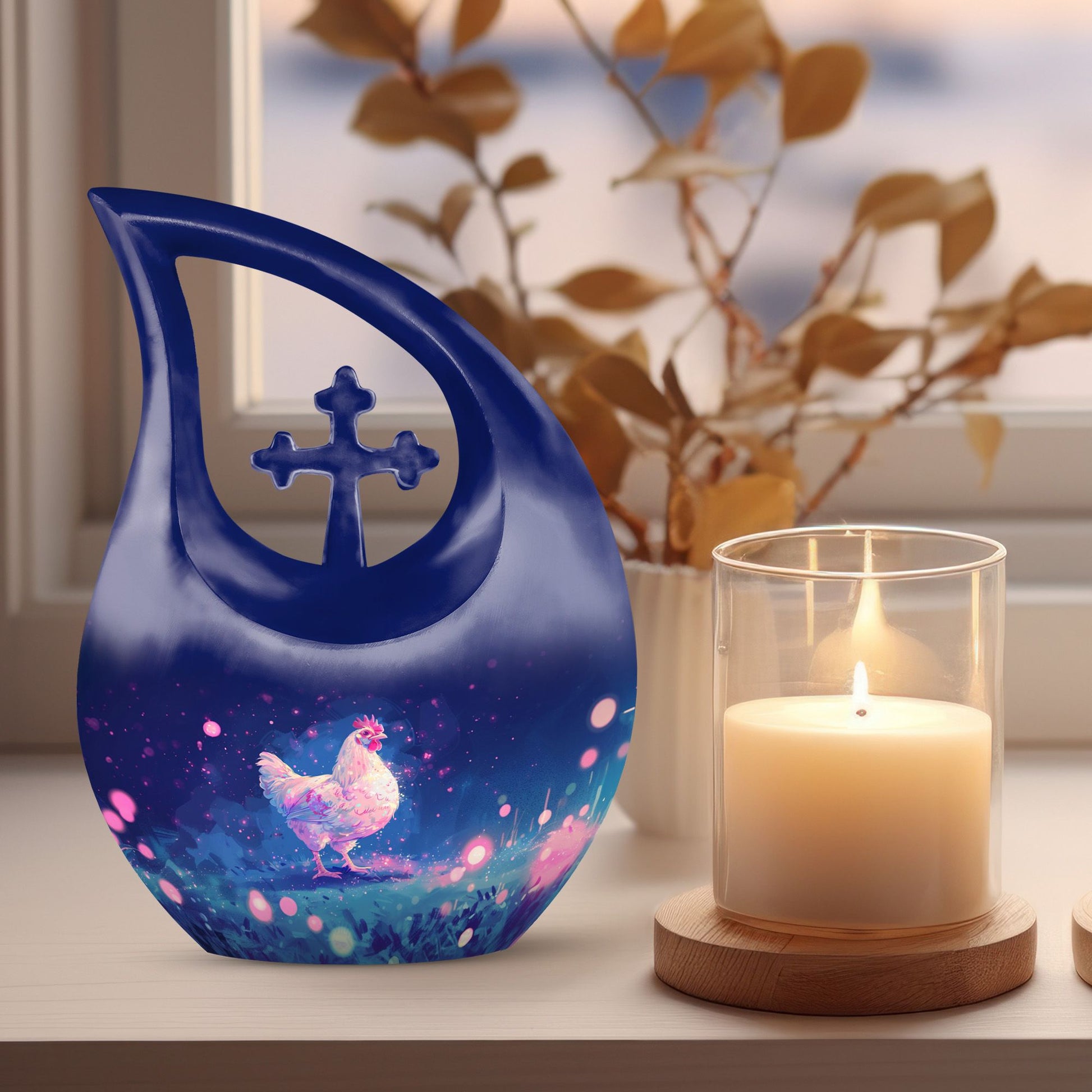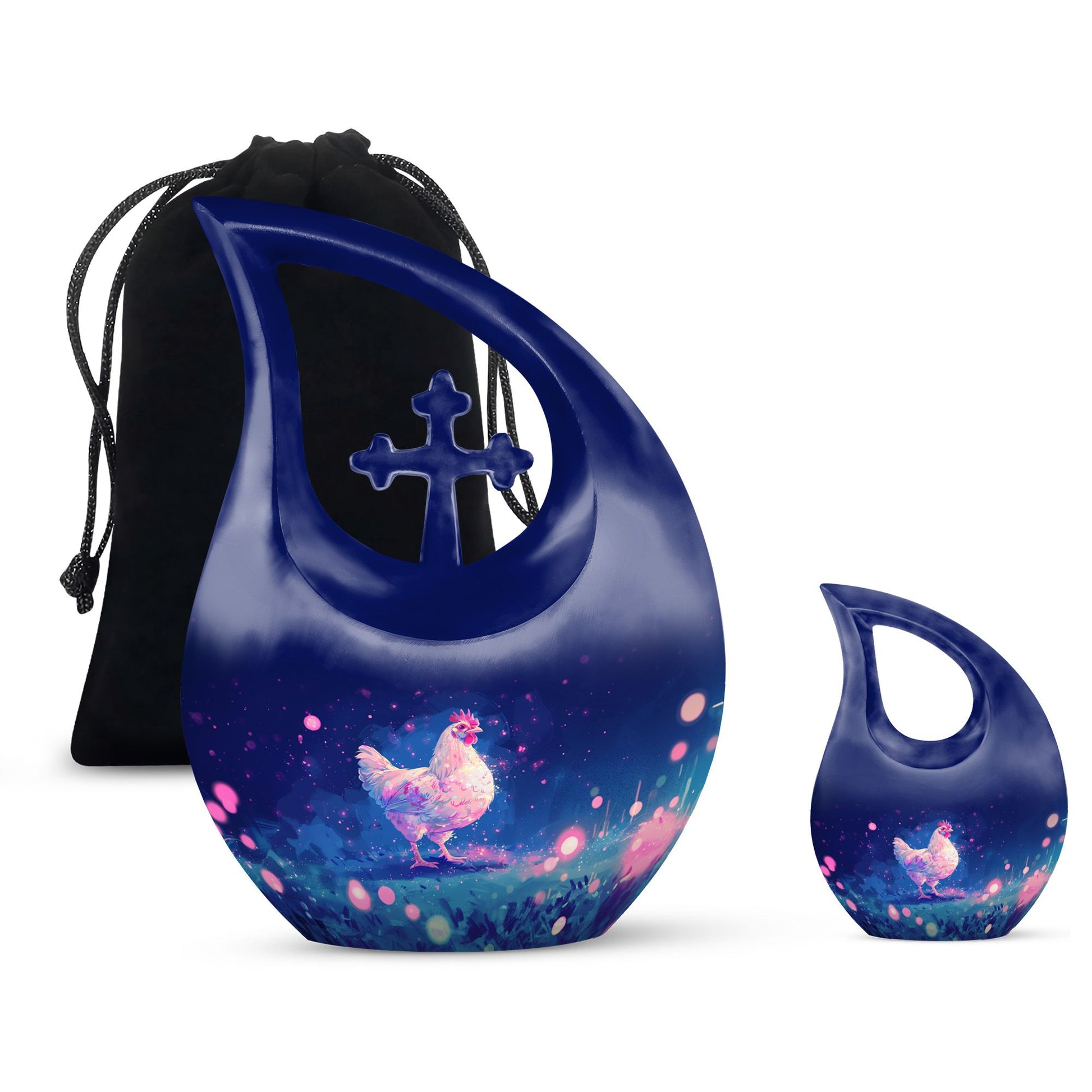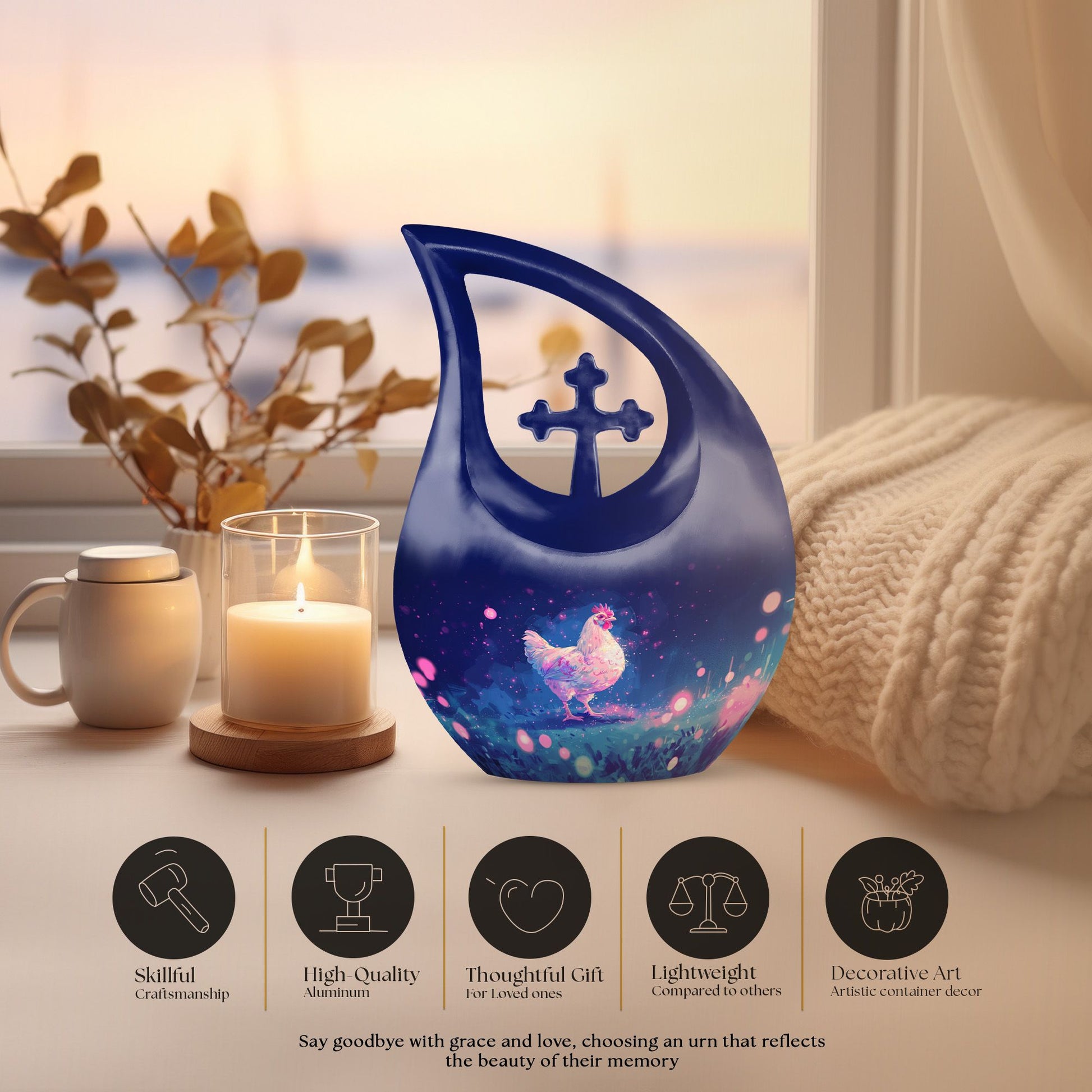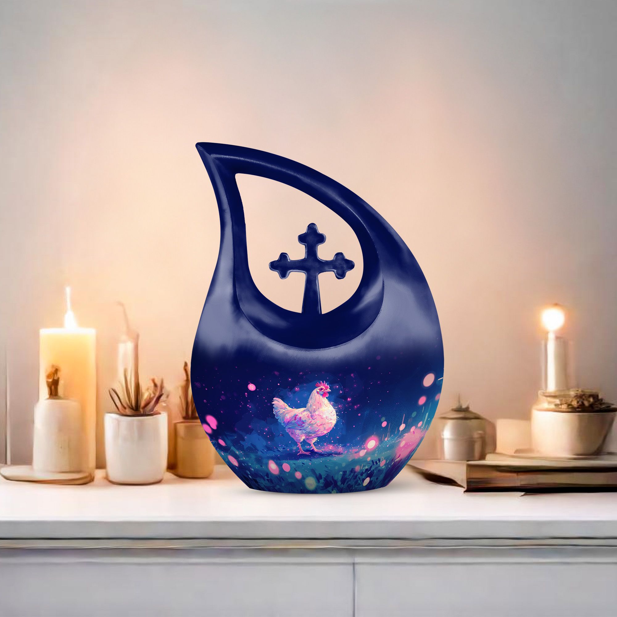 Presenting the Magical Chicken Cosmos Urn, a tranquil piece meant to symbolize life’s precious journey, designed specifically for those seeking unique and affordable memorial urns. Standing gracefully with a size of 10 inches, this large urn carries an emblematic Cross Drop design, reflecting spiritual peace and serenity. Cast from sturdy aluminum, it weighs 3.3 pounds and gives the assurance of enduring time, safeguarding memories with grace. The urn provides a substantial capacity of 200 cubic inches. Accompanied by a delicate velvet pouch, it enables worry-free containment of your loved ones' ashes. Brimming with personal touch, you can customize it with engraved names, bringing an emotional closeness with your departed. The Magical Chicken Cosmos theme adds an unexpected touch to it, promising it as one of the cool urns available out there. Also serves as a companion urn, confirming its position among the best high-quality urns for human ashes. Stay assured, your search for memorial urns for human ashes ends here.