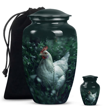 This 10-inch Chicken Urn is more than just a resting place for the ashes of your loved ones. Crafted with care, its unique flower theme blends the sacred sentiments of remembrance with an aesthetic charm. Weighing at 3.3 pounds, the urn is fashioned from high-quality aluminium, ensuring lasting durability. Its capacity is substantial at 200 cubic inches, capable of containing ashes from an adult male. The urn comes with a velvet pouch for containment of ashes, providing a dignified enclosure. Personalize it with engraved names, adding a touch of familiarity to the remembrance. The distinctiveness of this Large Urn lies not just in its classic design but also in the love and respect it signifies for the departed soul. This memorial urn signifies more than just remembrance, it is a heartfelt testament encapsulating dearly cherished moments. Ideal for those search phrases - memorial urns, cremation urns for men, and urn for human ashes adult men.