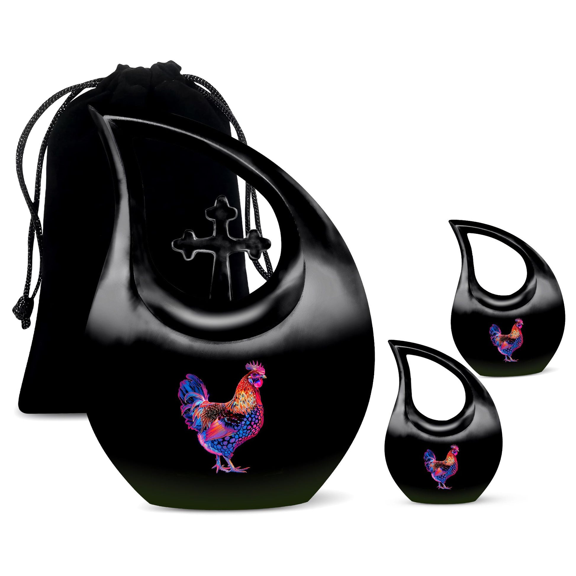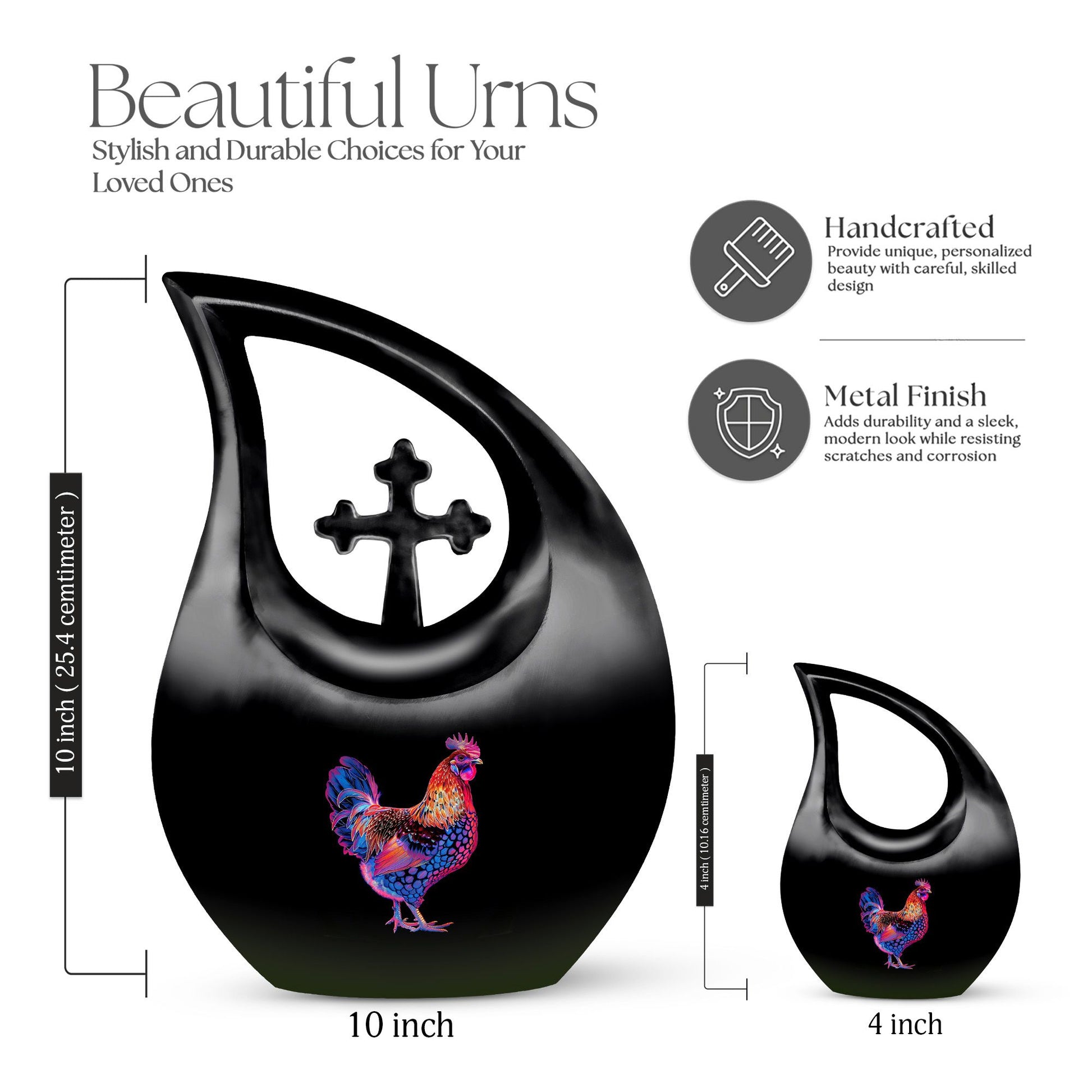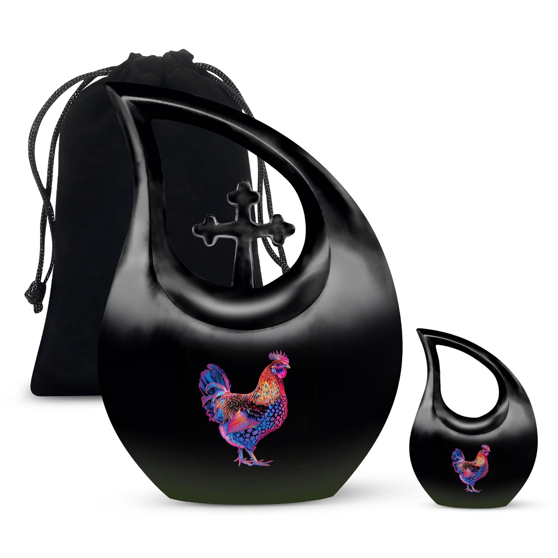 Mark the memory of a beloved person or pet with this meticulously crafted, aluminium Chicken Urn. With a 200 cubic inch capacity and standing at 10 inches in height, this large urn artfully blends functionality with sentimentality, providing a dignified resting place for those dearly departed. The Cross Drop theme serves as a serene reminder of the natures of life, with the included velvet pouch offering a fitting containment for the ashes. In addition, this Urn brings an opportunity for you to add a personal touch with our suggested custom urns service. Feel free to engrave the names of your loved one onto this memorial urn, making it truly unique. An artful piece, this elegantly crafted urn is not just an affordable burial option but also an enduring piece of decor. It holds its place among small urns and companion urns, appealing to searches for 'Custom Urns For Ashes'.