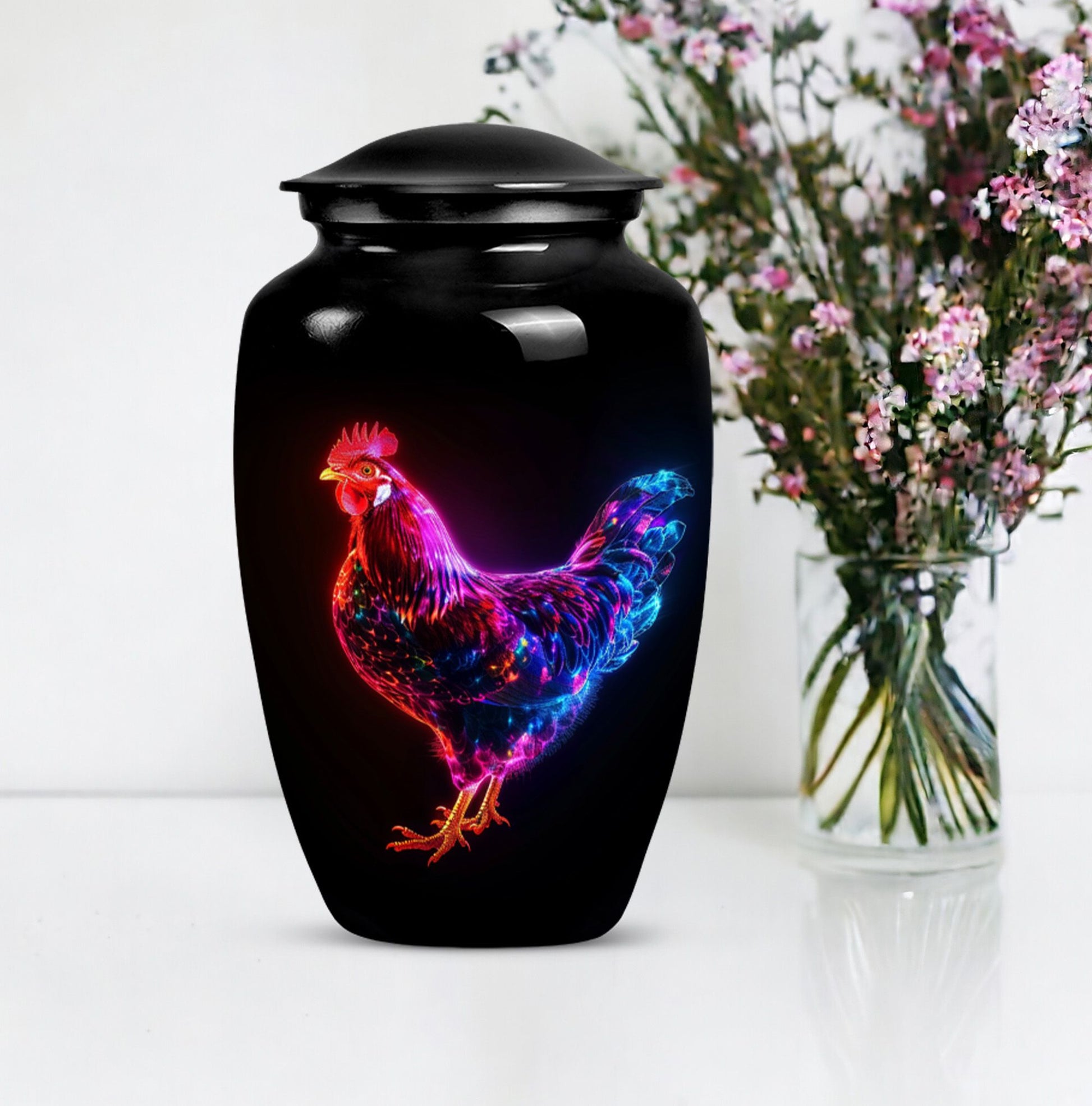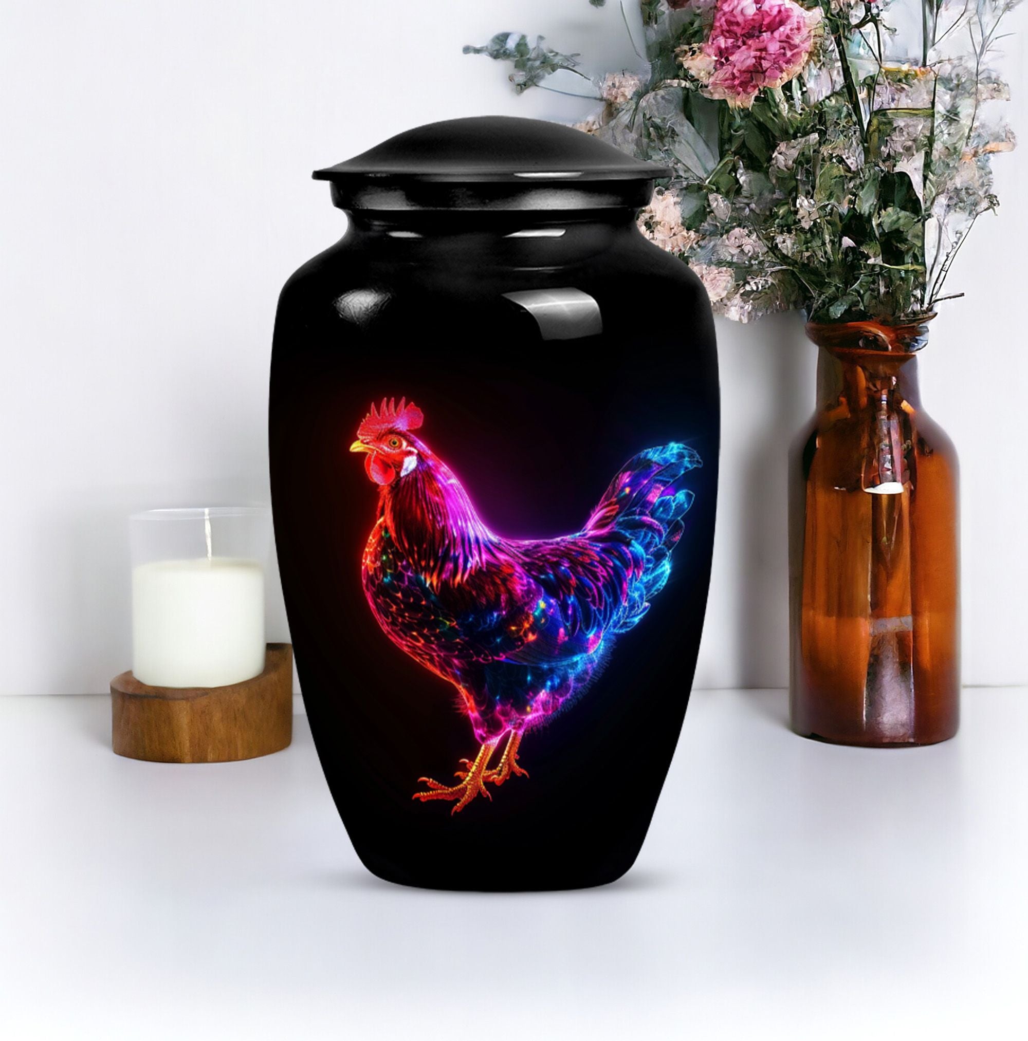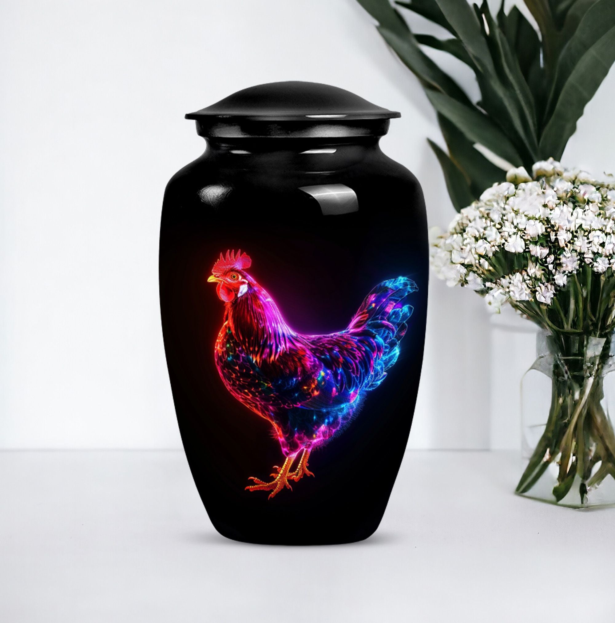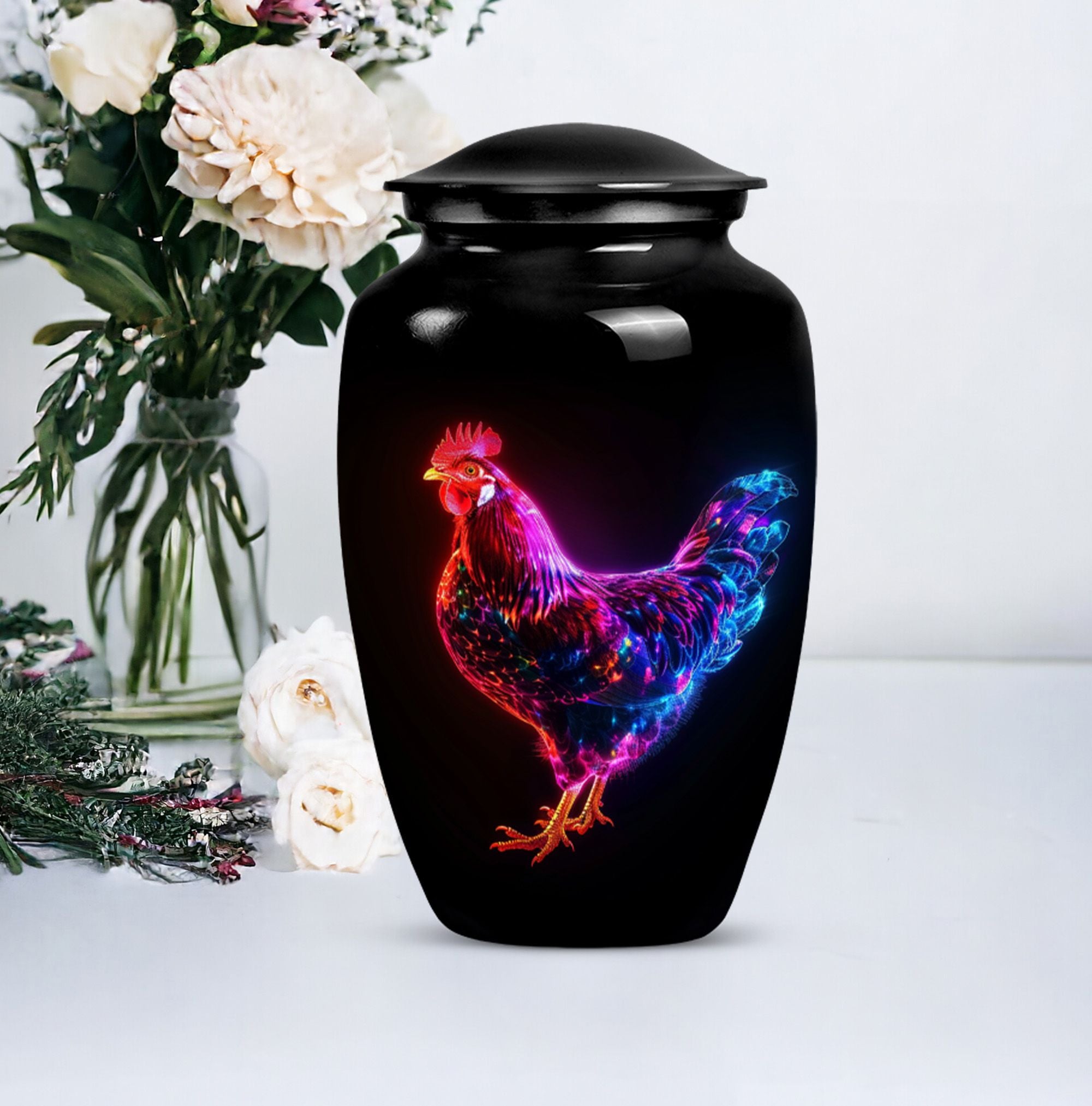 Cherish your loved one's memory with our timeless 'Flower-themed' Chicken Urn, thoughtfully designed for the respectful containment of ashes. A large urn fashioned from high-grade aluminium, it stands at a significant height of 10 inches and notably weighs 3.3 pounds. The urn is both suave and substantial as it boasts a capacity of 200 cubic inches, making it ideal for an adult or senior's tribute. Highlight your precious relationship with our personalization feature allowing engraved names on this exquisite piece. The purchase includes an elegant velvet pouch, effortlessly holding the cremation urn with utmost discretion. Seize this opportunity to celebrate your loved one's life by investing in our 'Cremation Urn for Dad,' servicing as a audible testament for their undying spirit. Witness the extraordinary blend of elegance and sentimentality, encapsulated perfectly in our hand-picked selection of memorial urns. Do remember, your choice to use keywords like 'Burial ash urns for humans and urn for human ashes will streamline your search for this exquisite token of remembrance.