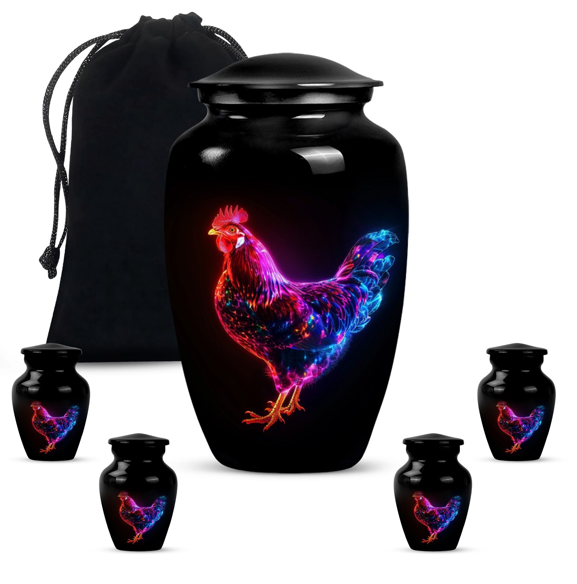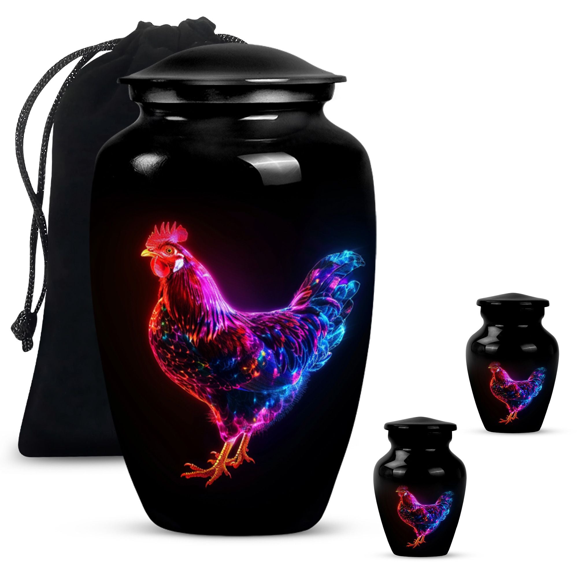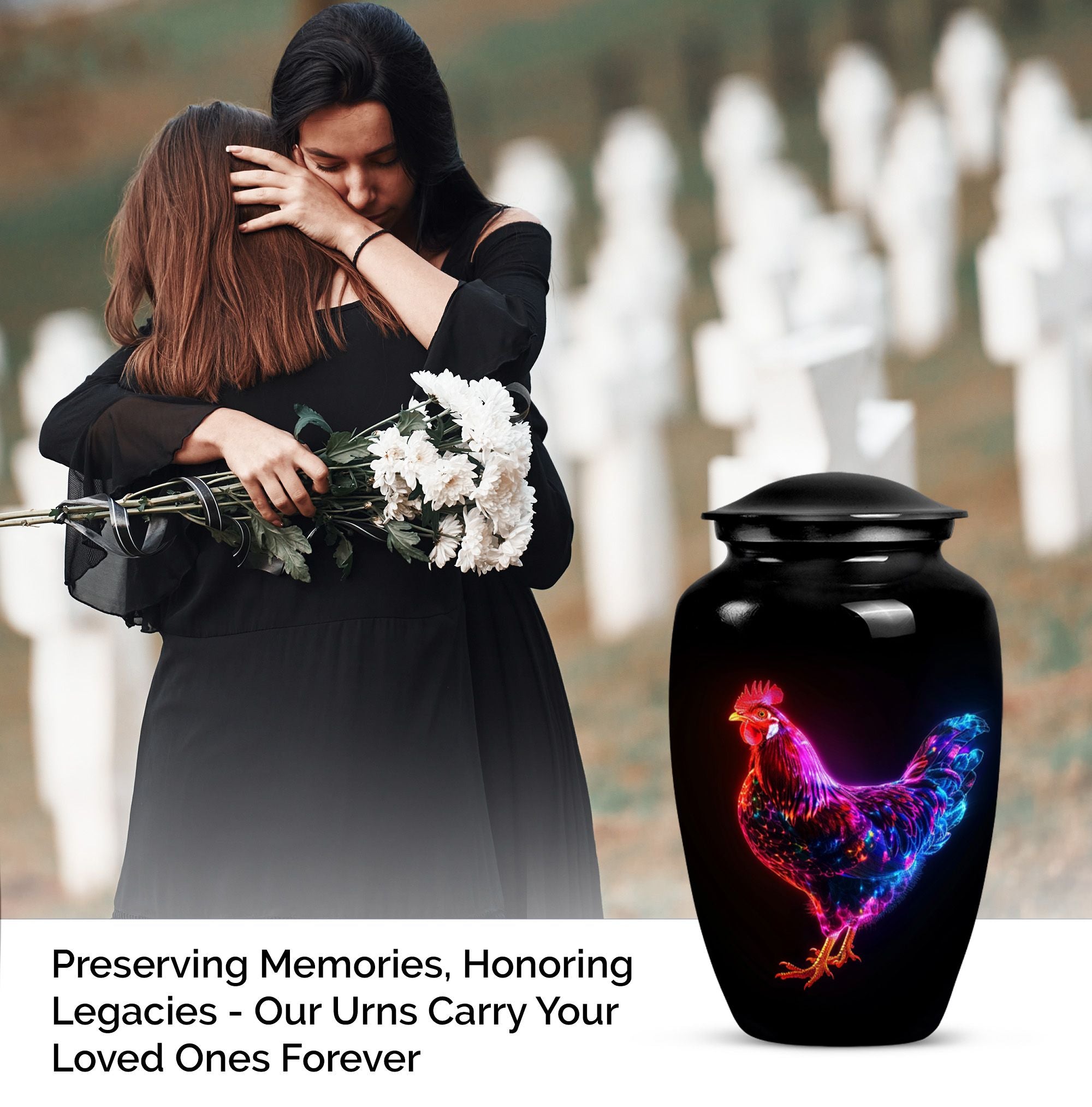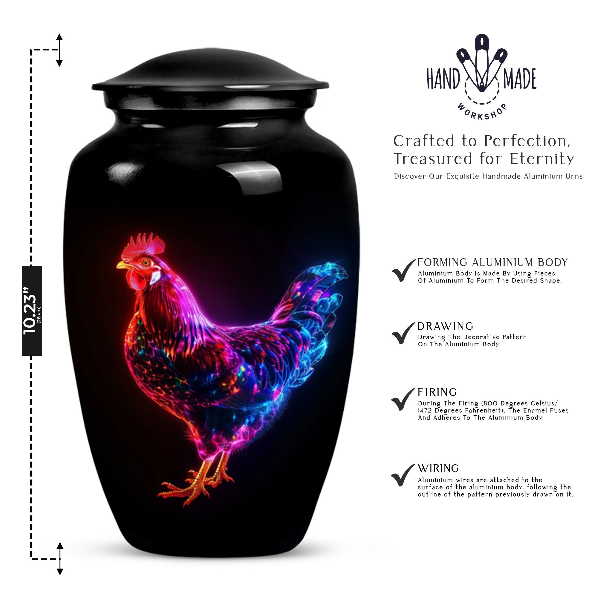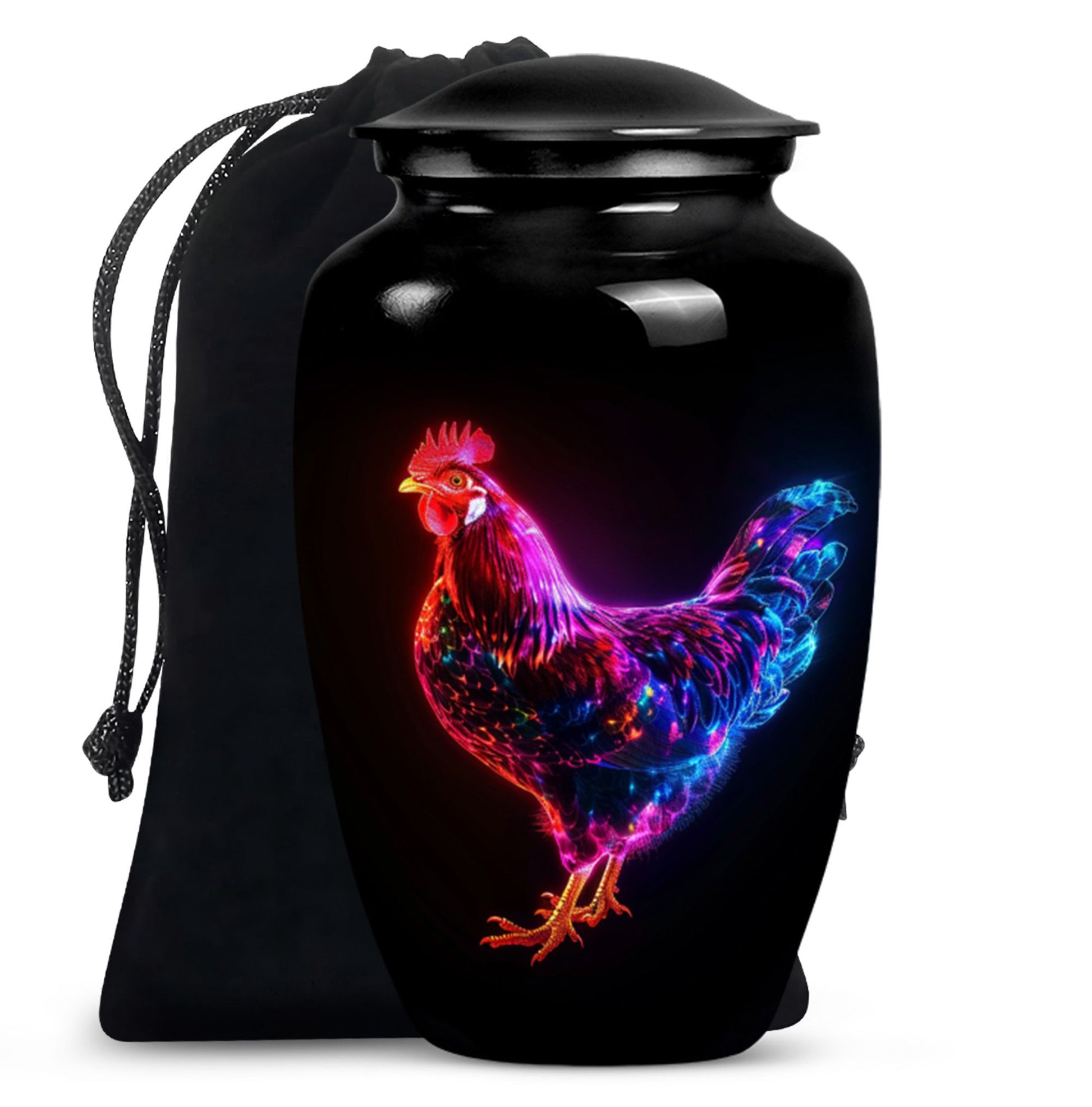 Cherish your loved one's memory with our timeless 'Flower-themed' Chicken Urn, thoughtfully designed for the respectful containment of ashes. A large urn fashioned from high-grade aluminium, it stands at a significant height of 10 inches and notably weighs 3.3 pounds. The urn is both suave and substantial as it boasts a capacity of 200 cubic inches, making it ideal for an adult or senior's tribute. Highlight your precious relationship with our personalization feature allowing engraved names on this exquisite piece. The purchase includes an elegant velvet pouch, effortlessly holding the cremation urn with utmost discretion. Seize this opportunity to celebrate your loved one's life by investing in our 'Cremation Urn for Dad,' servicing as a audible testament for their undying spirit. Witness the extraordinary blend of elegance and sentimentality, encapsulated perfectly in our hand-picked selection of memorial urns. Do remember, your choice to use keywords like 'Burial ash urns for humans and urn for human ashes will streamline your search for this exquisite token of remembrance.