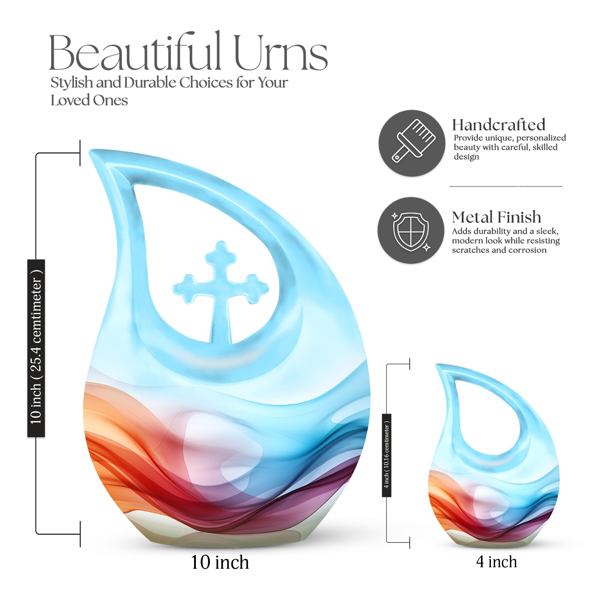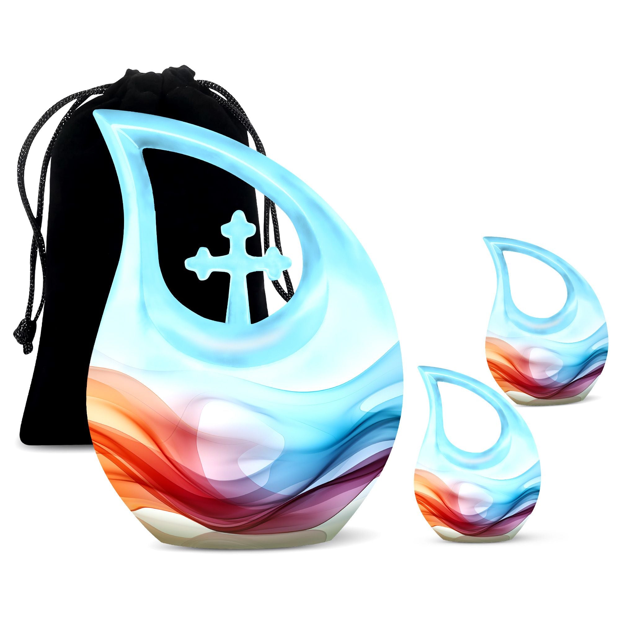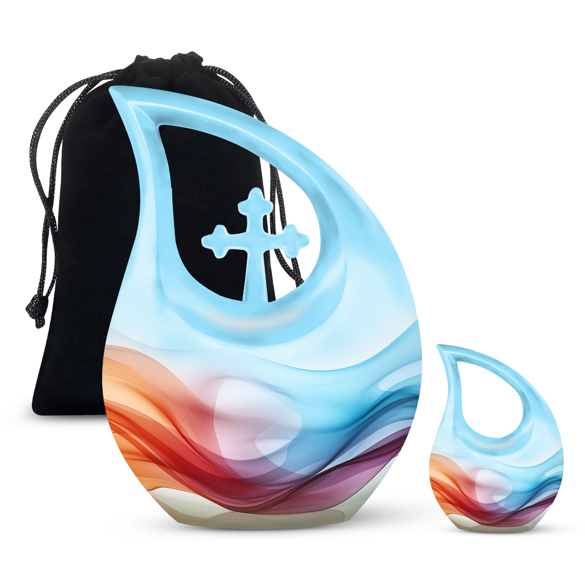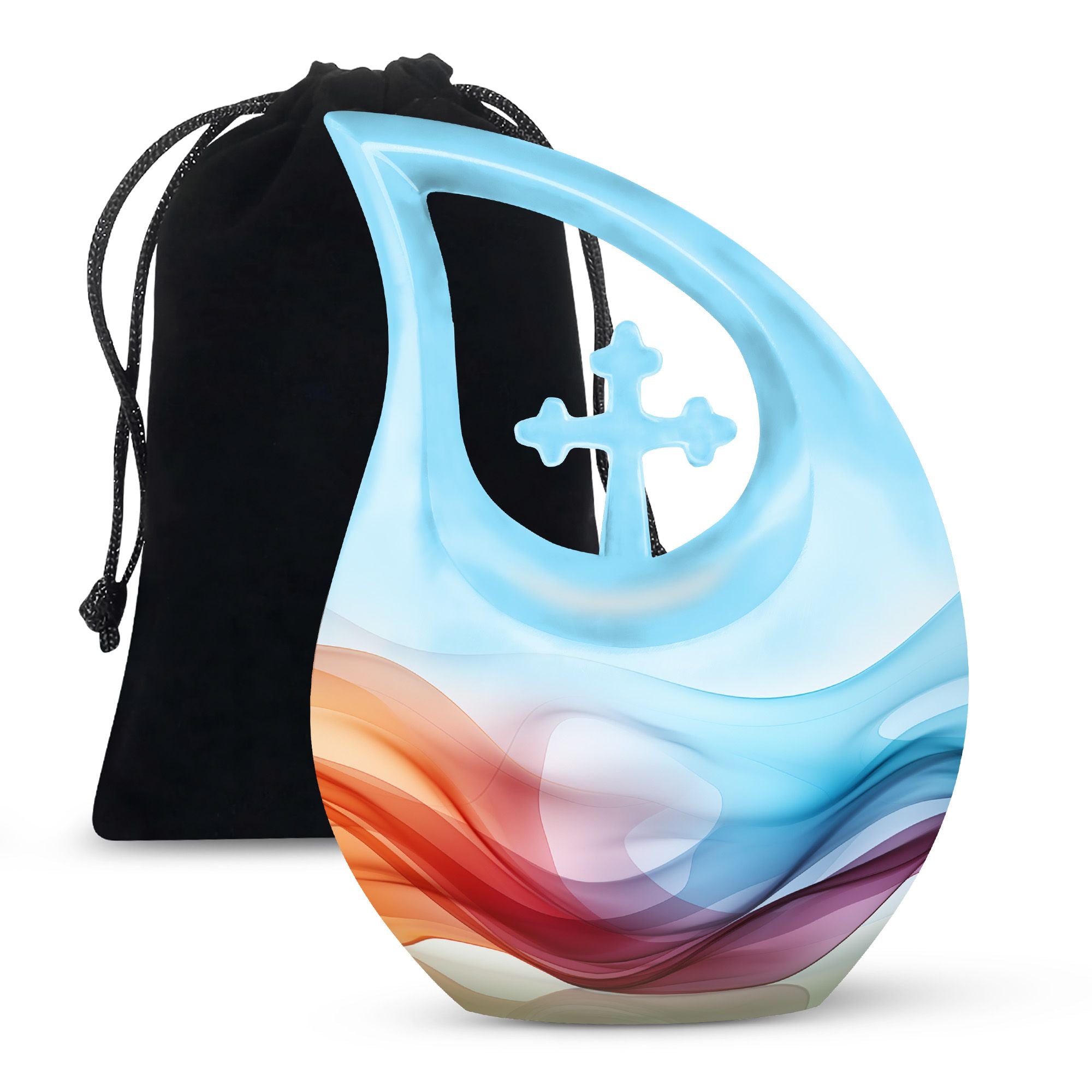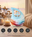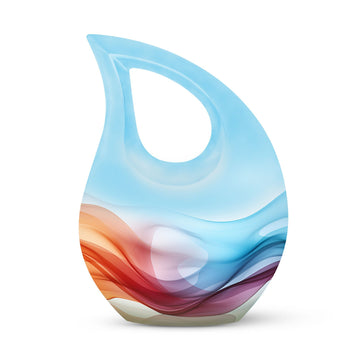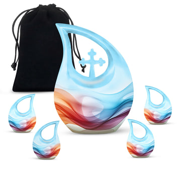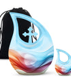 Honor your loved ones and keep their memories close to heart with our Chromatic Ripples Urn. This precious keepsake, earmarked for the 'Memorial Ceremony Supplies' category is more than just a token. It is a large Aluminium urn crafted with utmost care, standing tall at 10 inches, weighted at 3.3 pounds with a generous capacity of 200 cubic inches, attesting to the remarkable craftsmanship. The highlight of this urn is its unique Cross Drop design theme, signifying a divine connection with every ripple doing justice to the term 'Chromatic Ripples'. Personalize this urn with your choice of engraved names, maintaining that personal essence intact. Your purchase includes a delicate velvet pouch meant for the containment of ashes, ensuring the utmost respect and dignity towards the departed. Let our Chromatic Ripples Urn be the emblem of their memories and precious moments, rendering a peaceful, final rest. Suitable search terms for this product could include 'Memorial Urns', 'Containers for Human Ashes', 'Beautiful Urns for Ashes', 'Ashes Urns for Sale', and 'Small Container to Hold Ashes'.
