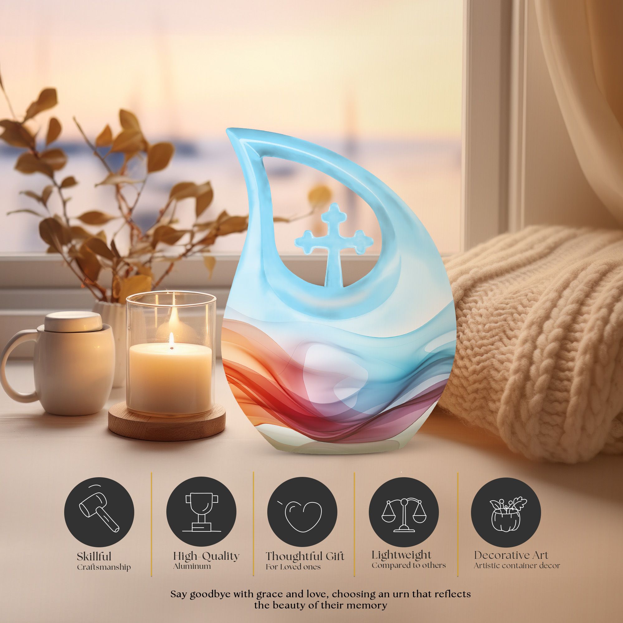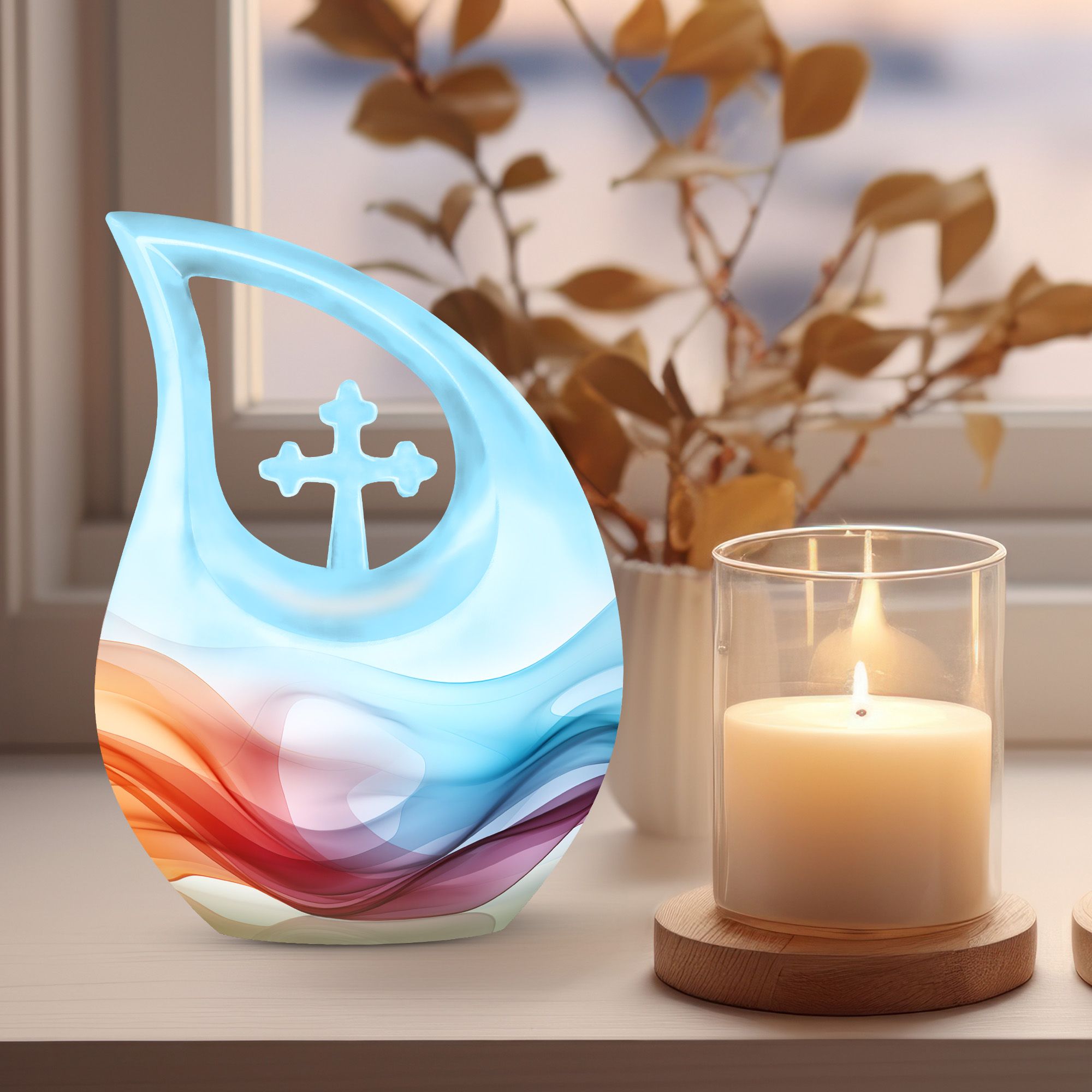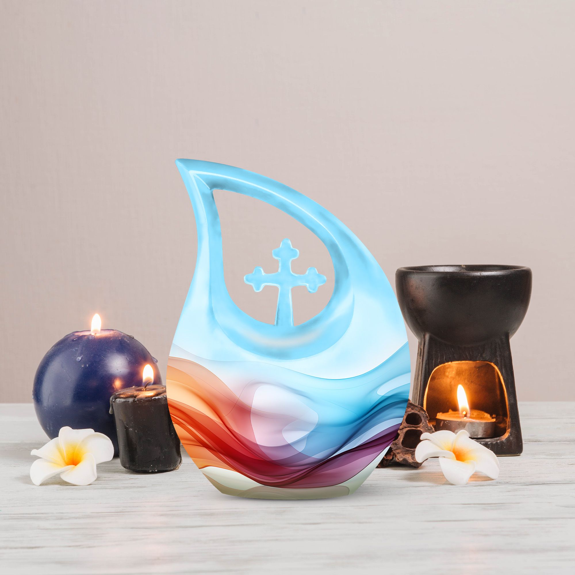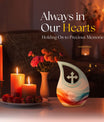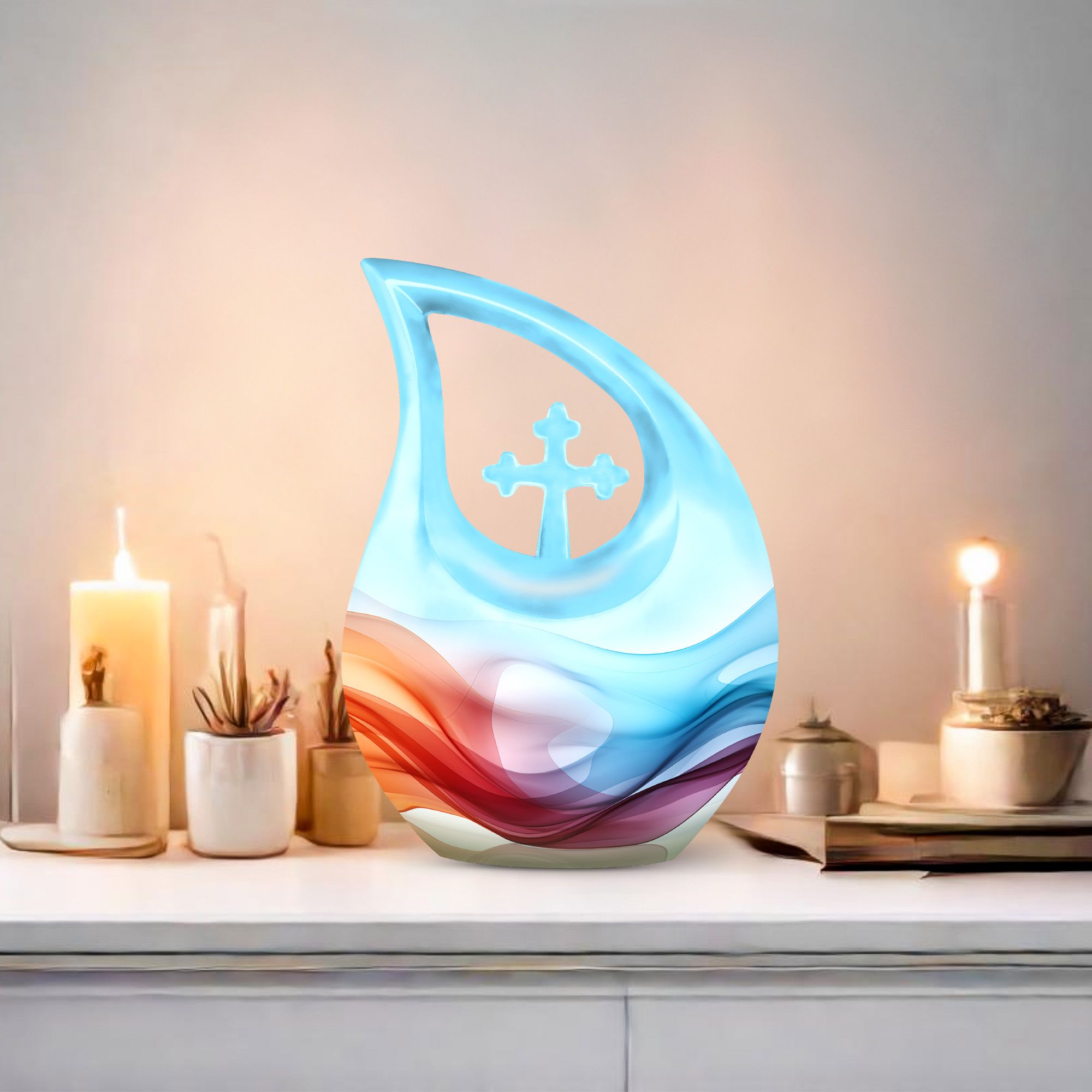 Honor your loved ones and keep their memories close to heart with our Chromatic Ripples Urn. This precious keepsake, earmarked for the 'Memorial Ceremony Supplies' category is more than just a token. It is a large Aluminium urn crafted with utmost care, standing tall at 10 inches, weighted at 3.3 pounds with a generous capacity of 200 cubic inches, attesting to the remarkable craftsmanship. The highlight of this urn is its unique Cross Drop design theme, signifying a divine connection with every ripple doing justice to the term 'Chromatic Ripples'. Personalize this urn with your choice of engraved names, maintaining that personal essence intact. Your purchase includes a delicate velvet pouch meant for the containment of ashes, ensuring the utmost respect and dignity towards the departed. Let our Chromatic Ripples Urn be the emblem of their memories and precious moments, rendering a peaceful, final rest. Suitable search terms for this product could include 'Memorial Urns', 'Containers for Human Ashes', 'Beautiful Urns for Ashes', 'Ashes Urns for Sale', and 'Small Container to Hold Ashes'.