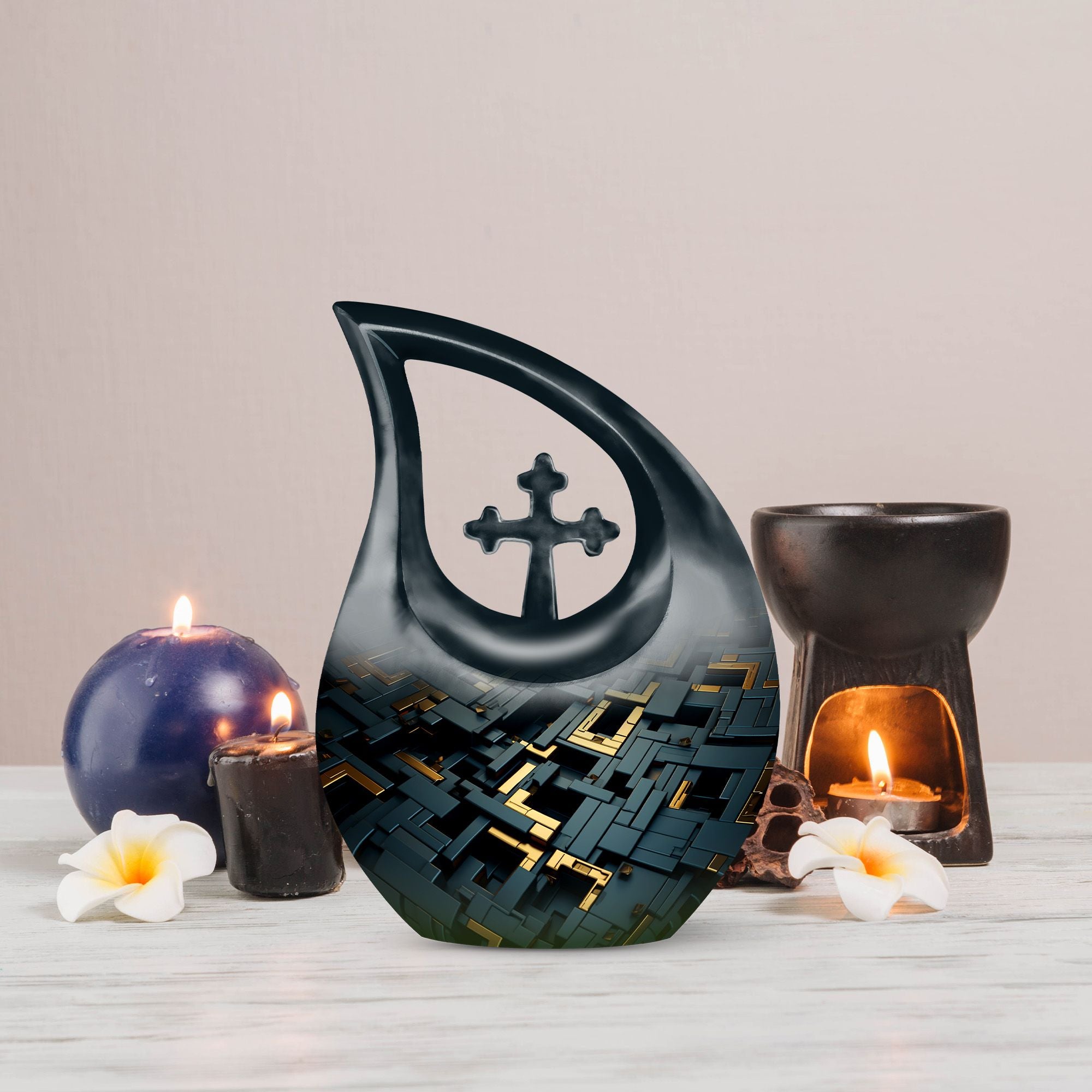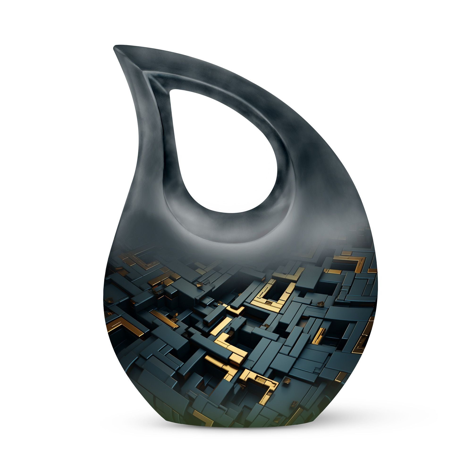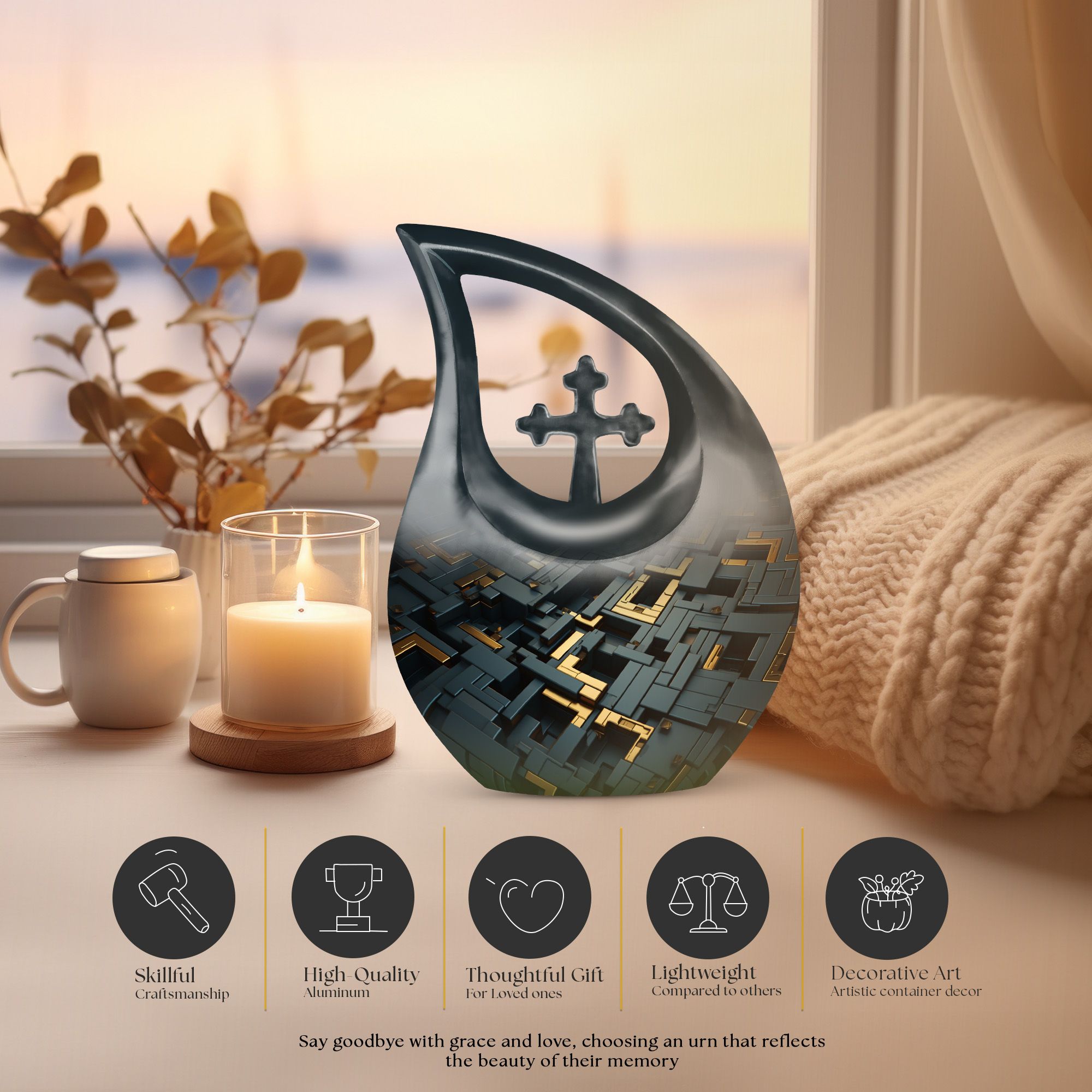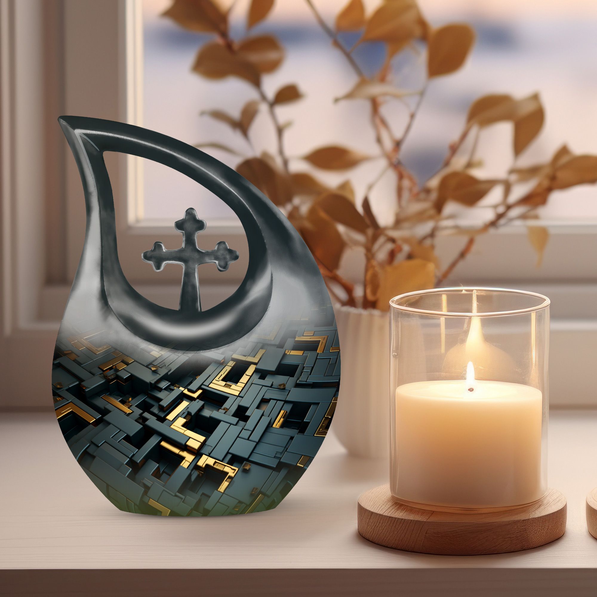 The Circuitry Shimmer Urn is a dignified and solemn choice when looking for 'Urns For Ashes For Adults'. This striking memorial urn pays tribute to your departed loved one in a unique and elegant manner, with 'Circuitry Shimmer' adding an emoji of reverence. With dimensions of 10 inches in height, its substantial size enshrining up to 200 cubic inches of ash, it truly honors the memory preserved within. Meticulously crafted from long-lasting aluminium with a 'Cross Drop' theme, it showcases the appreciation for the circle of life. This large urn weighs 3.3 pounds, emphasizing its strong presence. Its package includes a velvet pouch that ensures careful containment of your loved one's last remains. Use the option to 'Personalize with engraved names' for an extra touch of remembrance and love. Easy to accommodate within your home, the Circuitry Shimmer Urn bridges the gap between loss and lasting peace. Browse among our 'Cheap Cremation Urns For Adults' and 'Cremation Options For Ashes' to find tailored solutions to your memorial needs.