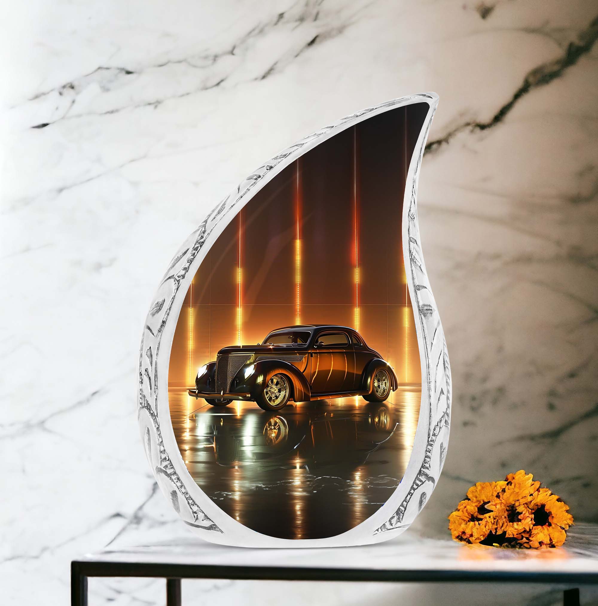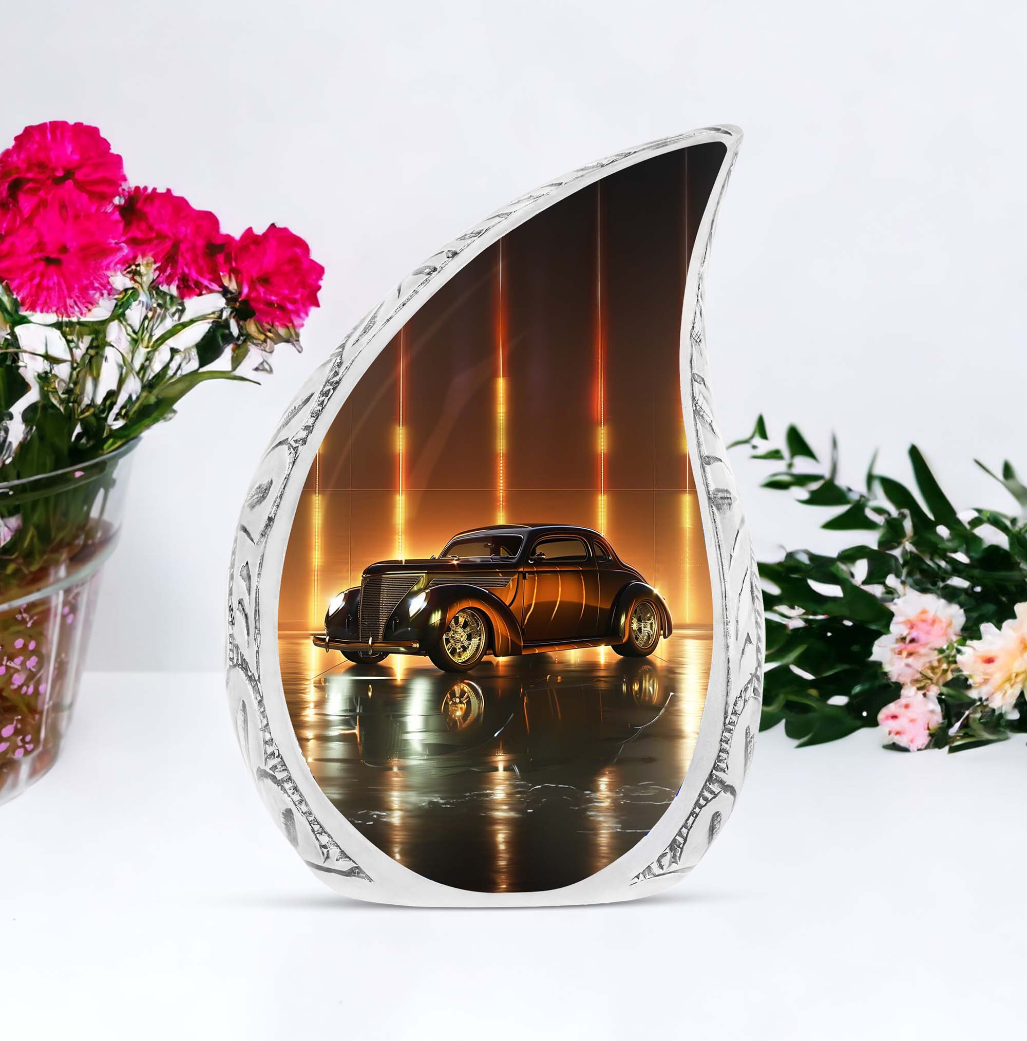 Preserve the cherished memories of a loved one in our distinct and sublime urn, carefully crafted with a classic car charm that encapsulates their vibrant life. Ideal for women who adored the timeless beauty of vintage automobiles, this urn plays homage to her passion while safeguarding her precious ashes. Our miniature urns for ashes are diligently shaped to find a balance between grace and practicality. Carefully designed for adult cremation, this urn subtly signifies an eternal bond that enriches over time. This sacred vessel transforms into a memorial ashes urn, a symbol of the ceaseless love you hold for your departed loved one. Revel in its elegant finish and rejoice in its profound symbolism. This stunning urn mirrors the journey of your beloved one, their indomitable spirit, and their everlasting impact on your lives. It's more than a remnant; it's a testament to a life well-lived and fondly remembered.