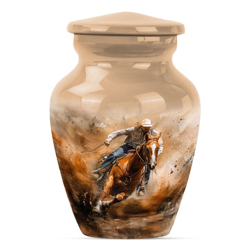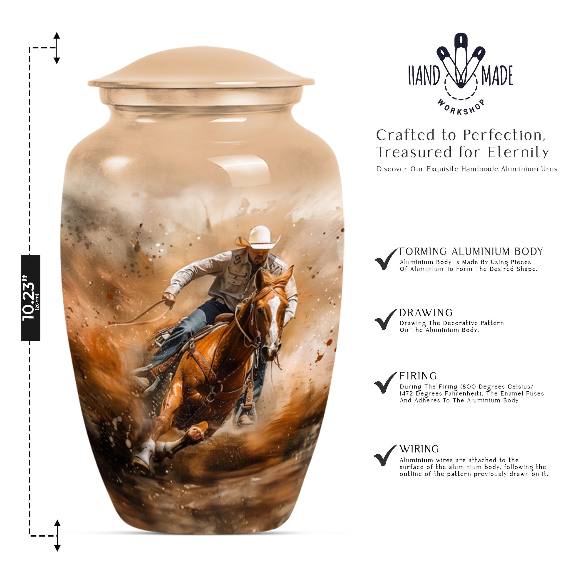 Immerse in the serenity of bid farewell to your beloved one with this sturdy 'Classic Cowboy Urn.' A large urn exquisitely crafted from strong Aluminium and weighing a comfortable 3.3 pounds, its design conveys a sense of solemn respect and peace. Our 10-inch cremation urn is perfect for adult males, with the capacity to house up to 200 cubic inches of ashes. Adding a personalized touch to this solemn remembrance, we offer the option to have names engraved, making it uniquely yours. Wrapped securely in a plush velvet pouch, the Classic Cowboy Urn ensures a dignified home for the keepsake of your loved one. This urn stands out not just as a memorial urn for adult male ashes but also as an urn for human ashes for two adults. Adorned with a delicate butterfly theme, it serves as an enduring symbol of the soul's transformation and continuation of the journey beyond. Our cremation urn is an elegant tribute and a comforting reminder of your love. Perfect for those in search of cremation urns for men.