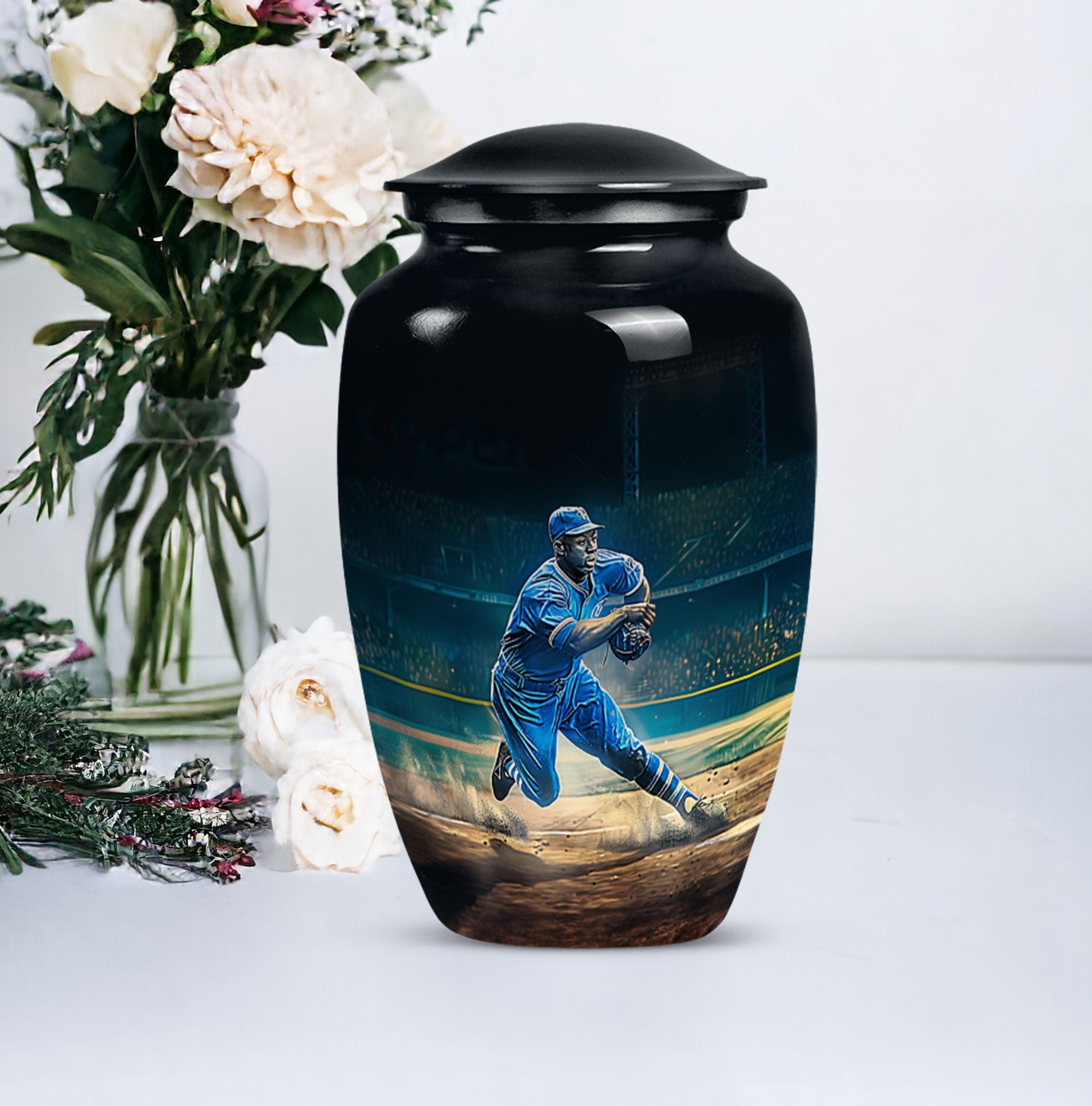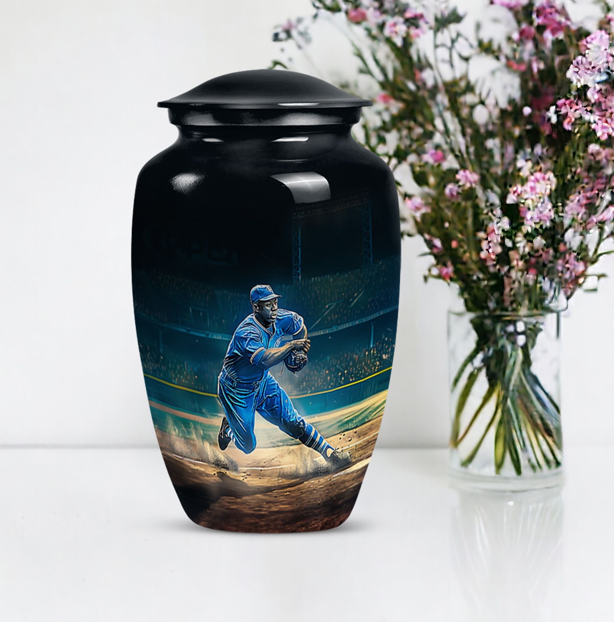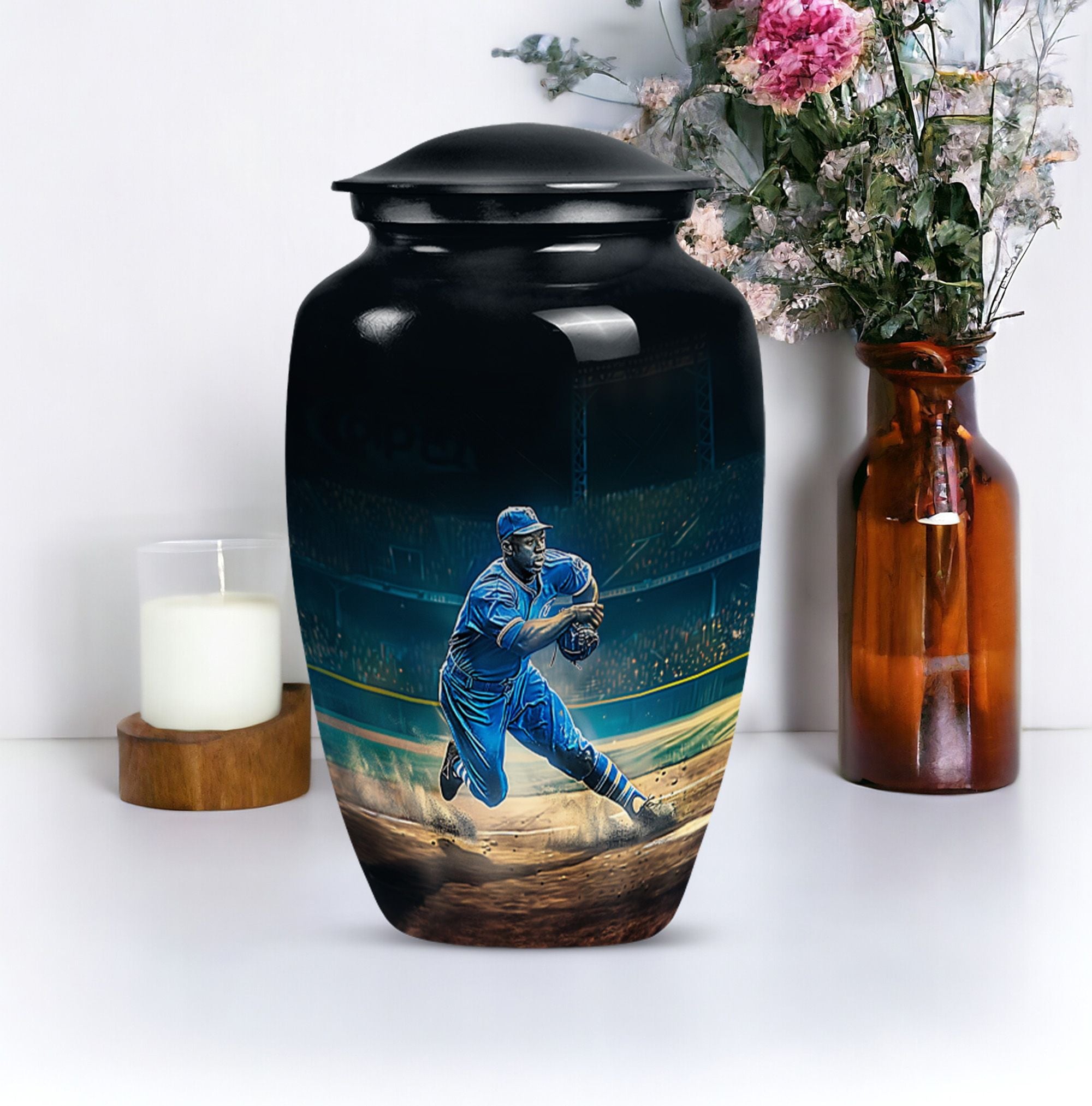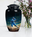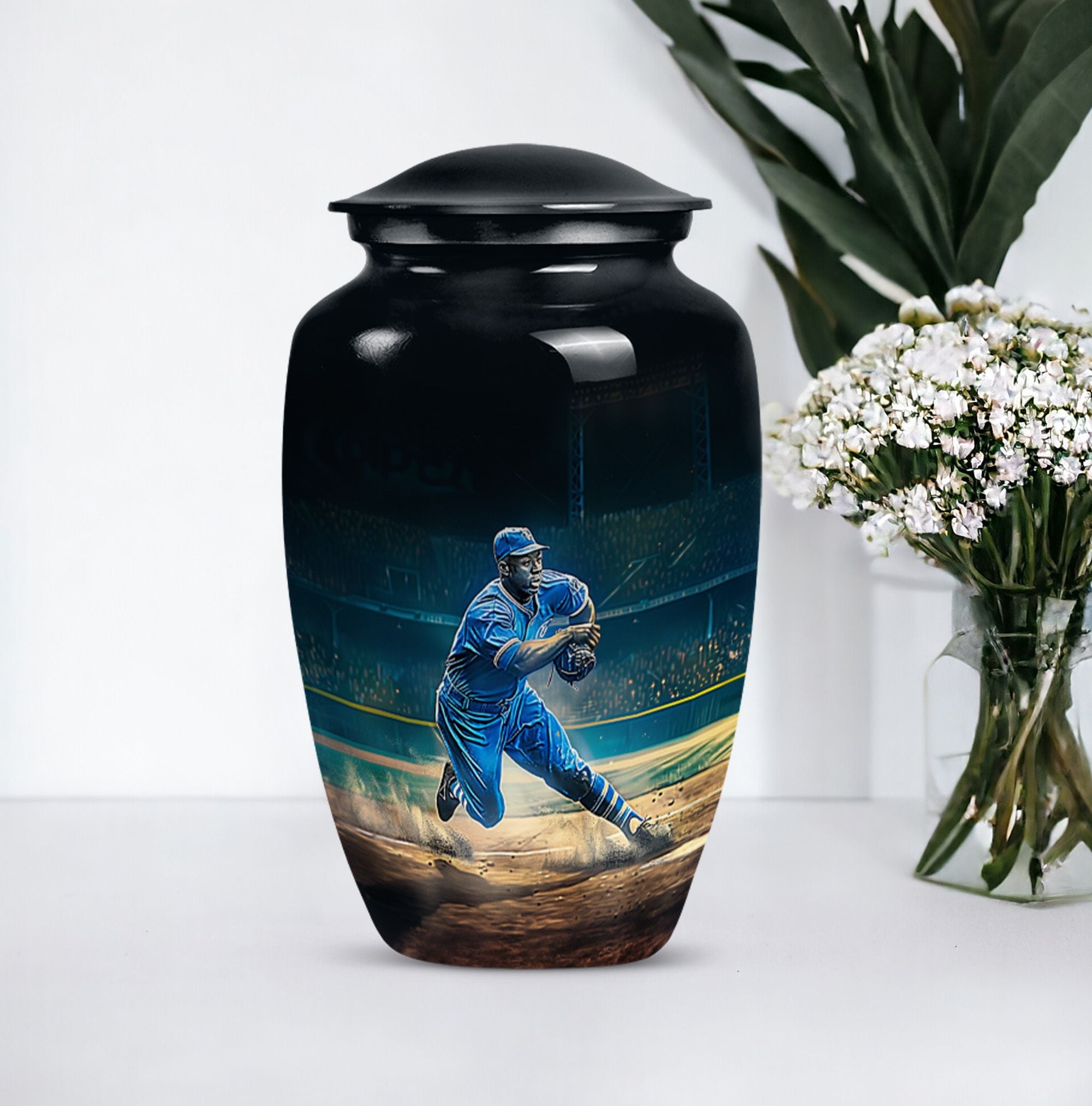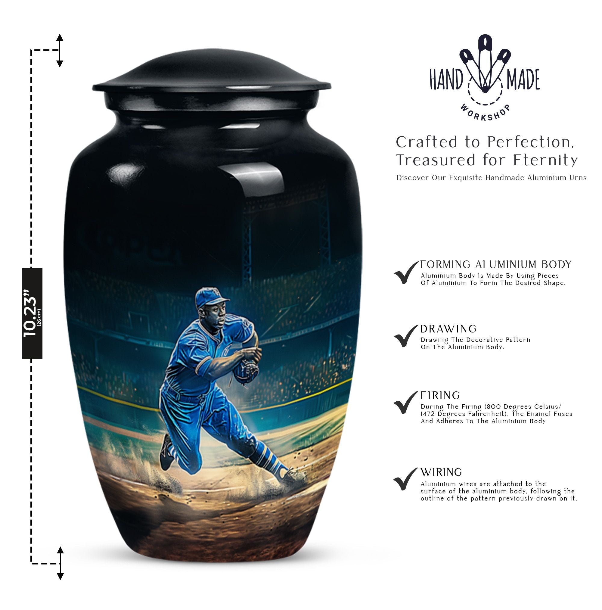 Commemorate the beautiful life of your loved one with this guiltless 10-inch Baseball Urn handcrafted from sturdy Aluminium. Ensuring a meaningful and respectful preservation of ashes, this large-sized urn is an ideal choice for those seeking a distinctive memorial. Its timeless Abstract Theme represents the complexity of life, and a personal touch can be added with custom engraved names, turning this urn into a unique memoir. This cremation urn, weighing a modest 3.3 pounds, can encompass up to 200 cubic inches of ashes, suitable for adults of any gender. The urn comes enveloped in a velvet pouch, ensuring a dignified containment of the remains. Its classic design speaks volumes about its build quality, standing out amongst typical funeral urns. This product is frequently searched for as 'cremation urns for funeral', and 'funeral urns for human ashes adult man'. Search no more, for this Baseball Urn serves as the perfect vessel to hold, remember and celebrate cherished lives.