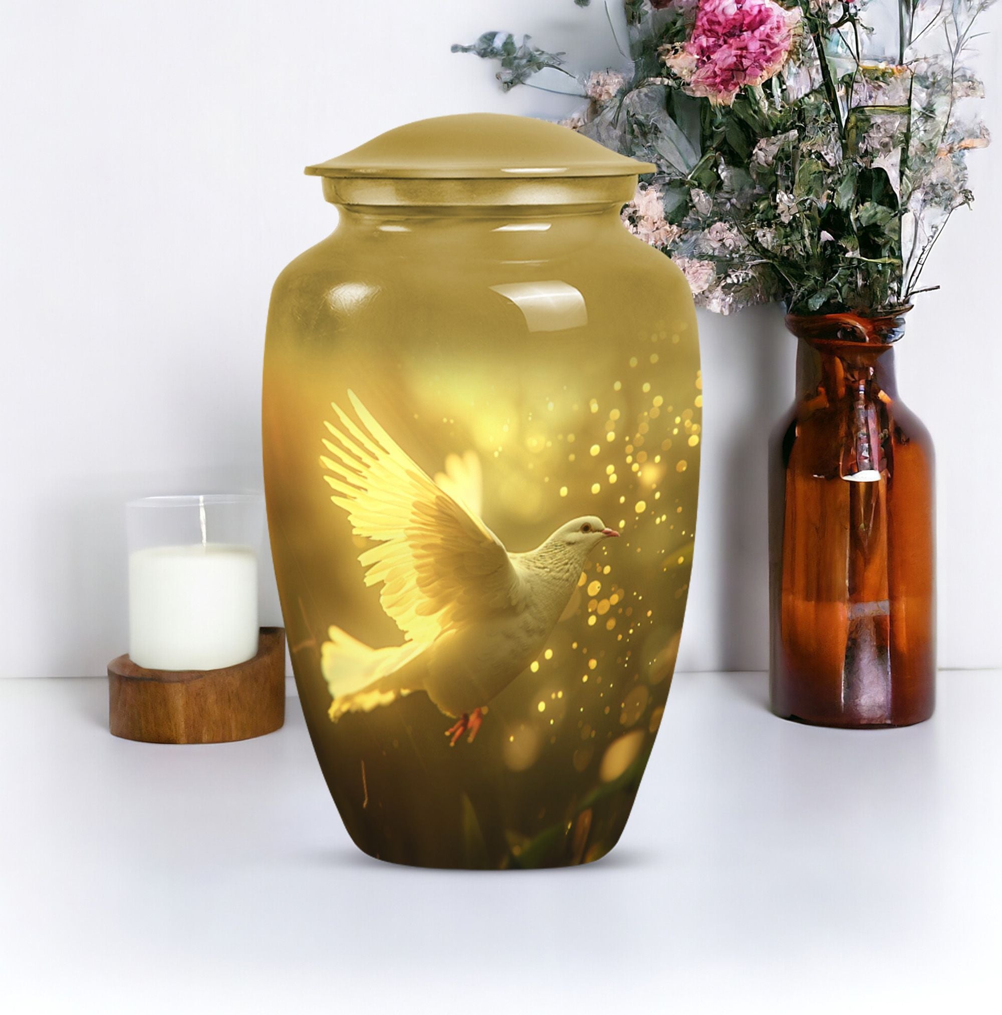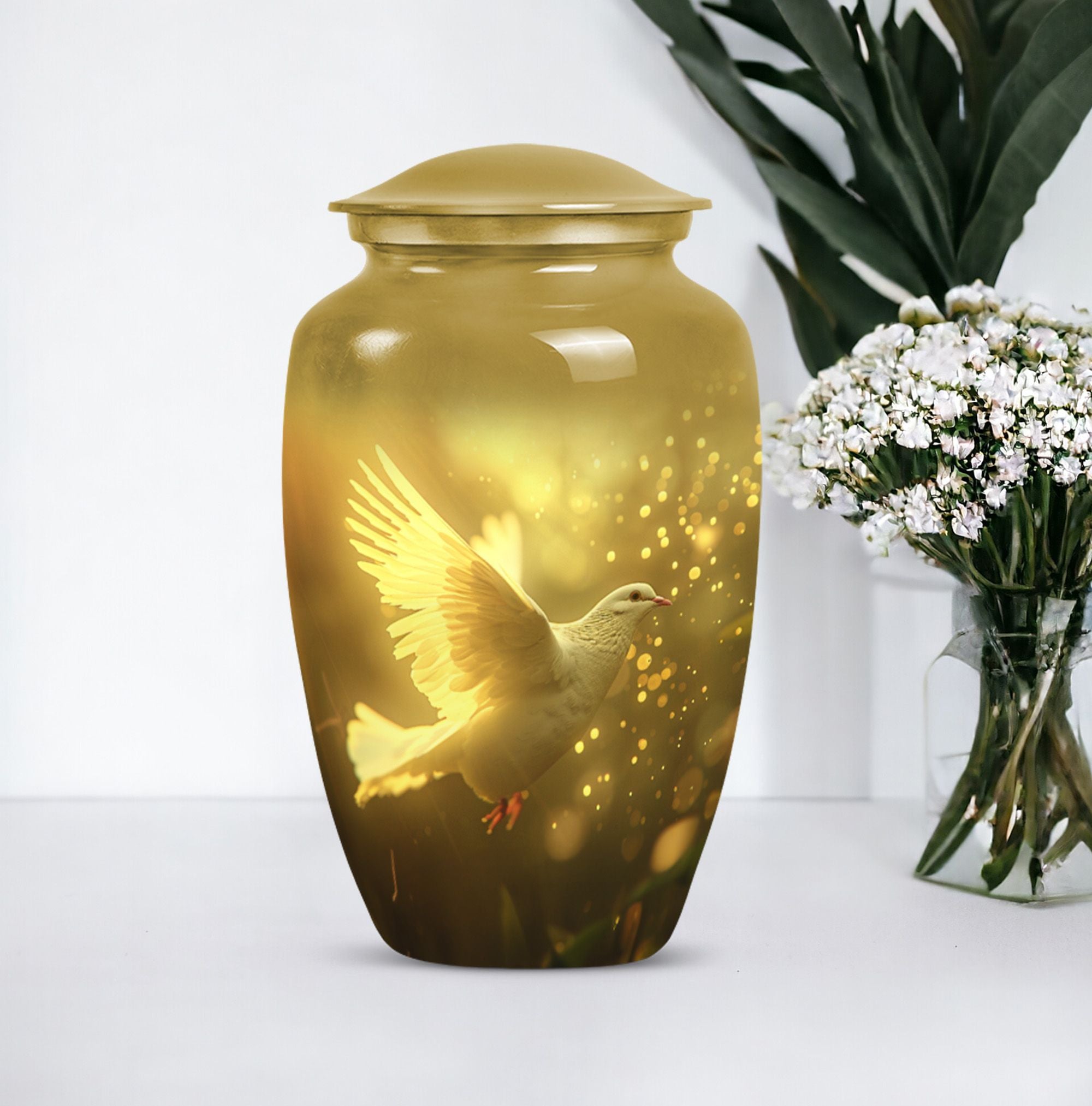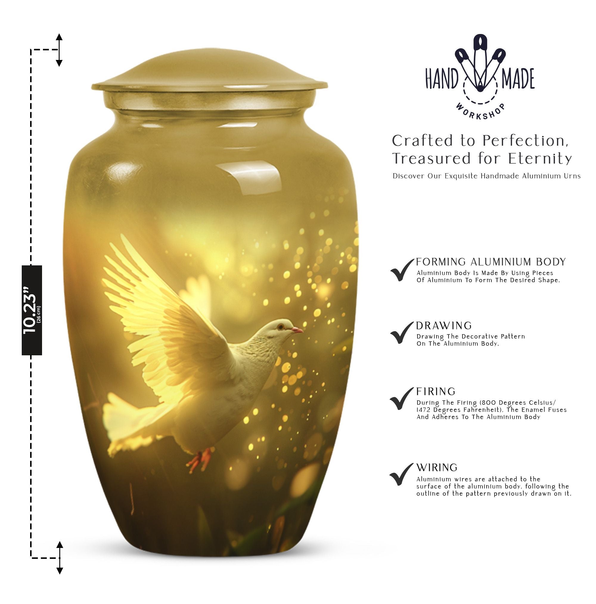 Honor and respect the memory of your cherished ones with our tasteful Dove Urn. This 10-inch classic urn is elegantly crafted from high-quality aluminum, ensuring a lasting memento. The urn weighs 3.3 pounds and is equipped with a capacity of 200 cubic inches, making it a suitable choice for memorial urns for ashes adult male, funeral extra large urn, or cremation urns for adult ashes women. Its large size serves to keep the human urn ashes safe and protected. The urn comes with a velvet pouch, providing a delicate containment for the ashes. The Dove theme brings an element of tranquility and peace, exuding a soothing aura. With options for customization, you can personalize this memorial urn with engraved names, adding an intimate touch. With intricate craftsmanship and thoughtful design, our Dove urn offers a dignified resting place for your loved ones. A noteworthy blend of durability, aesthetics, and value, this burial large urn is the perfect selection for your memorial ceremony supplies.
