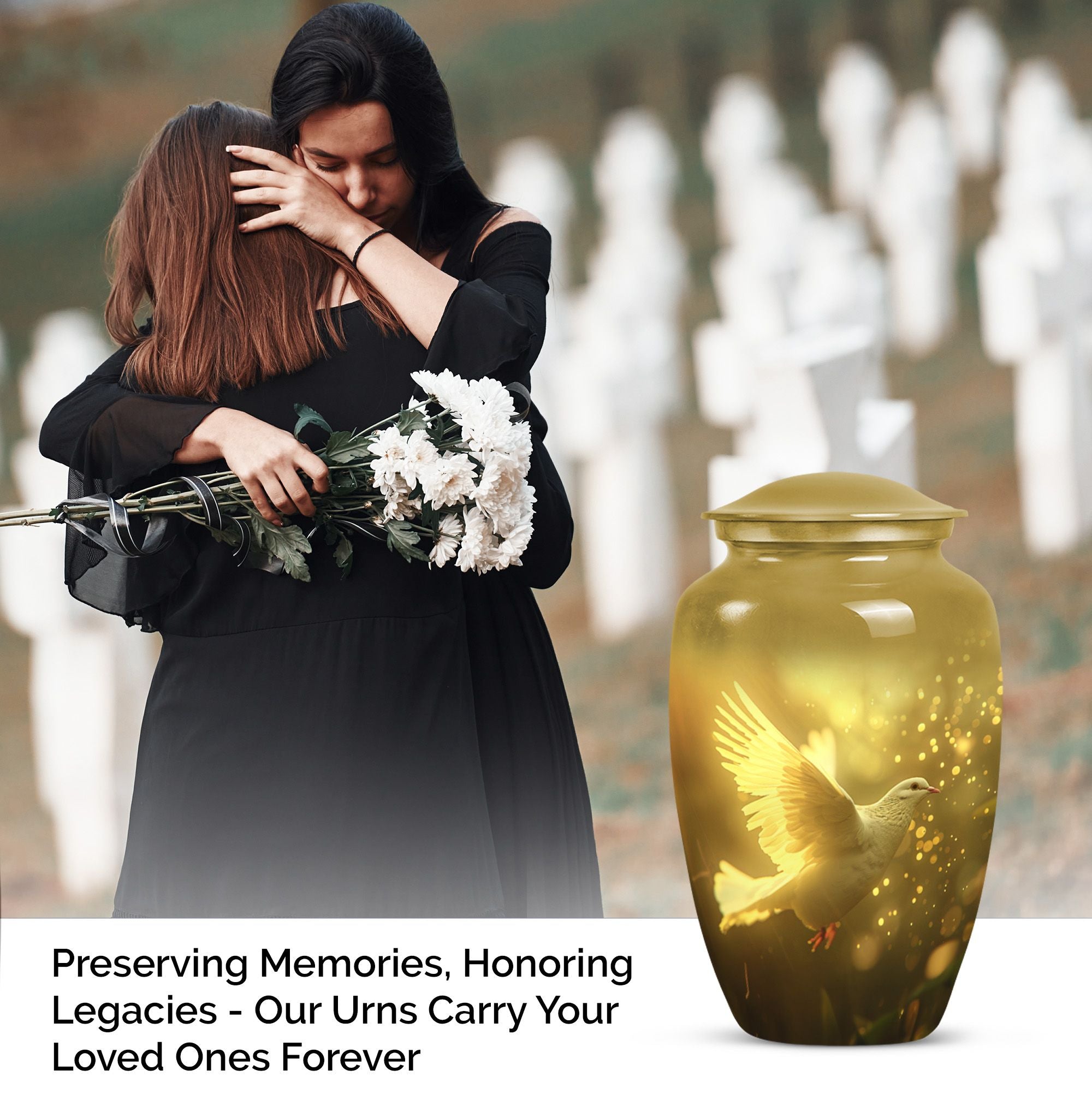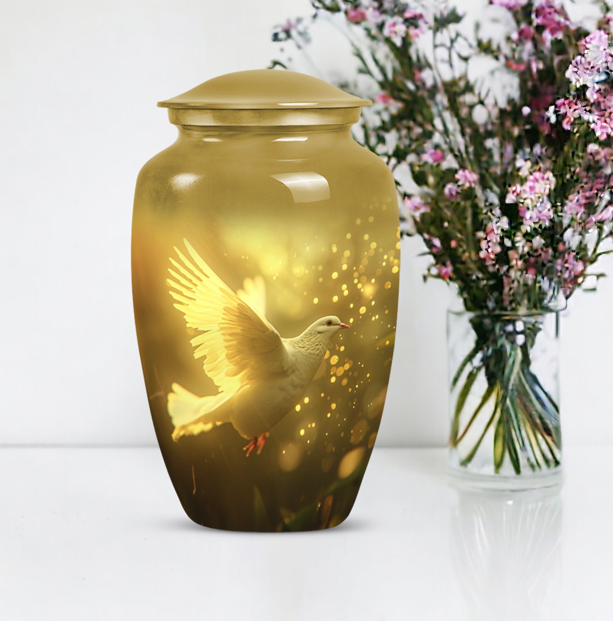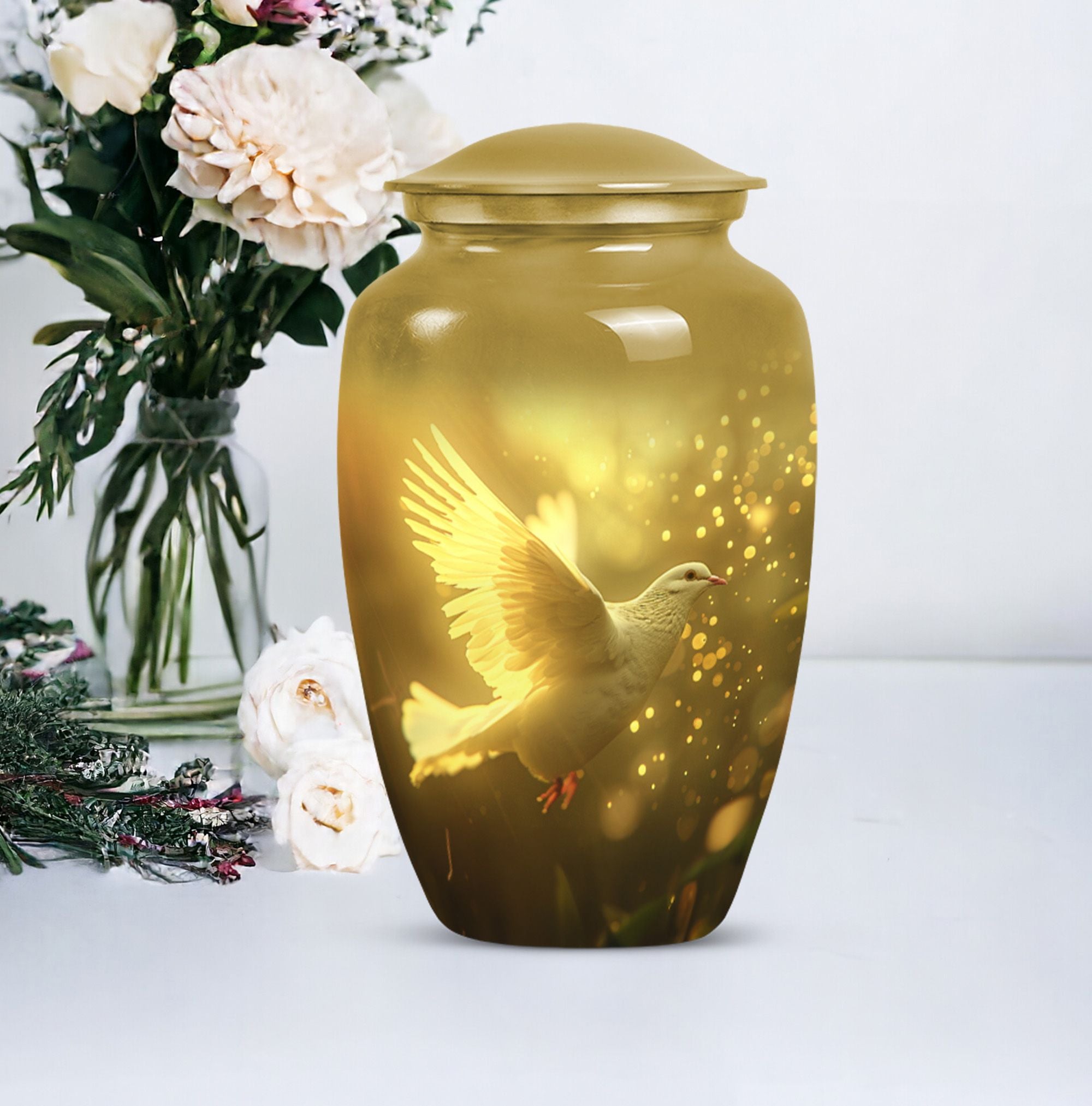 Honor and respect the memory of your cherished ones with our tasteful Dove Urn. This 10-inch classic urn is elegantly crafted from high-quality aluminum, ensuring a lasting memento. The urn weighs 3.3 pounds and is equipped with a capacity of 200 cubic inches, making it a suitable choice for memorial urns for ashes adult male, funeral extra large urn, or cremation urns for adult ashes women. Its large size serves to keep the human urn ashes safe and protected. The urn comes with a velvet pouch, providing a delicate containment for the ashes. The Dove theme brings an element of tranquility and peace, exuding a soothing aura. With options for customization, you can personalize this memorial urn with engraved names, adding an intimate touch. With intricate craftsmanship and thoughtful design, our Dove urn offers a dignified resting place for your loved ones. A noteworthy blend of durability, aesthetics, and value, this burial large urn is the perfect selection for your memorial ceremony supplies.