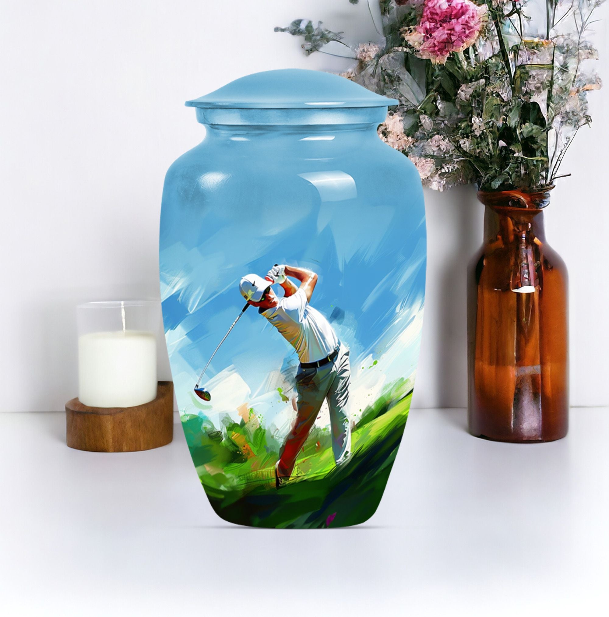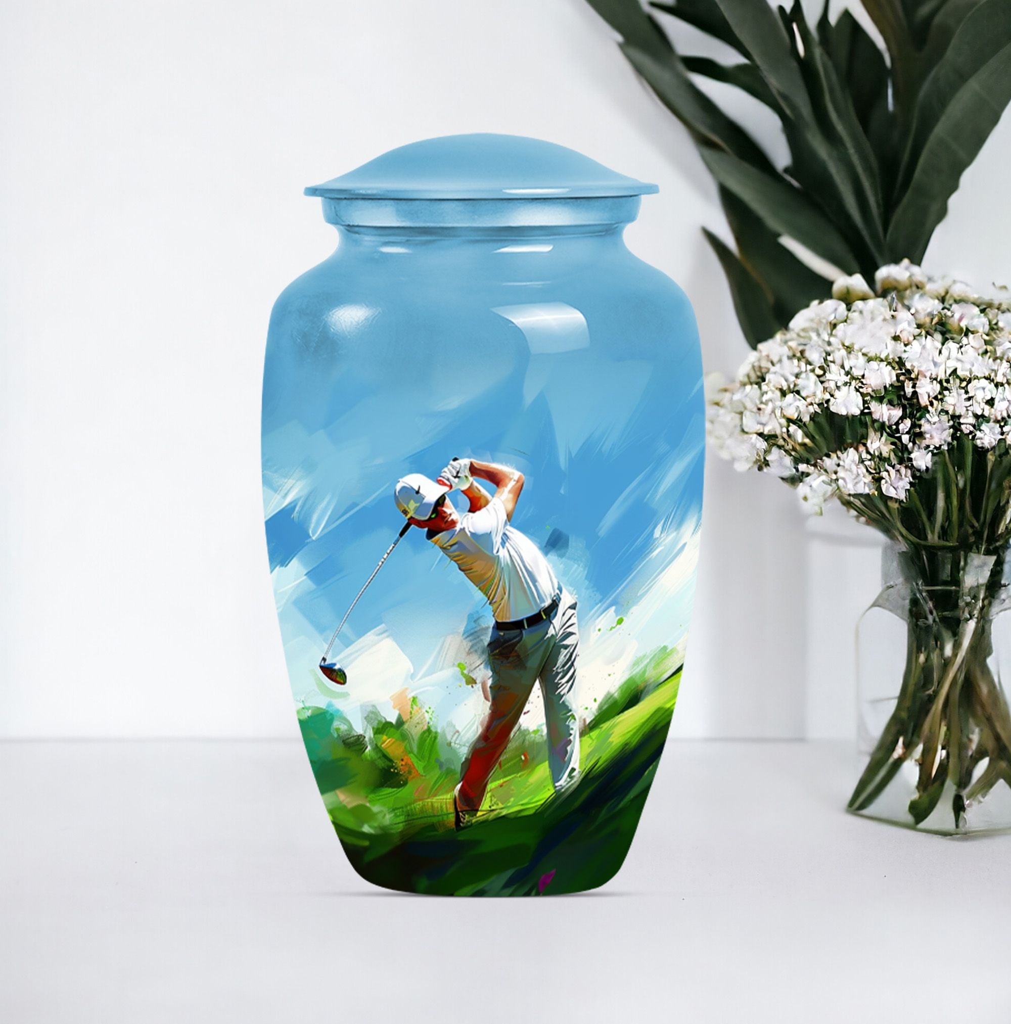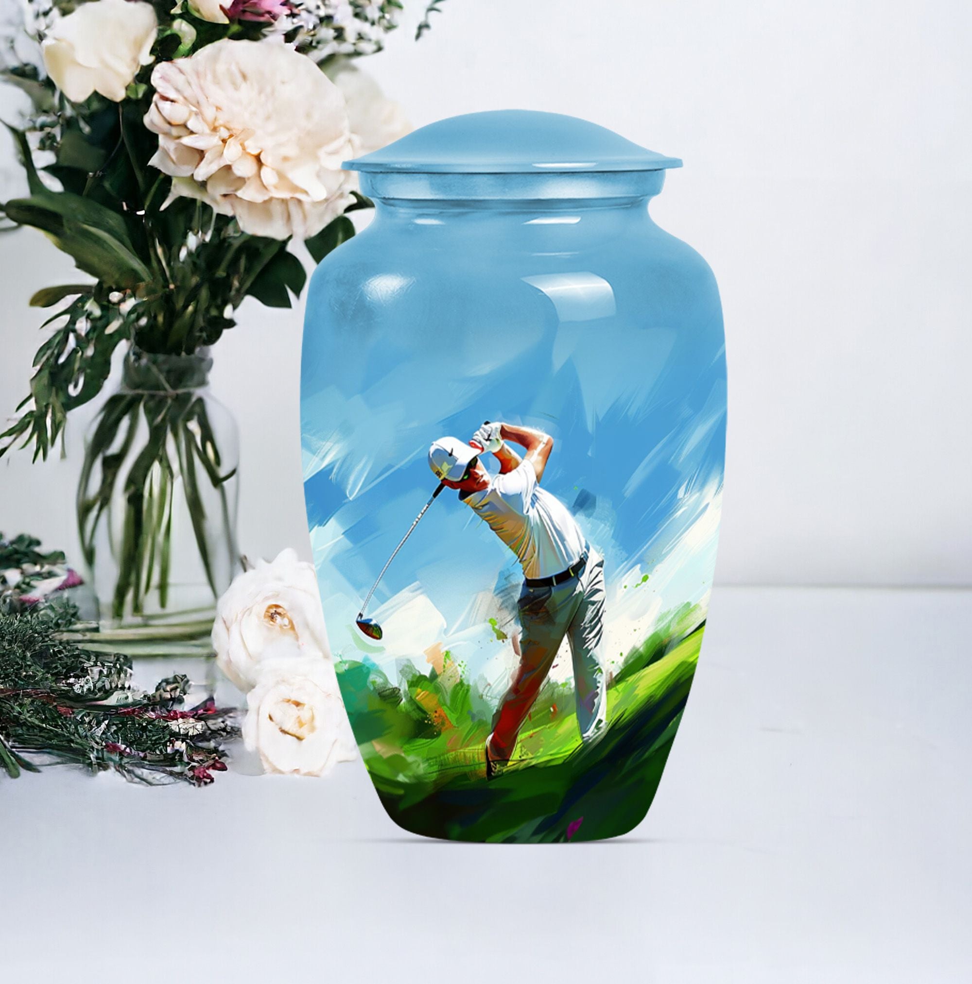 Crafted from durable aluminum with expert attention to detail, this cremation urn for ashes combines artistry and strength. Its golf-inspired design reflects both elegance and personal legacy, making it ideal as a centerpiece for memorial display. With a secure screw-top lid, it ensures ashes remain safely protected, while its size makes it a reliable choice among adult cremation urns. Whether chosen for display, memorial services, or as one of the burial urns for ground, it balances beauty with practicality.