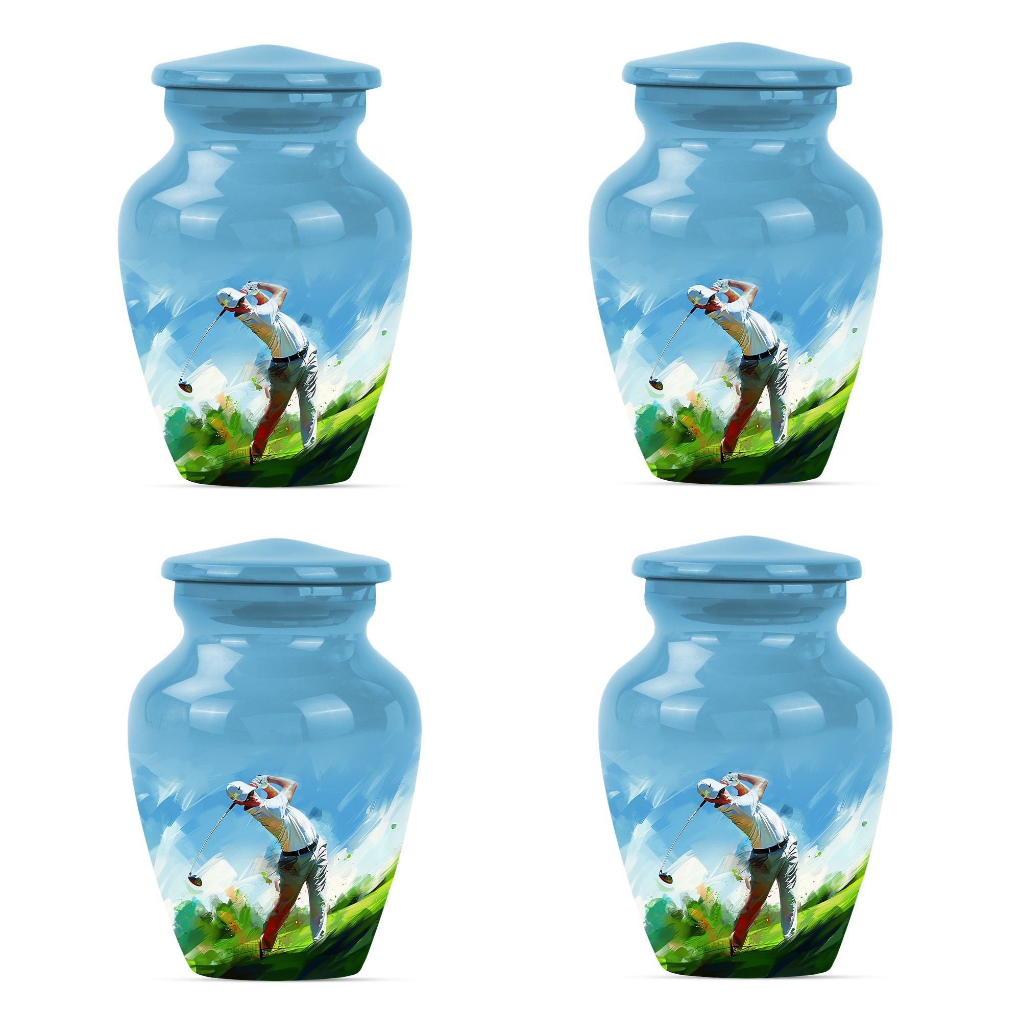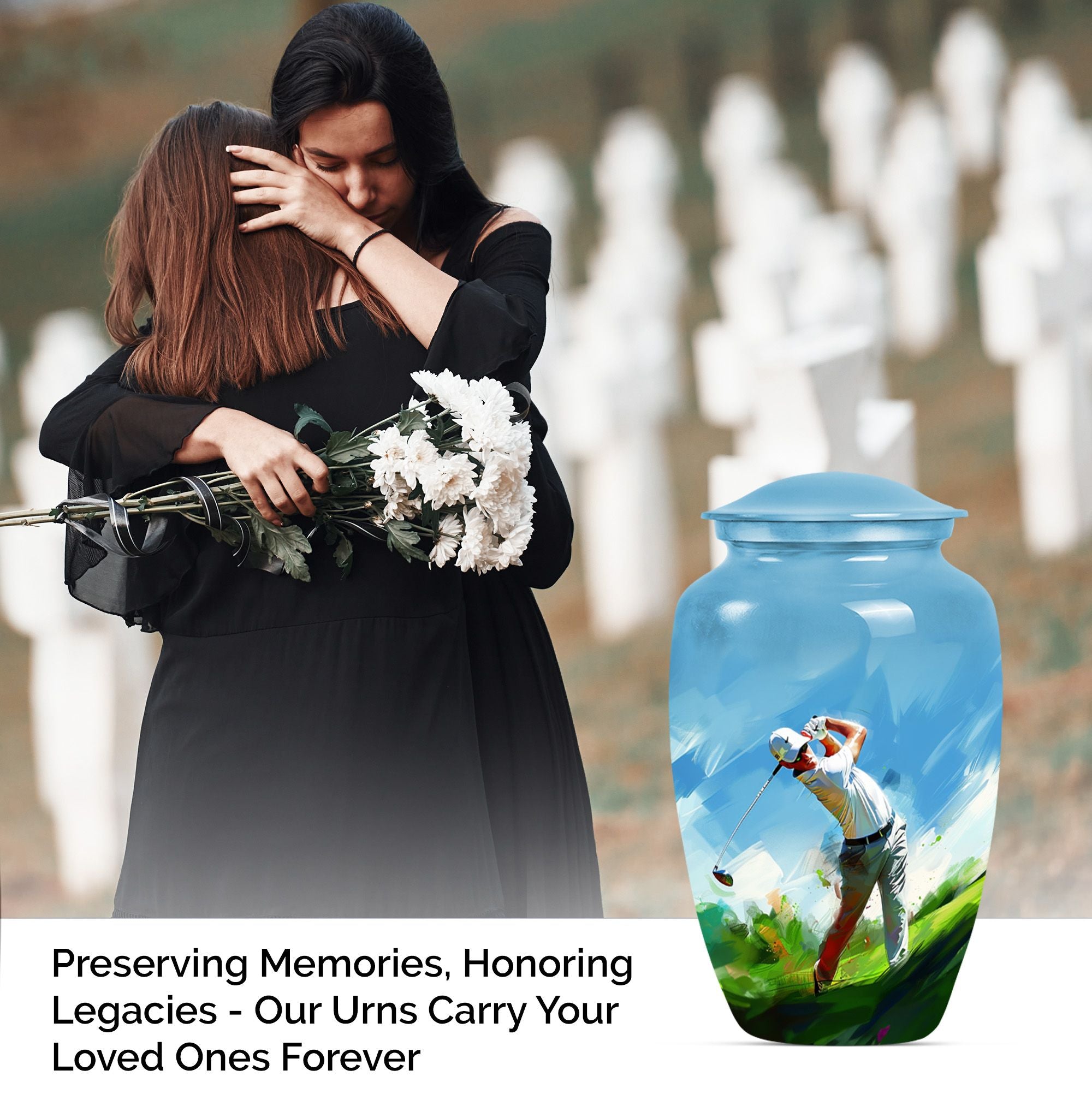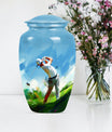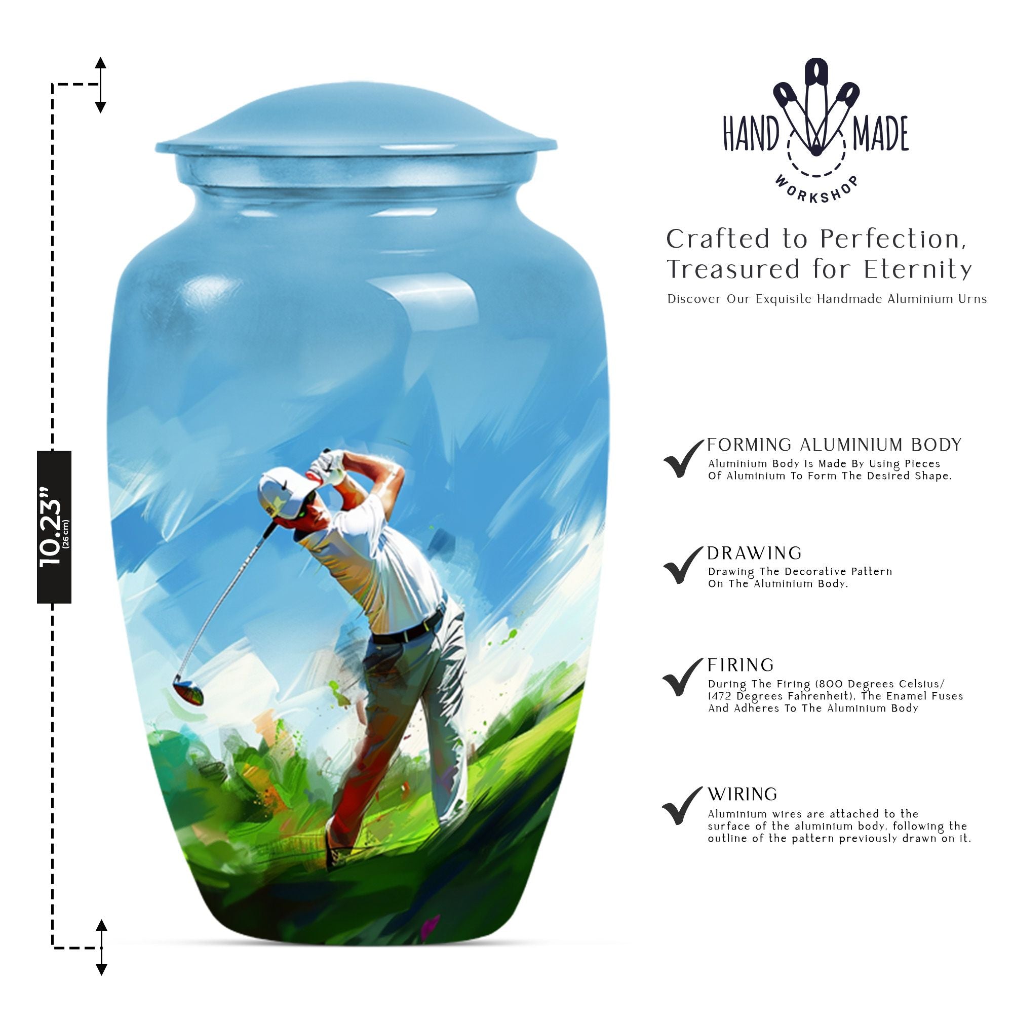 Crafted from durable aluminum with expert attention to detail, this cremation urn for ashes combines artistry and strength. Its golf-inspired design reflects both elegance and personal legacy, making it ideal as a centerpiece for memorial display. With a secure screw-top lid, it ensures ashes remain safely protected, while its size makes it a reliable choice among adult cremation urns. Whether chosen for display, memorial services, or as one of the burial urns for ground, it balances beauty with practicality.