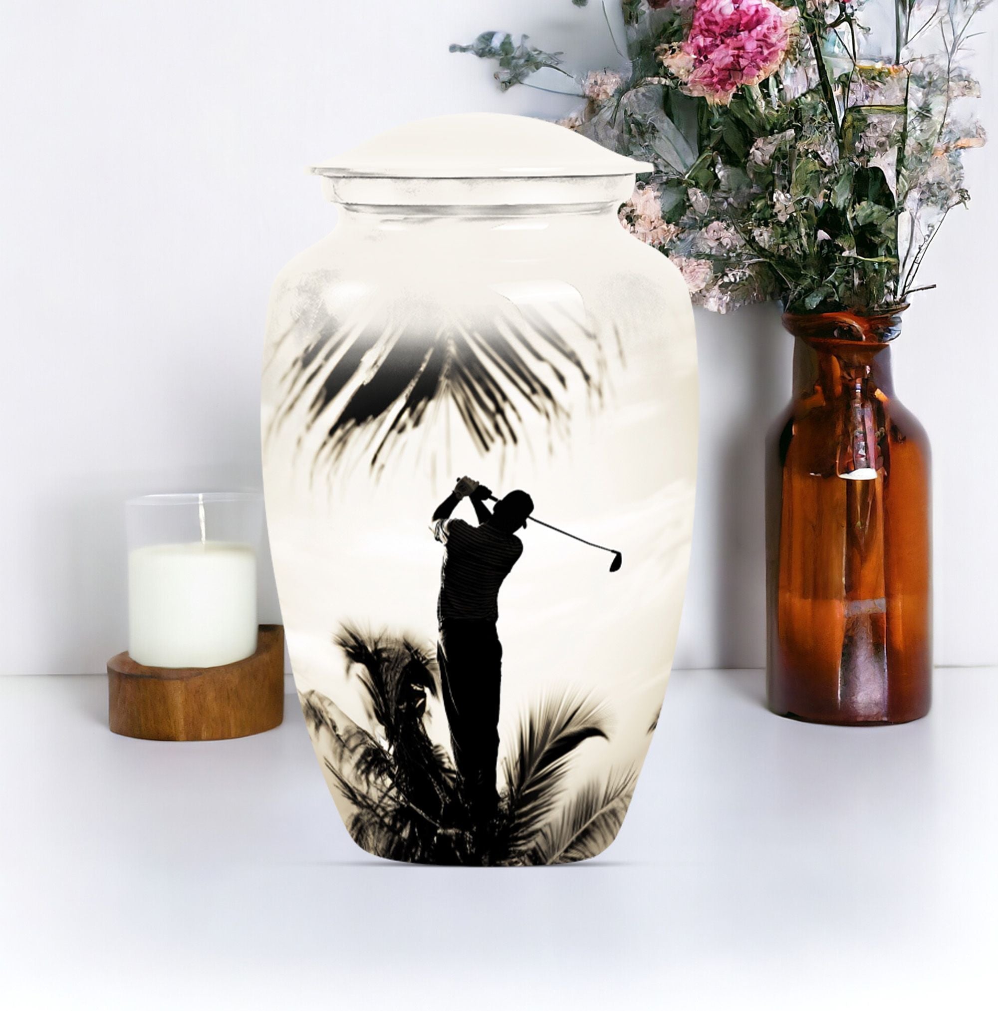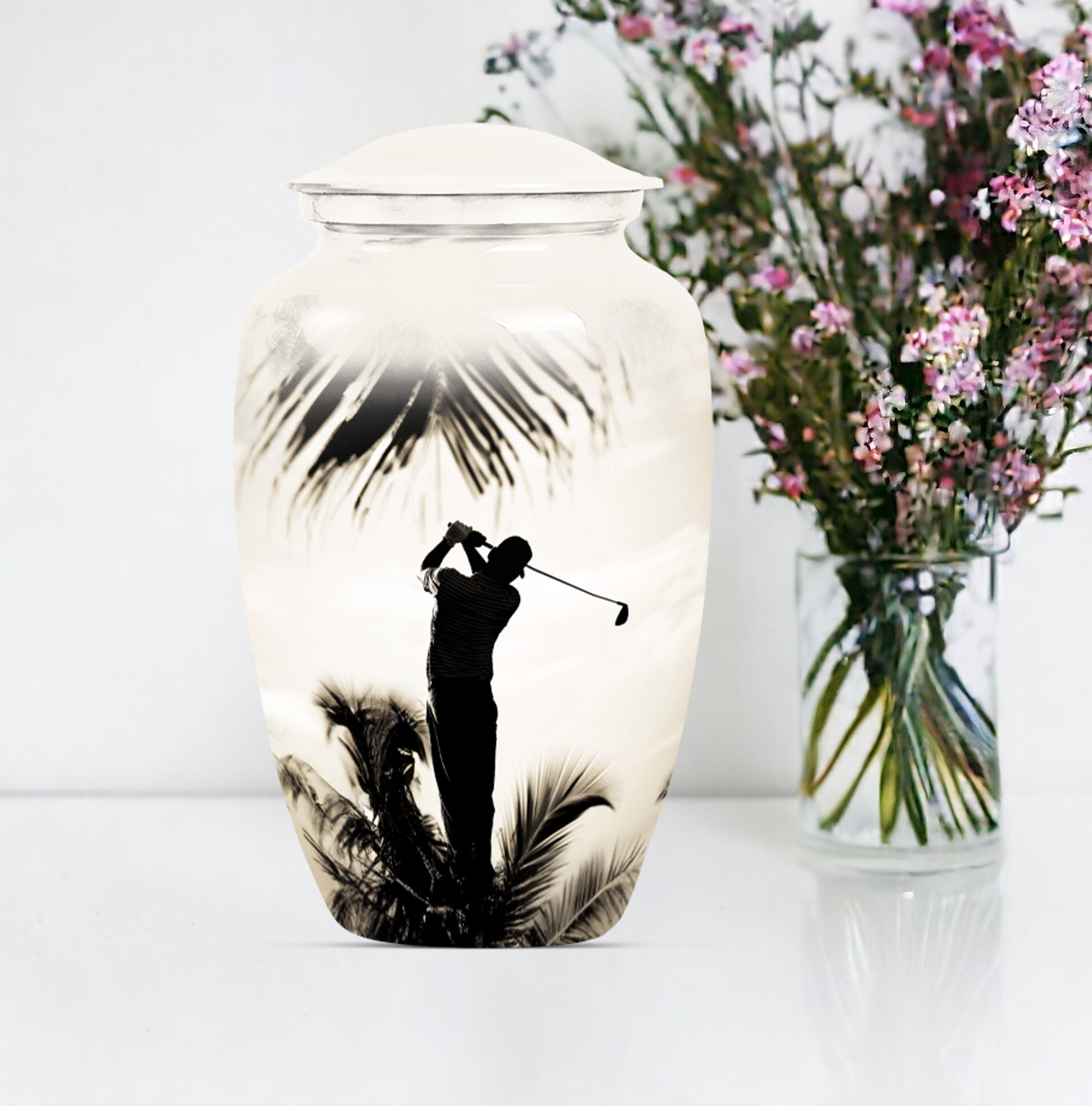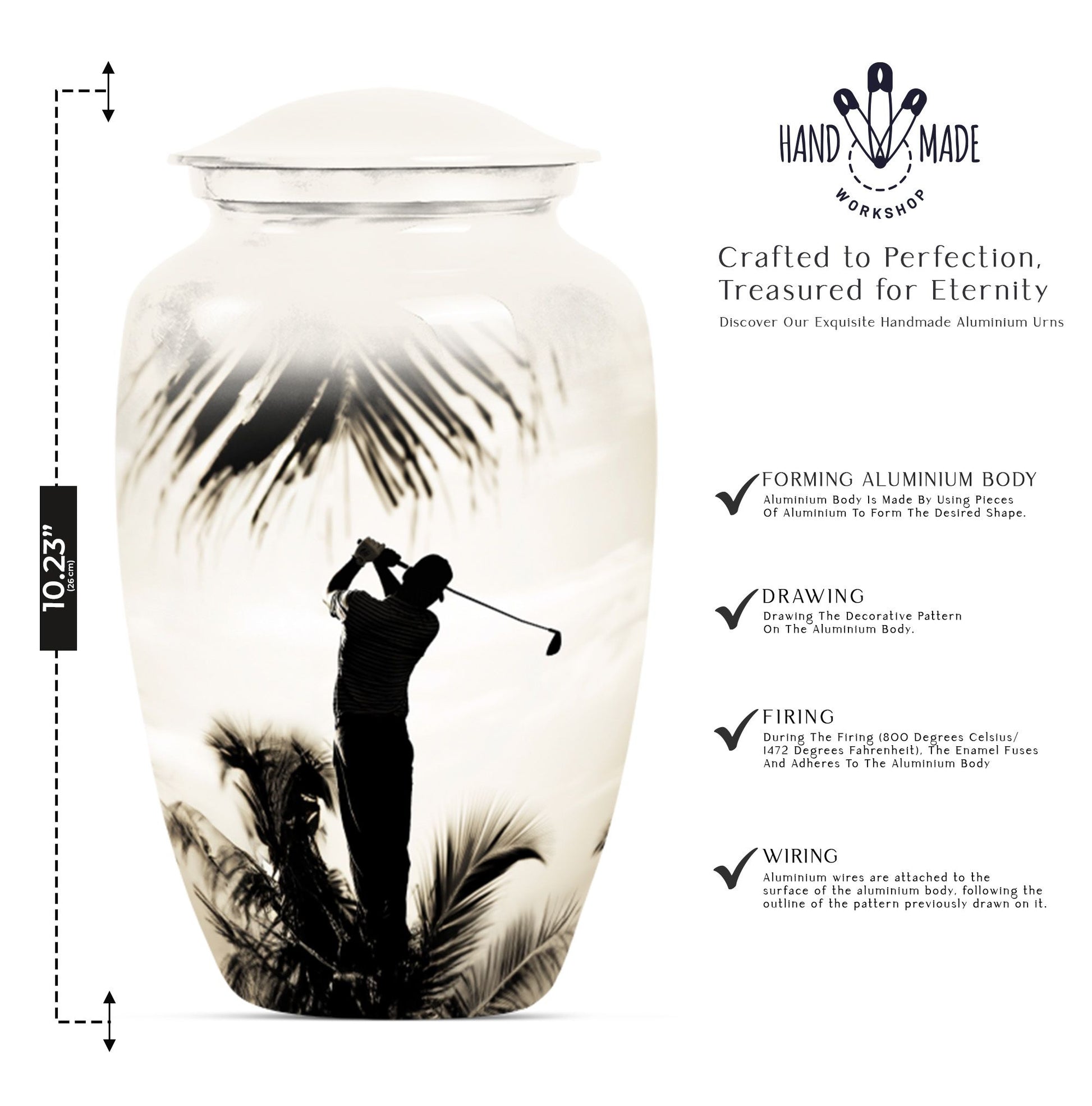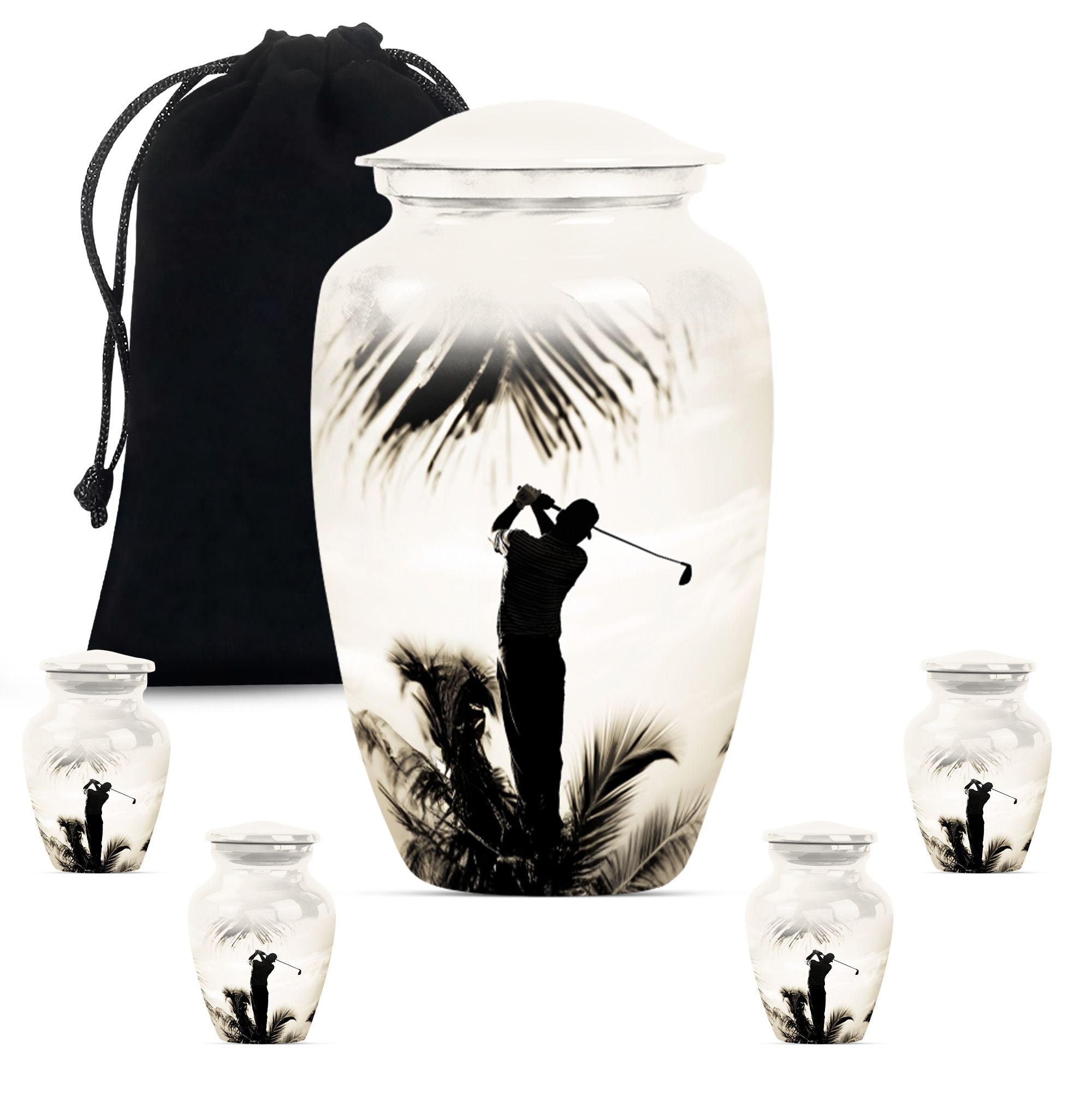 Made with an abstract theme, our large, 10-inch cremation urn stands as an unequivocal choice for your memorial ceremony supplies. Known as the Classic Urn, this tribute hails from durable Aluminium material, ensuring your cherished memories with your loved one are preserved for years to come. Suitable for both mom and golf lovers, our product extends a capacity of 200 cubic inches, effectively accommodating human ashes of an adult in size. As a testament to our focus on enhancing your commemoration, this beautiful golf urn comes with a luxurious, velvet pouch to effortlessly contain the ashes. Personalization options are available to etch your beloved's name making it truly unique. Weighing only 3.3 pounds, this 10-inch memorial urn coincides comfort with remembrance, staying light in weight, but heavy in sentiment. Ideal for adults and seniors, make this cremation urn a part of your memorial ceremony, keeping enduring love and cherished memories alive.