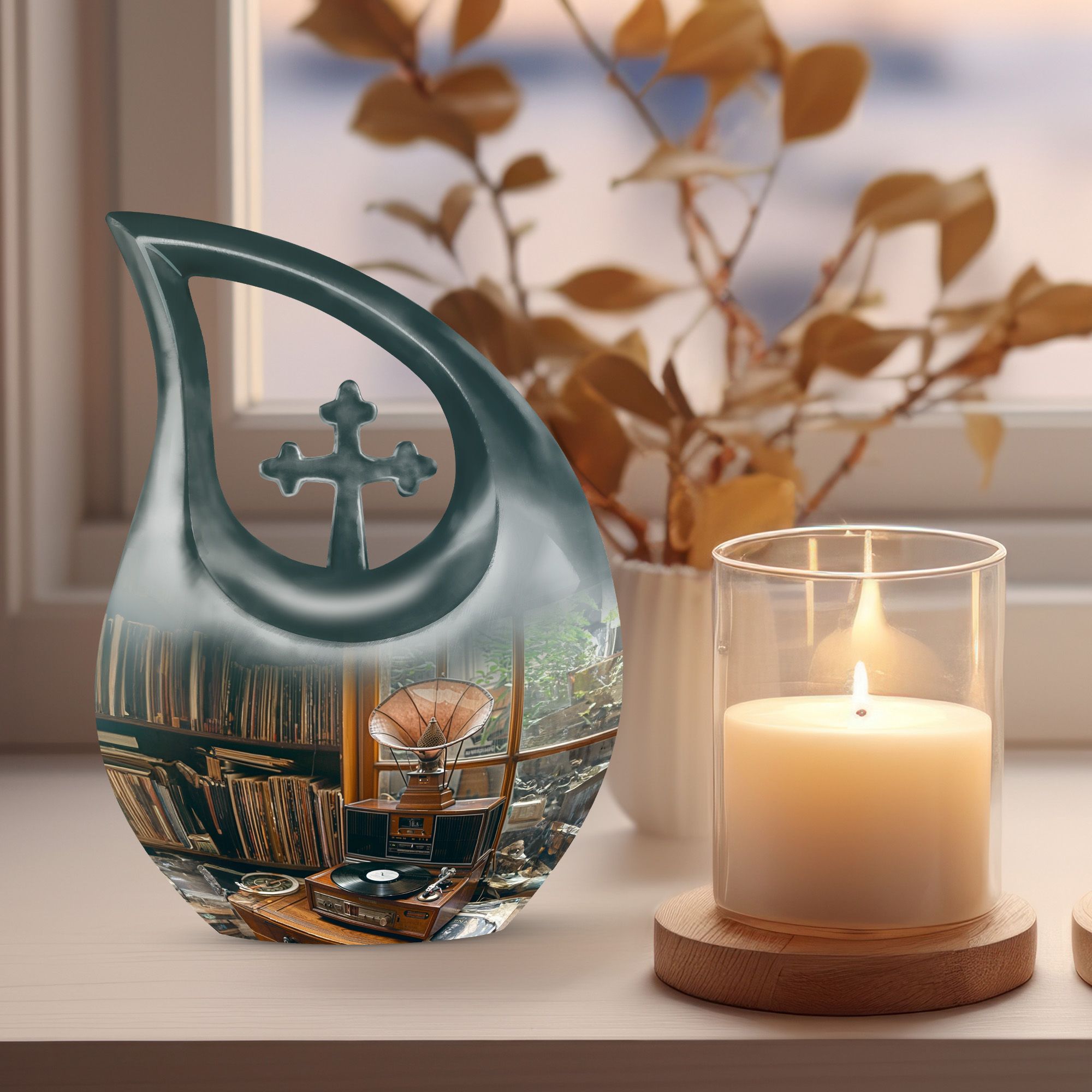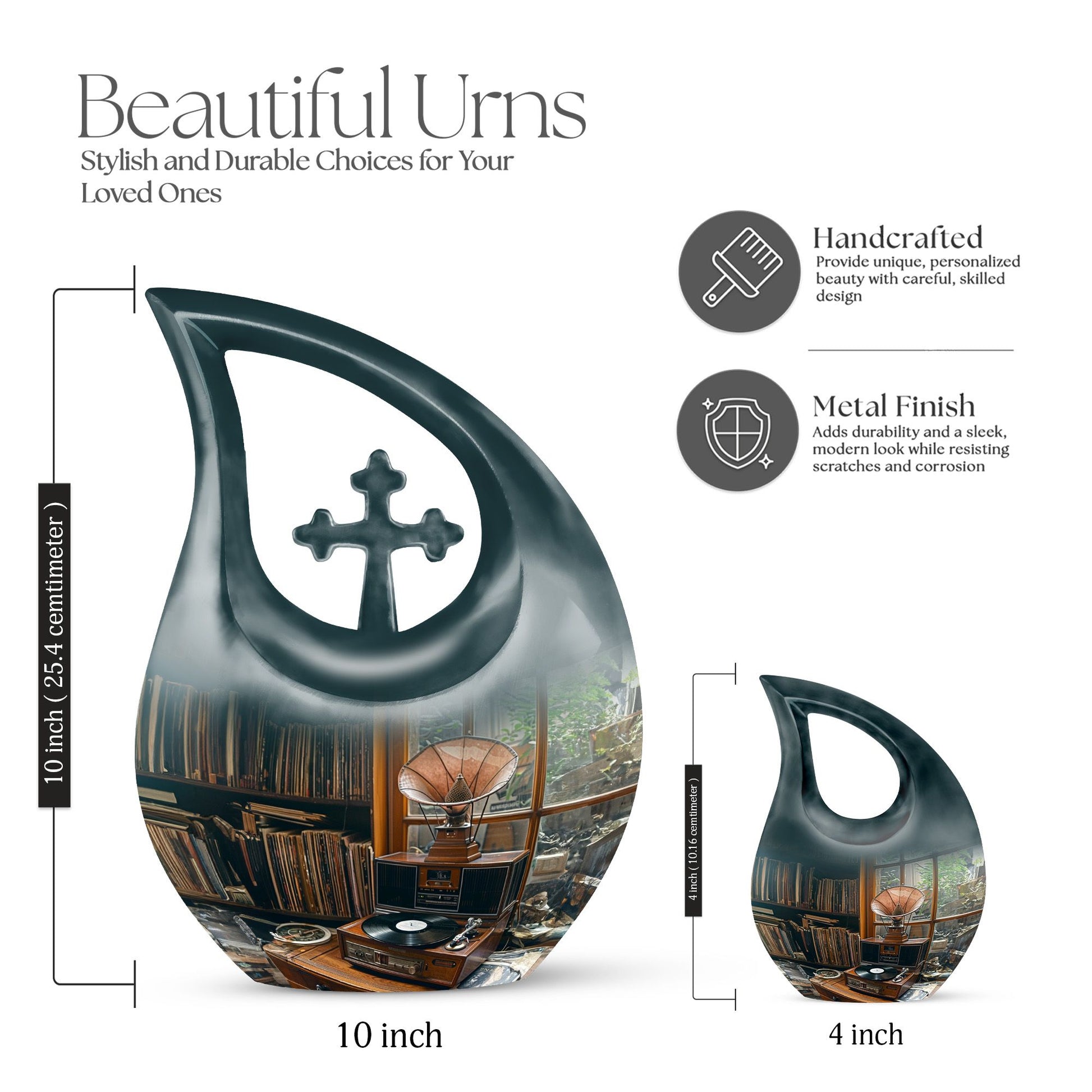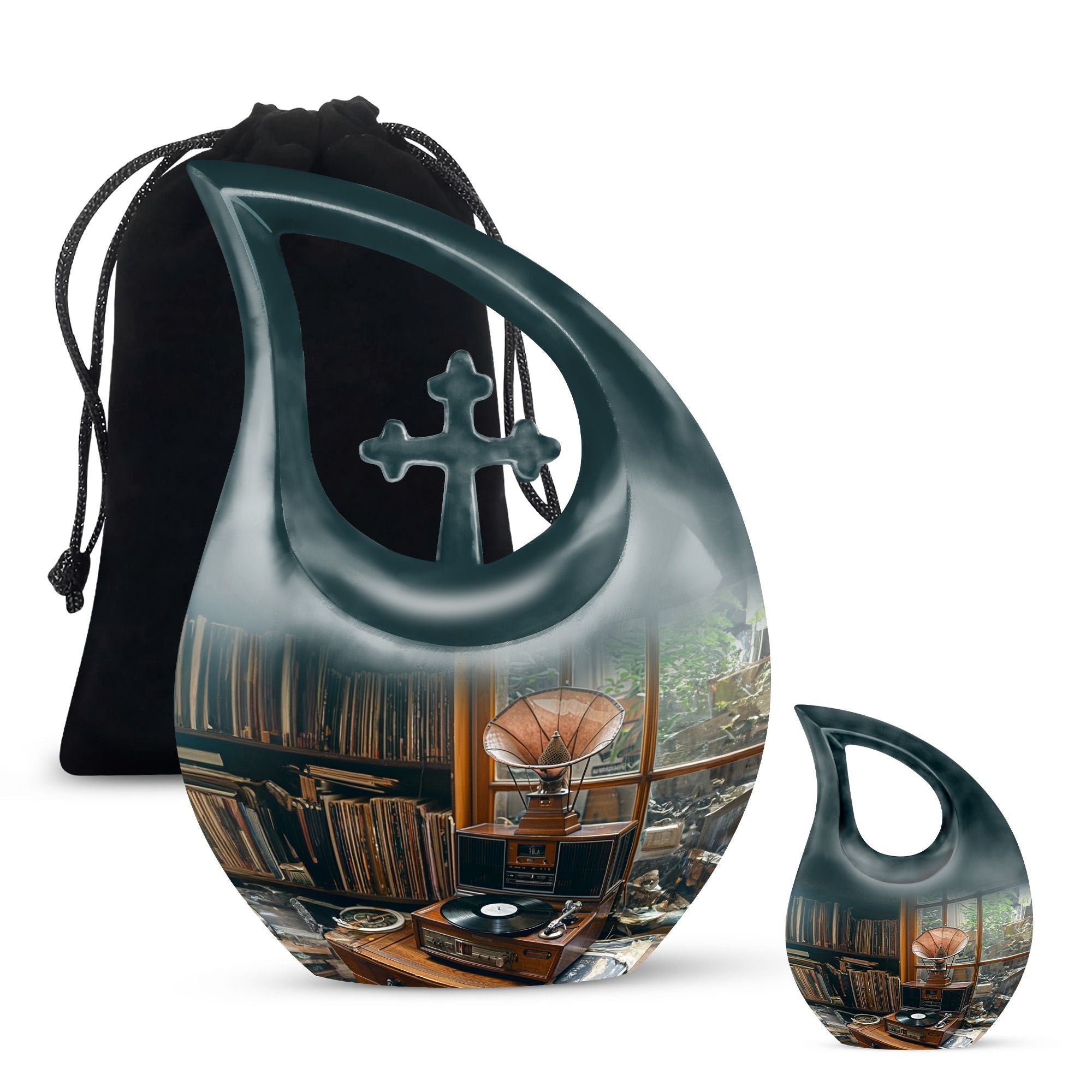 Discover an innovative way to pay tribute to your loved ones with this 10-inch Gramophone urn. Crafted from premium aluminium, this memorial urn stands as a bold representation of your noble feelings. Weighing just 3.3 pounds, it exhibits a Gramophone theme that echoes a timeless charm, capturing the essence of the 'Cross Drop' profile. This large urn has an impressive capacity of 200 cubic inches, thoughtfully designed to preserve your treasured memories. The urn comes with a plush velvet pouch, a snug haven for the containment of ashes. Make this epitaph more personal with our customization option, enabling you to engrave names on it for an eternal memory. Searching for 'memorial urns', 'urns for ashes for adults', or 'small urns for ashes' directs you to our unbeatable selection. Without breaking the bank, find premium and affordable cremation urns in our repertoire. This is more than just an urn for sale; it's a classic memoir that cherishes the departed, keeping them close forever.