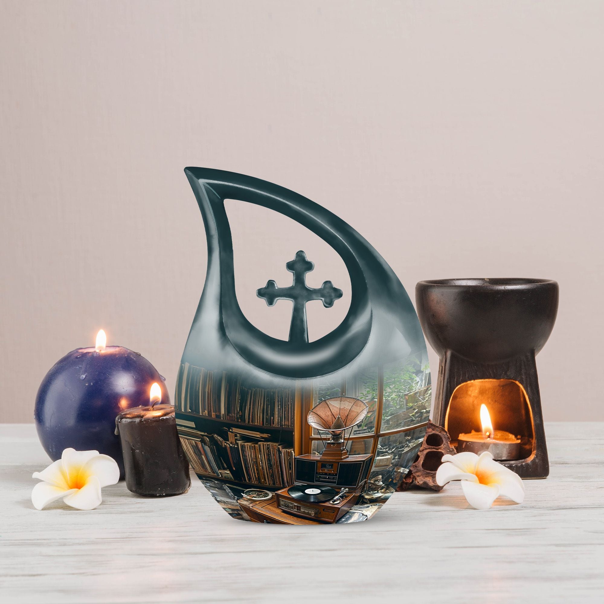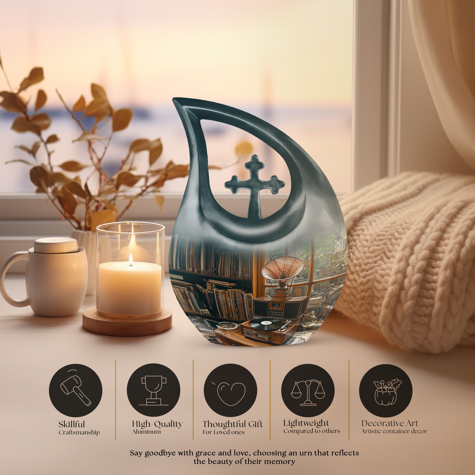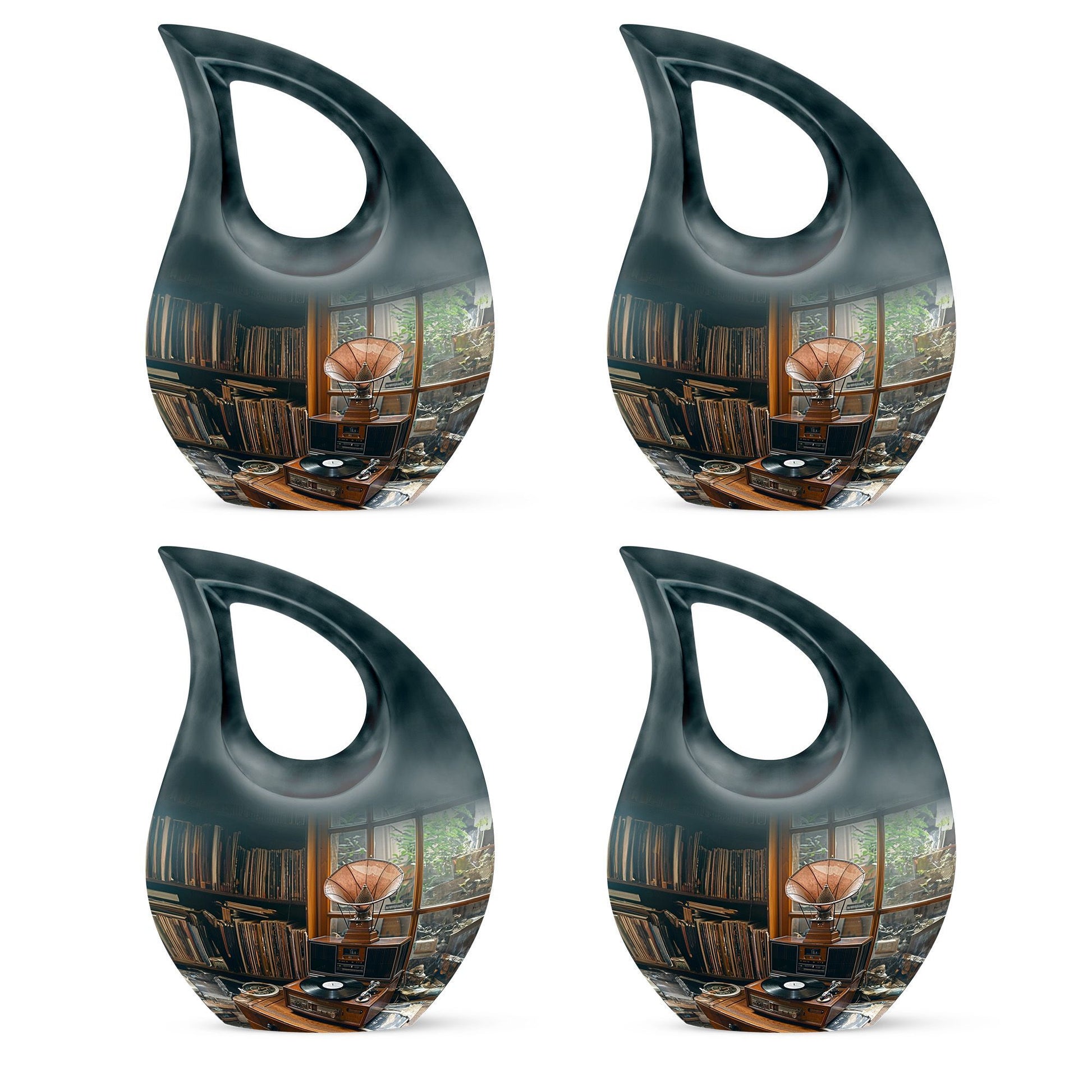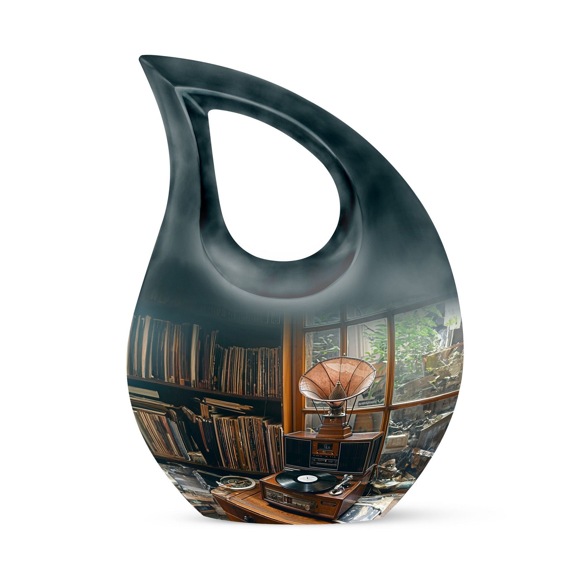 Discover an innovative way to pay tribute to your loved ones with this 10-inch Gramophone urn. Crafted from premium aluminium, this memorial urn stands as a bold representation of your noble feelings. Weighing just 3.3 pounds, it exhibits a Gramophone theme that echoes a timeless charm, capturing the essence of the 'Cross Drop' profile. This large urn has an impressive capacity of 200 cubic inches, thoughtfully designed to preserve your treasured memories. The urn comes with a plush velvet pouch, a snug haven for the containment of ashes. Make this epitaph more personal with our customization option, enabling you to engrave names on it for an eternal memory. Searching for 'memorial urns', 'urns for ashes for adults', or 'small urns for ashes' directs you to our unbeatable selection. Without breaking the bank, find premium and affordable cremation urns in our repertoire. This is more than just an urn for sale; it's a classic memoir that cherishes the departed, keeping them close forever.
