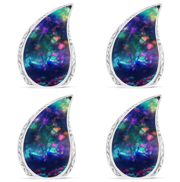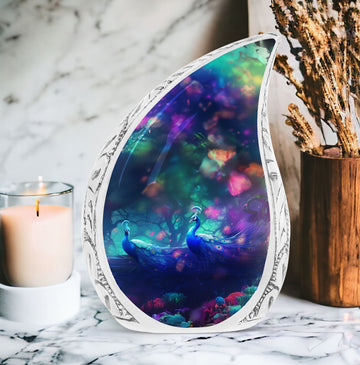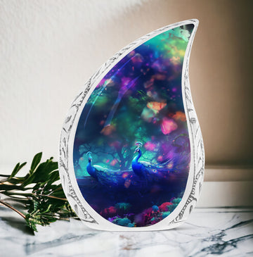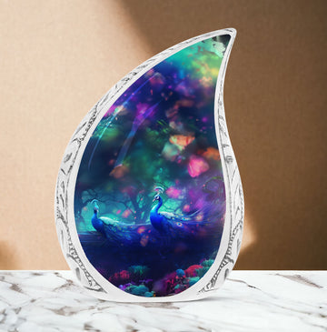 Honor your deceased loved ones and keep their memories alive with our exquisite 'Peacock Urn'. This large urn is meticulously crafted with great attention to detail from robust and lightweight Aluminium, boasting a superior quality that ensures long-term durability. Its beauty is truly timeless, thanks to the Classic Urn design. The size of this cremation urn is 3 inches, and the urn is sizable at 10 inches in height, with a capacity to hold up to 200 cubic inches of ashes, which weighs approximately 3.3 pounds. Provide an intimate final touch with the option to personalize this urn with engraved names, creating a poignant reminder of your loved one. Each Peacock Urn comes with a plush velvet pouch providing a dignified containment for the ashes. Ideal for honouring your beloved mom, or other cherished family members. The Peacock Urn brings together elegance, simplicity, and personalization, quintessential qualities for a memorial that reflects the uniqueness of your dearly departed.