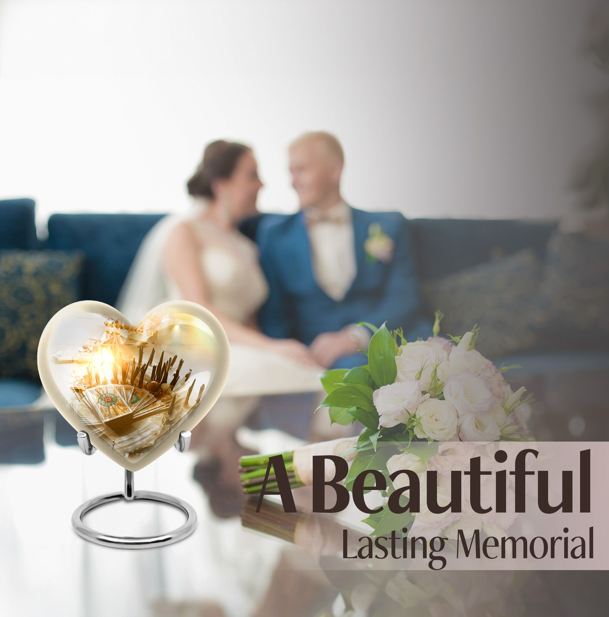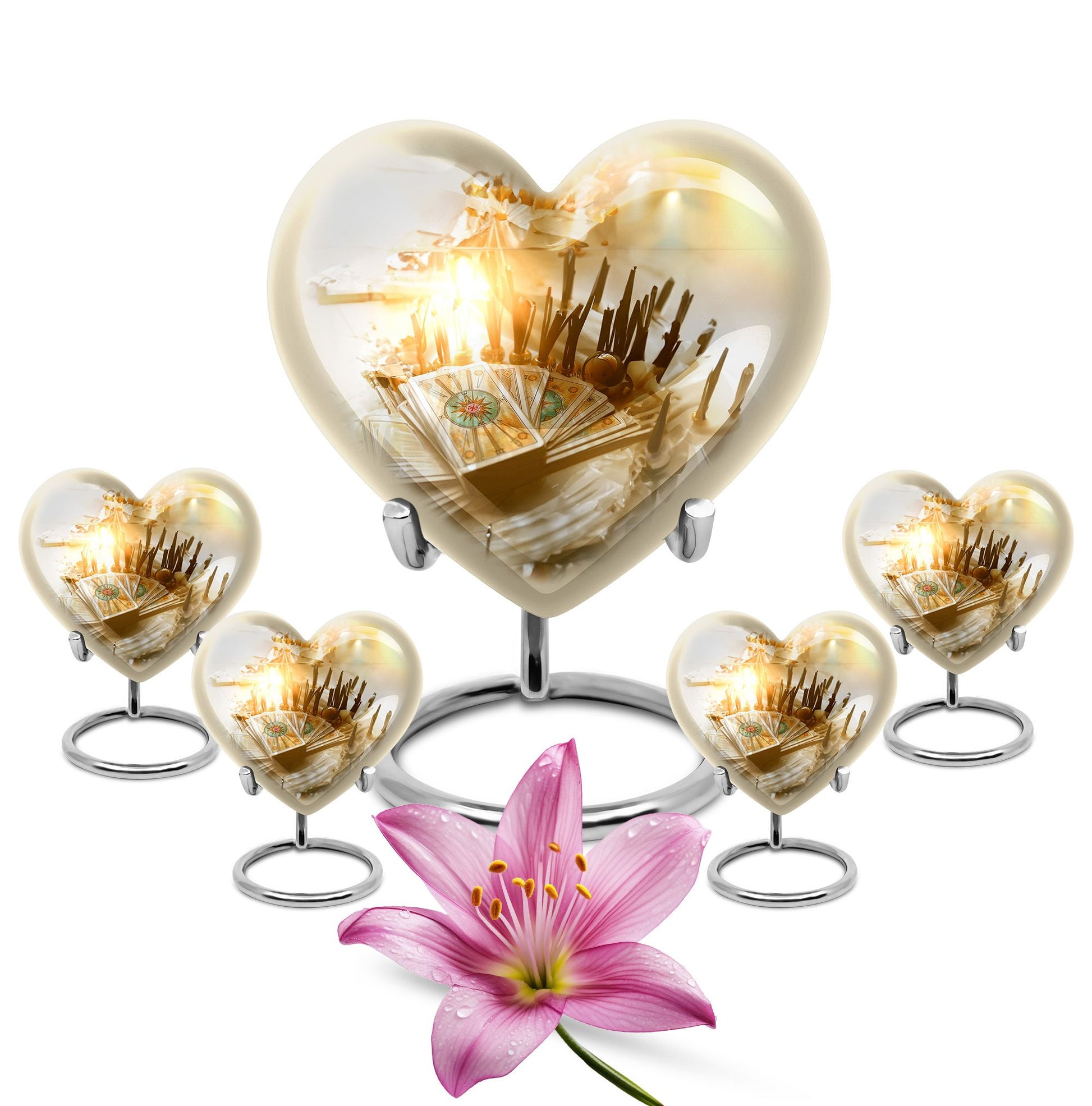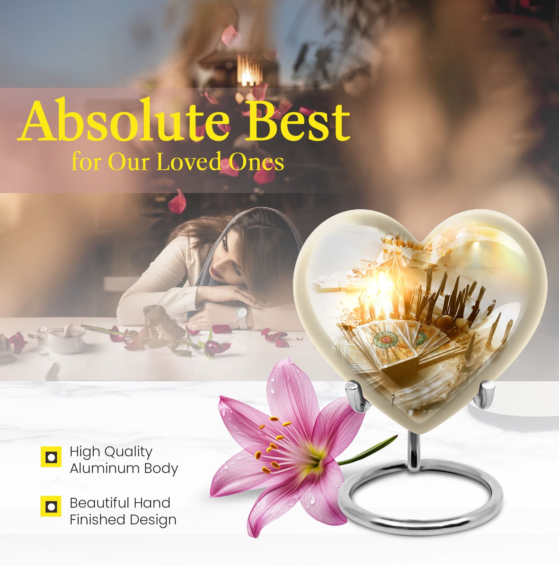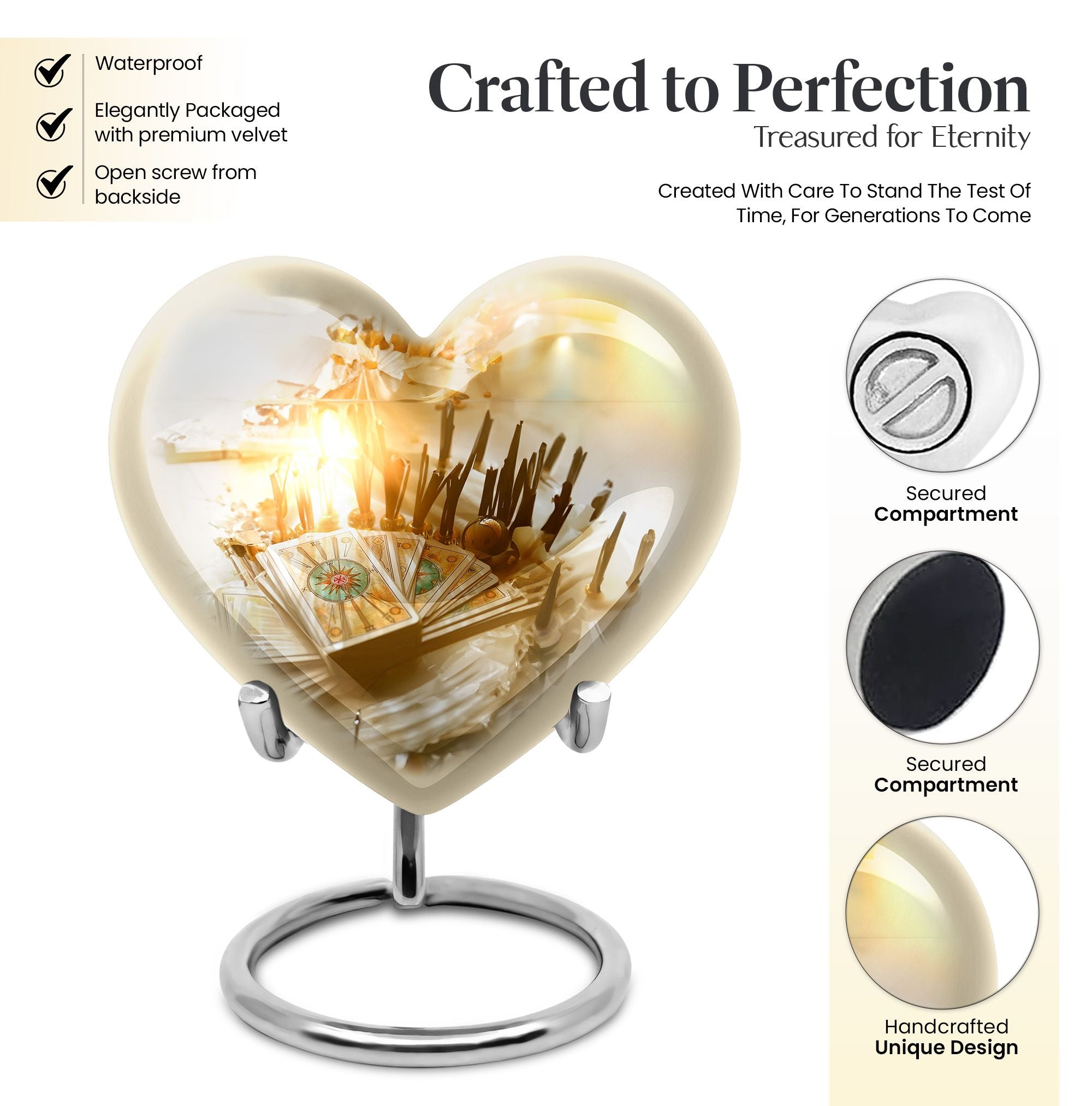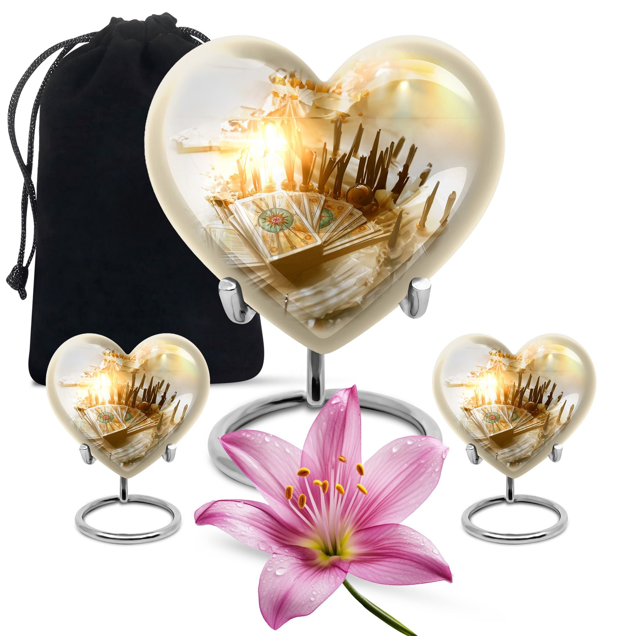 Experience serenity and peace during a poignant time with our abstract-themed Tarot Urn. This striking Large Urn stands at 10 inches in height and weighs 3.3 pounds. With a capacity of 200 cubic inches, it provides ample space for holding the remains of your dearly departed. Purposefully crafted from durable aluminium, this transcendent funeral urn for ashes for men ensures secure containment. Each shipment includes a plush velvet pouch for respectful and dignified holding of the ashes. Personalization options are available, allowing you to engrave the names of your loved ones onto the urn, creating a lasting, tangible memory. Despite its metal construct, this urn doesn't compromise on style or emotional appeal. Whether you're seeking memorial human urns for ashes, traditional urns, or burial urns, our Tarot Urn encapsulates the solemnity you seek. Please note: design has not been attributed as per request.