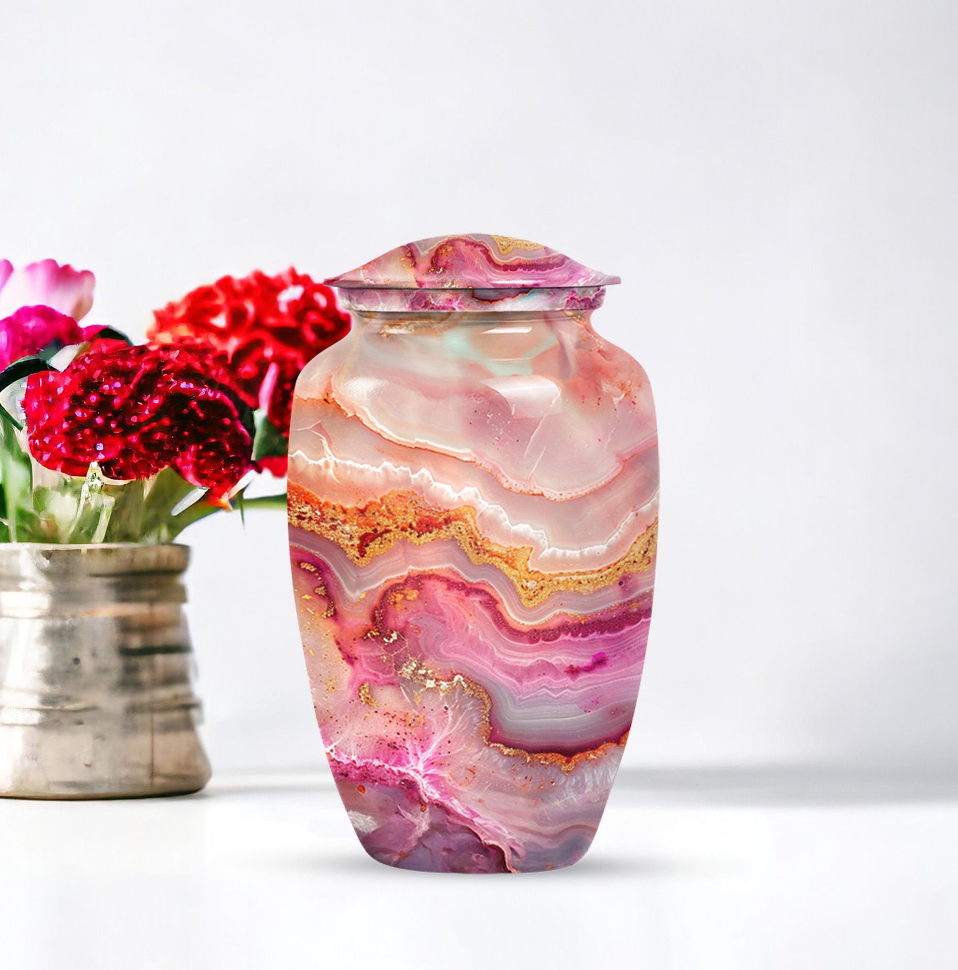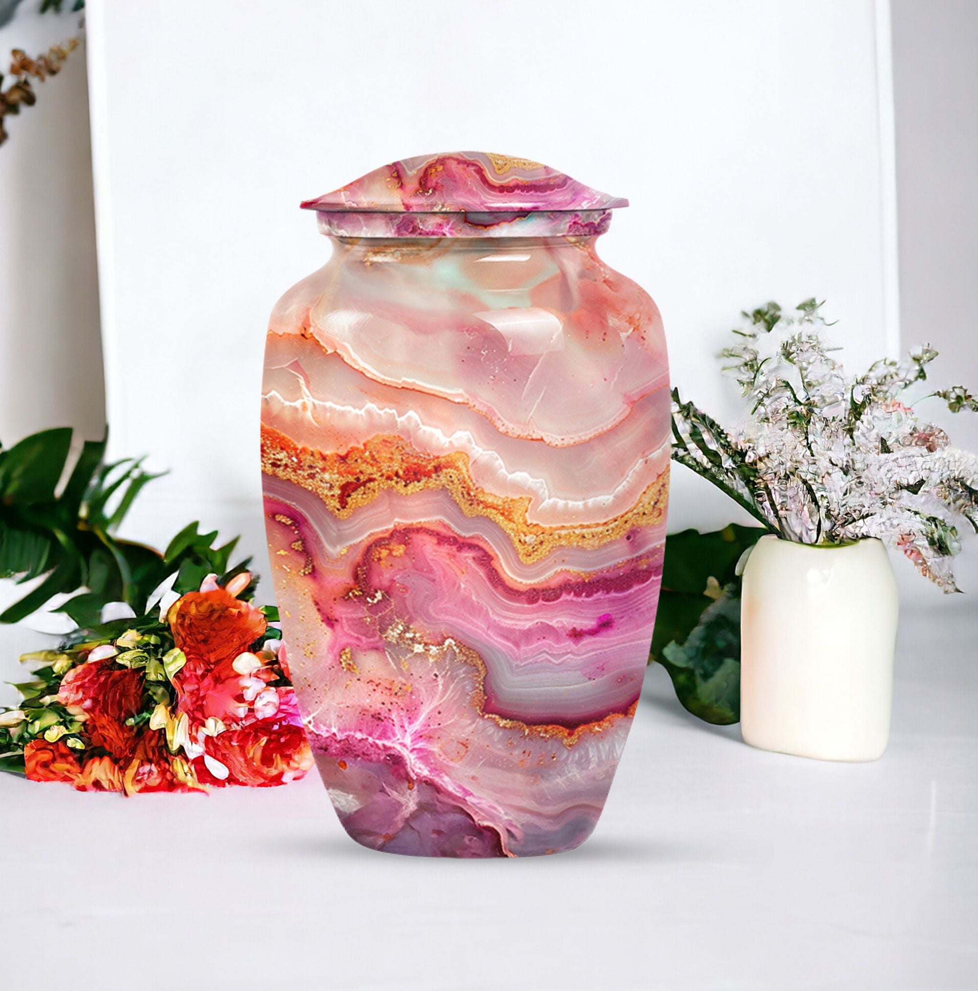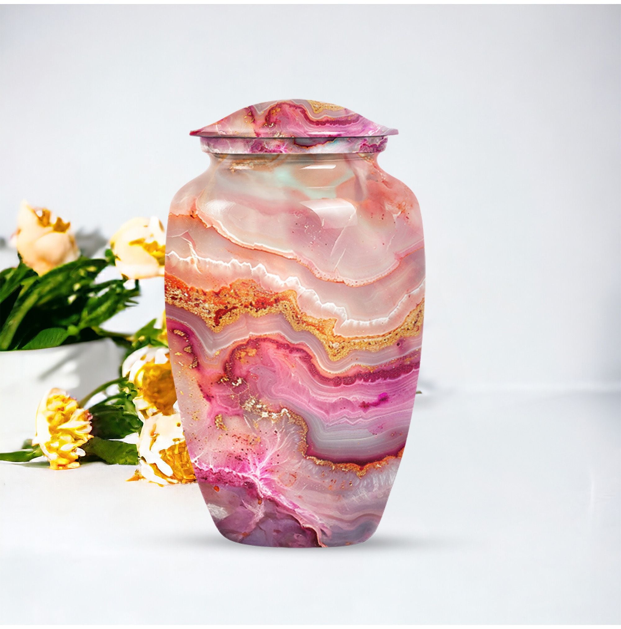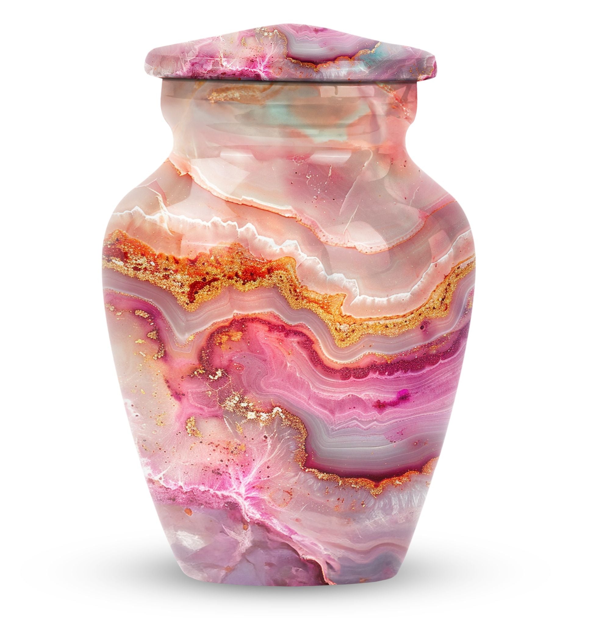 Our meticulously crafted 10 Inch Vibrant Swirl Urn emboldens a tranquility in your soul, bridging the chasm created by a loved one's departure. Demonstrating an abstract theme that captivates, this aluminium artifact is a celebration of the timeless bond that endures beyond mortality. As a large urn, it has a capacity of 200 cubic inches, perfectly suitable for the containment of adult human ashes. The urn weighs a sturdy 3.3 pounds and is embellished in a classic design, striking an impeccable balance between durability and aesthetic appeal. To contribute to its undying charm, we offer an option to personalize this item with engraved names, making it an exclusive memorial of your beloved. Each urn is provided with a velvet pouch, stepping up in ensuring the cherished reminiscences of your loved one are kept safe. In the realm of memorial urns, the Vibrant Swirl urn offers a profound presence, a whisper of love in the stillness of agony. Ideal for adult burial and a poignant answer to cremation urns for dad, this urn serves as a sublime reminder of love, loved and being loved. Truly, a sanctuary of memories in a shell of life.