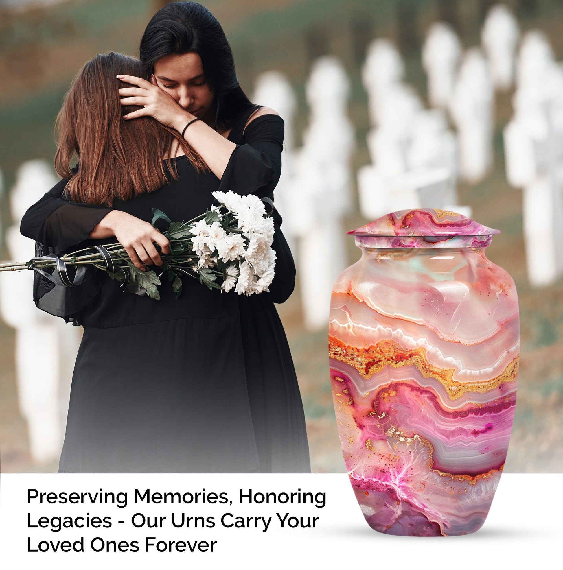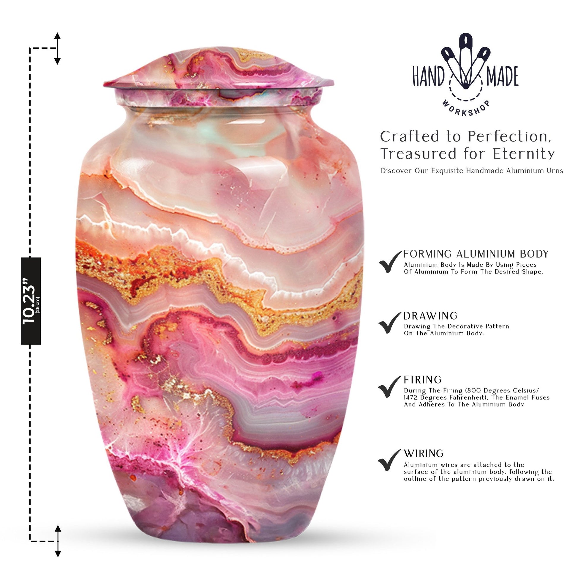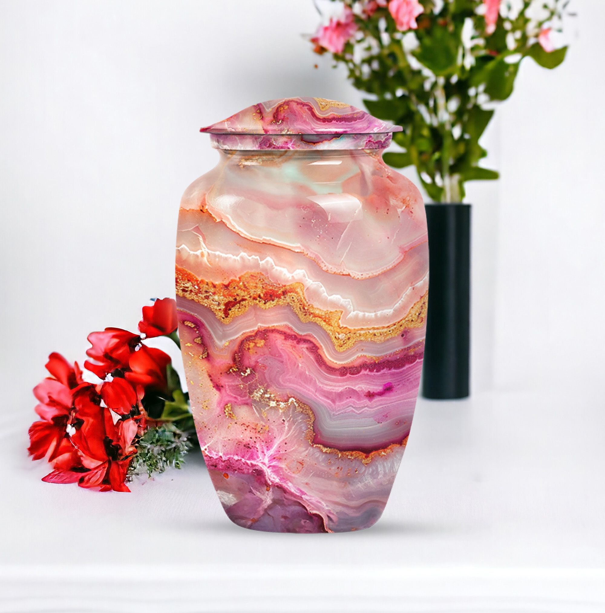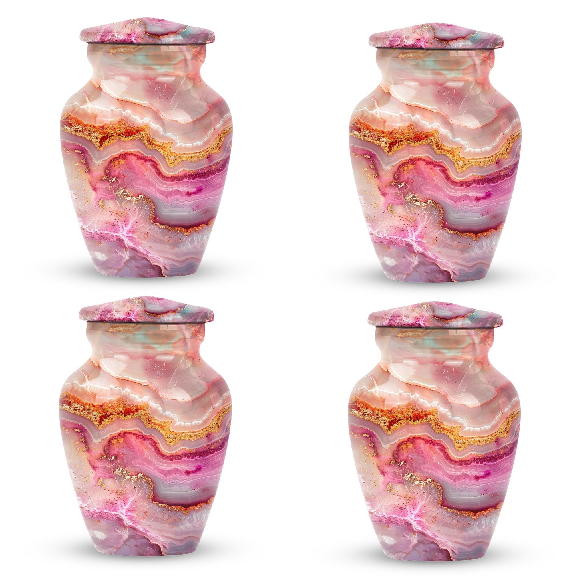 Our meticulously crafted 10 Inch Vibrant Swirl Urn emboldens a tranquility in your soul, bridging the chasm created by a loved one's departure. Demonstrating an abstract theme that captivates, this aluminium artifact is a celebration of the timeless bond that endures beyond mortality. As a large urn, it has a capacity of 200 cubic inches, perfectly suitable for the containment of adult human ashes. The urn weighs a sturdy 3.3 pounds and is embellished in a classic design, striking an impeccable balance between durability and aesthetic appeal. To contribute to its undying charm, we offer an option to personalize this item with engraved names, making it an exclusive memorial of your beloved. Each urn is provided with a velvet pouch, stepping up in ensuring the cherished reminiscences of your loved one are kept safe. In the realm of memorial urns, the Vibrant Swirl urn offers a profound presence, a whisper of love in the stillness of agony. Ideal for adult burial and a poignant answer to cremation urns for dad, this urn serves as a sublime reminder of love, loved and being loved. Truly, a sanctuary of memories in a shell of life.