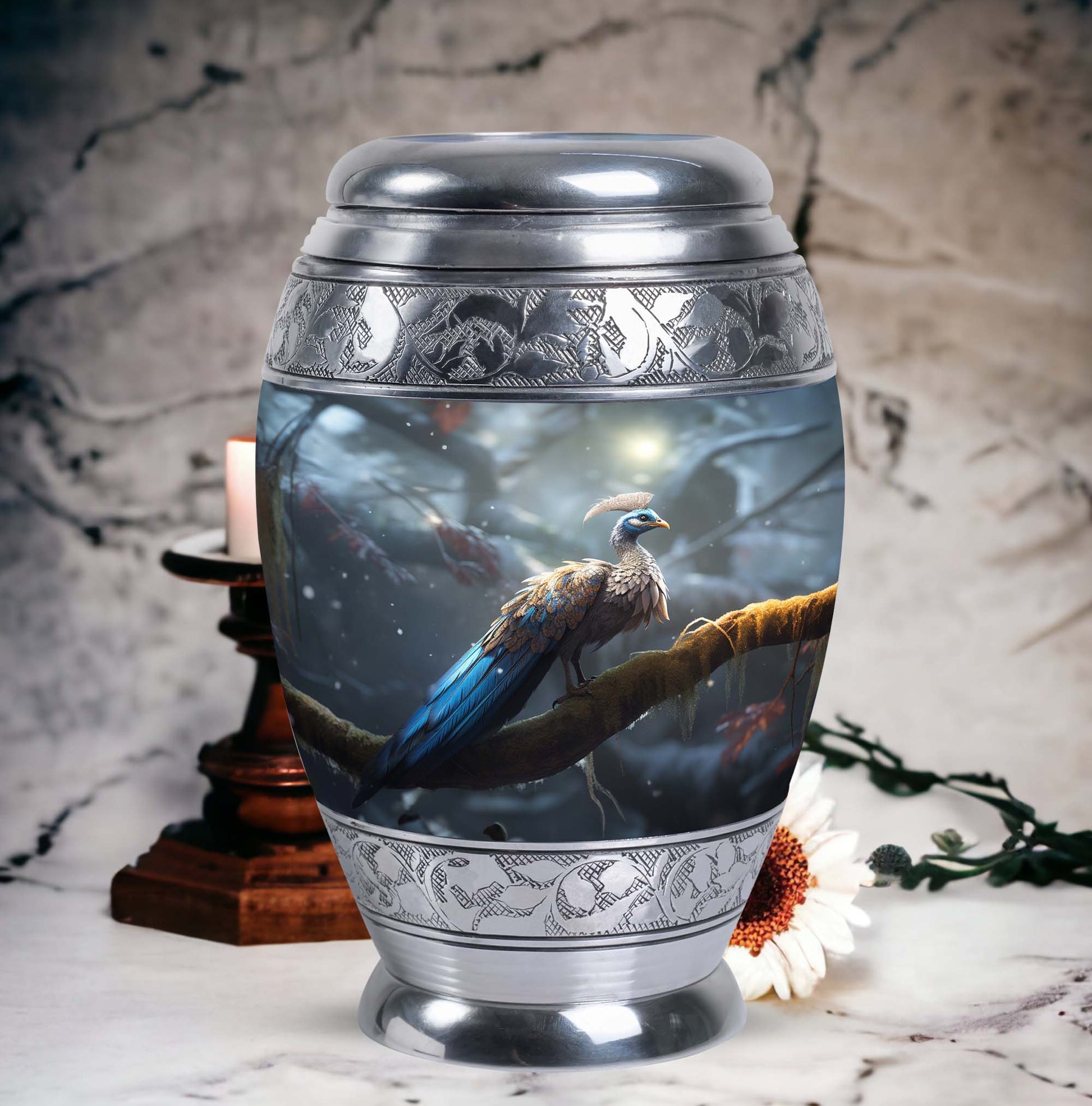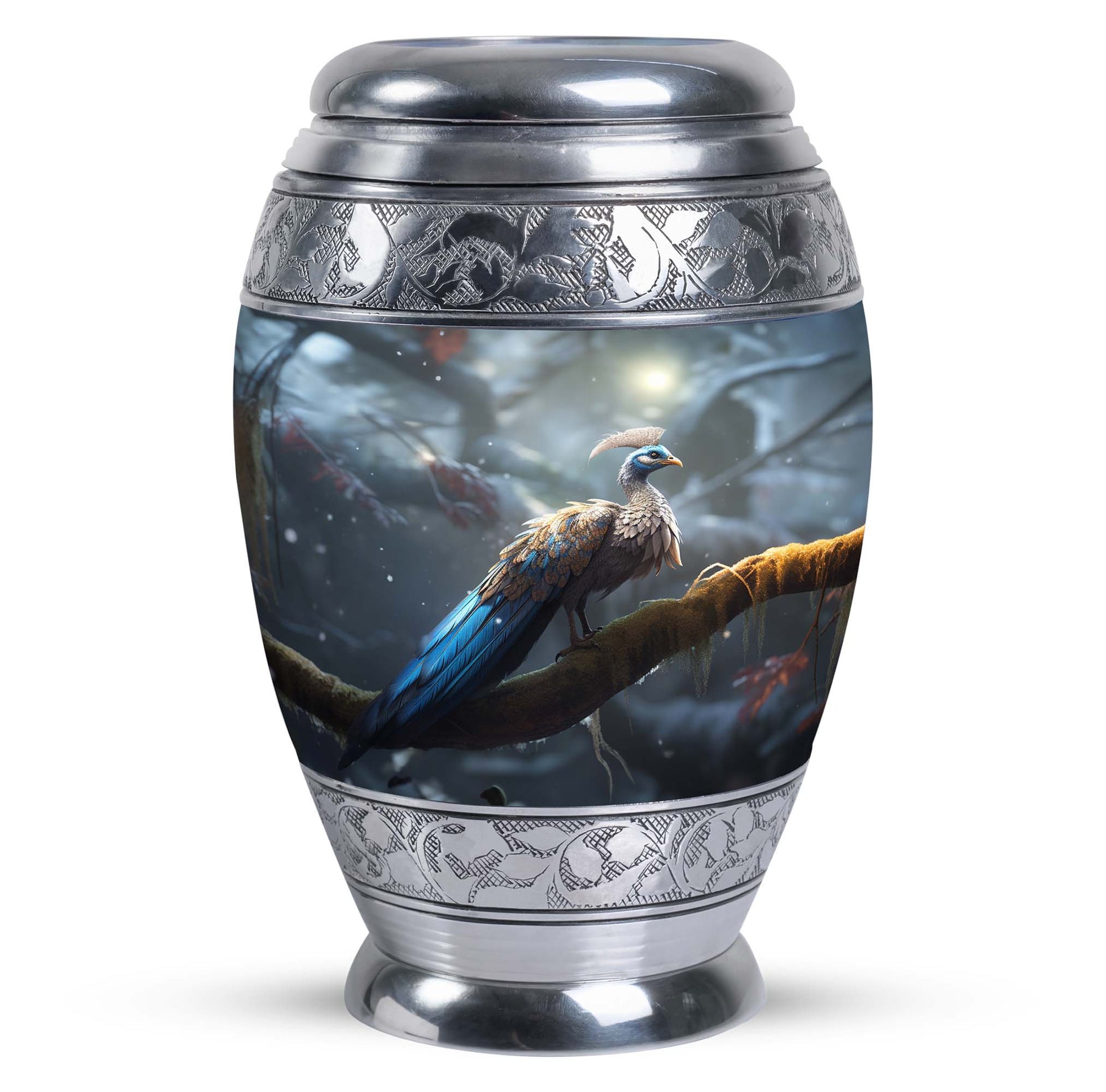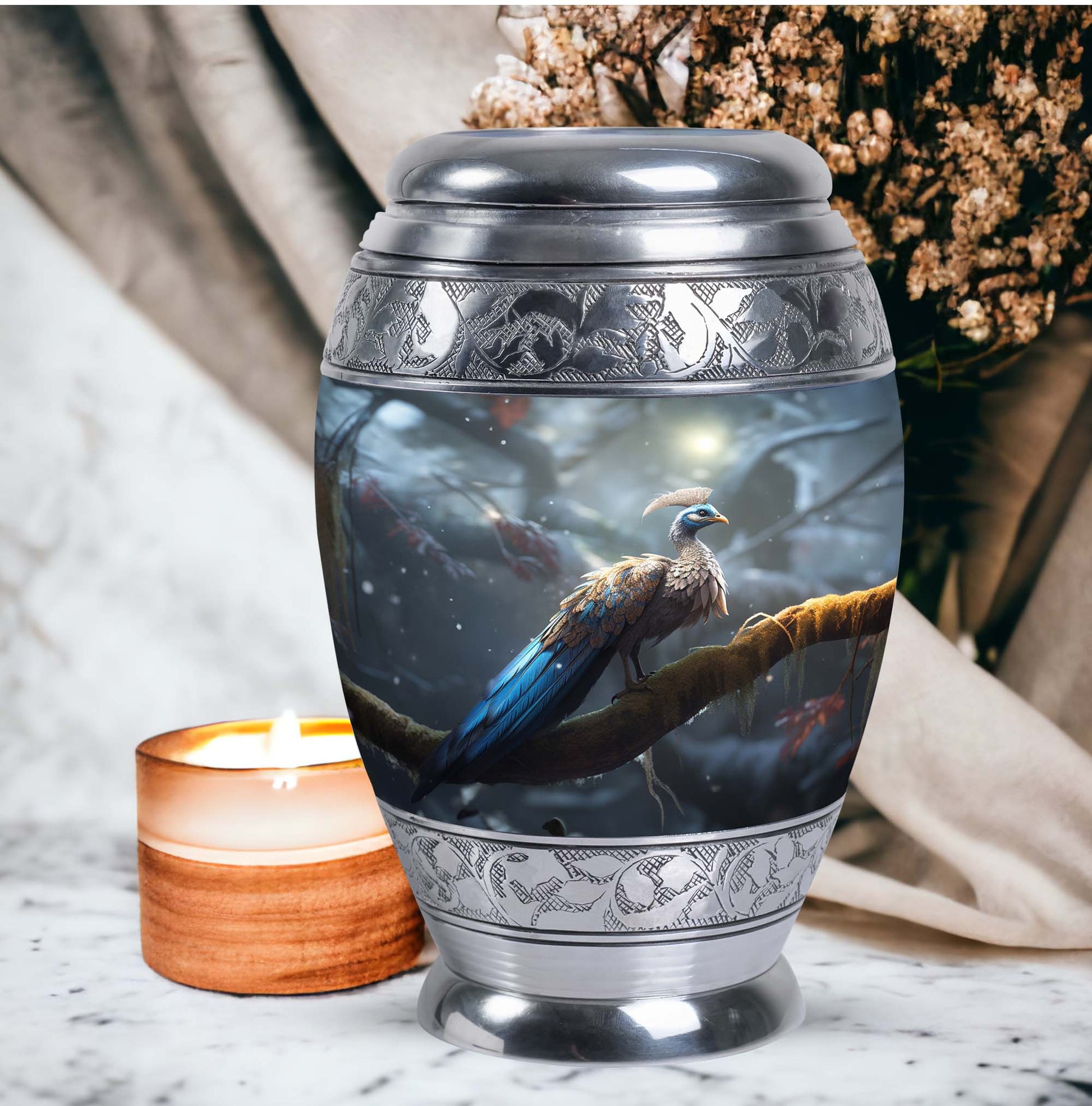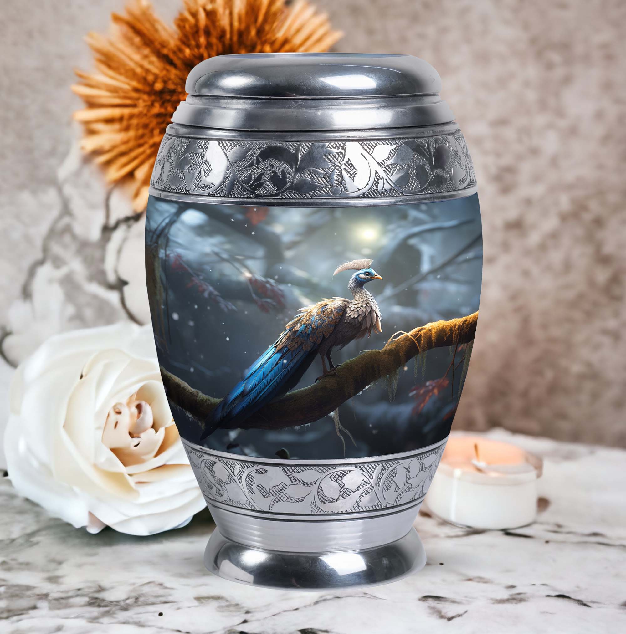 This large cremation urns for human ashes option is suited for home memorials, burial ceremonies, or as a lasting tribute displayed in a place of honor. Its striking peacock motif symbolizes renewal, hope, and eternal life—offering comfort during moments of remembrance.
