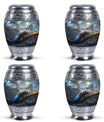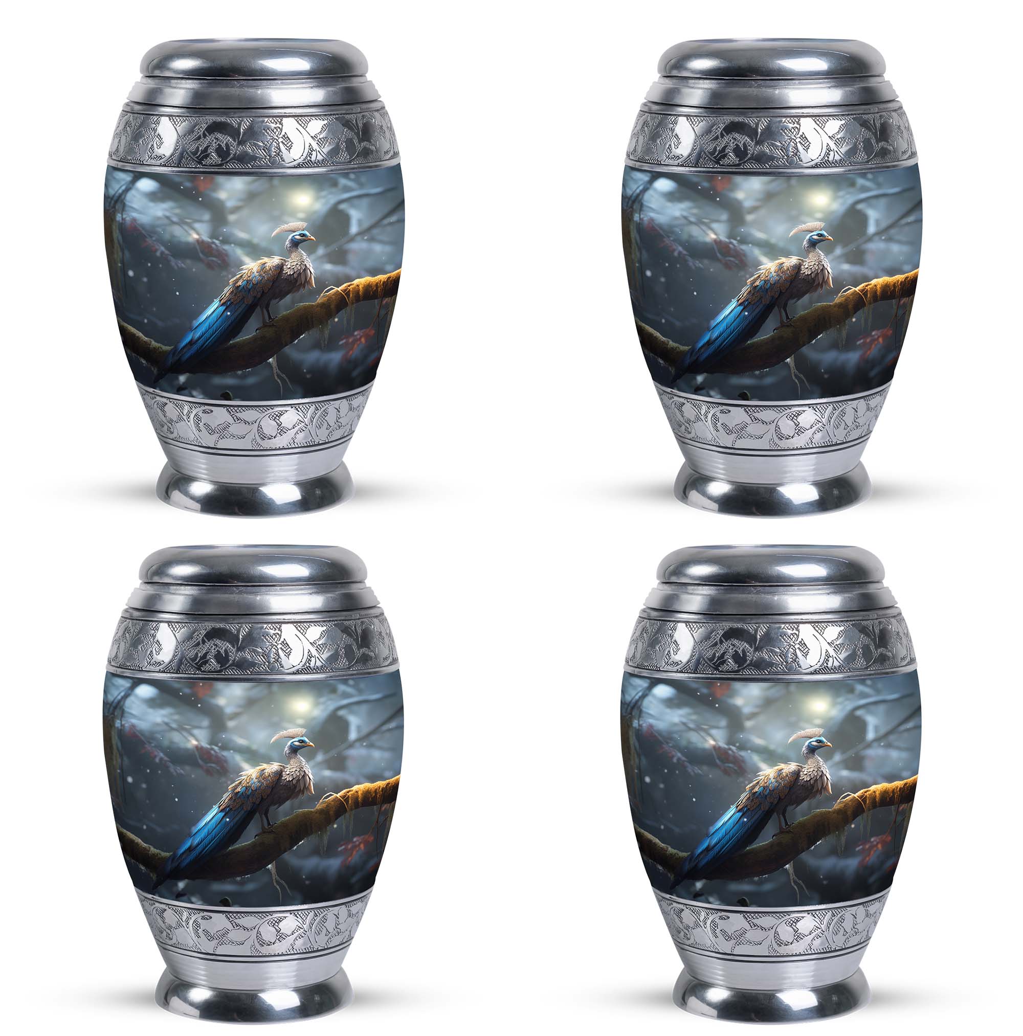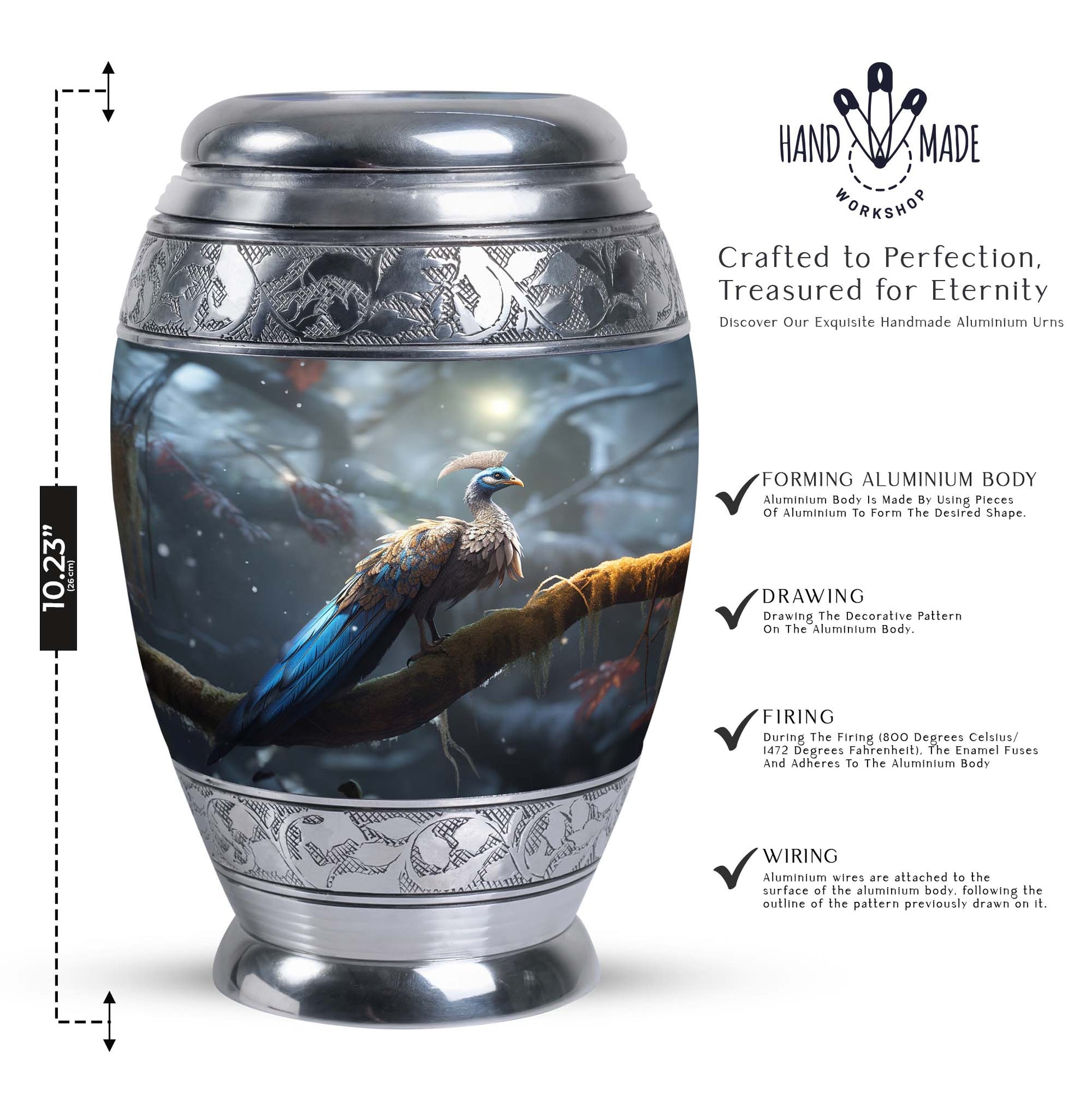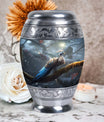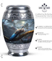 Crafted with exceptional attention to detail, this large decorative urn features a breathtaking peacock-inspired design with rich blue tones and ornamental patterns. Made from premium aluminum, it combines durability with artistic elegance. Its secure screw-top closure ensures complete safety for your loved one’s ashes, making it ideal for those searching for a cremation urn large, large funeral urn, or urns for human ashes large. With its generous capacity and refined design, this cremation urn adult large is perfect for display at home or in a memorial setting.