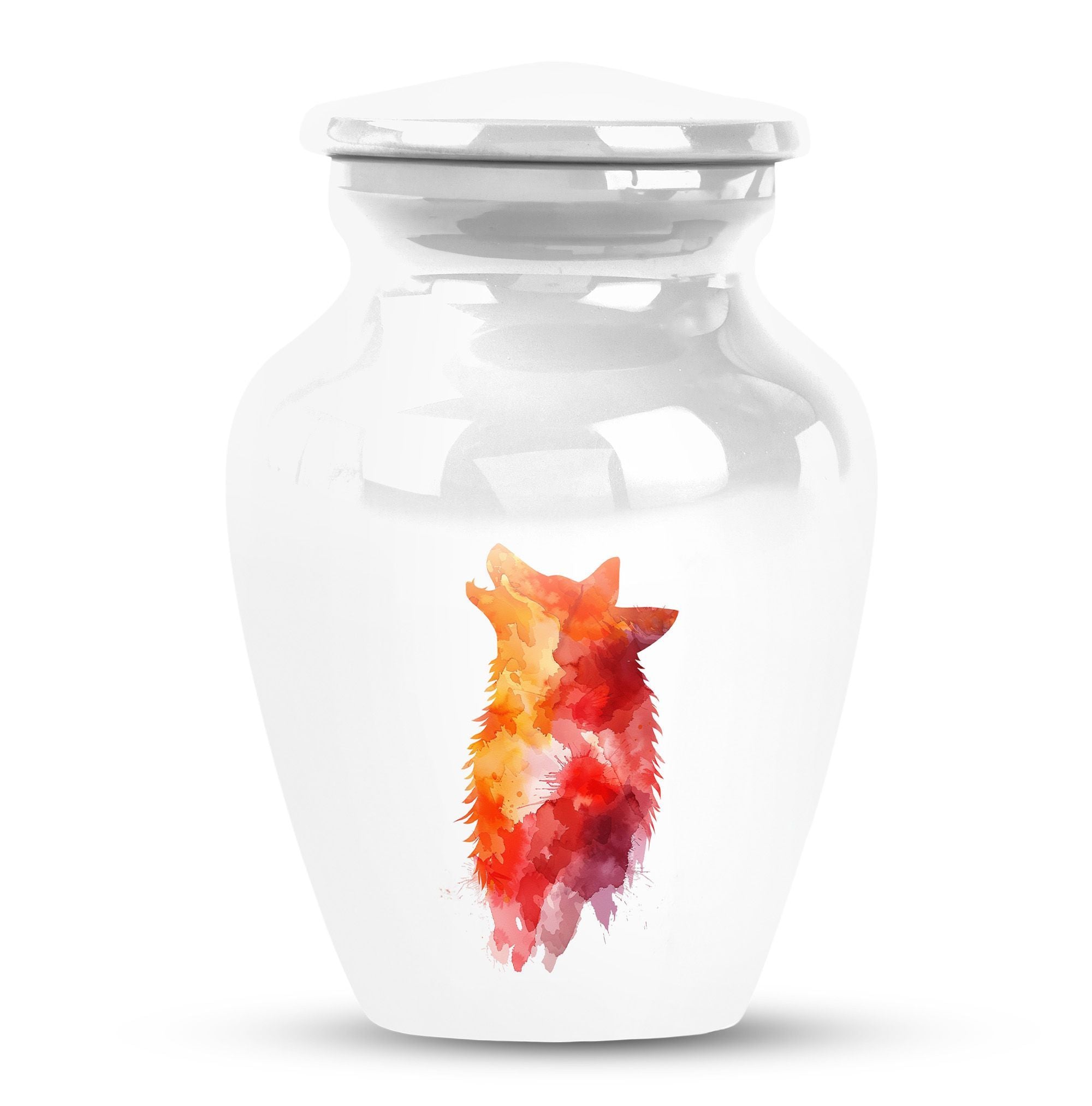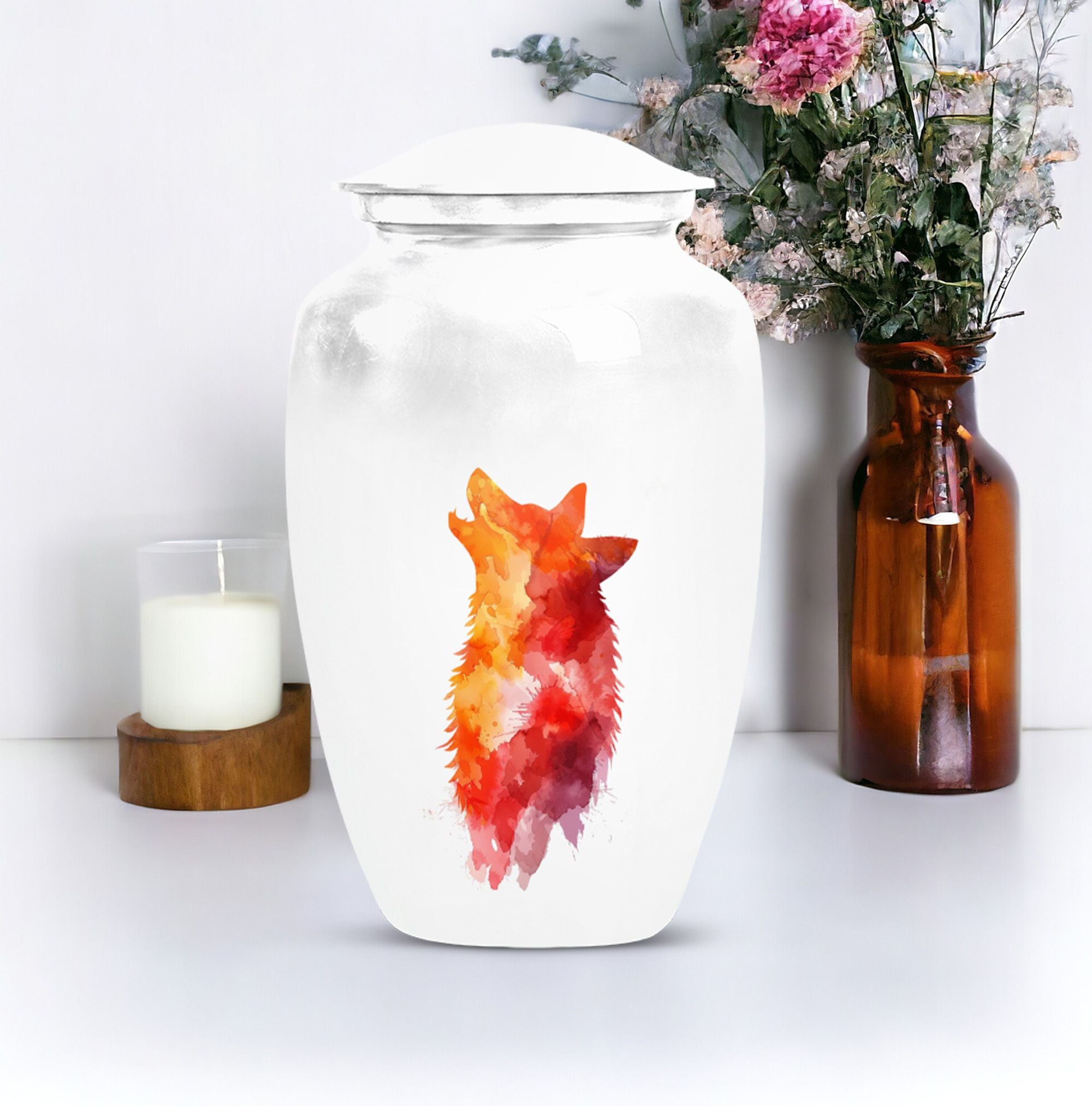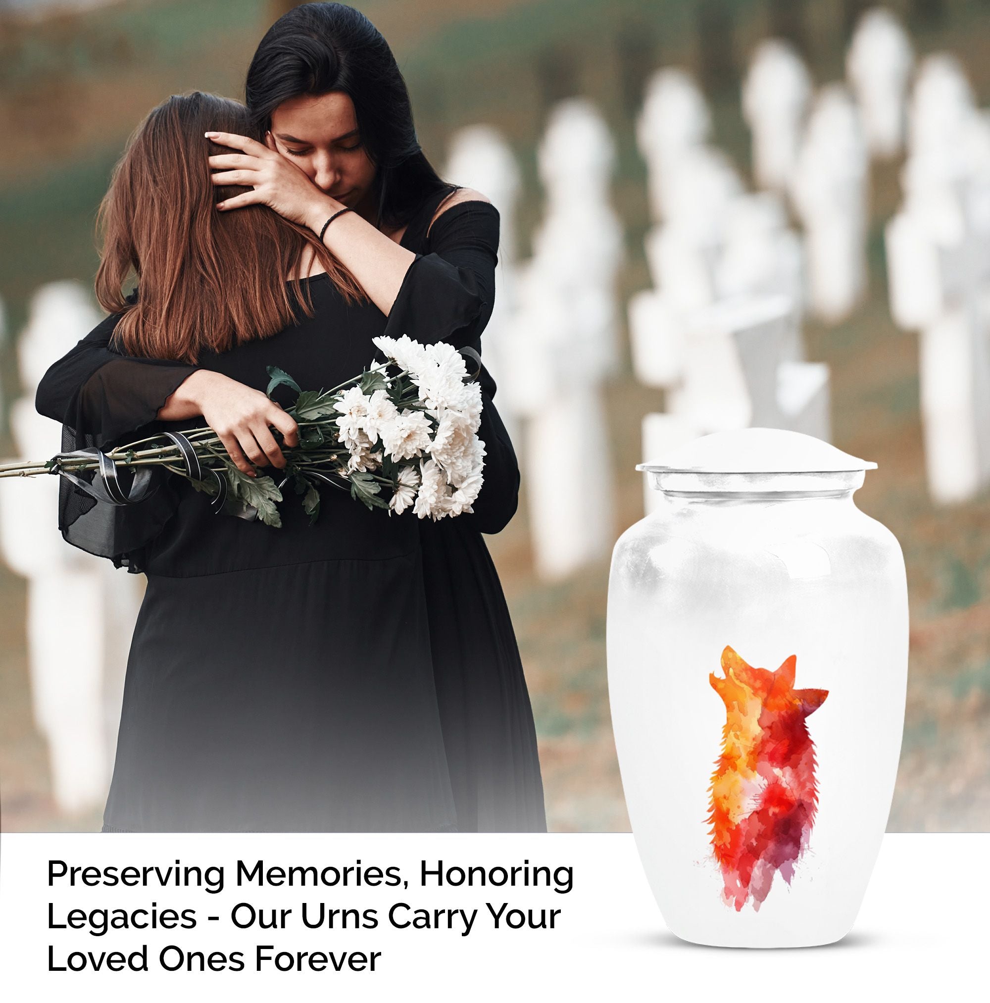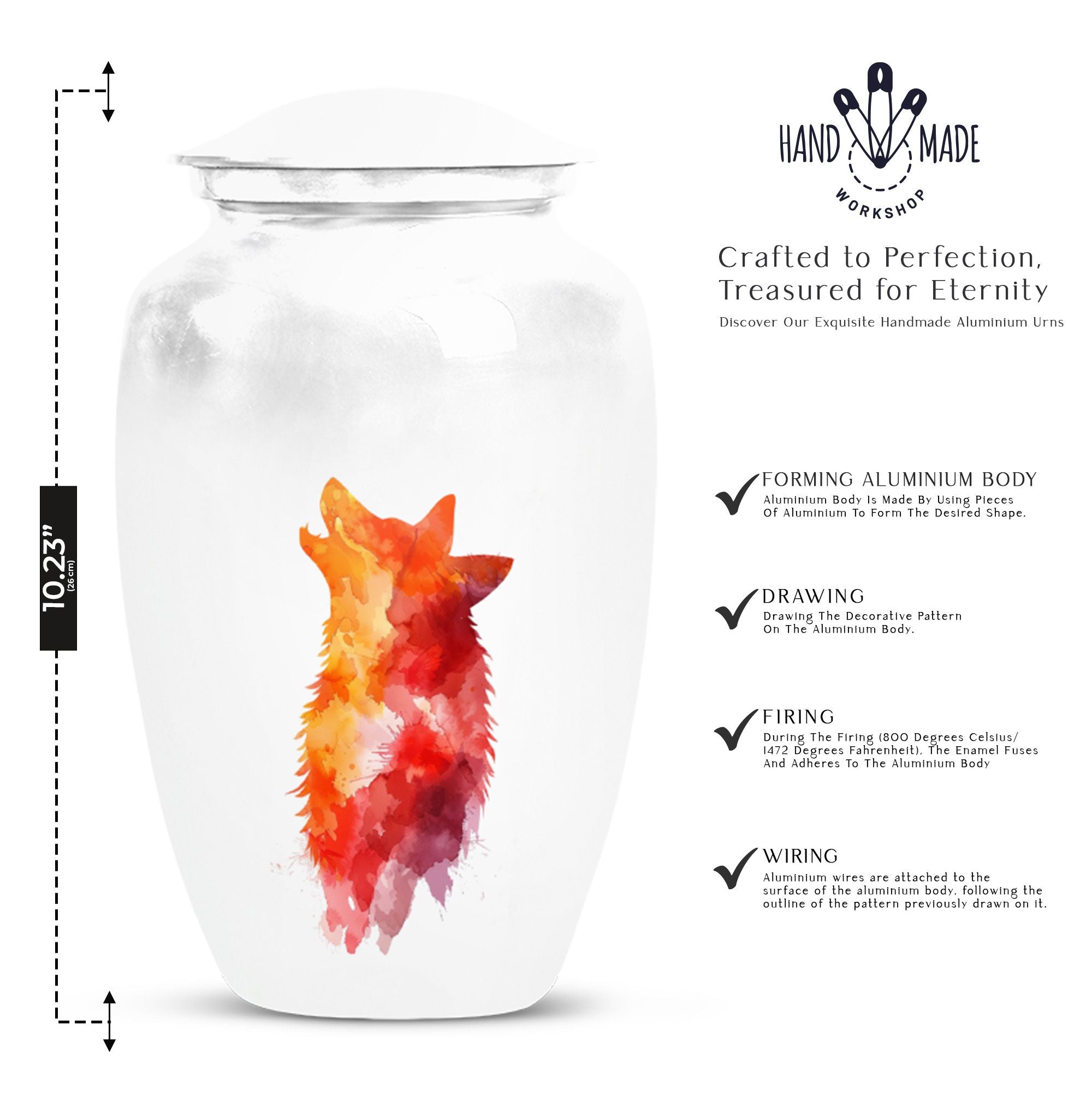 Engulf your dear departed one's remembrance in the captivating allure of our meticulously crafted Wolf Howling Urn, a standout addition to our large memorial forever urns selection. The allure of this classic urn is enhanced by its glistening aluminum composition, exquisitely polished to a radiant finish. Its hefty weight of 3.3 pounds and height of 10 inches speaks to its sturdiness and durability. It comes with an accompanying velvet pouch, an ideal containment space for precious ashes. This cremation urn's capacity eases your worries, as it can comfortably hold up to 200 cubic inches. For that personal touch, fashion the urn with an engraved name, injecting a personal touch into this serene artifact. The theme wholly absorbs you, inspired by a wolf's spiritual call reverberating quietly in the hush of the pines. This vessel is not just a cremation urn; it is a testament to the indomitable strength, resilience, and beauty that was the essence of your loved one's life. Its unique wolf howling theme resonates deeply in hearts, acting as a constant reminder of shared memories and timeless moments. This human cremation urn reinforces the cherished thought - Gone, but never forgotten.