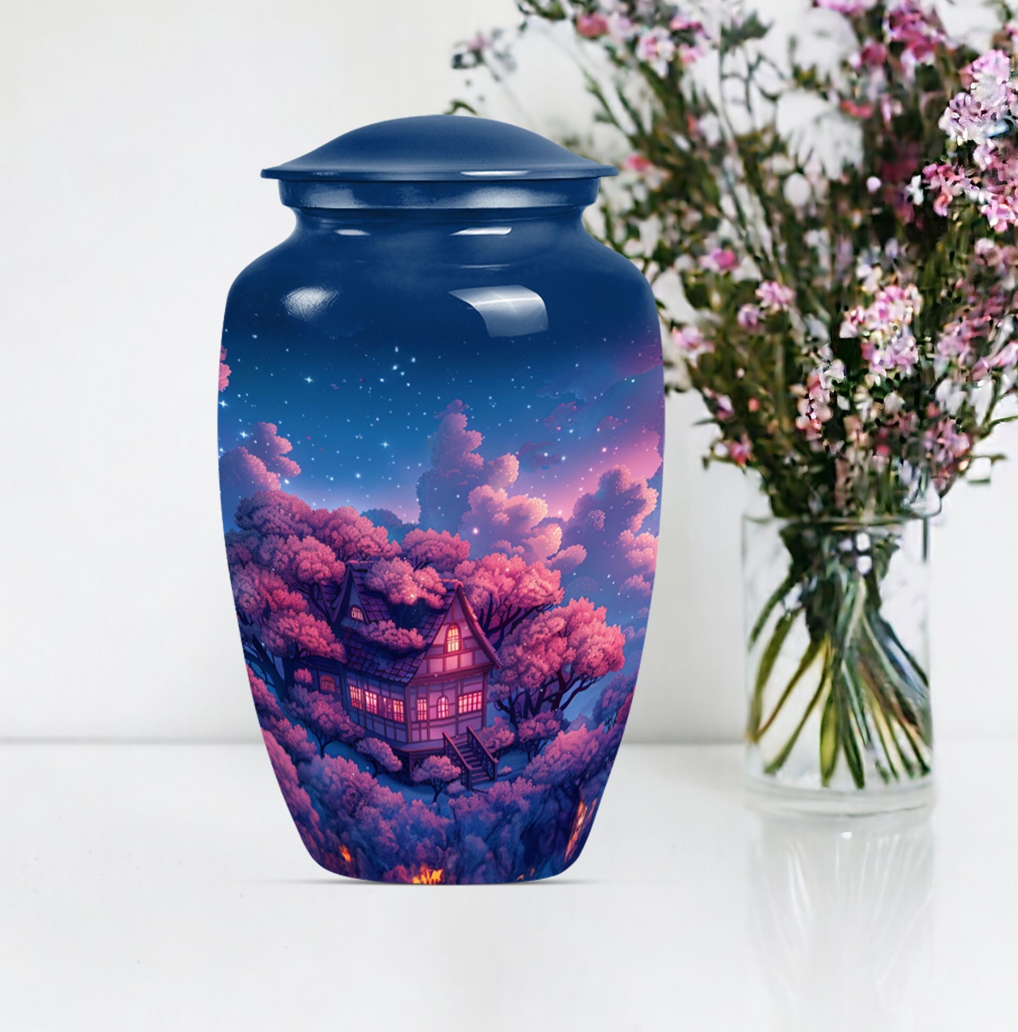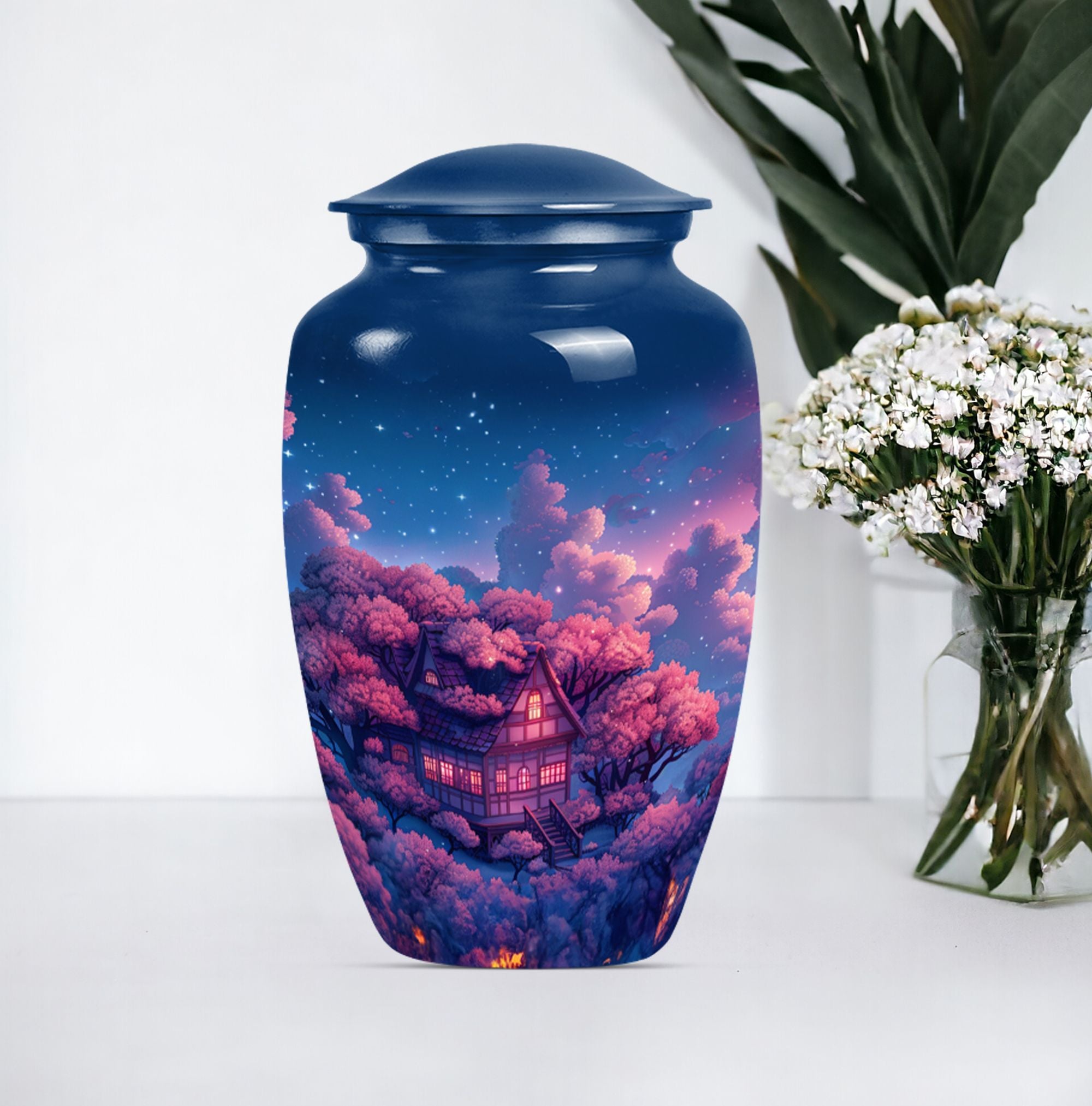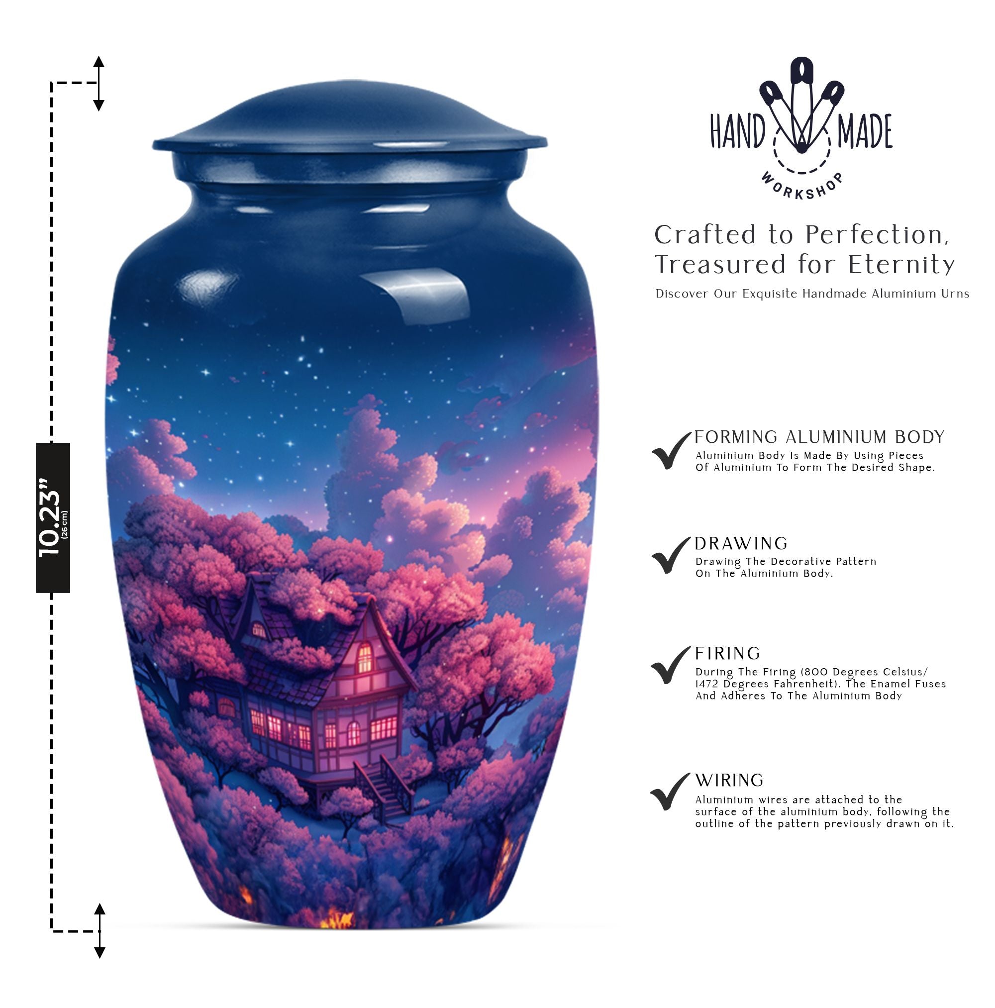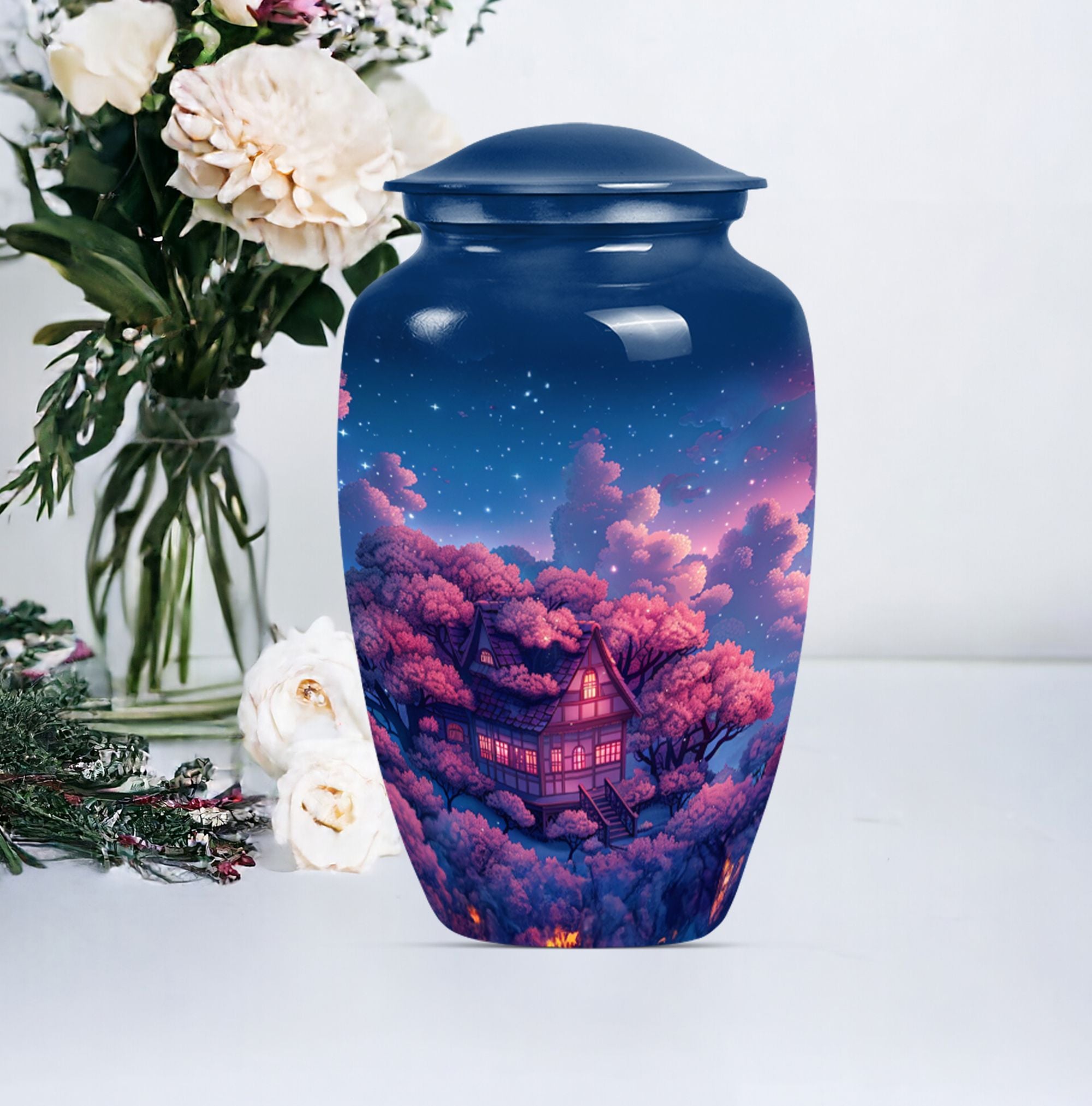 Immerse yourself in the tranquility and peace that our Clouds Urn brings. This Memorial Adult Urn speaks volumes with its classic and traditional design. With dimensions of 10 inches in height, this expansive urn balances delicacy with durability. The large capacity of 200 cubic inches smoothly accommodates, signifying its ideal use in memorial ceremonies and rituals. Our urn is enriched by its butterfly theme, an emblem of renewal and hope, empathetically aligning with your heartfelt feelings. Forged from robust aluminium, it weighs a solid 3.3 pounds, echoing its secure and sturdy nature. Offering a unique opportunity, the urn can be personalized with engraved names, turning it into profound keepsake. It comes encased in a velvet pouch ensuring the dignified containment of ashes. From funeral burial urns to ashes urn, this cremation urn, suitable for the containment of human ashes aids in turning sorrow into serenity, every time it is beheld.