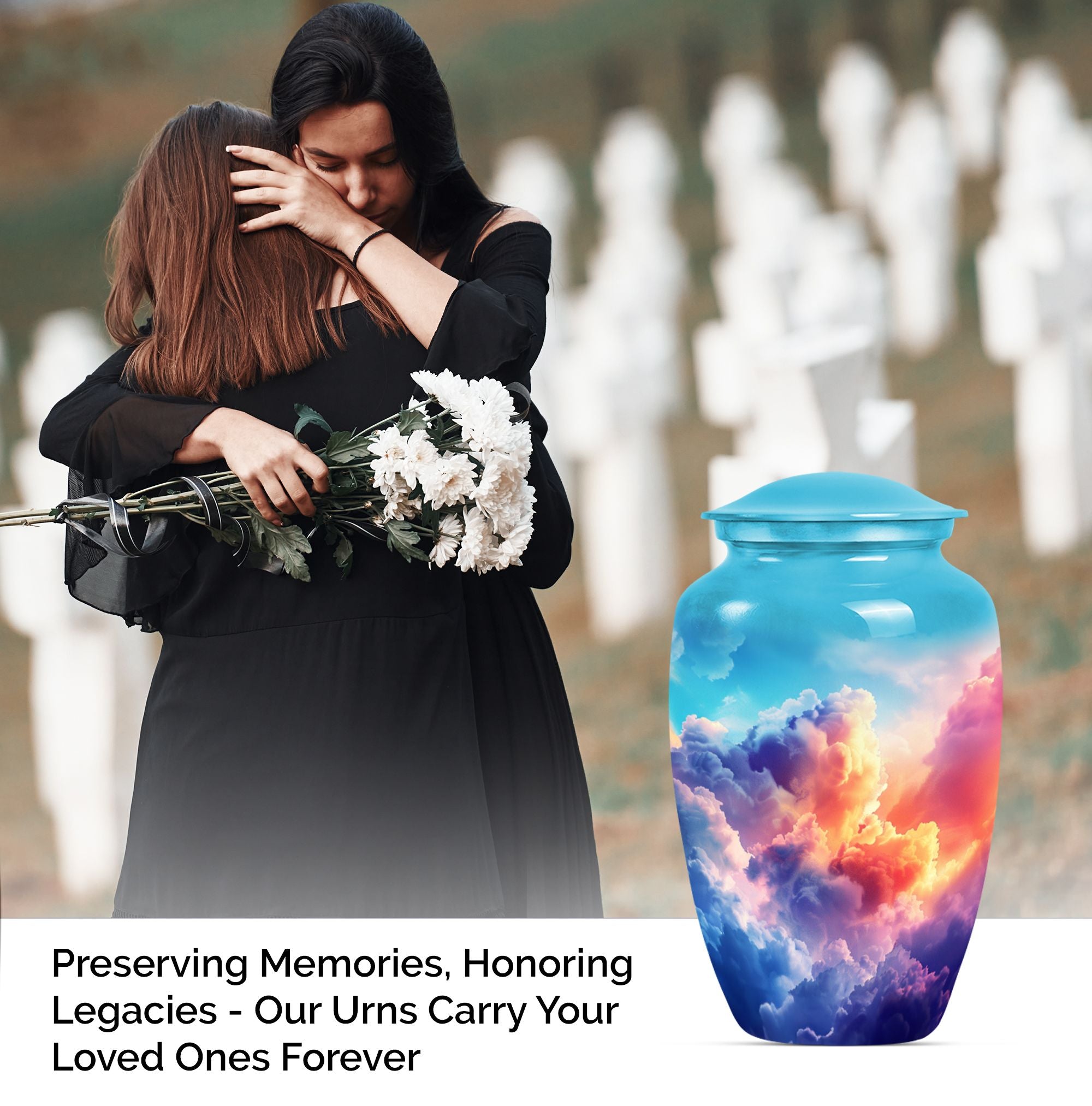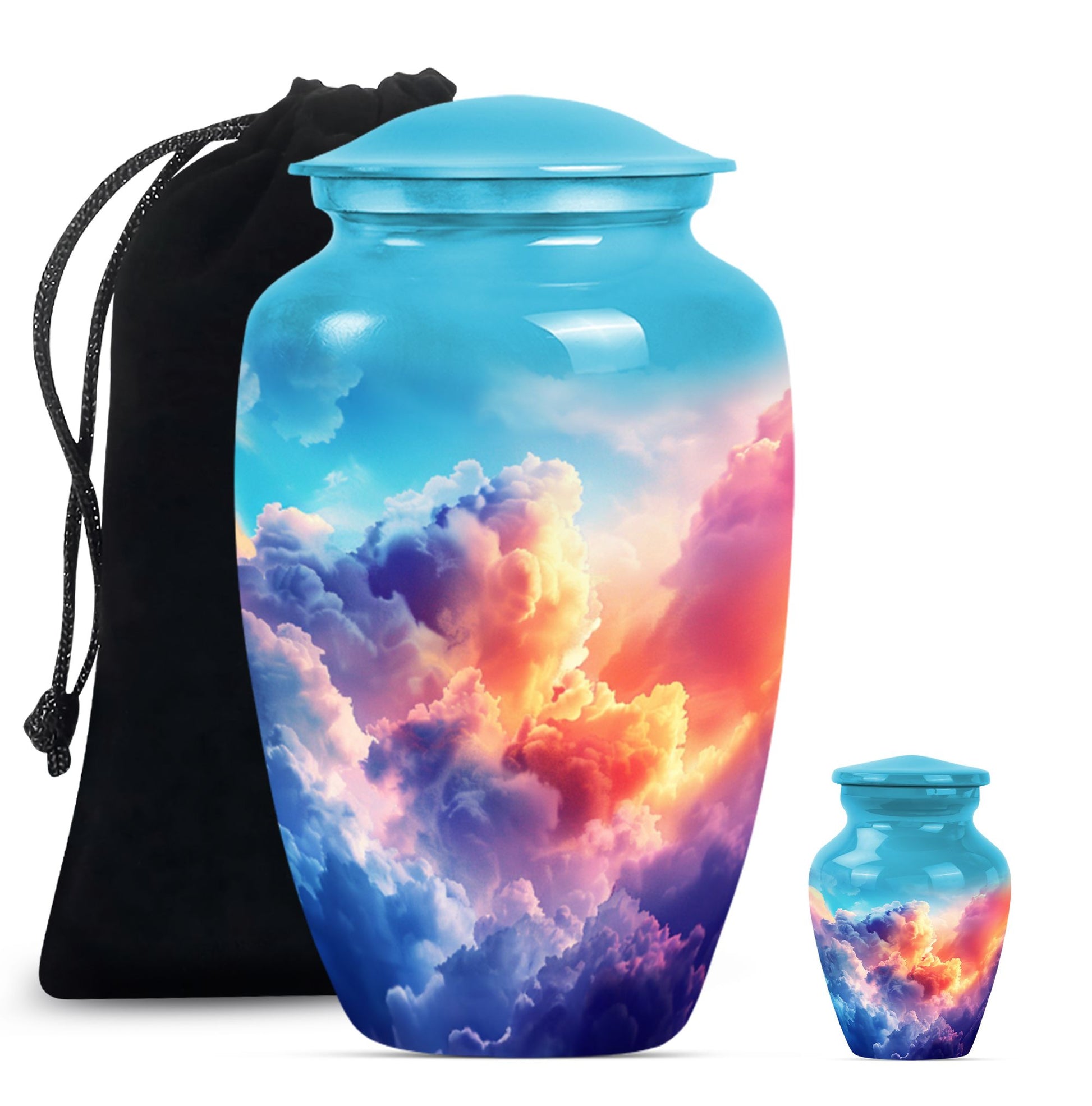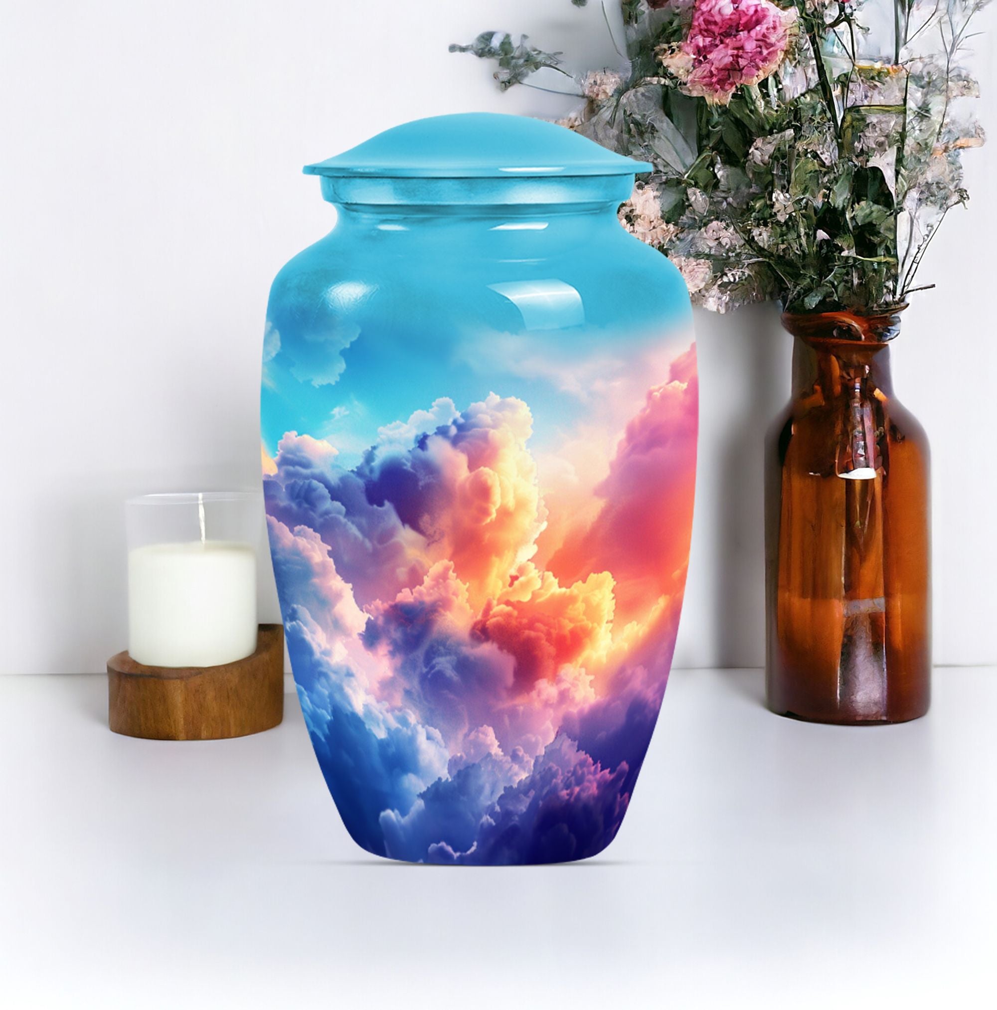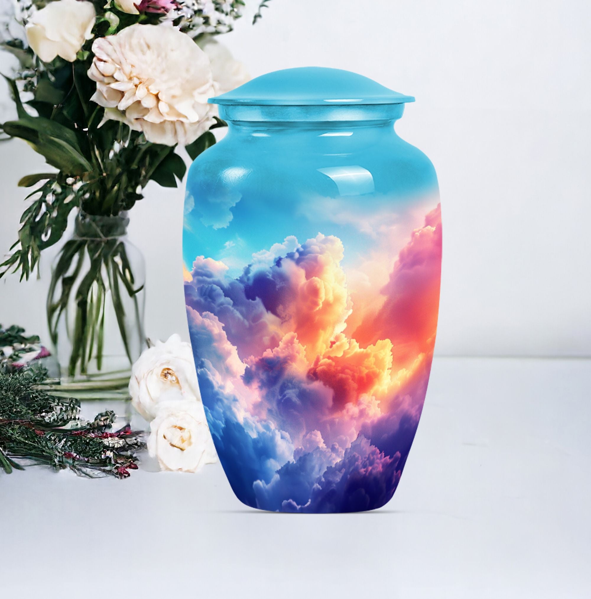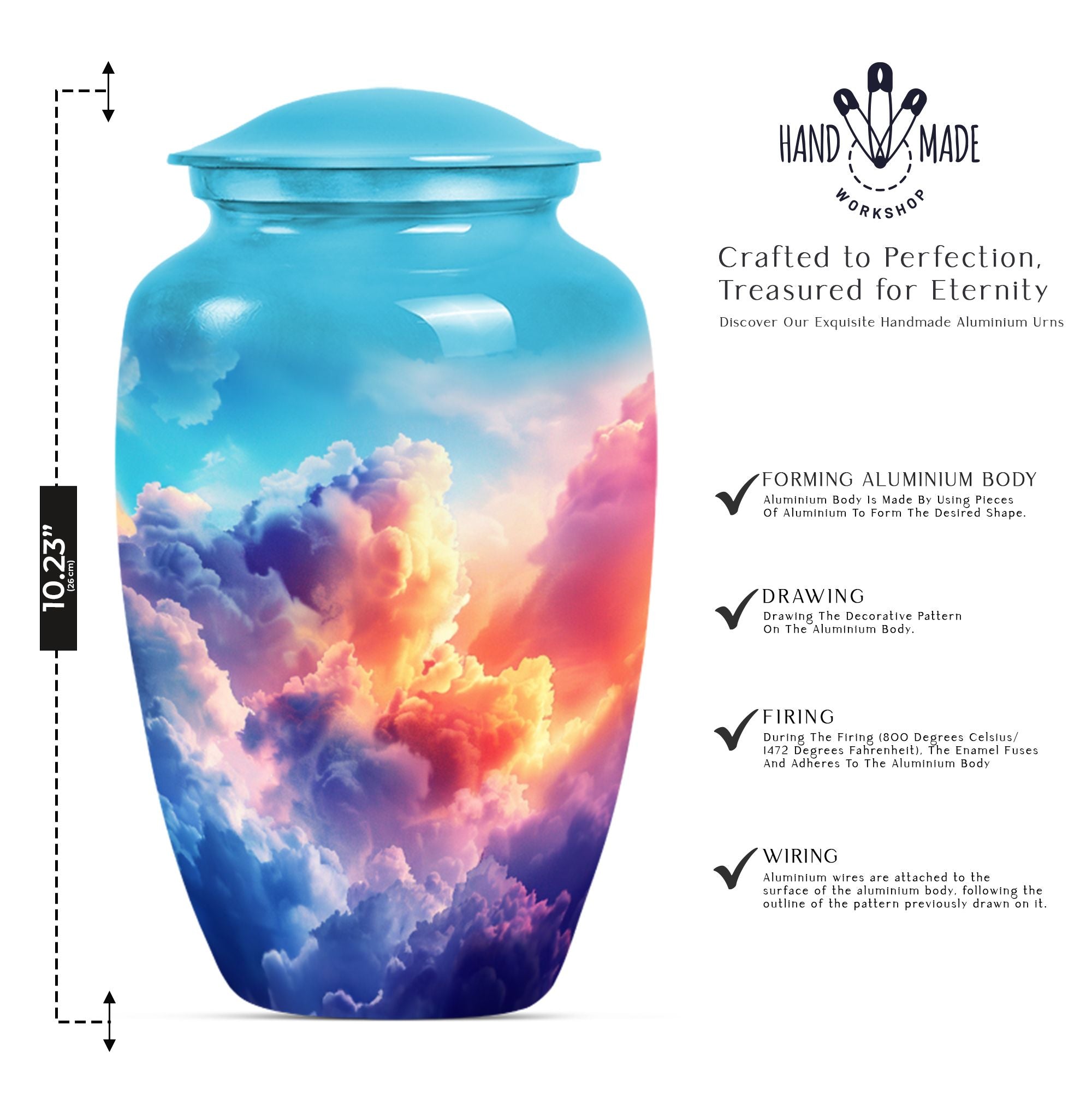 Experience the peace of mind that comes with our exquisite Butterfly Cloud Urn, specifically crafted for seniors and adults wishing to honor loved ones 'in the clouds.' Notable for its aluminum material, this larger-than-life, 10-inch memorial urn offers an impressive capacity of 200 cubic inches, sufficiently housing the ashes of an adult male. Its solid weight of 3.3 pounds exalts a sense of permanence and unyielding remembrance. The urn package renders a delicate touch to its endearing purpose with the inclusion of a velvet pouch ideally suited for the containment of ashes. To add further value, the urn accommodates customization, allowing you to personalize it with engraved names. Its profound Butterfly theme whispers messages of spiritual transformation and rebirth - a fitting tribute to the departed. A rare blend of thoughtful design and quality material, this urn also stands as an ideal choice for companion cremation. It emerges as a popular find among large urns and funeral medium size urns for human ashes. Consider our Butterfly Clouds Urn, poignant in its purpose and pleasing in its appearance.