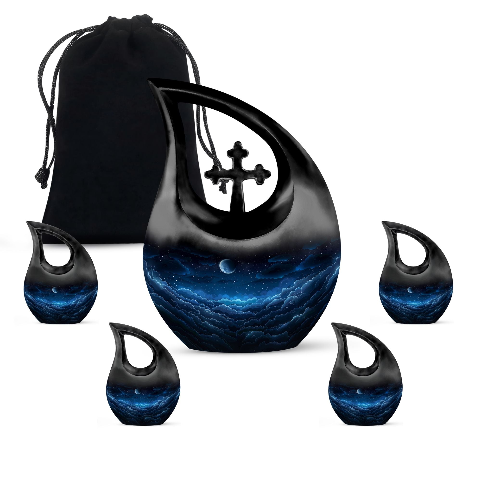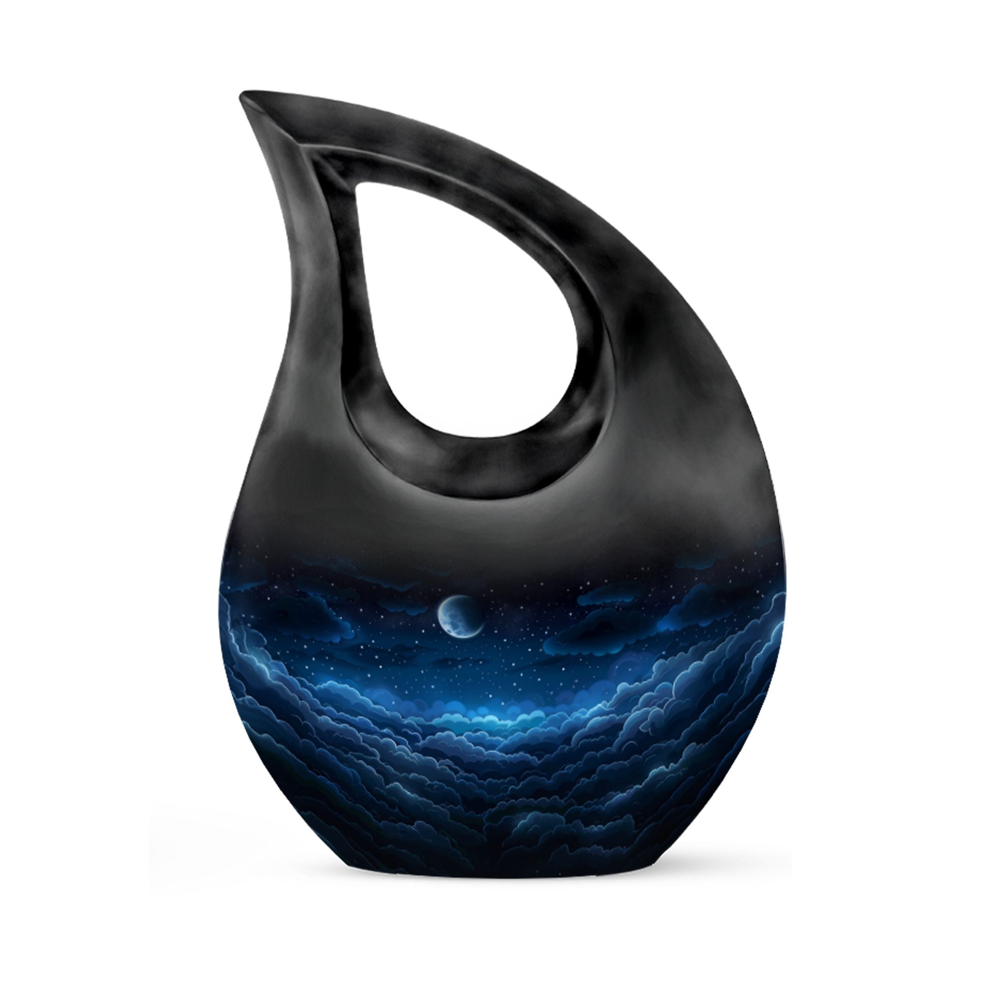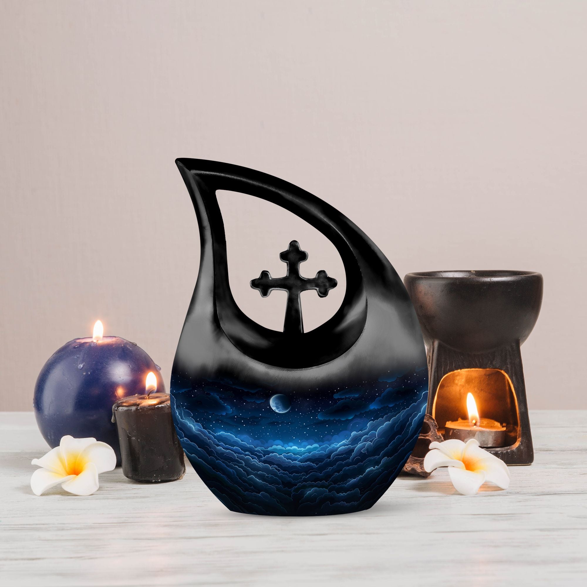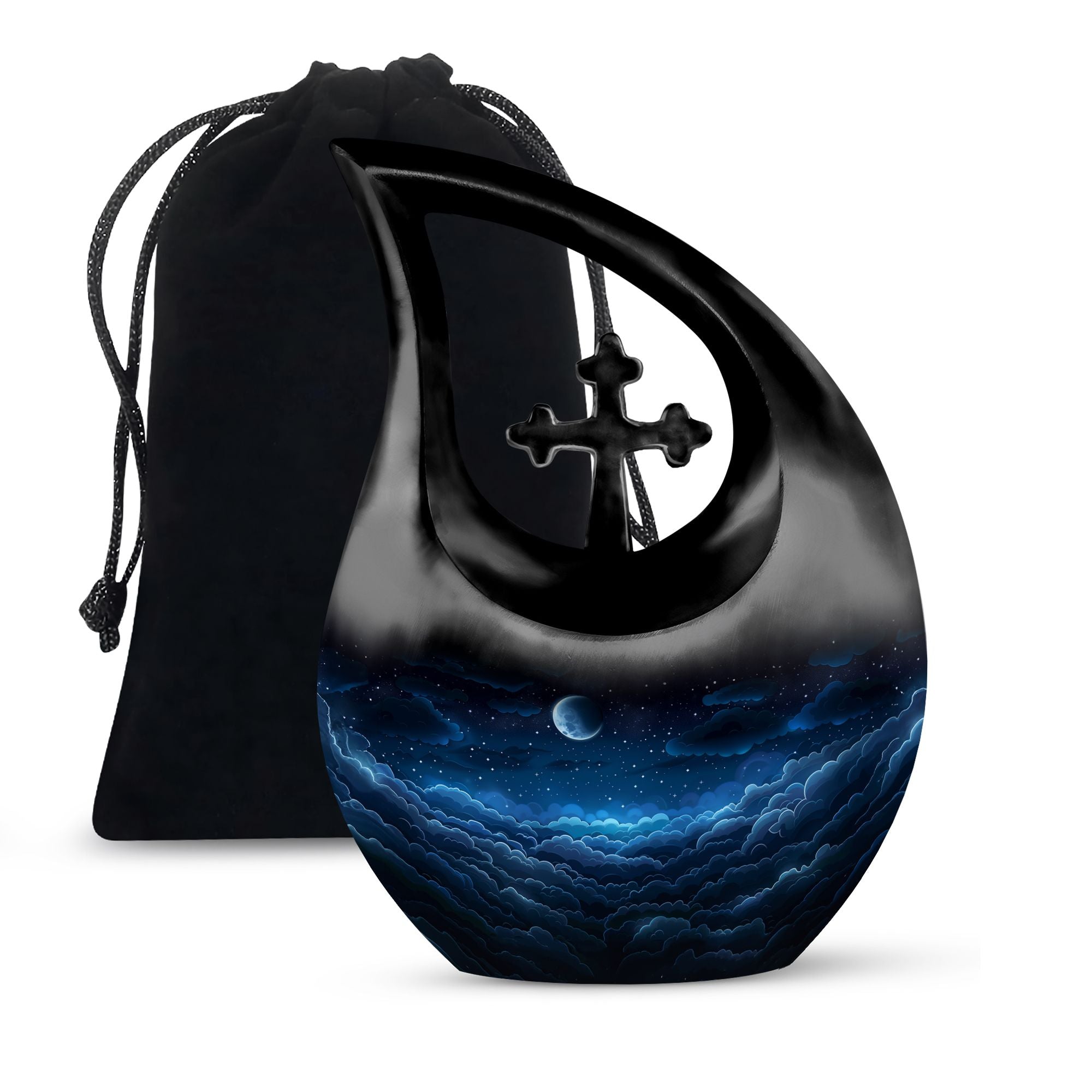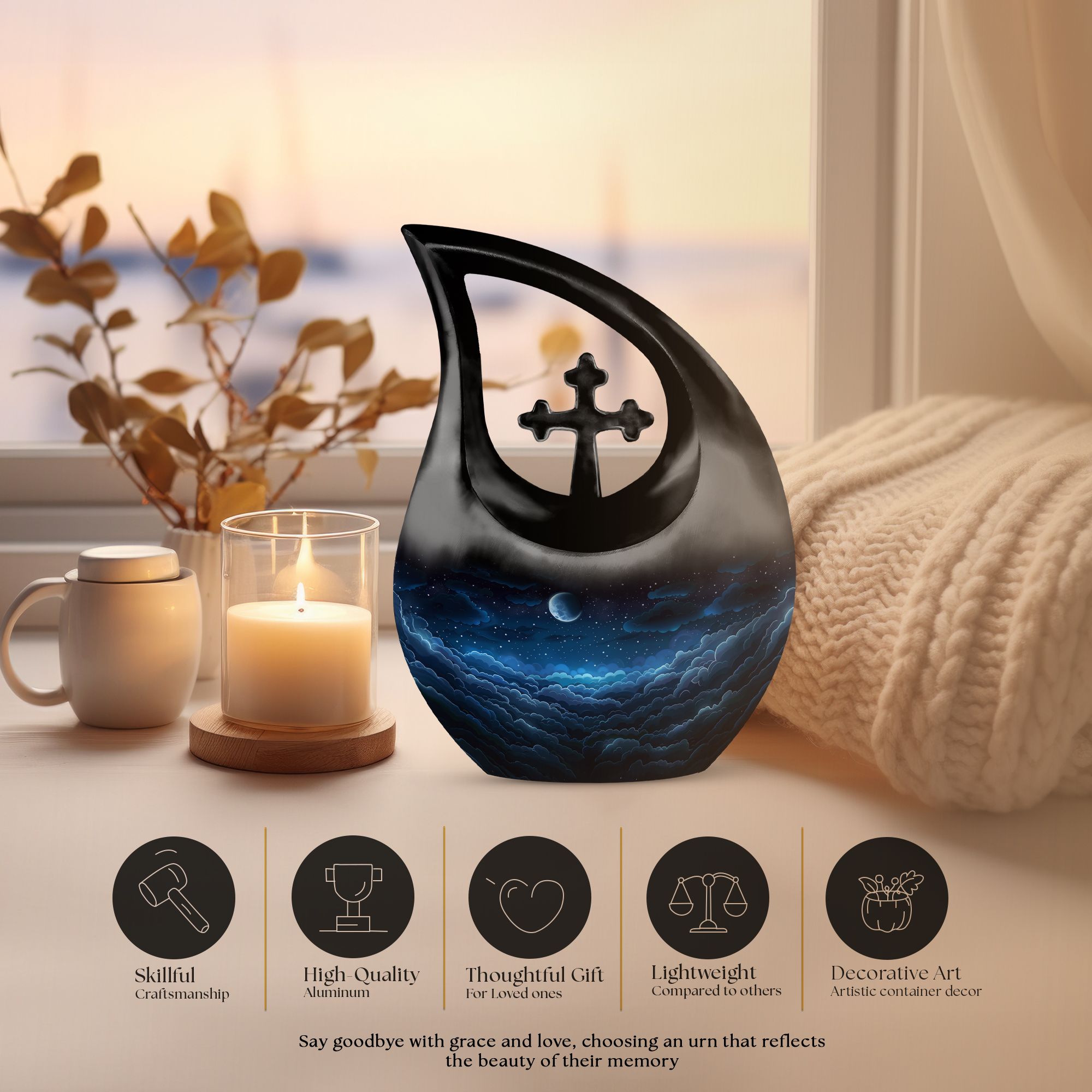 Our manifold 'Clouds Urn' beautifully intersects sentimentality with affordability, making it an exemplary choice for commemorative cremation and burial necessities. This memorial urn remarkably integrates a 'Cross Drop' theme representing faith and a tranquility-suggesting 'Cloud' ambiance. The size is considerably large, boasting a 10 inch stature and 200 cubic inch capacity, which robustly accommodates the ashes while only weighing 3.3 pounds. Meticulously sculpted from top-grade aluminium, the urn's durability provides a heartfelt keepsake for your precious memories. The urn arrives with a luscious velvet pouch, purposefully designed for the preservation of cremation ashes. Above all, our 'Clouds Urn' allows personalization. Honour your loved ones with their names engraved, adding a personal touch to an already unique piece. Keywords you can use to find us include 'Ashes Keepsake', 'Small Urns', 'Cremation Keepsakes', 'Urns for Cremation Ashes' and 'memorial urns'. This urn transcends the norm, leaving an indelible mark of remembrance.