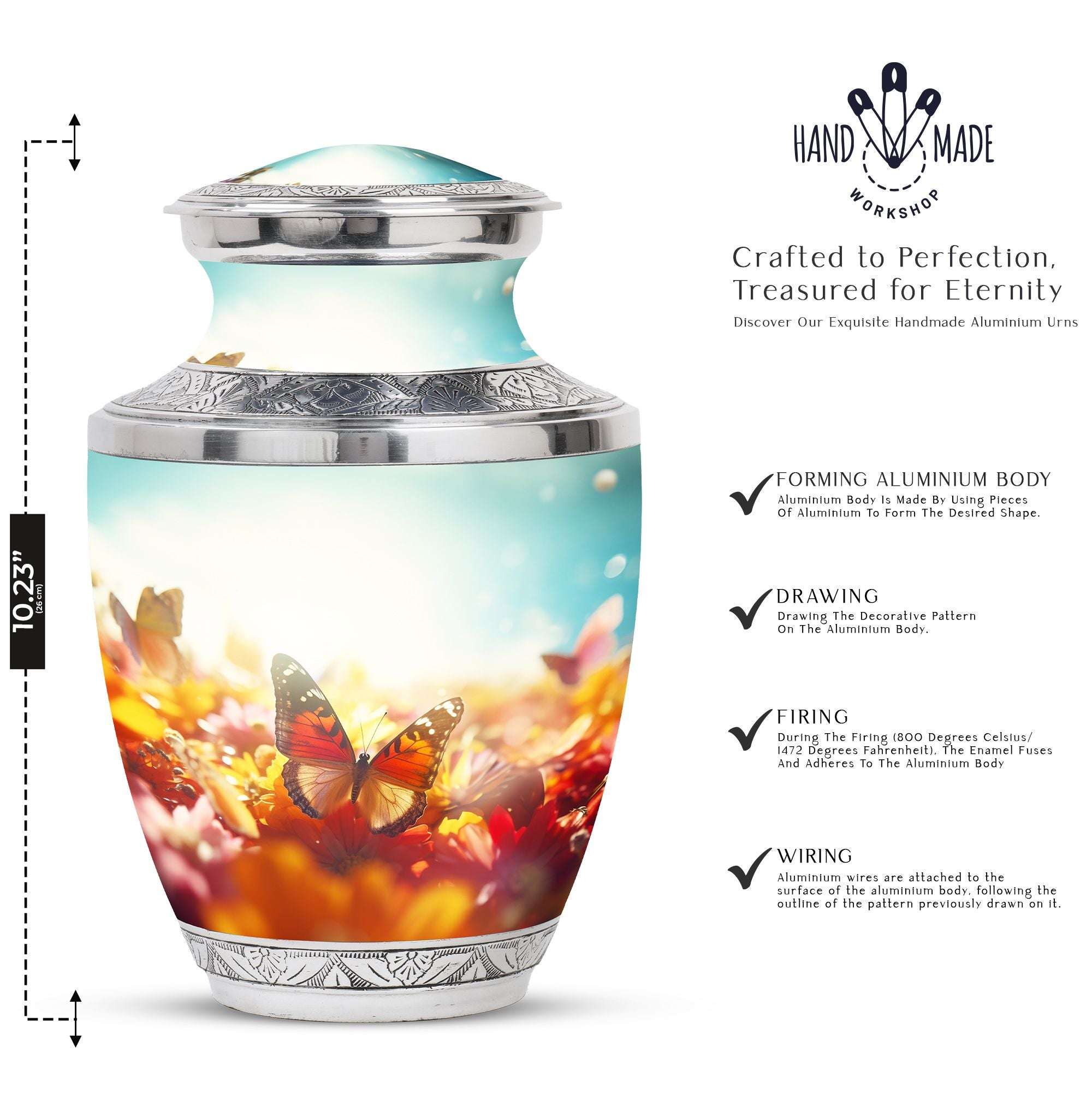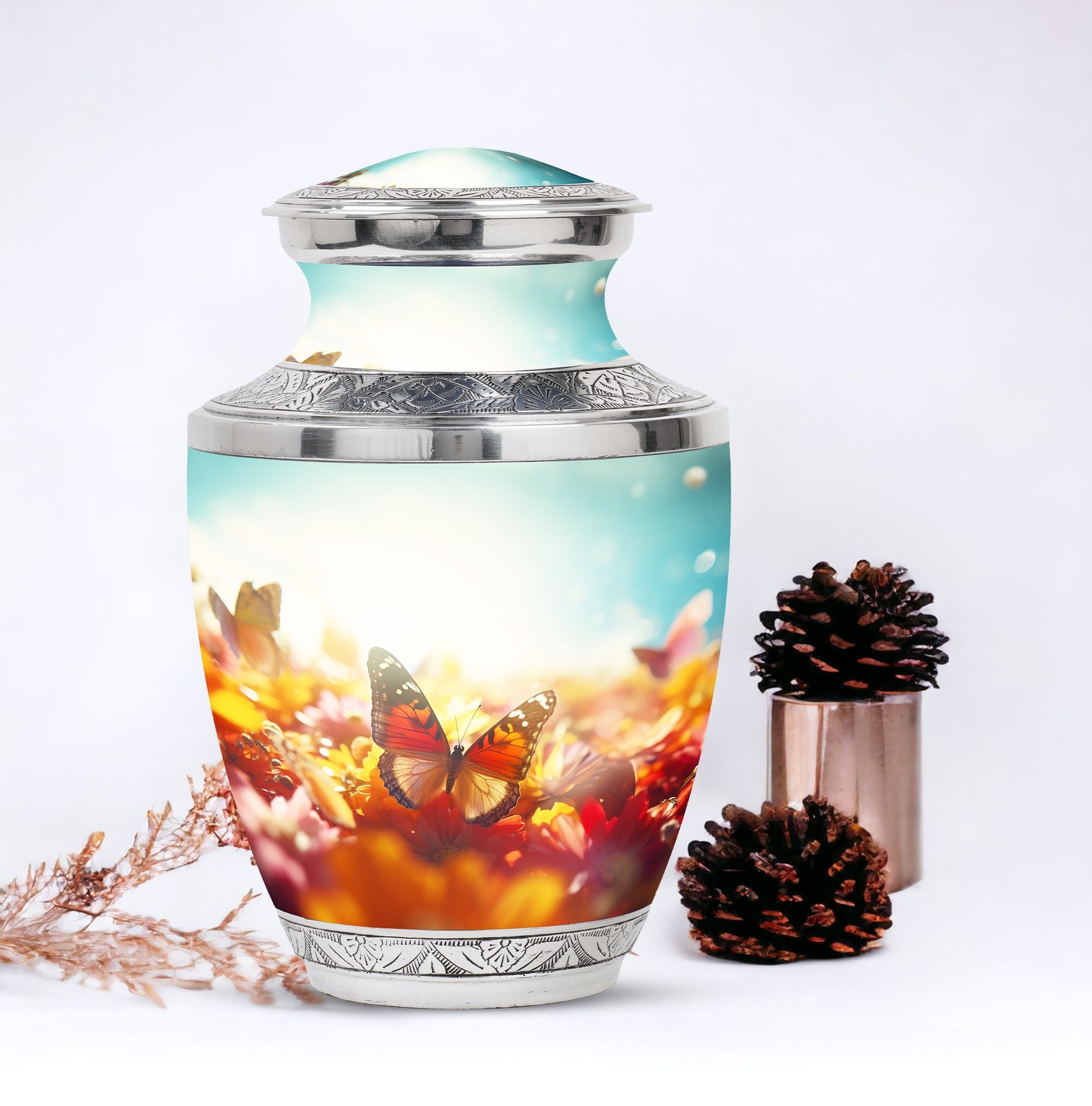 Searching for a unique, vibrant resting place for your loved ones? Our Colorful Butterflies Urn is an epitome of beauty and elegance that will surely reflect the lively persona of the departed soul. Crafted with precision and love, our Cremation Urns For Women are designed to honor the memory of the irreplaceable. This Large Urn is specifically engineered to securely hold the cremation ashes, ensuring long-lasting preservation. The urn's lively, colorful butterfly design makes a touching tribute to your departed female loved and cherished ones. Being a size suitable for adults, it could be an ideal Urn for an Adult Male Dad as well. Bearing a universal appeal, this Urn For Cremation Ashes is more than just a container, it's an expression of love, respect, and remembrance. The spectrum of colors gently reminds us of the vibrancy and joy that your loved one brought into your life.