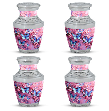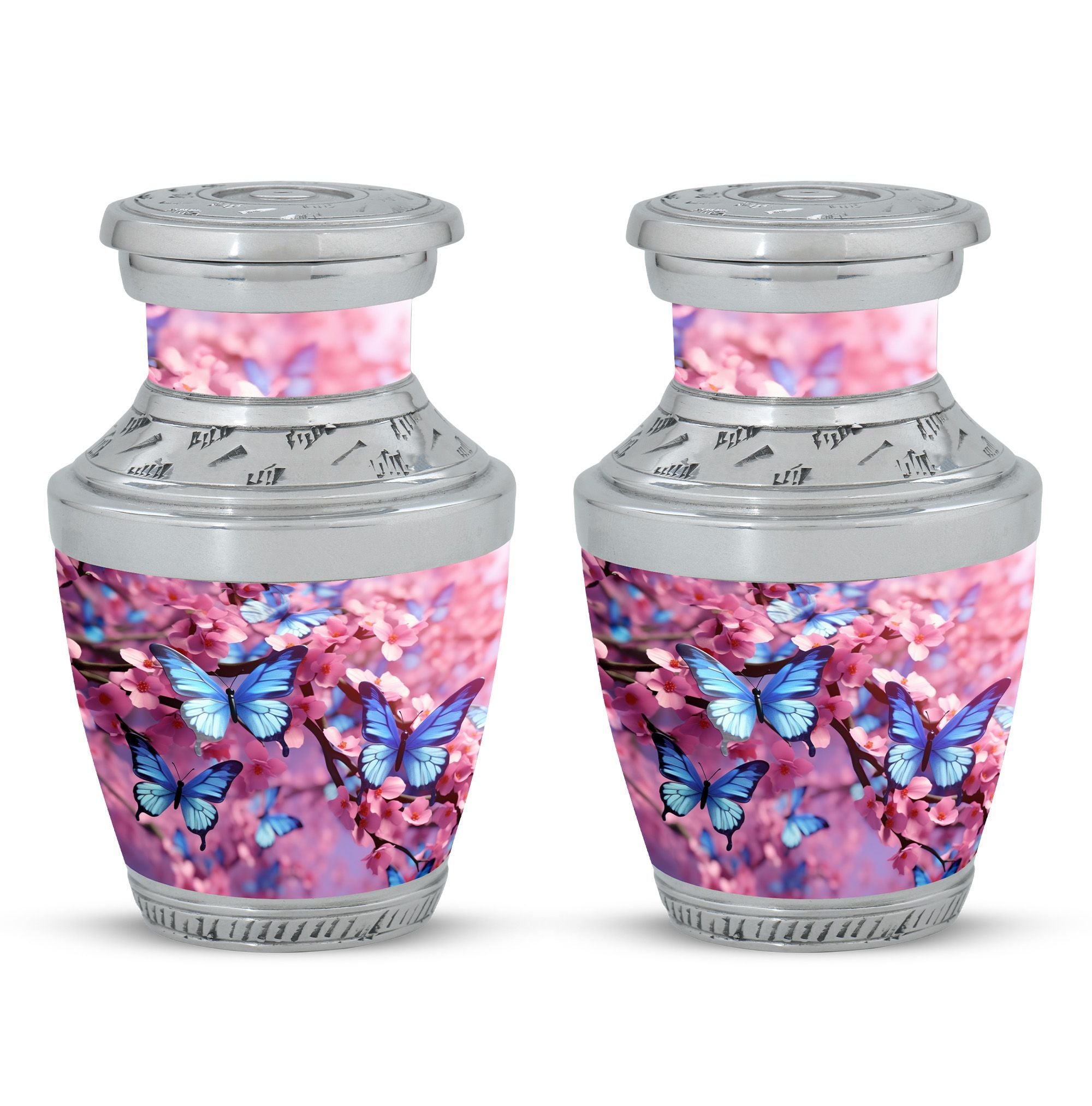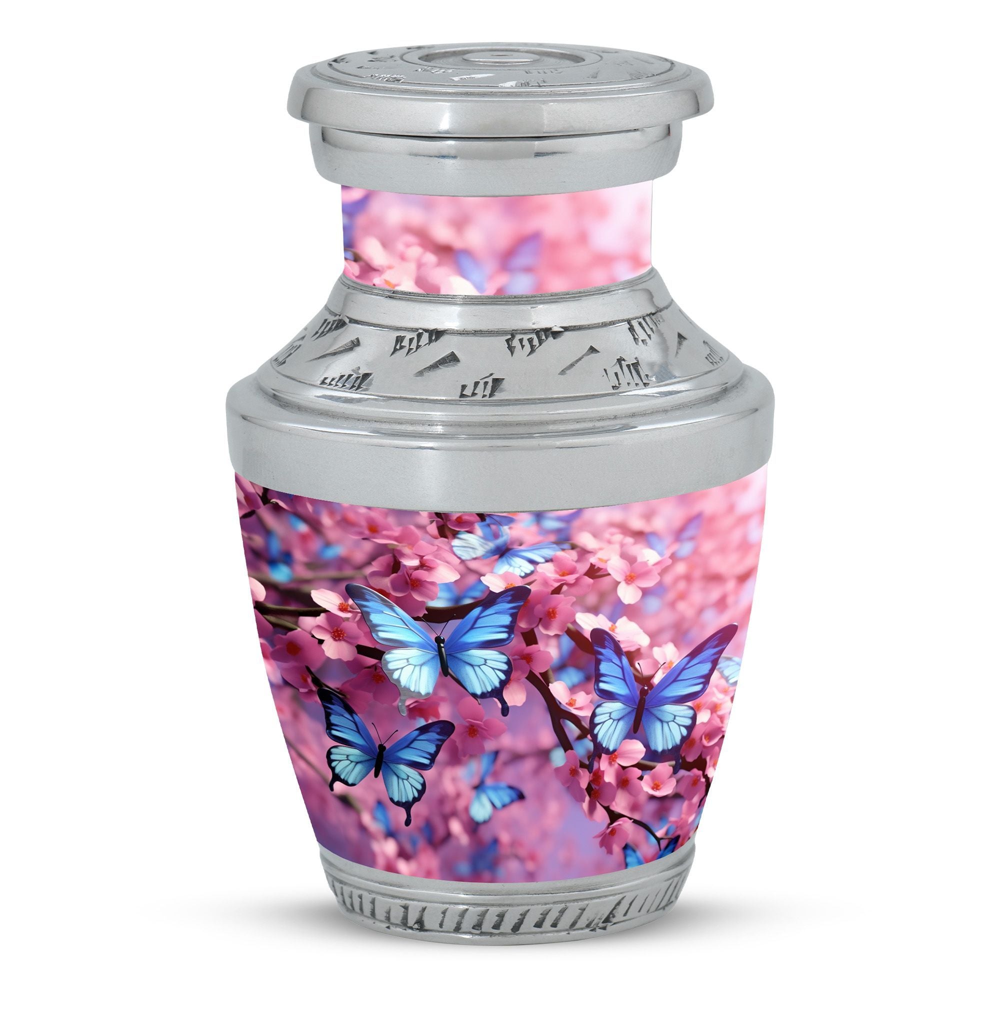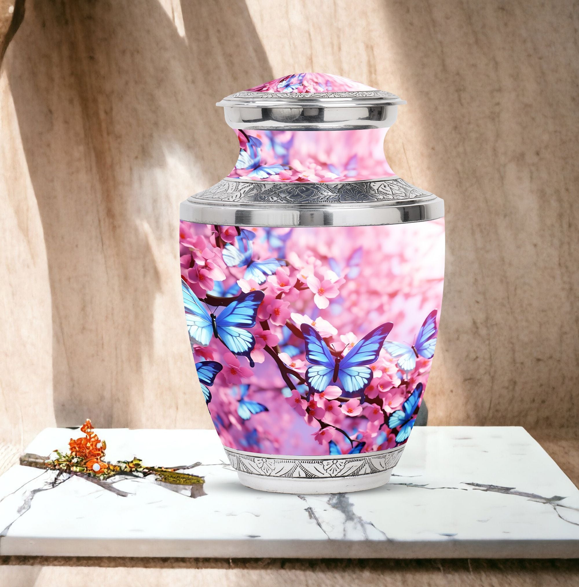 Celebrate and remember the precious life of a loved one with our Colorful Butterflies Urn - a keepsake urn of timeless beauty. Exuding a serene and classic demeanor, this aluminum-made, 3-inch large urn serves as an elegant memorial piece. Weighing a solid 3.3 pounds, it stands tall with a height of 10 inches and amply spacious with a capacity of 200 cubic inches to securely contain the ashes. The urn comes with a delicate velvet pouch, adding more convenience and a touch of class to this cremation urn. Making it unique, we offer customization options where you can personalize this decorative urn for human ashes by engraving names on it. The Colorful Butterflies Urn, perfect for burial ceremonies, is also an adept choice among other Urns for Dad or any beloved family members. With its modern design, it represents a transformative journey, much like the lifecycle of a butterfly.