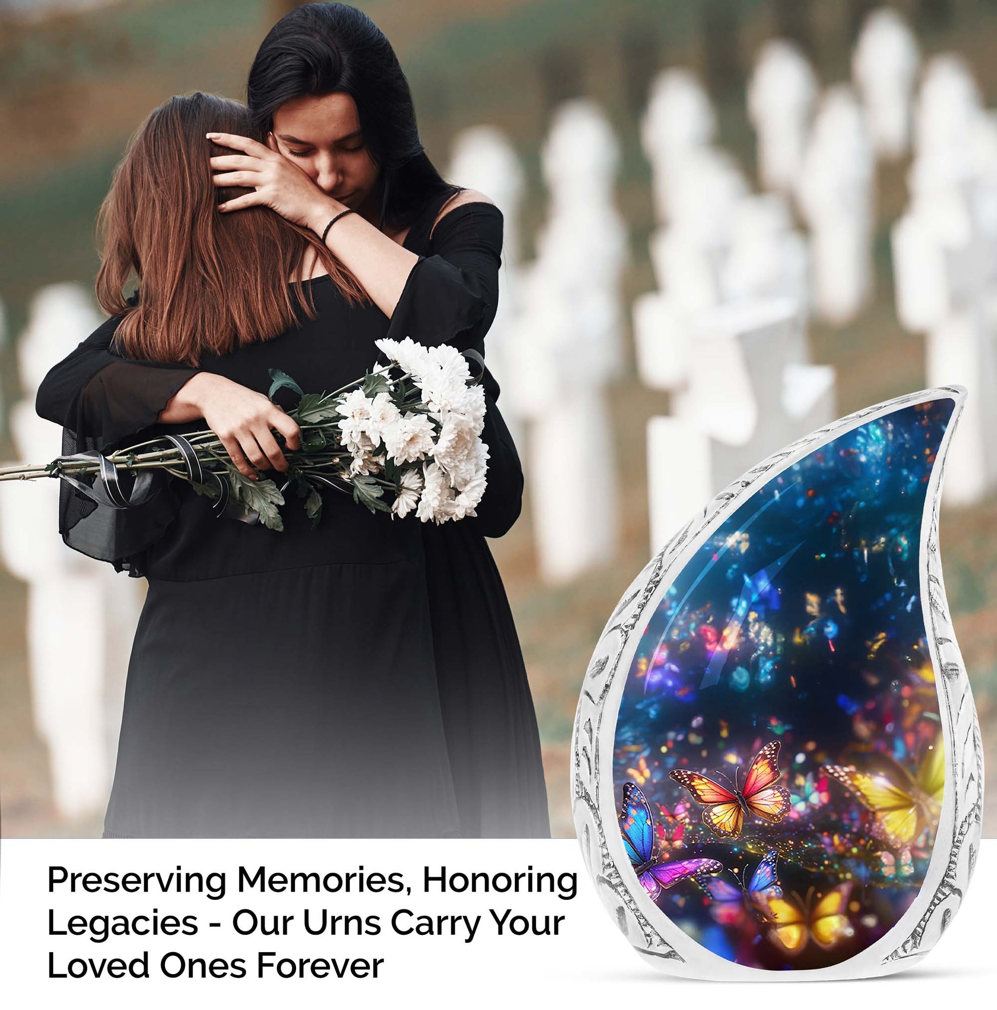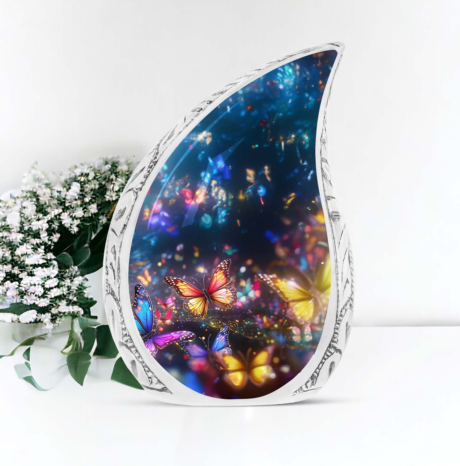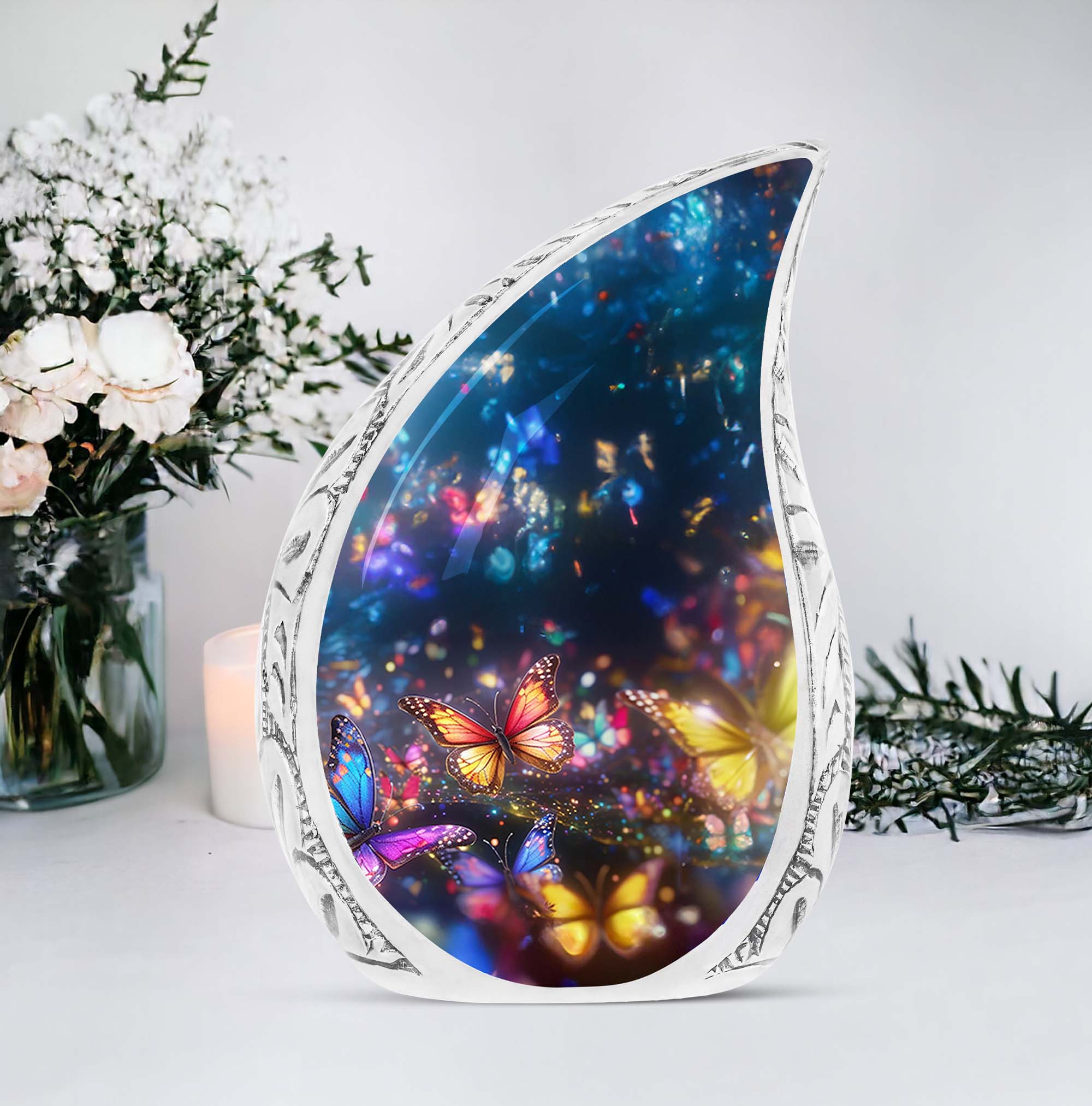 Experience tranquility and peace with our 'Colorful Butterflies On A Magical Forest, Urns For Adults'. This exceptional piece under our Butterfly Urns collection, is a harmonic blend of color, purpose, and solace. Designed as Large Urns, they offer ample space to honor and remember the ones we hold dear. The urn exhibits the flight of vibrant butterflies amidst an enchanting, magical forest, symbolizing an eternal journey into the ethereal paradise. As 'Urns For Ashes', they hold a significant role in memorial ceremonies, serving as a lasting tribute to a precious life. Particularly sought-after 'Urns For Ashes Adult Female', they encapsulate the design's softness and strength. These Urns For Burial are much more than a cremation urn; they are a form of art that brings peace, comfort, and solace during challenging times. The design, while being distinctively unique, respects the conventions and sacredness of the ceremonies. Create a forever resting place for your loved one with our urns, a sanctuary as unique as their life journey.