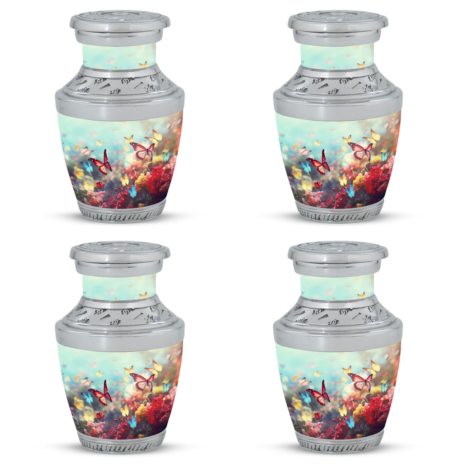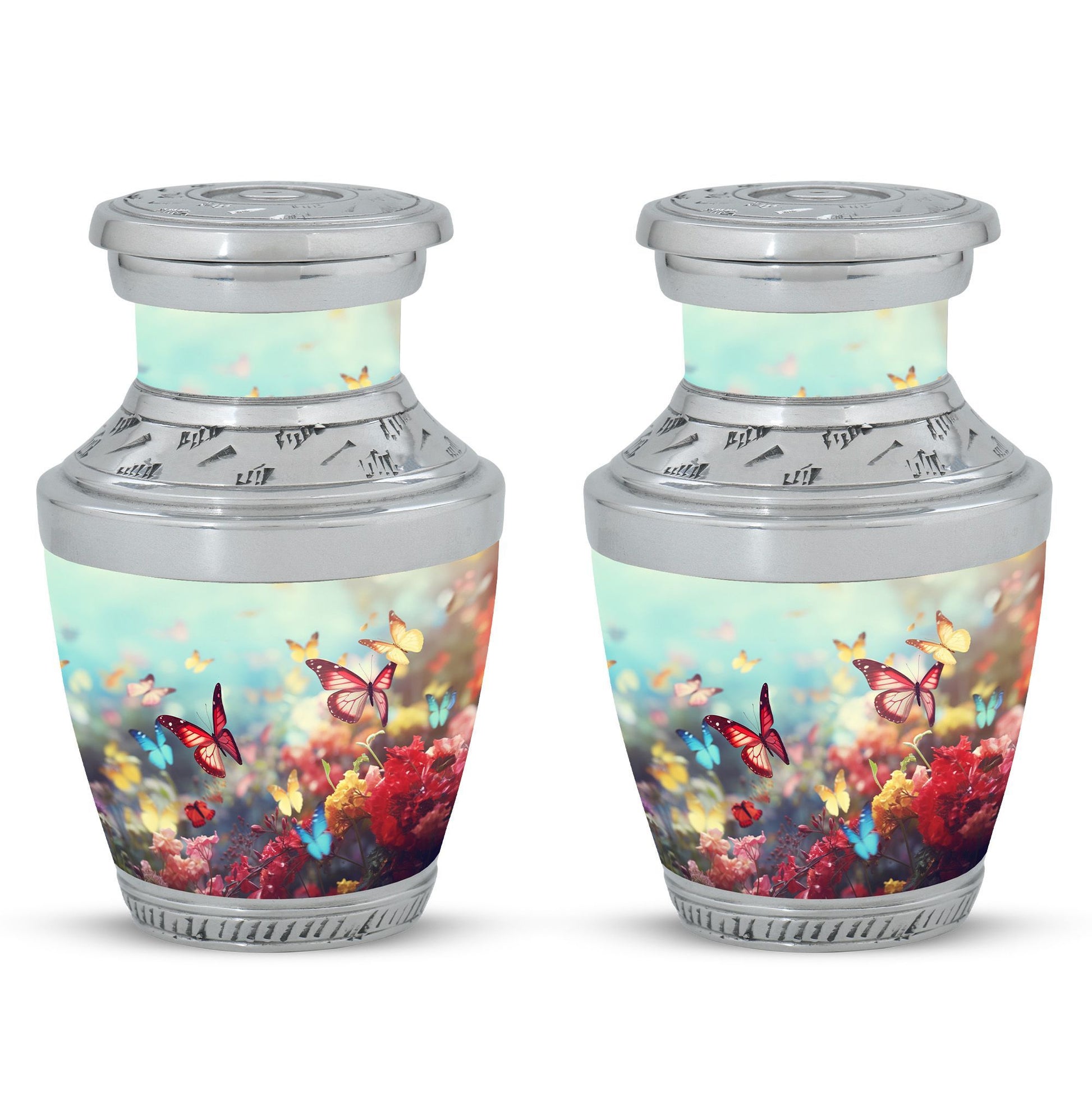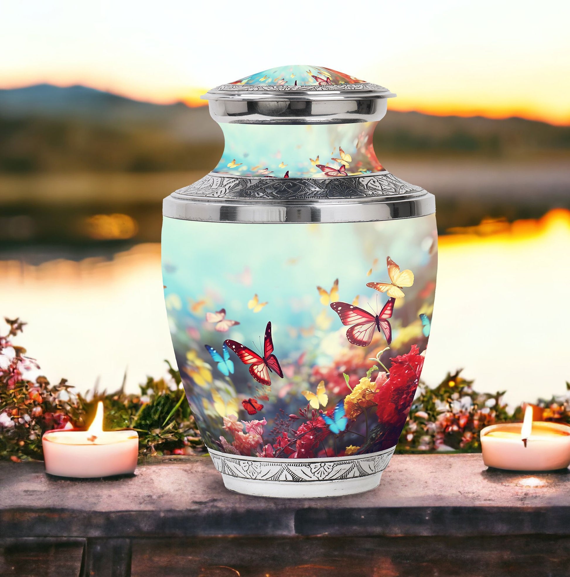 Presenting our elegant 'Colorful Butterflies Urns for Human Ashes' — a beautiful tribute to a life filled with love and memories. Our 3-inch Large Urn is handcrafted from high-quality Aluminium to create an exquisite final resting place for your loved ones. With a weight of 3.3 pounds and dimensions of 10 inches in height, this compact Cremation Urn gracefully encapsulates up to 200 cubic inches of ashes. Enhancing its uniqueness, you can choose to personalize it with engraved names, making it an endearing one-of-a-kind reminder. This classic urn is easy to carry or place at your desired location, with a complimentary velvet pouch added for containment and protection of the ashes. These Burial Urns for Ashes, including the Ashes Holder, are diligently crafted to meet your highest expectations during such sensitive times. Honor your loved ones and carry forward their legacy with our 'Colorful Butterflies Urns'.