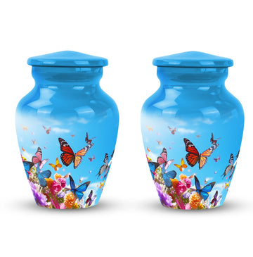 Cherish the memories of your loved ones with our Colorful Butterfly Urn, a perfect symbol of eternal life and transformation. Each urn is large, weighing 3.3 pounds, and stands 10 inches tall, with a spacious capacity of 200 cubic inches for the preservation of ashes. This elegant and durable memorial urn is meticulously crafted from robust aluminum for longevity. Our urns are presented tastefully, arriving with a velvet pouch for the safe containment of human remains. With the option to personalize with engraved names, our custom urns will create a unique, everlasting tribute to your loved one. These 3-inch personalized urns cater to both aesthetic appeal and the profound sense of honoring a loved one's memory. Our diverse keywords selection consists of 'Colorful Butterfly Urn', 'Custom Urns', 'Memorial Urns for Ashes', 'Personalized Urns for Human Ashes', 'Metal Cremation Urns', and 'Urns for Human Remains'. These carefully chosen phrases encompass the main features of our product and will help to ensure this beautiful urn is easily discovered by those seeking solace during this difficult time. Note that our listings cater to the English-speaking audiences.