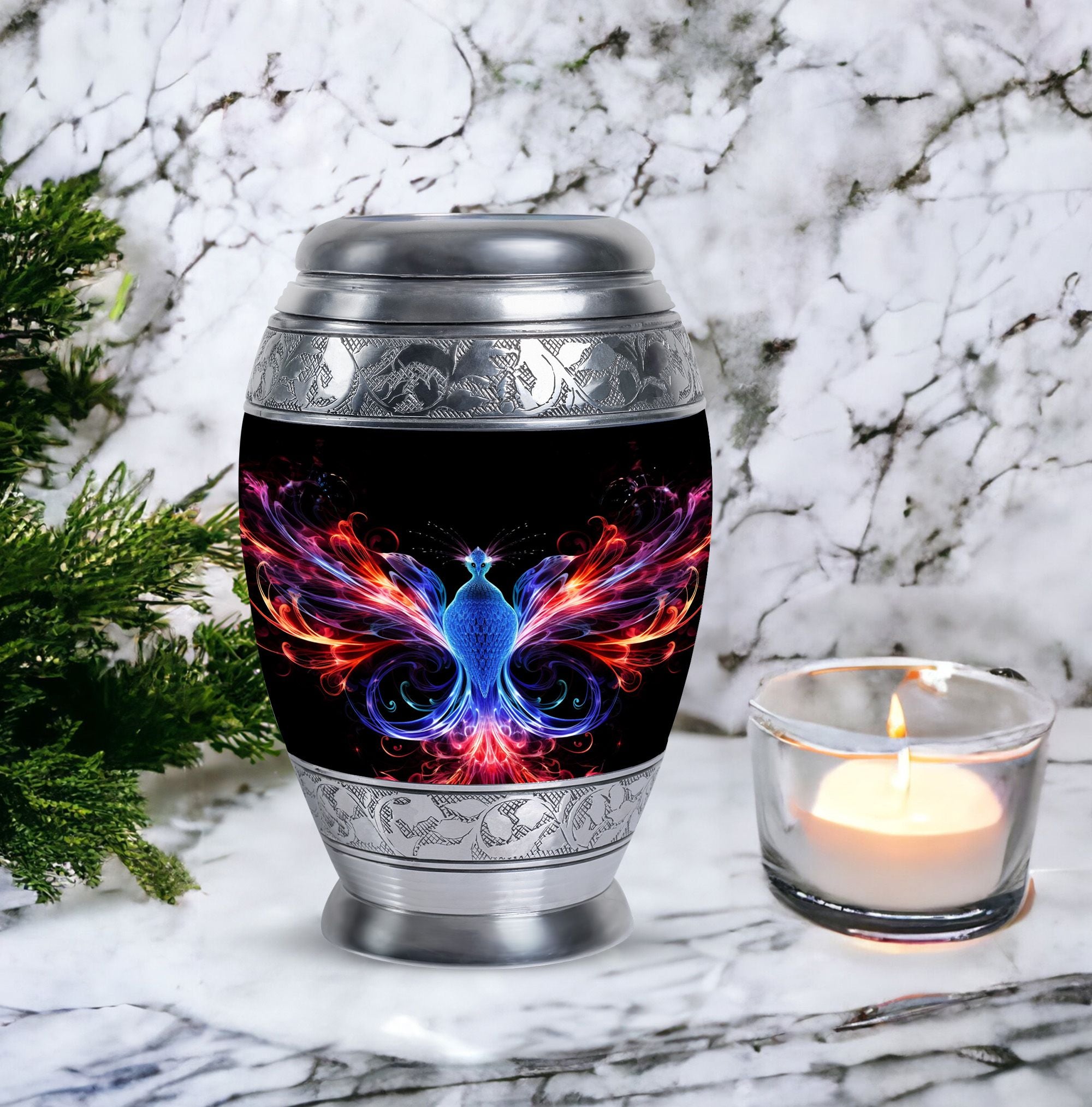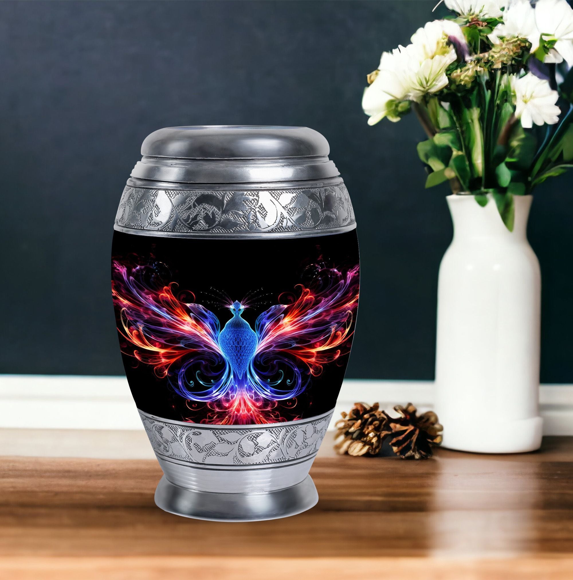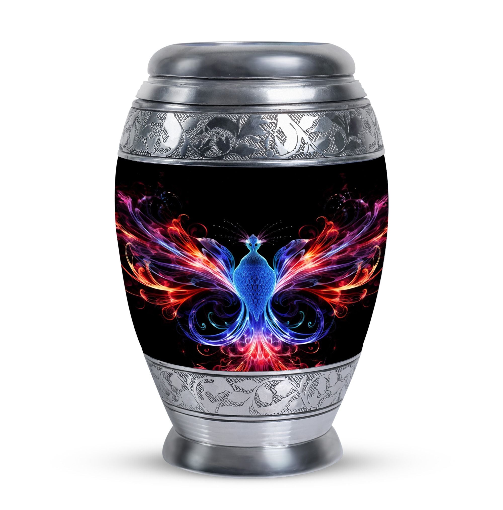 Experience the enduring comfort and warmth imparted by our colorfull phoenix urns for human ashes. Expertly crafted from sturdy aluminium, this cremation urn for adults strikes a harmonious balance between strength and elegance. Standing at 10 inches tall, with a weight of 3.3 pounds, this large urn is designed to preserve the cherished memory of your loved ones. It possesses a capacity of 200 cubic inches, ample enough to accommodate the ashes comfortably. This classic urn comes with a luxurious, soft velvet pouch for storing the ashes with the utmost dignity. The ultimate feature that sets our product apart is the provision for personalization. Create a loving remembrance by engraving names onto the urn. This burial urn provides a fitting homage to your dearly departed. Uncover an enduring symbol of love and respect with our beautifully crafted and personalised urns. Note: This product does not allow for any 'Design' amendments as it comes with a predetermined 'classic urn' style.