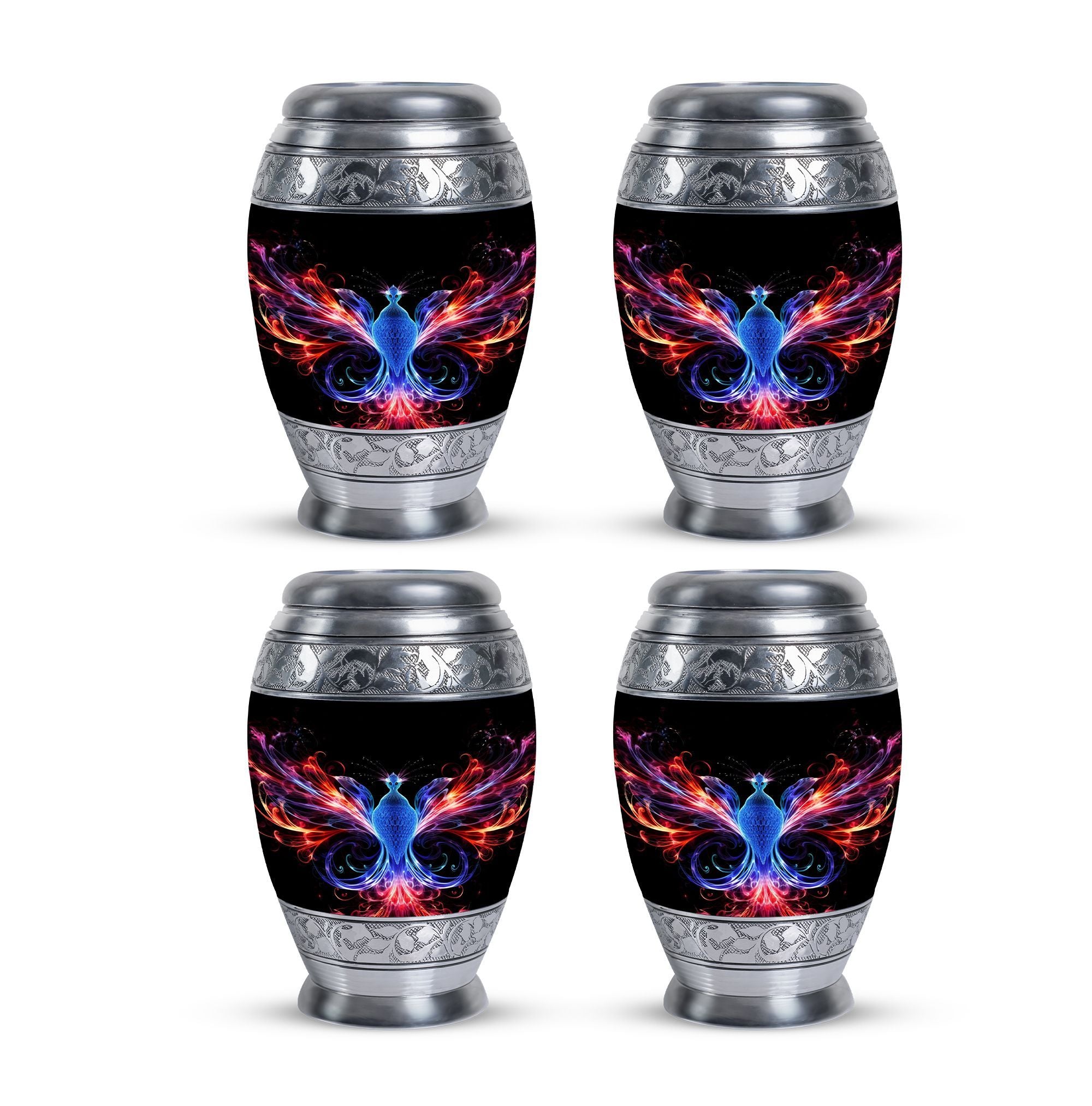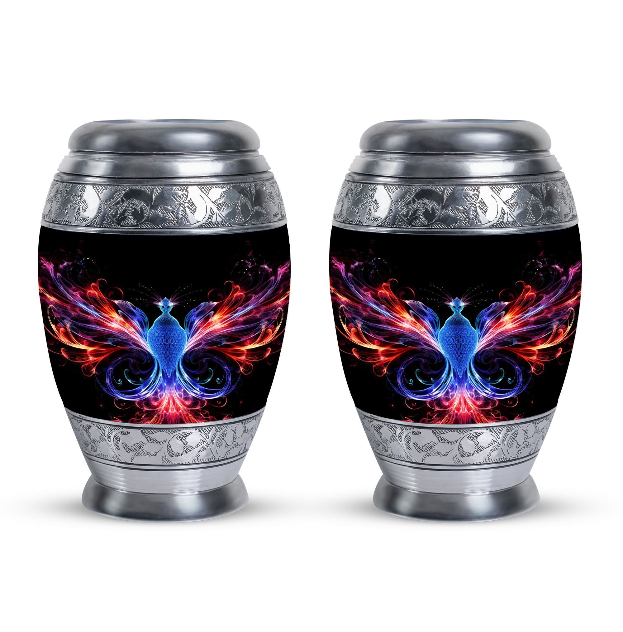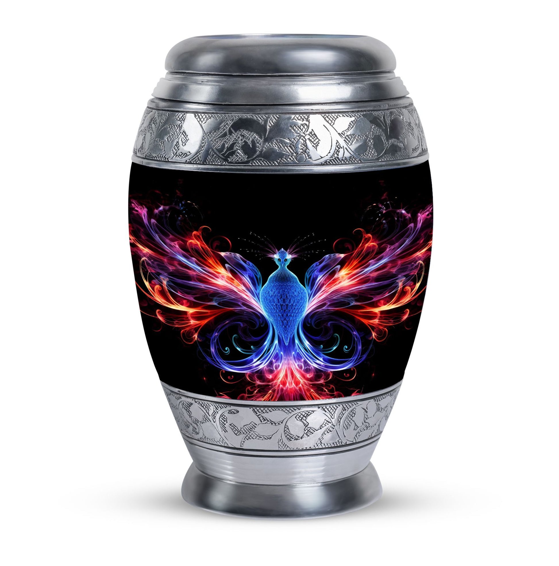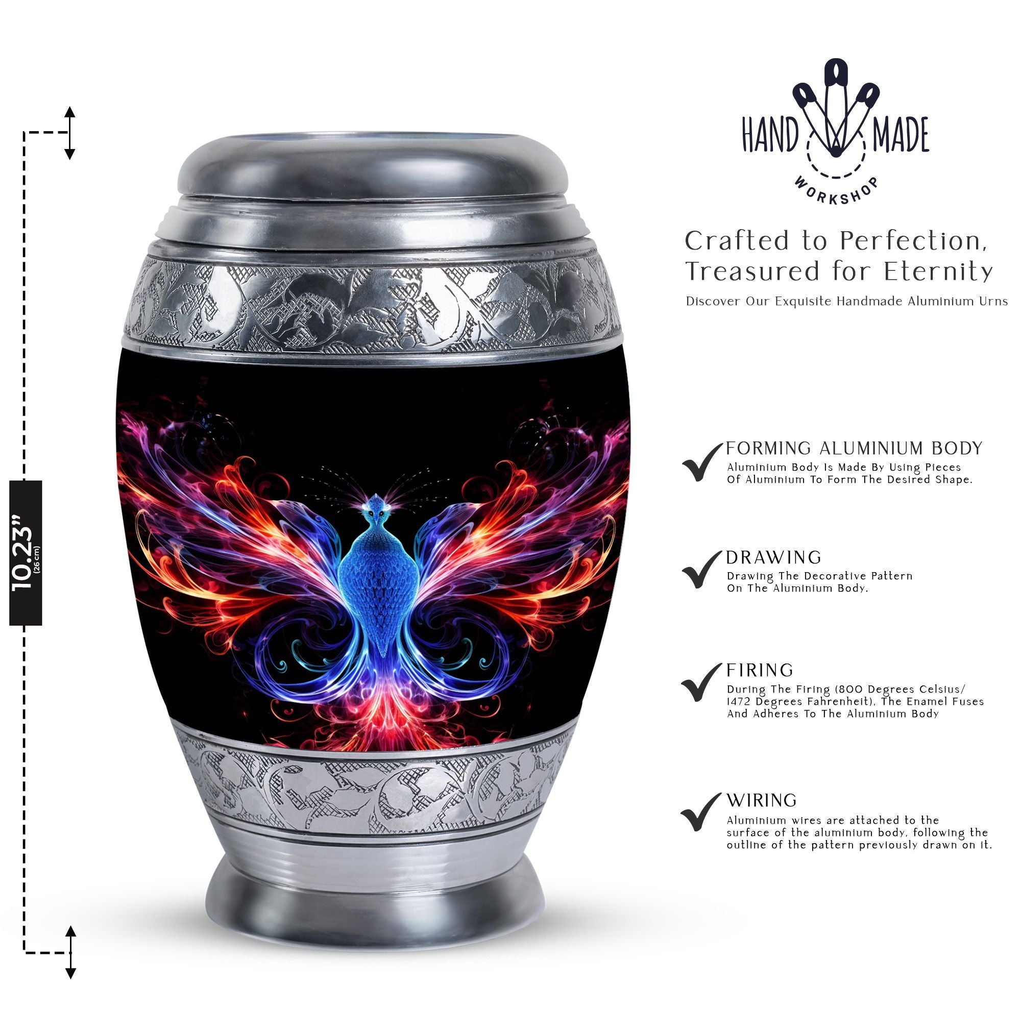 Experience the enduring comfort and warmth imparted by our colorfull phoenix urns for human ashes. Expertly crafted from sturdy aluminium, this cremation urn for adults strikes a harmonious balance between strength and elegance. Standing at 10 inches tall, with a weight of 3.3 pounds, this large urn is designed to preserve the cherished memory of your loved ones. It possesses a capacity of 200 cubic inches, ample enough to accommodate the ashes comfortably. This classic urn comes with a luxurious, soft velvet pouch for storing the ashes with the utmost dignity. The ultimate feature that sets our product apart is the provision for personalization. Create a loving remembrance by engraving names onto the urn. This burial urn provides a fitting homage to your dearly departed. Uncover an enduring symbol of love and respect with our beautifully crafted and personalised urns. Note: This product does not allow for any 'Design' amendments as it comes with a predetermined 'classic urn' style.