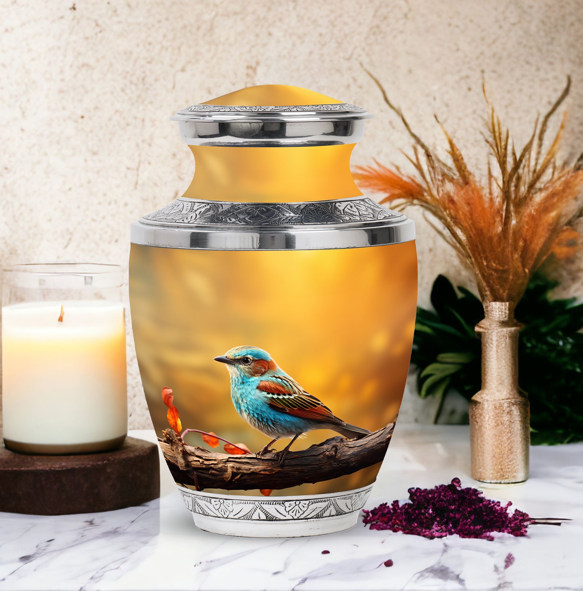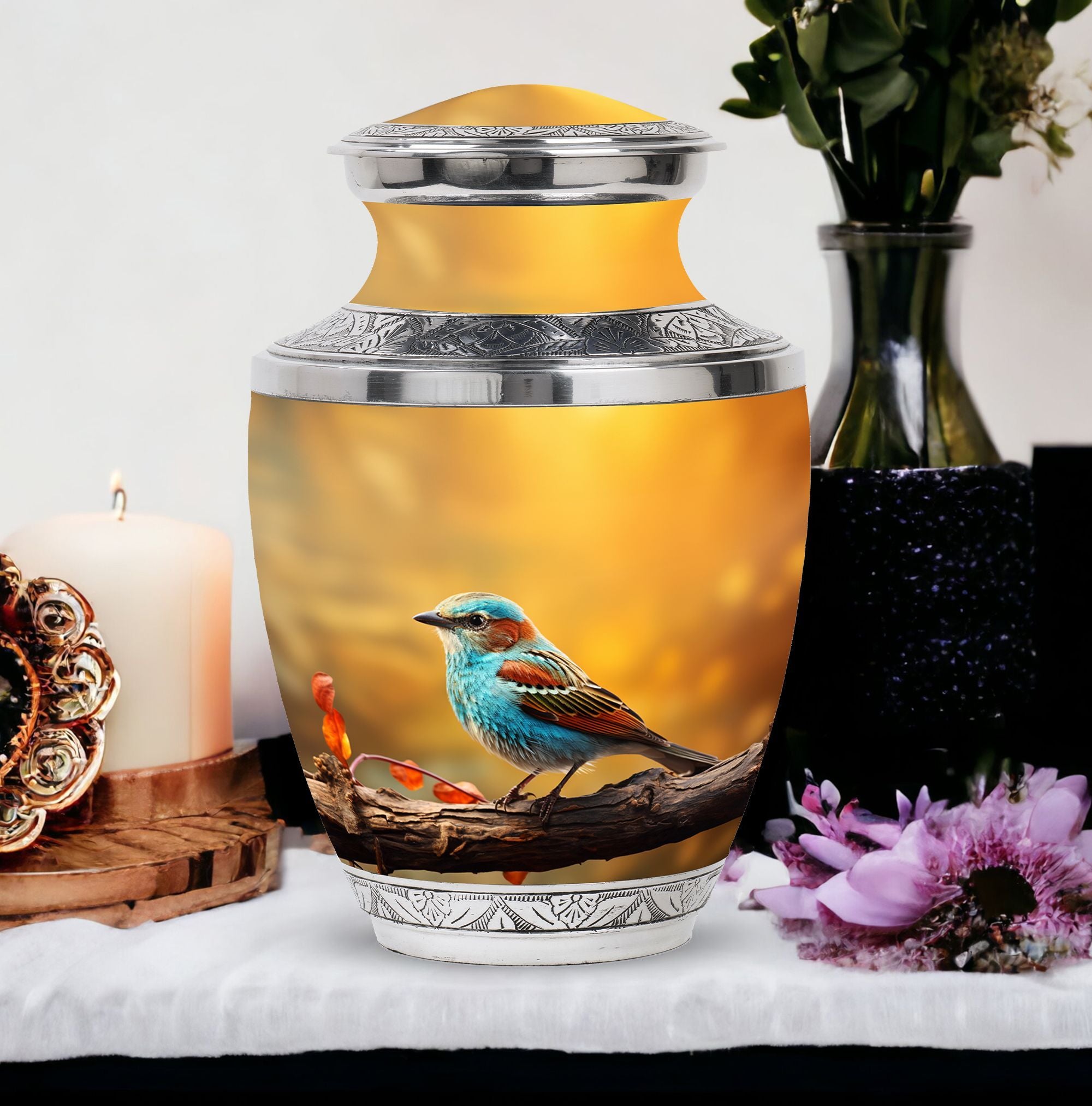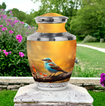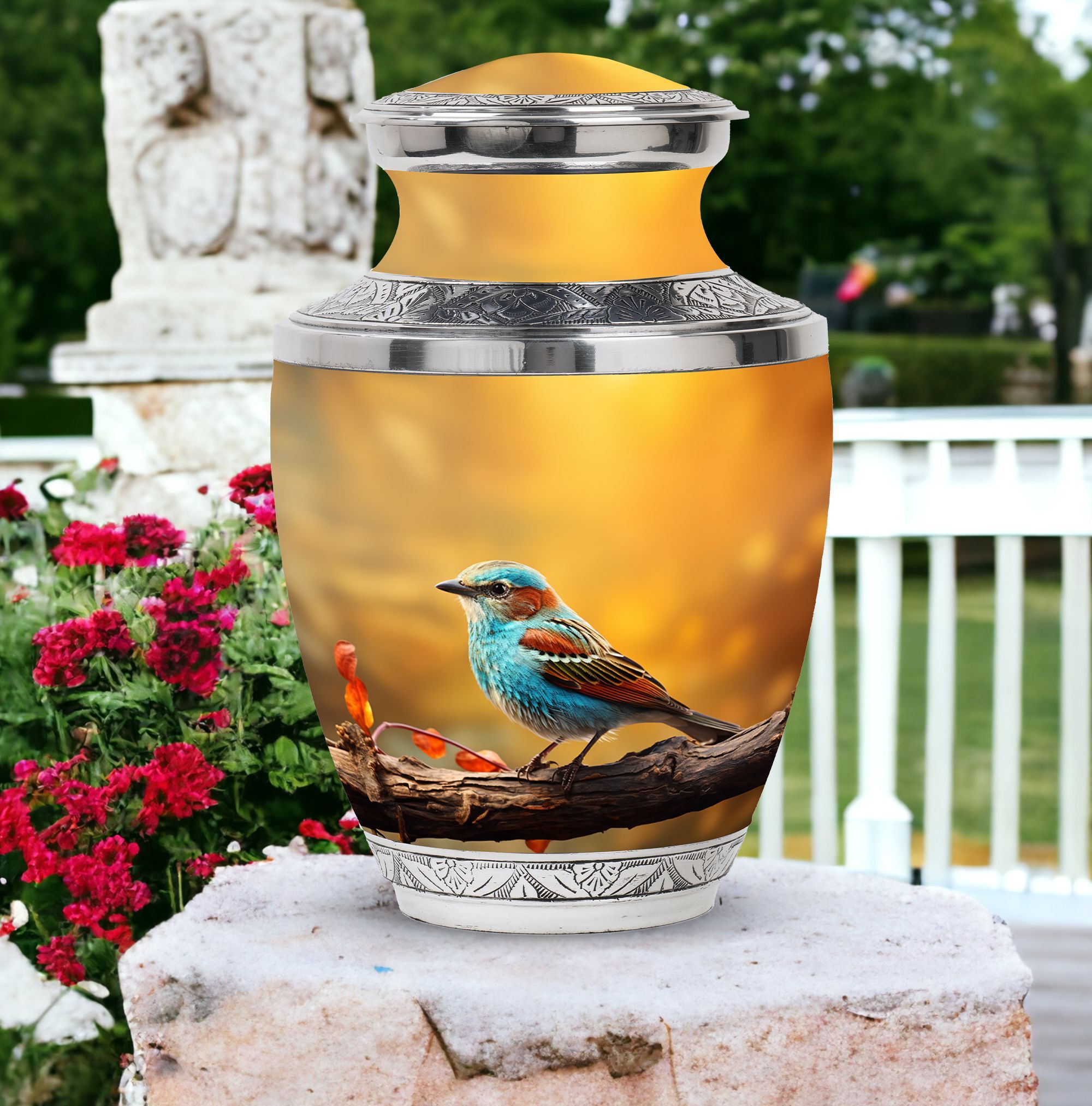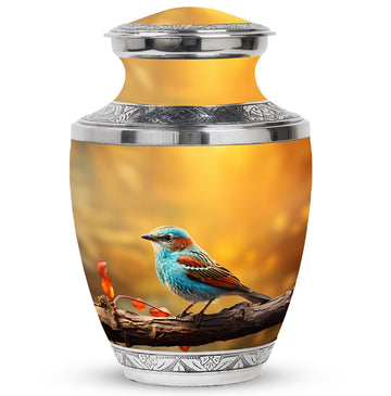 Hold dear the cherished memories of your loved one by entrusting their remains in our Colorful Sparrow Cremation Urn. This elegantly crafted aluminium urn, ideal for adults and seniors, boasts a breathtaking classic urn design - emblematic of respect, legacy, and longevity. Measuring 10 inches in height with a weight of 3.3 pounds, it showcases an impressive craftsmanship. It's not just a large urn, it's a keepsake that caresses up to 200 cubic inches of ashes, symbolizing the immense love you enveloped for the departed. The urn comes neatly packaged with a sumptuous velvet pouch, perfect for containment of those precious ashes. Enhance this striking urn with personal engravings of names, adding a unique touch that resonates with your affection. Explore the deeper significance of memorial ceremony supplies with this masterpiece, which surpasses the usual 'urns for people' in its distinctiveness and emotional value. When it comes to 'Human Cremation Urns' or 'Large Urns for Human Ashes', our colored sparrow urn stands unmatched in symbolic resonance and aesthetic appeal.