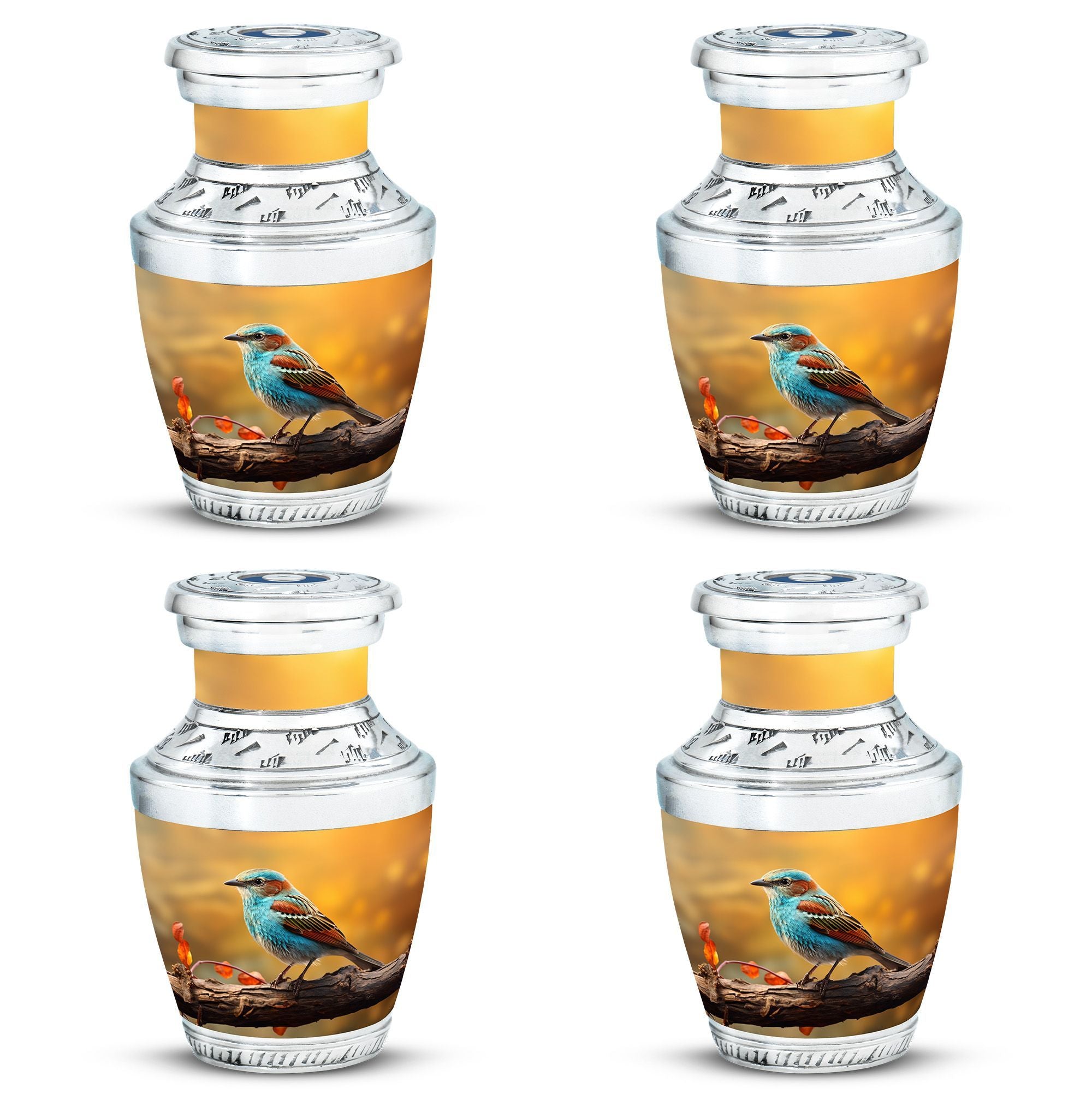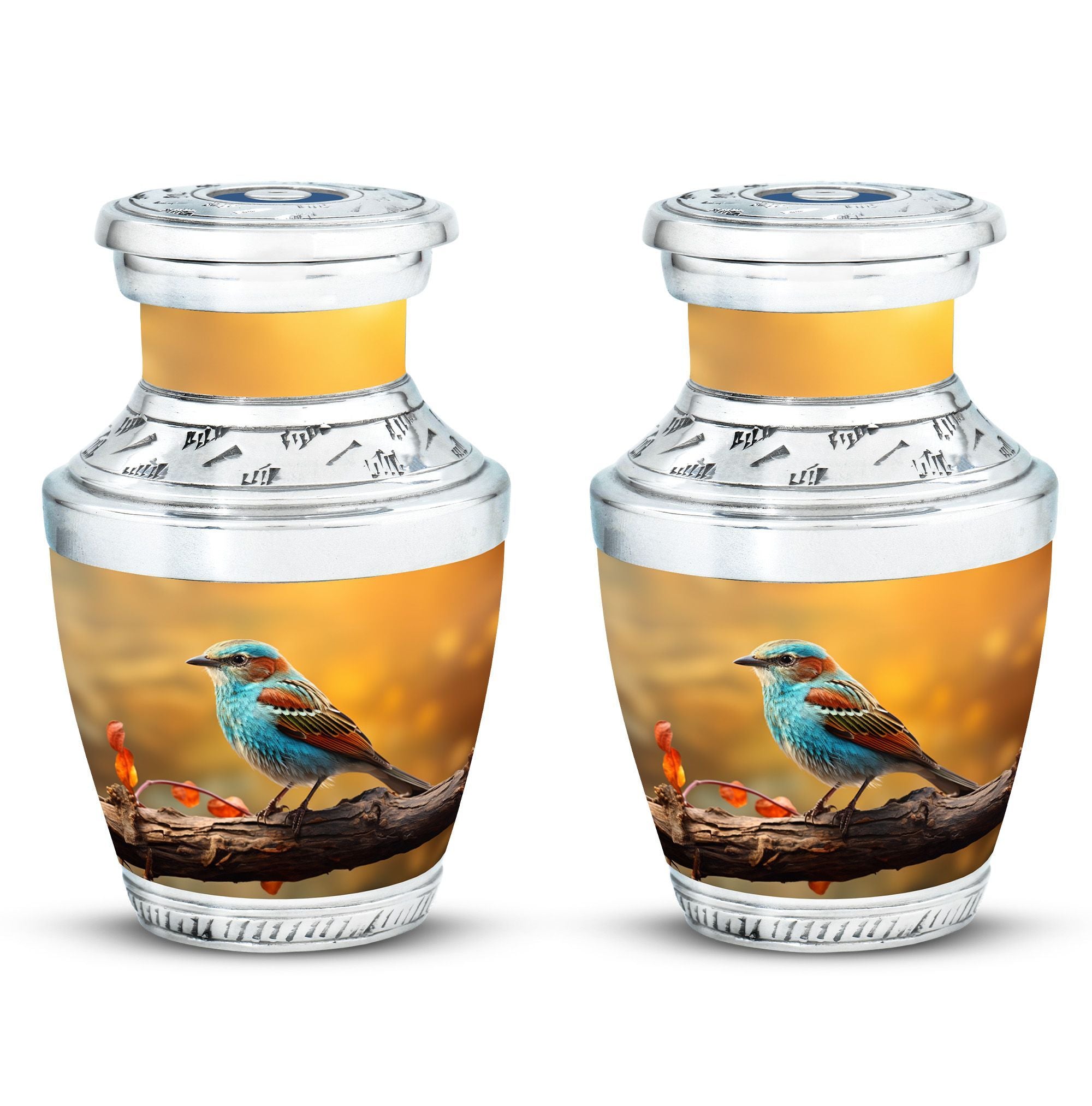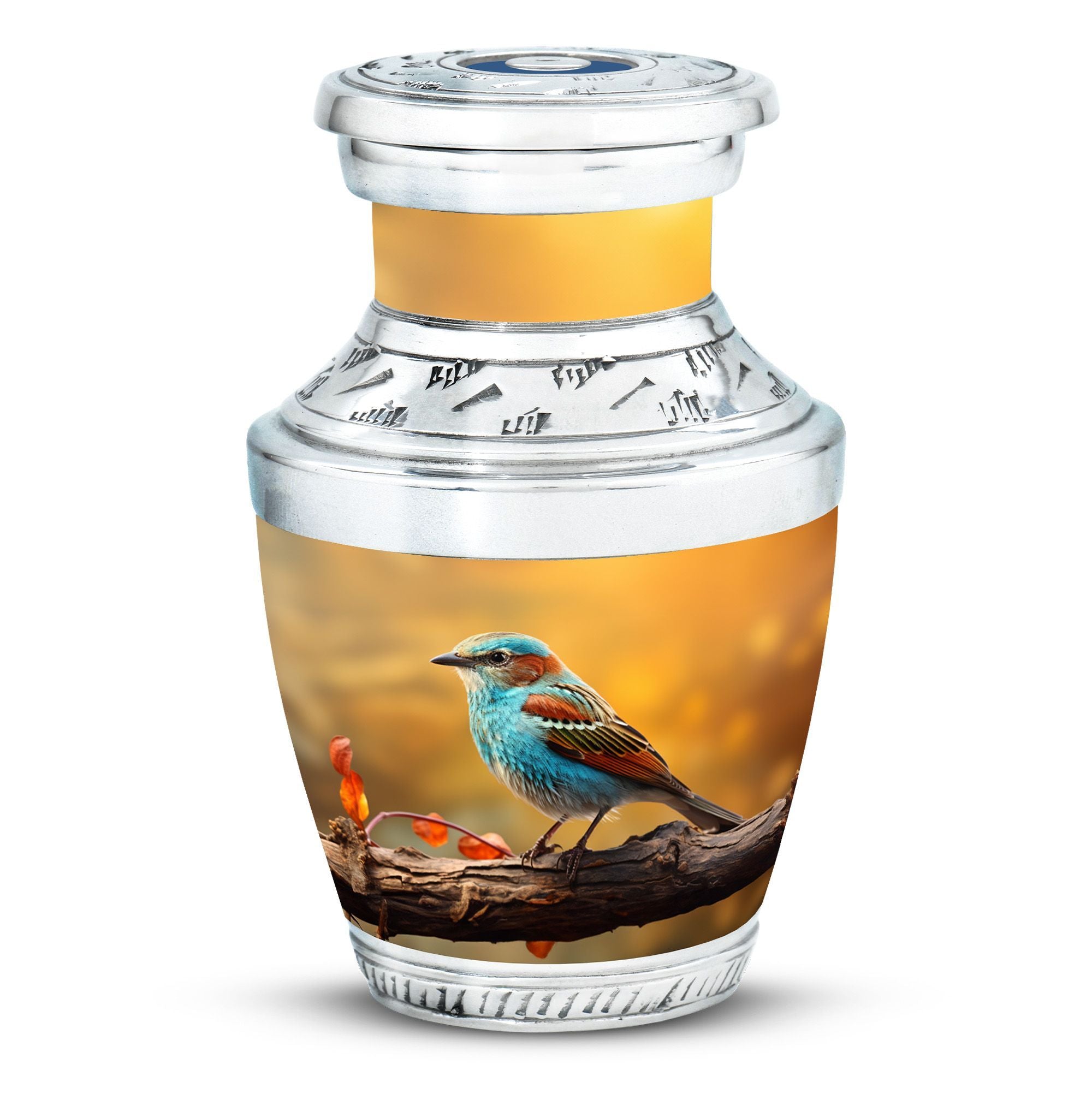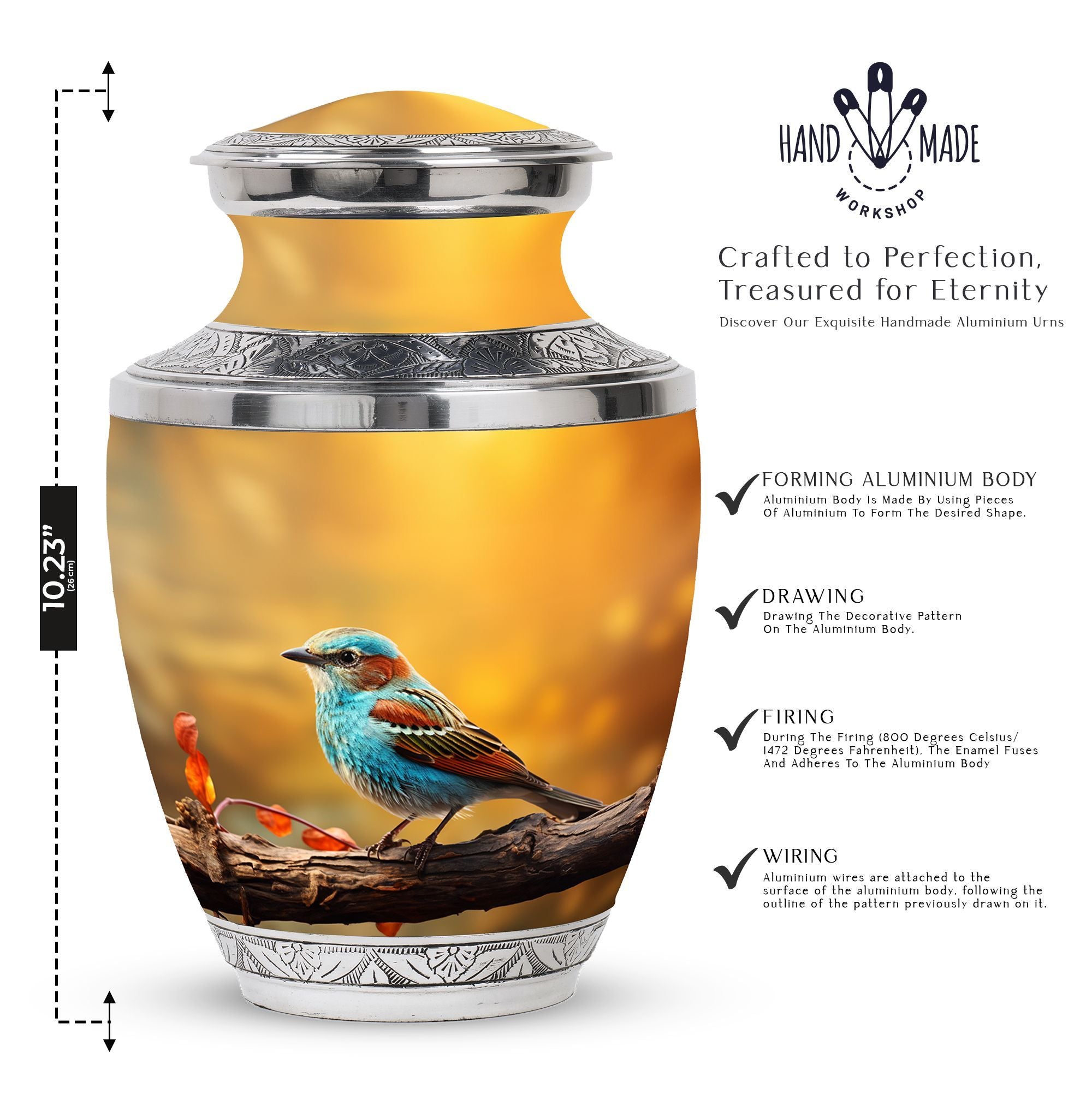 Hold dear the cherished memories of your loved one by entrusting their remains in our Colorful Sparrow Cremation Urn. This elegantly crafted aluminium urn, ideal for adults and seniors, boasts a breathtaking classic urn design - emblematic of respect, legacy, and longevity. Measuring 10 inches in height with a weight of 3.3 pounds, it showcases an impressive craftsmanship. It's not just a large urn, it's a keepsake that caresses up to 200 cubic inches of ashes, symbolizing the immense love you enveloped for the departed. The urn comes neatly packaged with a sumptuous velvet pouch, perfect for containment of those precious ashes. Enhance this striking urn with personal engravings of names, adding a unique touch that resonates with your affection. Explore the deeper significance of memorial ceremony supplies with this masterpiece, which surpasses the usual 'urns for people' in its distinctiveness and emotional value. When it comes to 'Human Cremation Urns' or 'Large Urns for Human Ashes', our colored sparrow urn stands unmatched in symbolic resonance and aesthetic appeal.