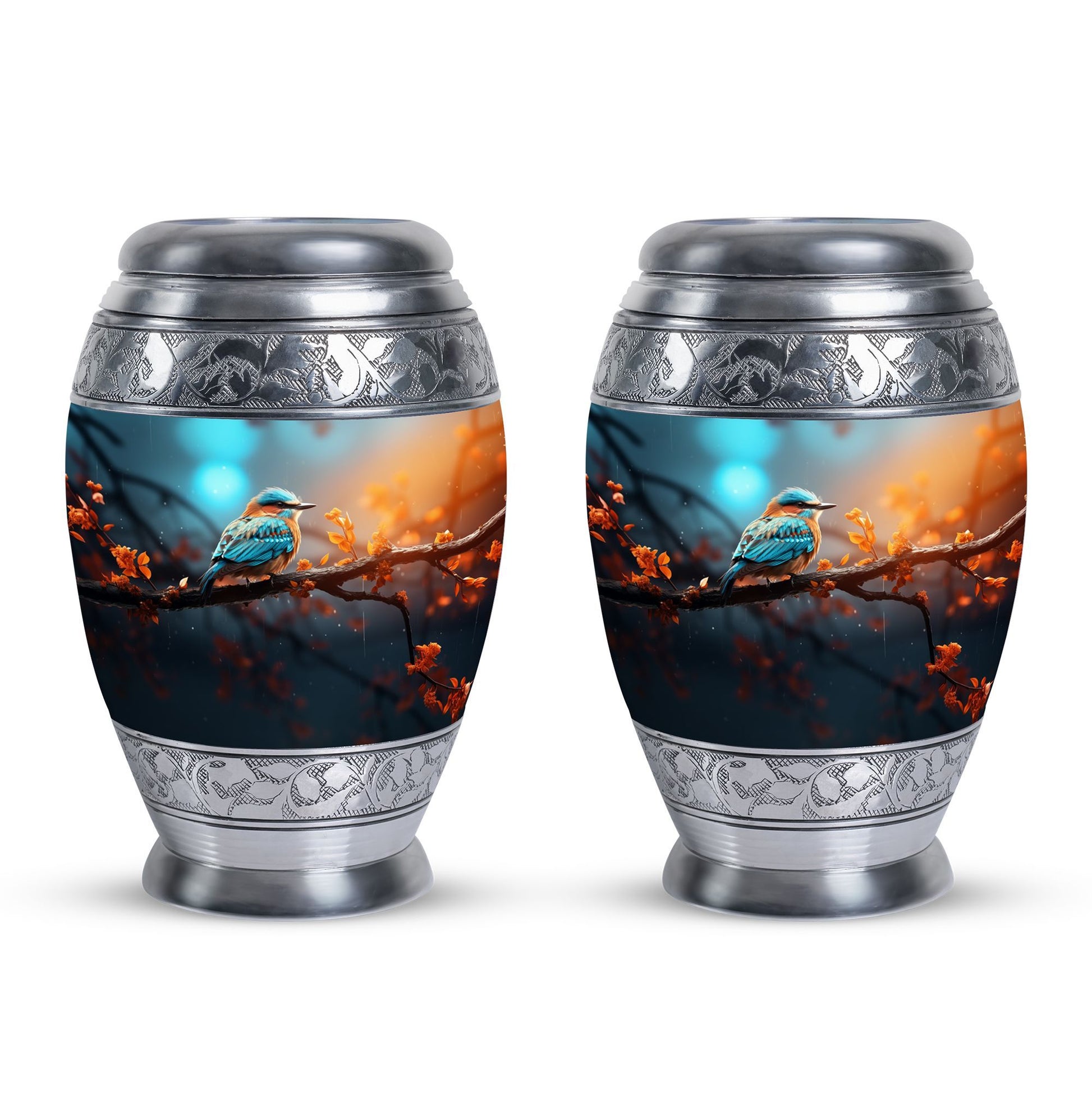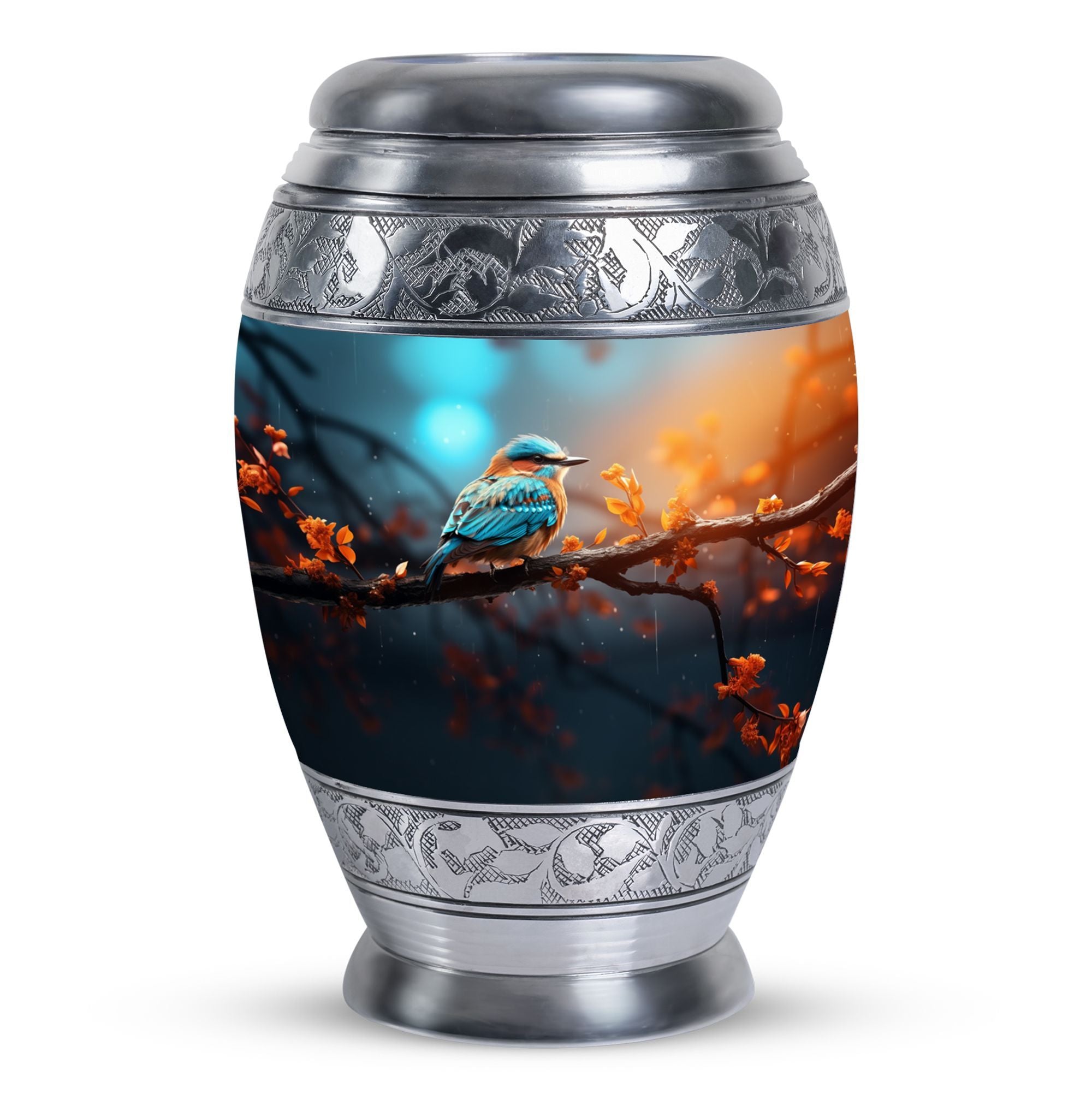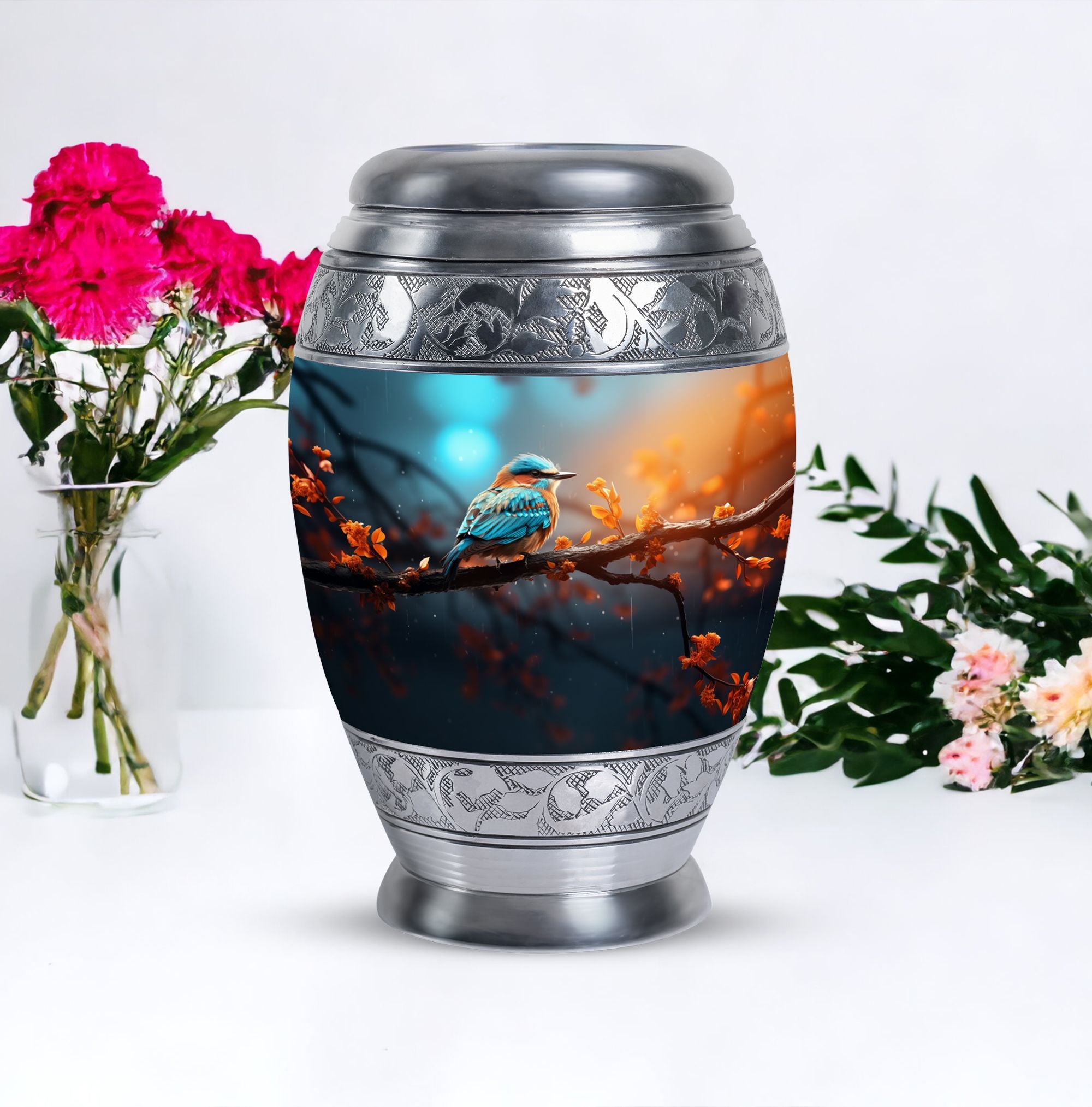 Uplift the spirit of commemoration with our 'Colorful Sparrow Urn,' an ideal resting place for your loved one's remains. Each one of our large urns is crafted with meticulous precision from durable aluminium material. Designed to radiate a sense of tranquillity and fond remembrance, the urn measures 10 inches in height, fitting perfectly into any designated spot in your home. Handy and compact, with a size of just 3 inches and a weight of 3.3 pounds, it's a cinch to place or transport it. This 'Colorful Sparrow Urn' is more than just a vessel; it's a testament to a life well-lived, with a capacity of 200 cubic inches to contain the ashes safely. Our package also includes a velvet pouch, offering an extra layer of protection and containment. As an added layer of respect and personal touch, you can opt to personalize the urn with the engraved names of the departed. Enhance your experience with memorial urns, make it more personal and touching with our 'Colorful Sparrow Urn.