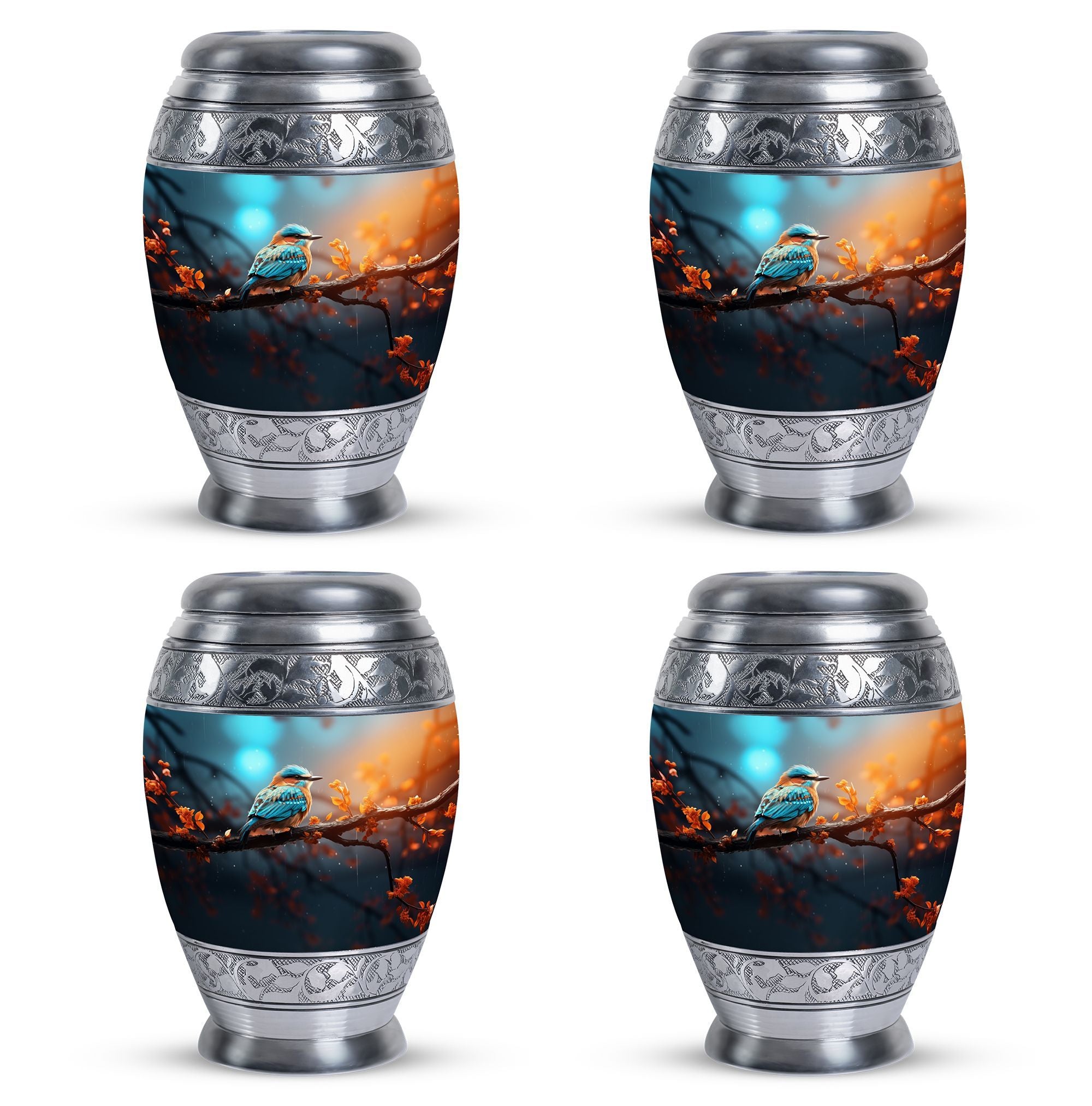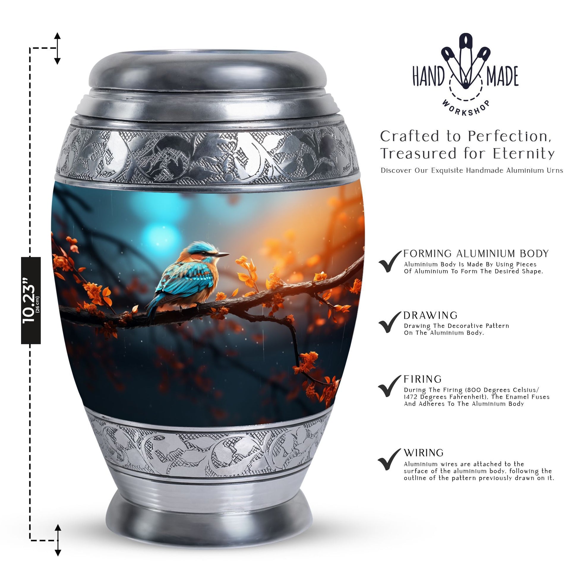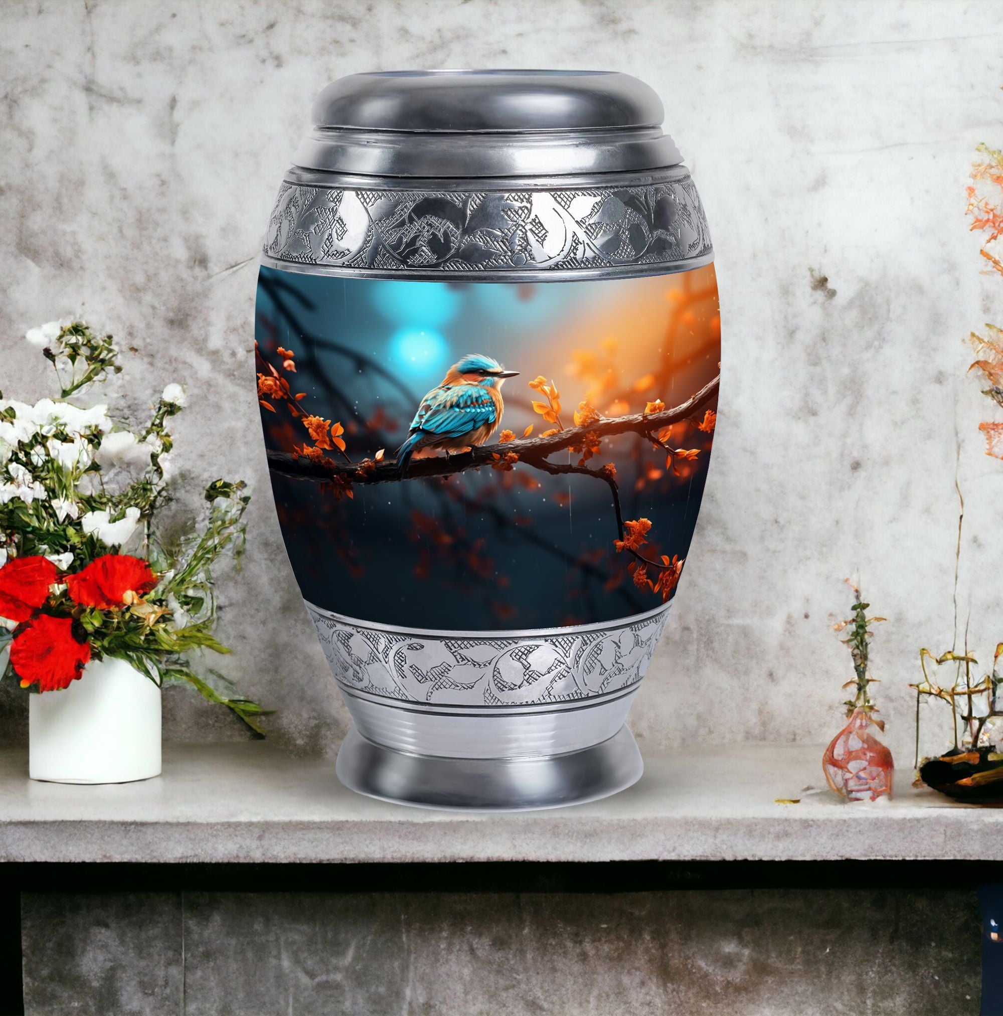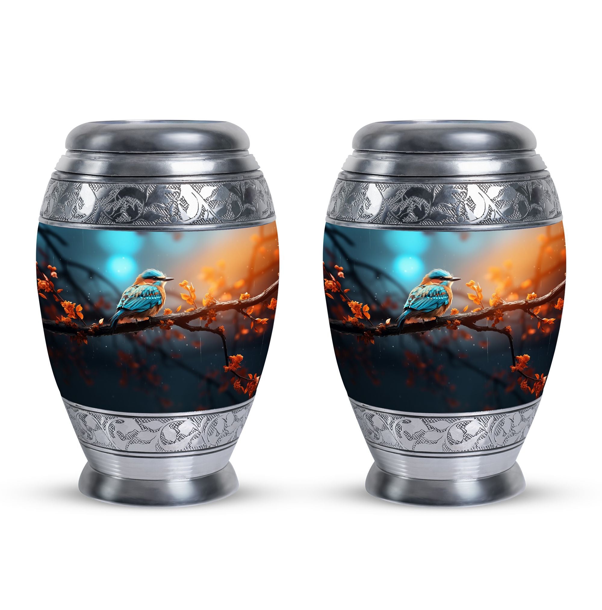 Uplift the spirit of commemoration with our 'Colorful Sparrow Urn,' an ideal resting place for your loved one's remains. Each one of our large urns is crafted with meticulous precision from durable aluminium material. Designed to radiate a sense of tranquillity and fond remembrance, the urn measures 10 inches in height, fitting perfectly into any designated spot in your home. Handy and compact, with a size of just 3 inches and a weight of 3.3 pounds, it's a cinch to place or transport it. This 'Colorful Sparrow Urn' is more than just a vessel; it's a testament to a life well-lived, with a capacity of 200 cubic inches to contain the ashes safely. Our package also includes a velvet pouch, offering an extra layer of protection and containment. As an added layer of respect and personal touch, you can opt to personalize the urn with the engraved names of the departed. Enhance your experience with memorial urns, make it more personal and touching with our 'Colorful Sparrow Urn.