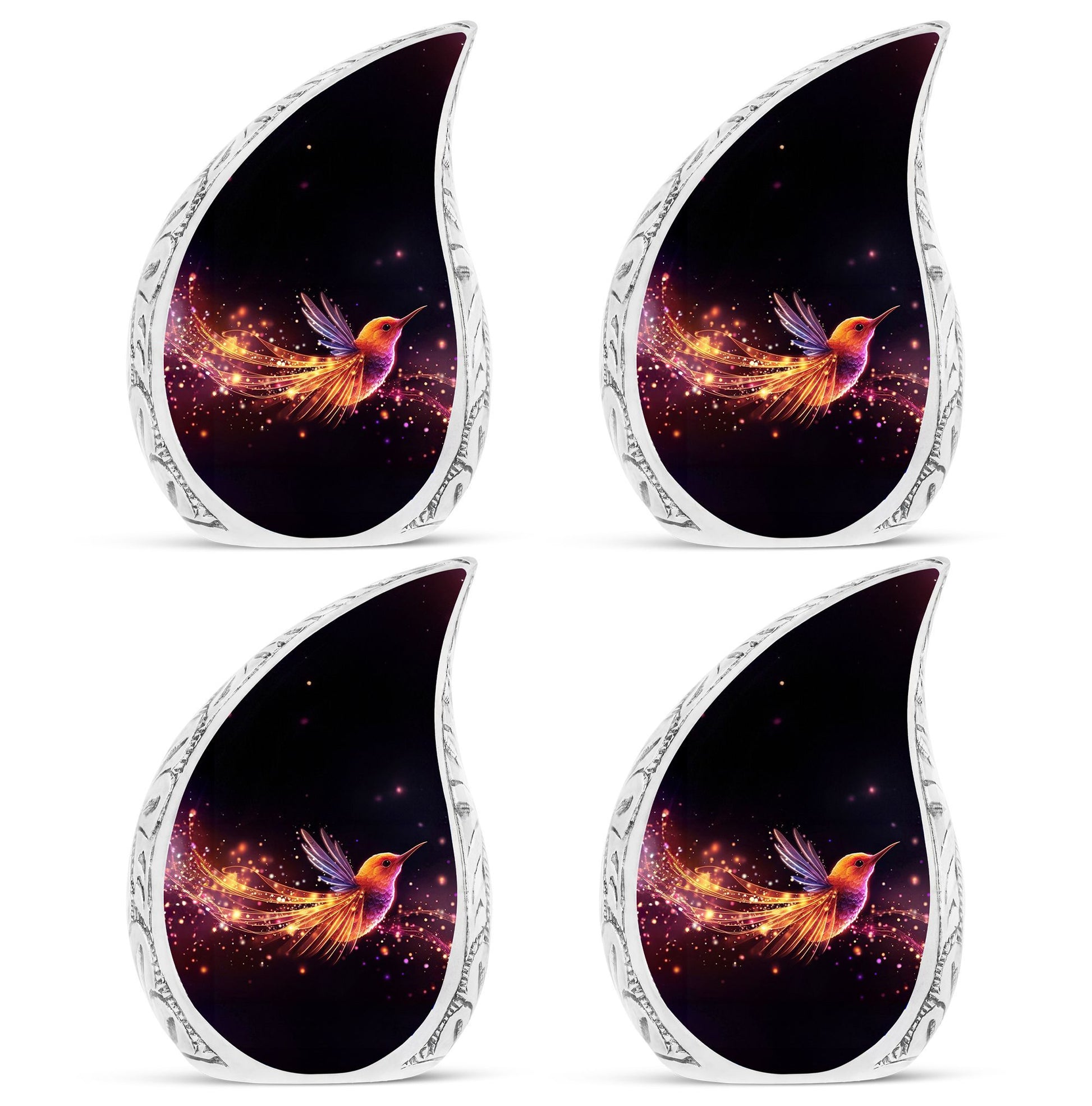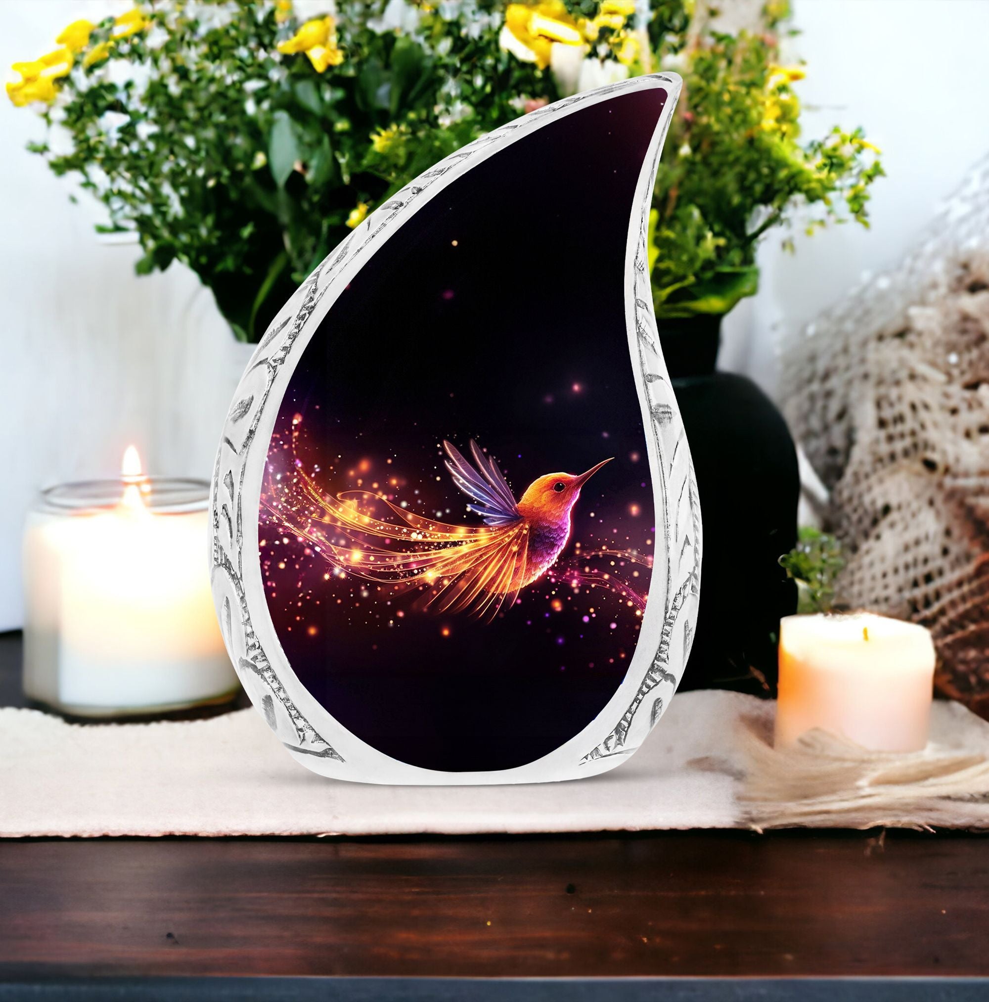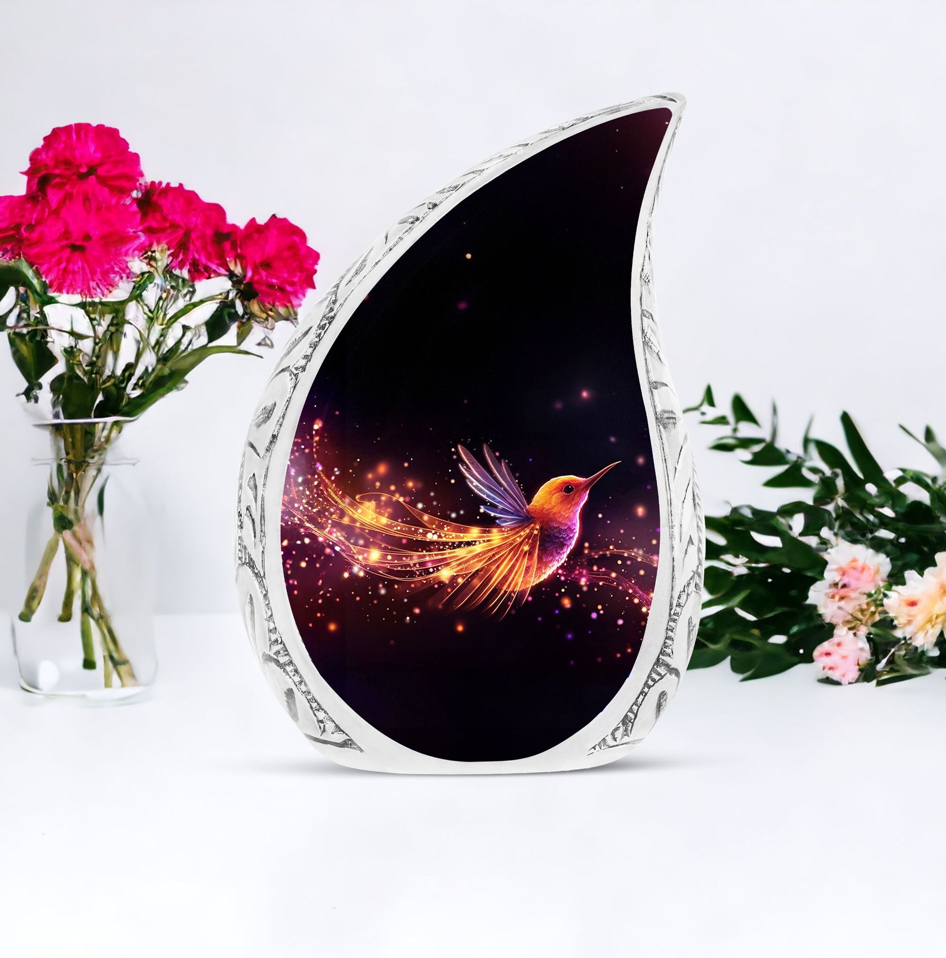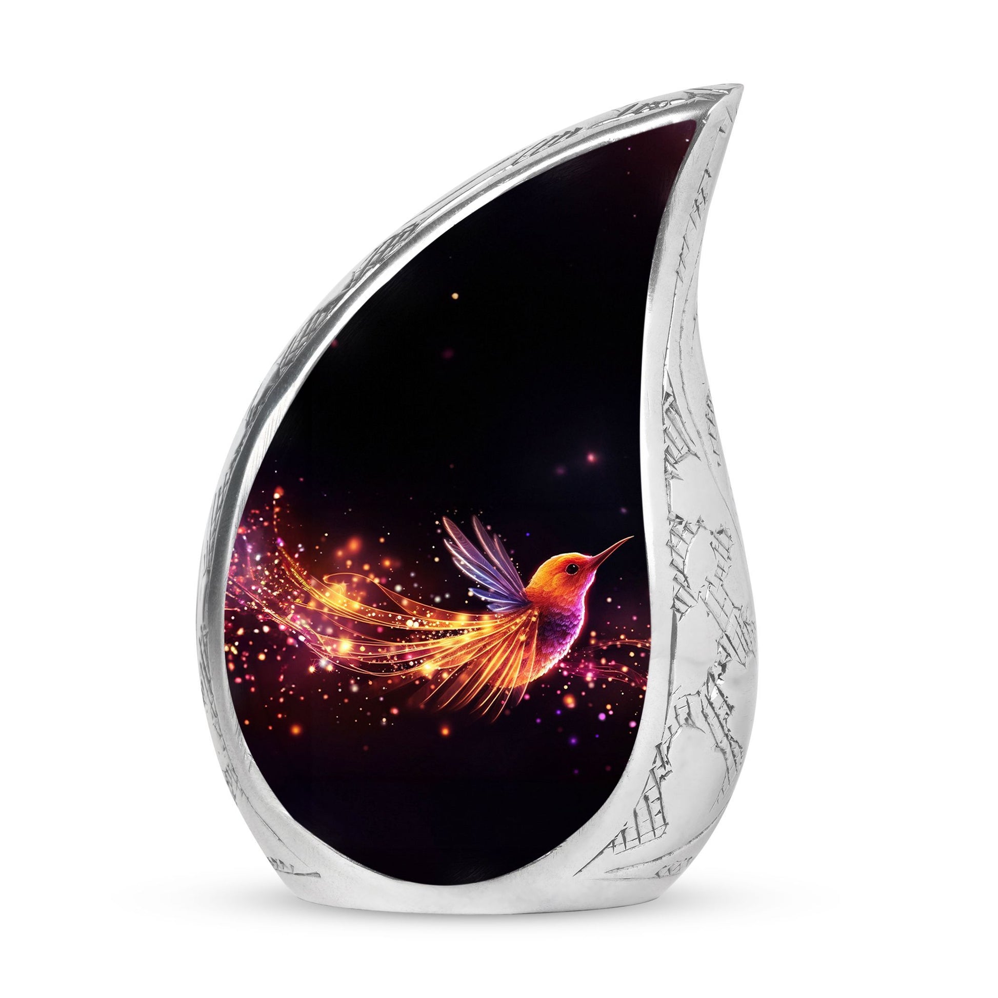Seize a moment of lasting serenity and solace with the colorful Sparrow Memorial Urn. This large urn, tailored for adults, is a timeless remembrance infused with the gentle sway of a classic design. Crafted from durable aluminium, it weighs 3.3 pounds and stands tall at 10 inches. The urn's compact yet spacious interior has a capacity of holding up to 200 cubic inches of ashes. Its 3-inch size is just the perfect fit for both display and safekeeping. The urn also comes with a velvet pouch, a caring way to hold the memories close and secure. The urn is customizable; you have the privilege to personalize it with engraved names, making it even more special and meaningful to the owner. Our memorial urn serves as a touching tribute to your loved ones. This urn is brought to you for the purpose of holding onto memories of cremation, suitable in particular for moms ashes, human cremation ashes, or as a burial urn for human ashes. It provides a heartfelt way to keep your messages of love everlasting.