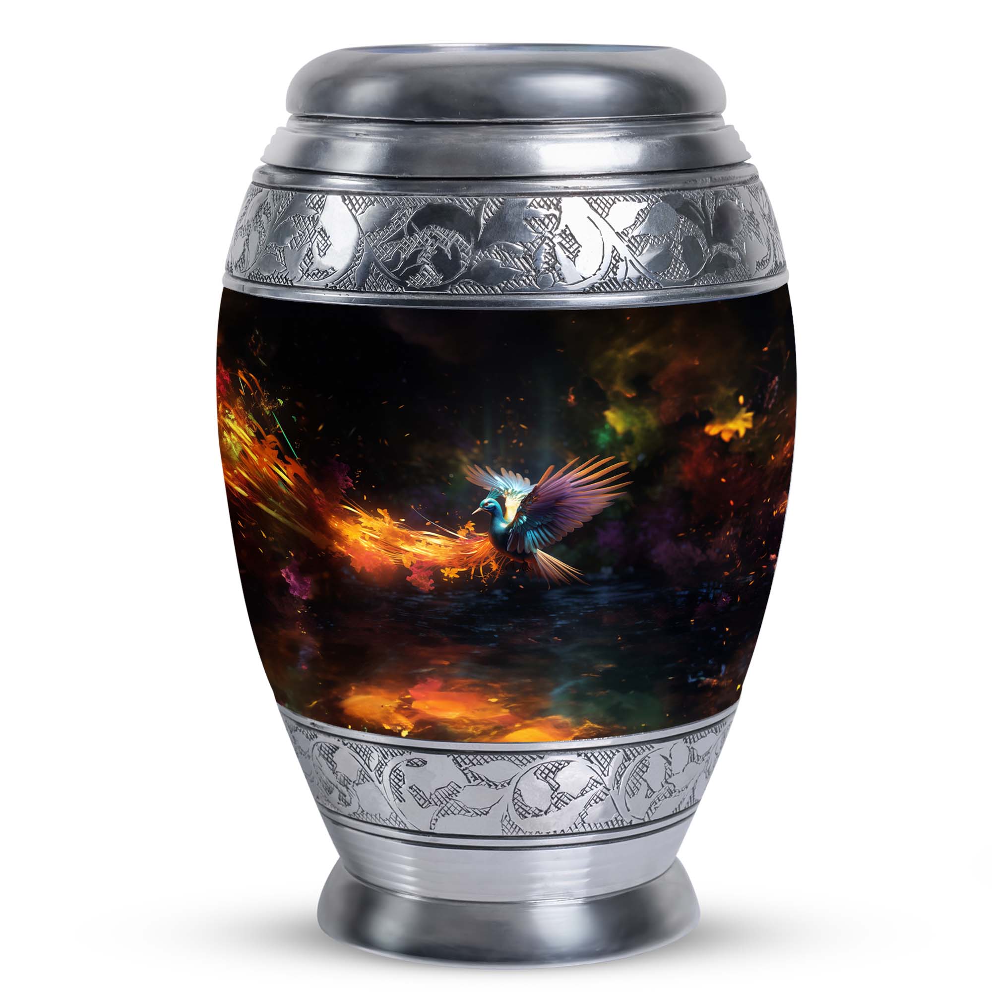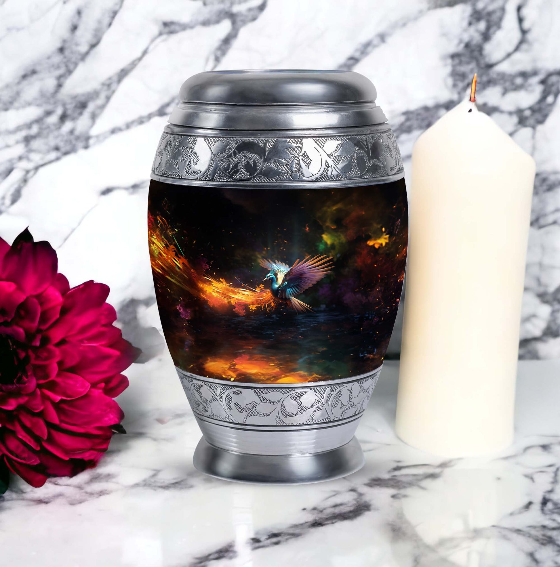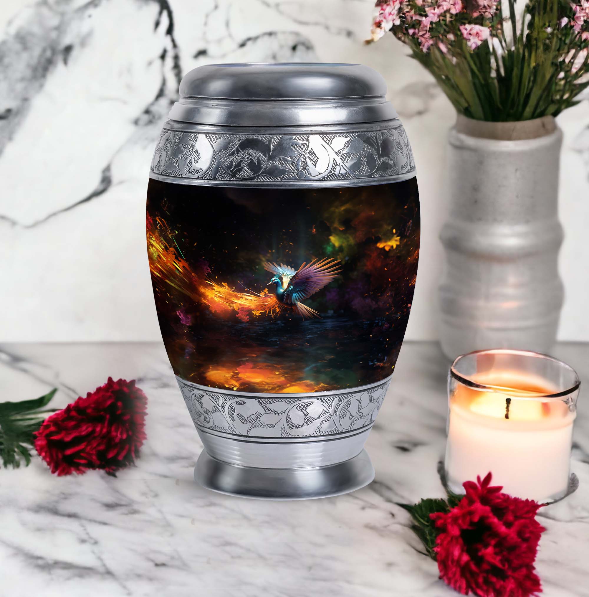 Lay your loved ones to rest in a dignified manner with our colorful swan keepsake urn. Sized at 3 inches, with the capacity to hold 200 cubic inches, this large urn is meticulously crafted from high-quality aluminum to ensure it stands the test of time. Its impressive weight of 3.3 pounds and stature of 10 inches in height underlines its robust quality. Each purchase includes a velvet pouch, providing a fitting containment for your dear one's ashes. The primary beauty of this urn lies in the ability to add a personal touch by engraving names, thus, making it an even more poignant tribute. Although it displays a classic design, this piece stands out with its distinctive allure, making it a unique urn for Dad or Mom. Whether you're searching for memorable urns or decorative urns for human ashes, this aluminum keepsake checks all boxes, offering a heartfelt way to commemorate and celebrate life. It is indeed a carefully thought-out piece destined to hold a part of someone as special as your loved one.