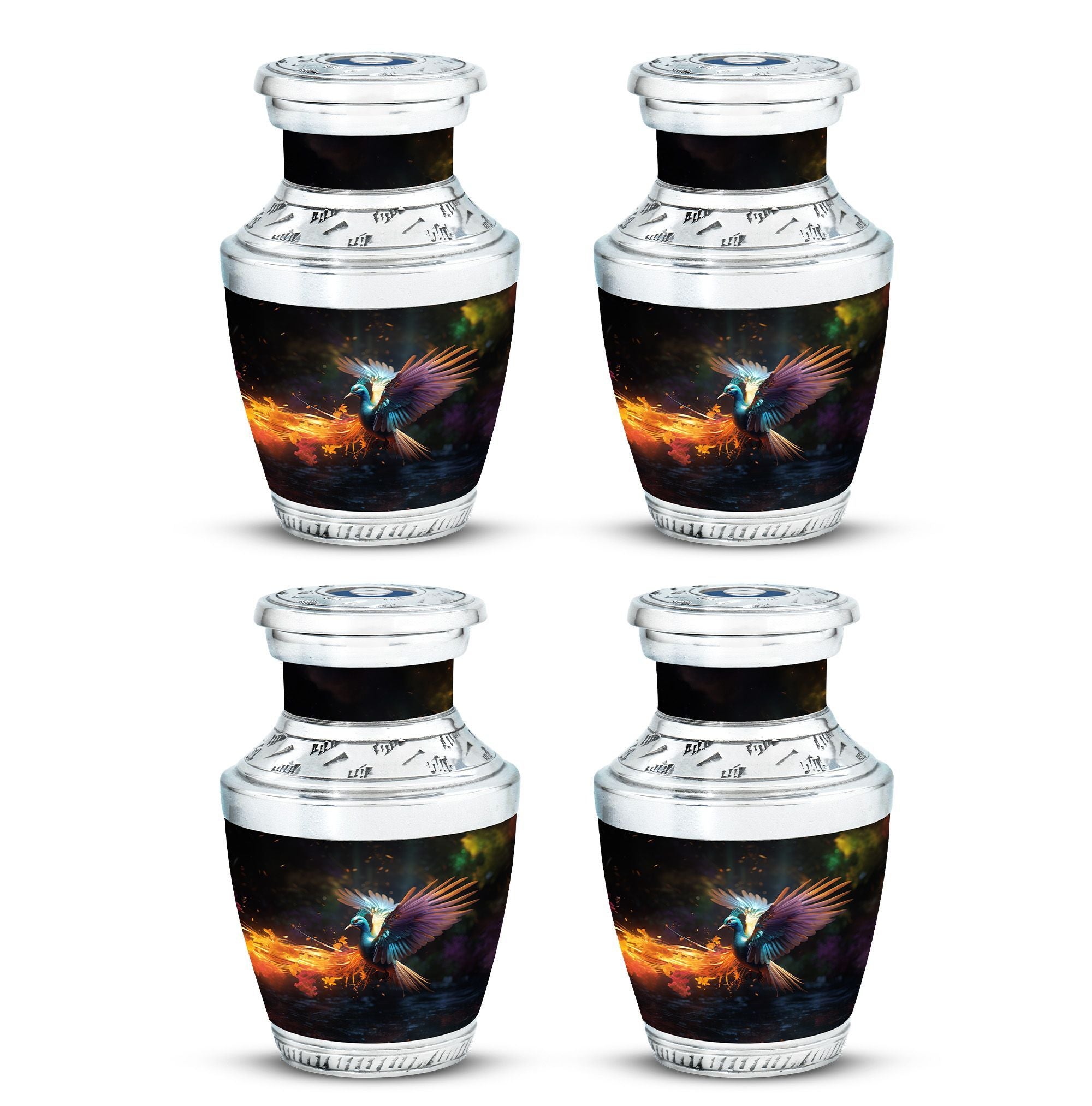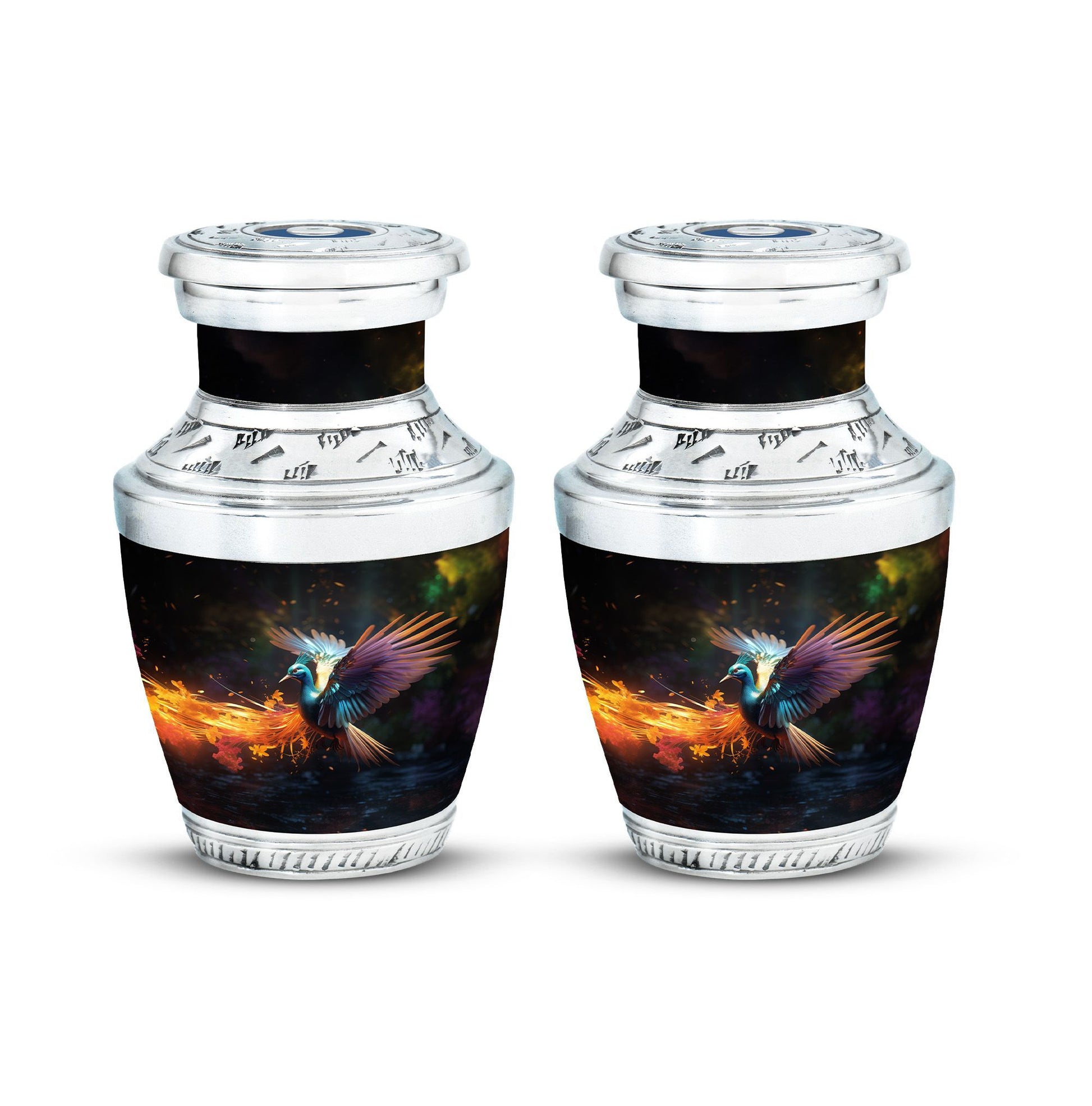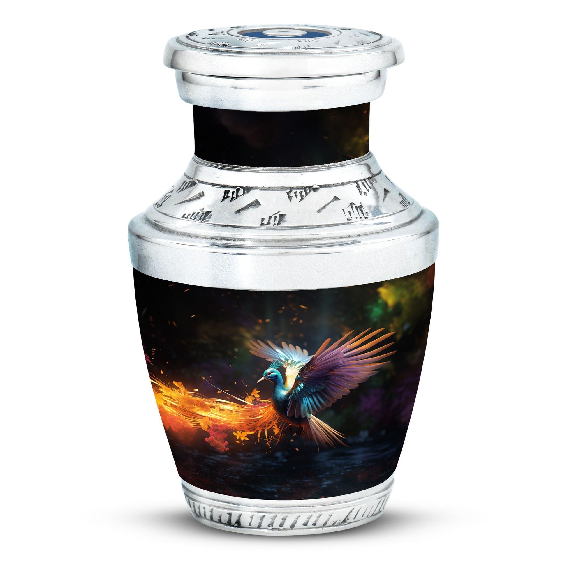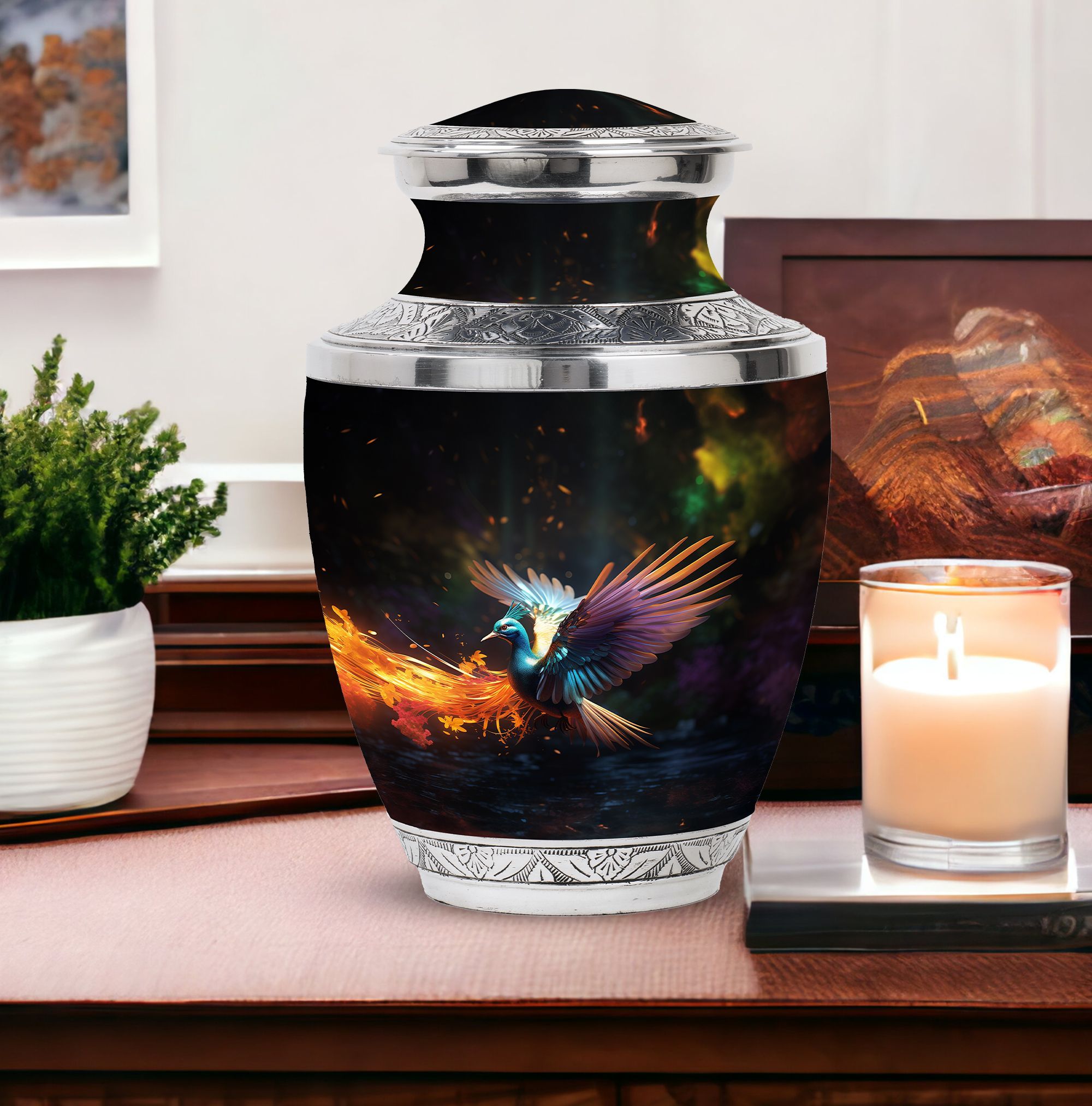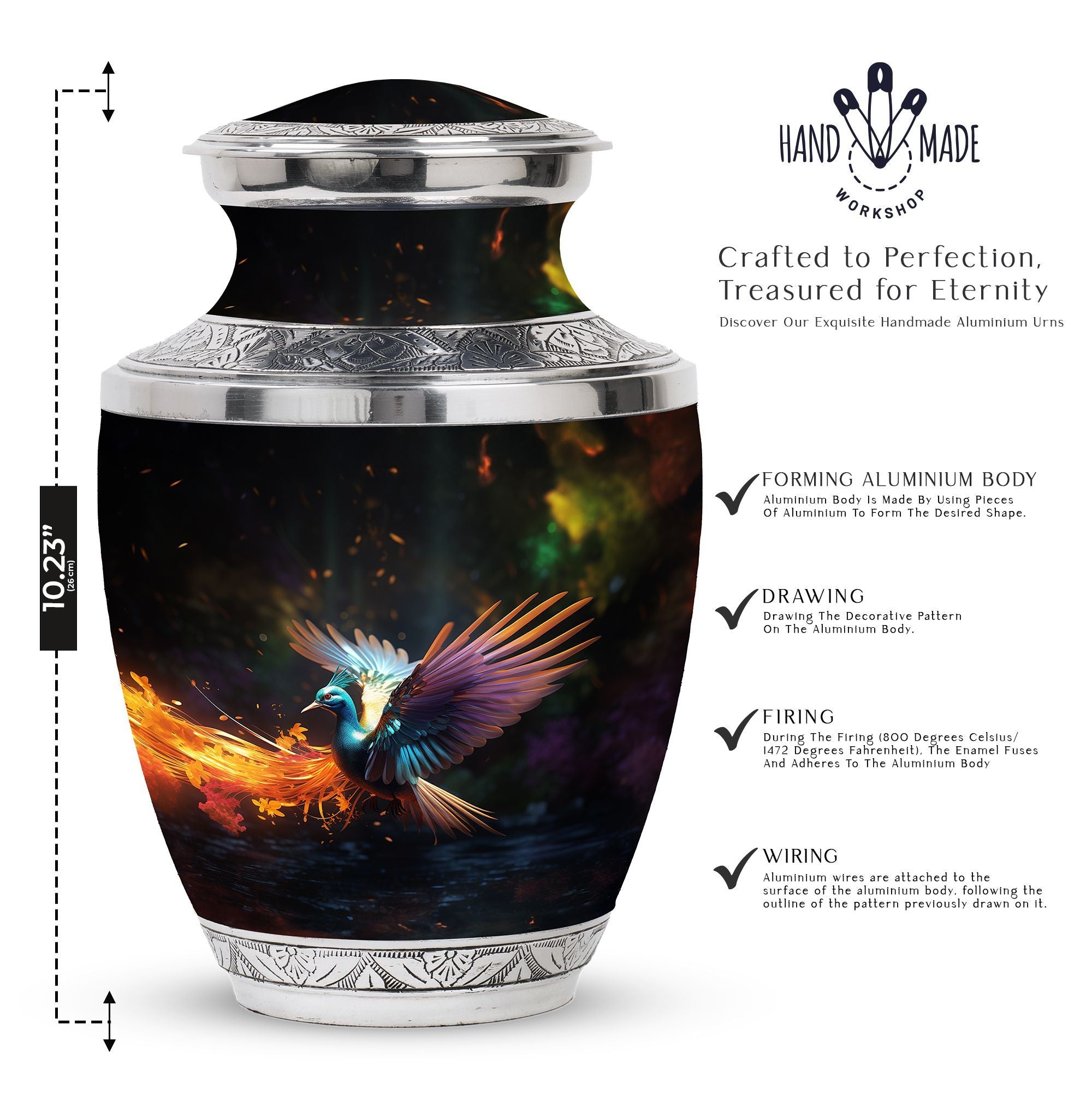 Introducing our Colorful Swan Urn, a perfect memorial urns solution for your loved ones. This keepsake urn’s large size of 10 inches in height, and 3 inch width, can securely hold up to 200 cubic inches of ashes, making it an excellent choice for adults and seniors. Crafted from high-quality Aluminium, this unique urn weighs 3.3 pounds, ensuring its durability and lasting beauty. Our colorful urn stands out among common metal urns for human ashes. The package includes a luxurious velvet pouch for respectful containment and ease in transportation of ashes. For a personal touch, you can customize this urn with engraved names to make it even more meaningful. Let the brilliance of our vibrant, decorative urns for human ashes serve as a tribute to the memories you cherish.