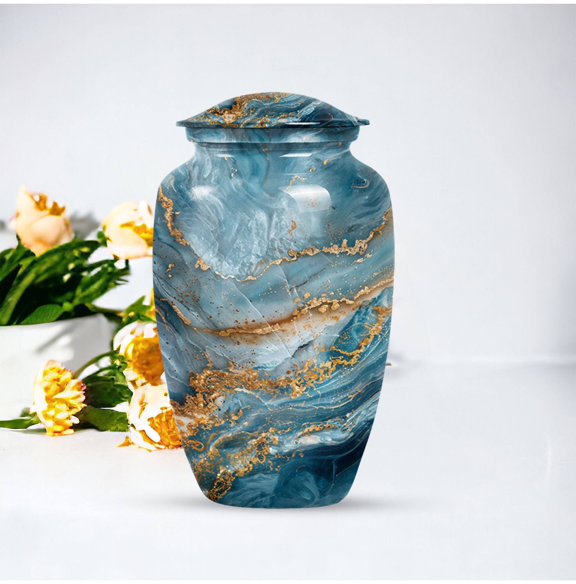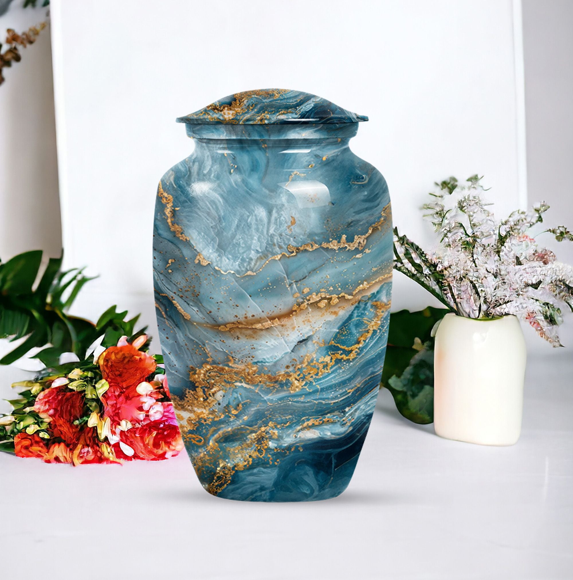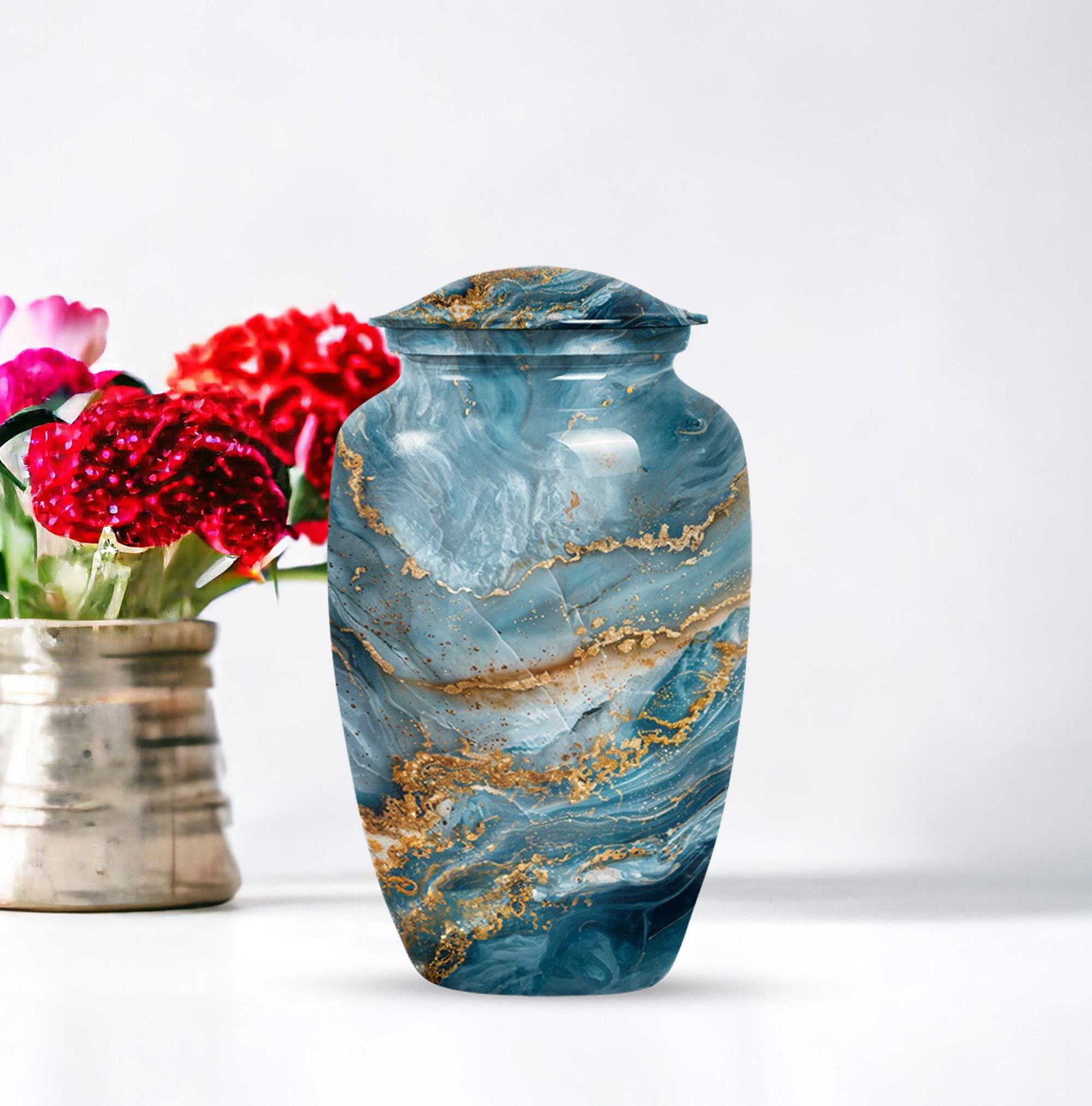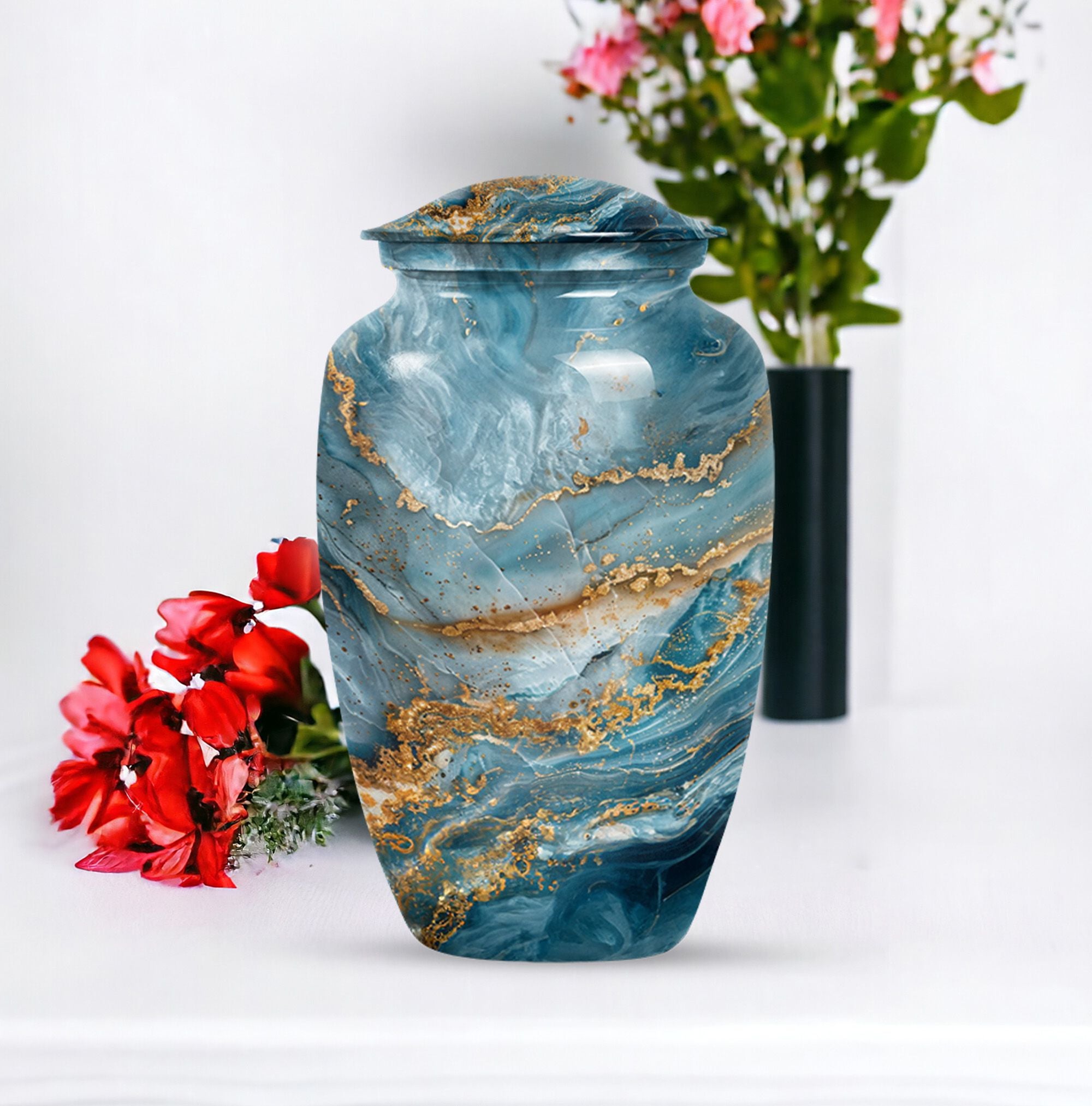 Experience a unique combination of respect, beauty, and memory with our Colourful Swirl Urn, an exquisite choice when it comes to memorial urns for adults. This 10-inch, classic urn is-not just any ordinary urn, but a statement of timeless honour. Crafted with high-quality aluminium, it weighs a sturdy 3.3 pounds and can hold a capacity of 200 cubic inches of ashes. The urn comes complete with a velvet pouch designed for elegant, secure containment of the ashes. Its abstract theme infuses artful dignity into the remembrance process. The urn can be further personalized with engraved names, adding a personal touch to your tribute. Whether used for burial funeral urns for adult ashes for men or as a cremation large urn for women, this urn embodies the solemn respect that our departed loved ones deserve. An earnest selection for those in the market for metal urns suitable for a burial in the ground.