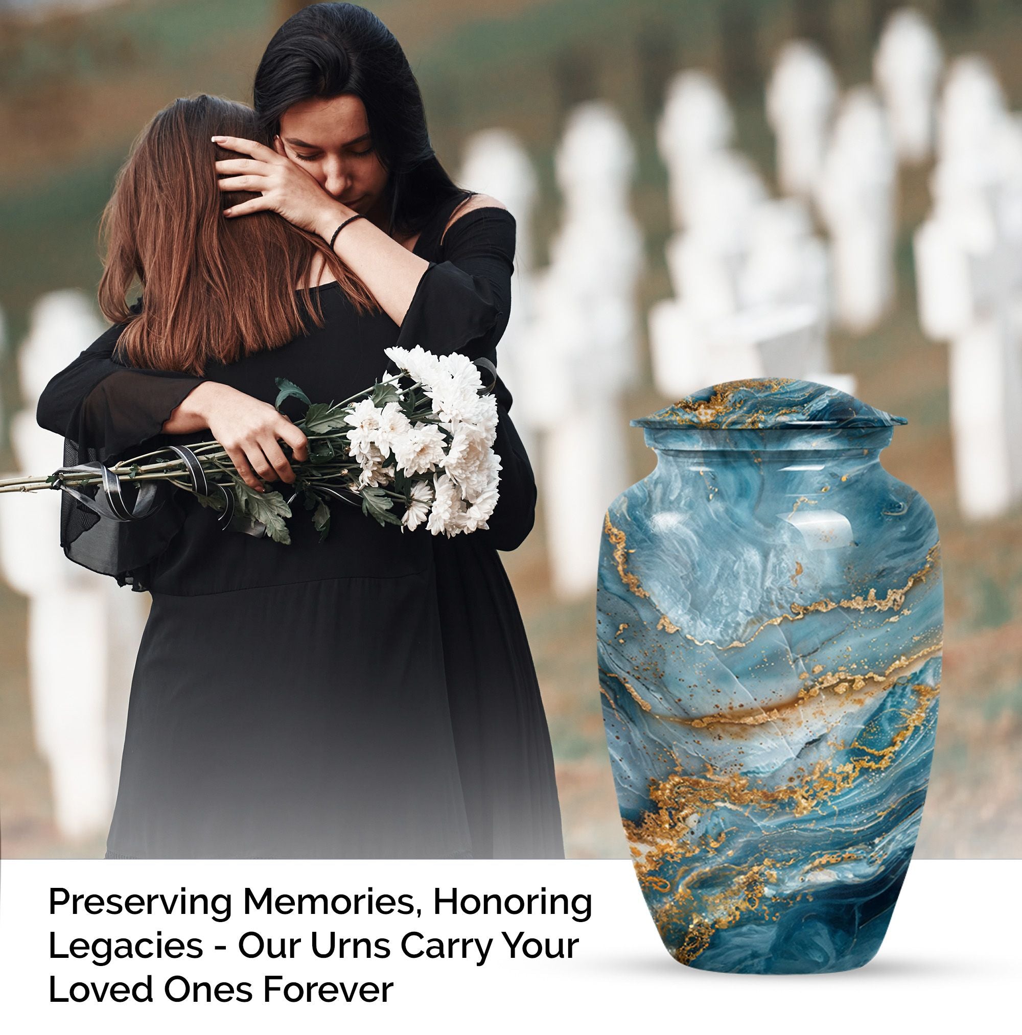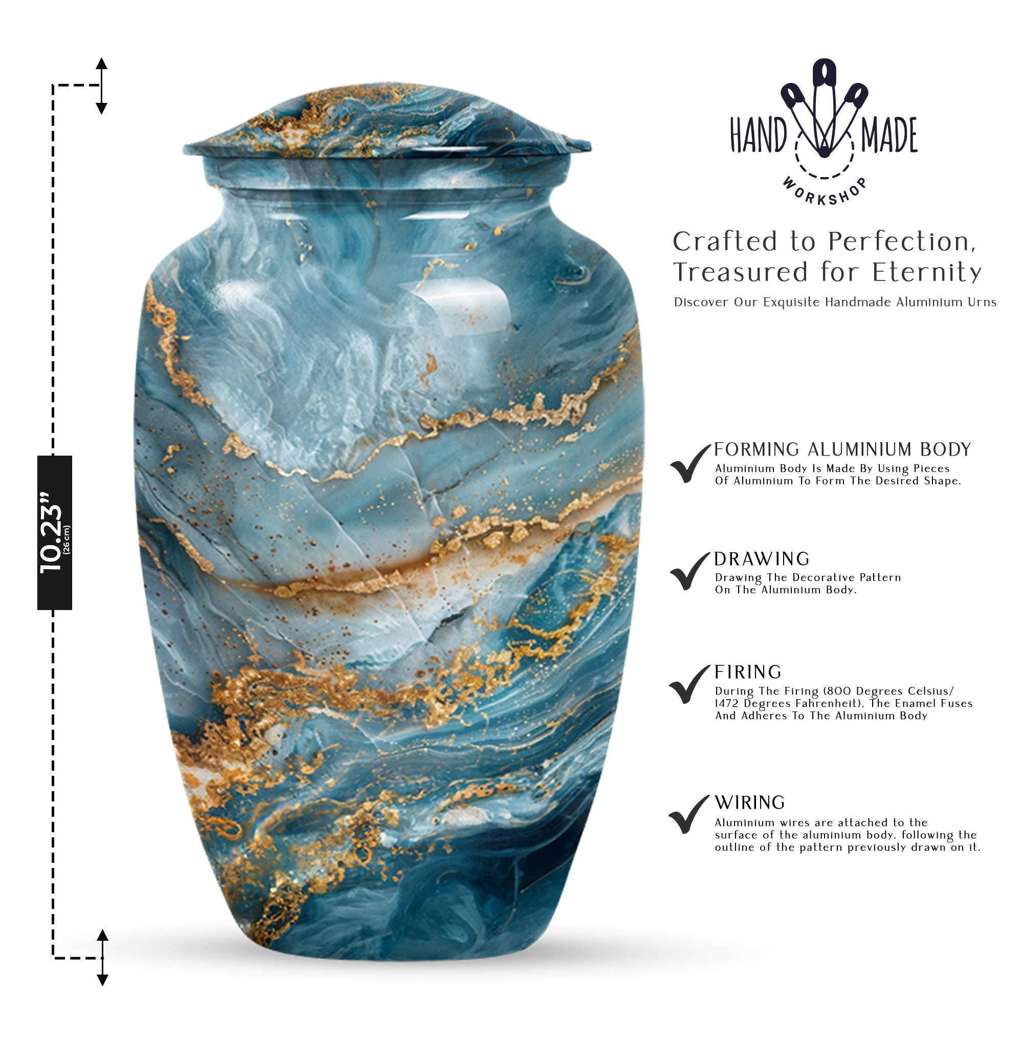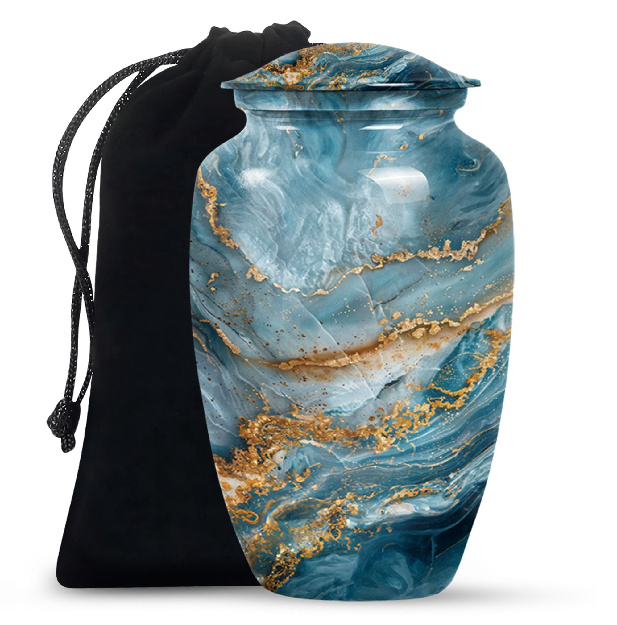Experience a unique combination of respect, beauty, and memory with our Colourful Swirl Urn, an exquisite choice when it comes to memorial urns for adults. This 10-inch, classic urn is-not just any ordinary urn, but a statement of timeless honour. Crafted with high-quality aluminium, it weighs a sturdy 3.3 pounds and can hold a capacity of 200 cubic inches of ashes. The urn comes complete with a velvet pouch designed for elegant, secure containment of the ashes. Its abstract theme infuses artful dignity into the remembrance process. The urn can be further personalized with engraved names, adding a personal touch to your tribute. Whether used for burial funeral urns for adult ashes for men or as a cremation large urn for women, this urn embodies the solemn respect that our departed loved ones deserve. An earnest selection for those in the market for metal urns suitable for a burial in the ground.